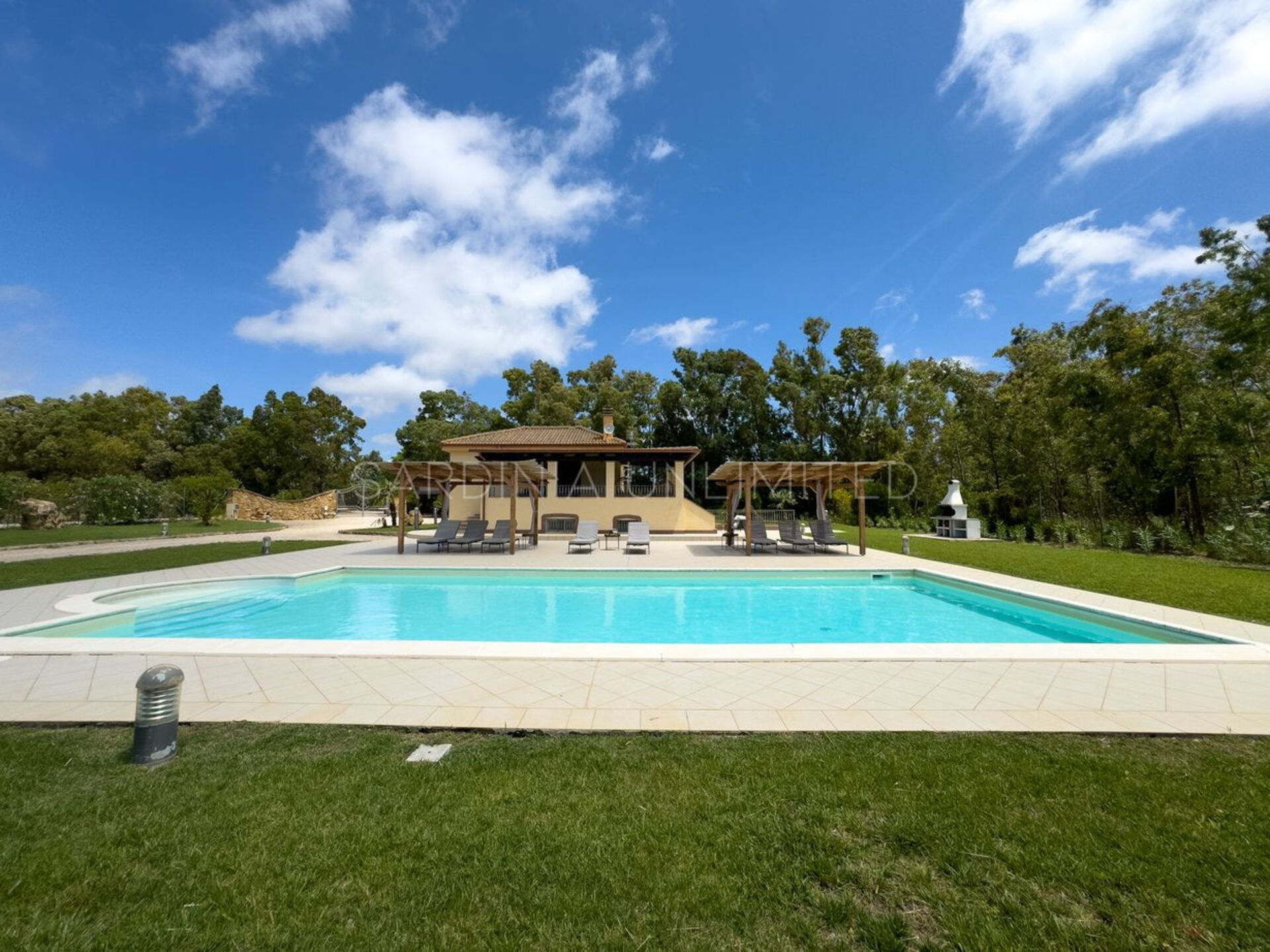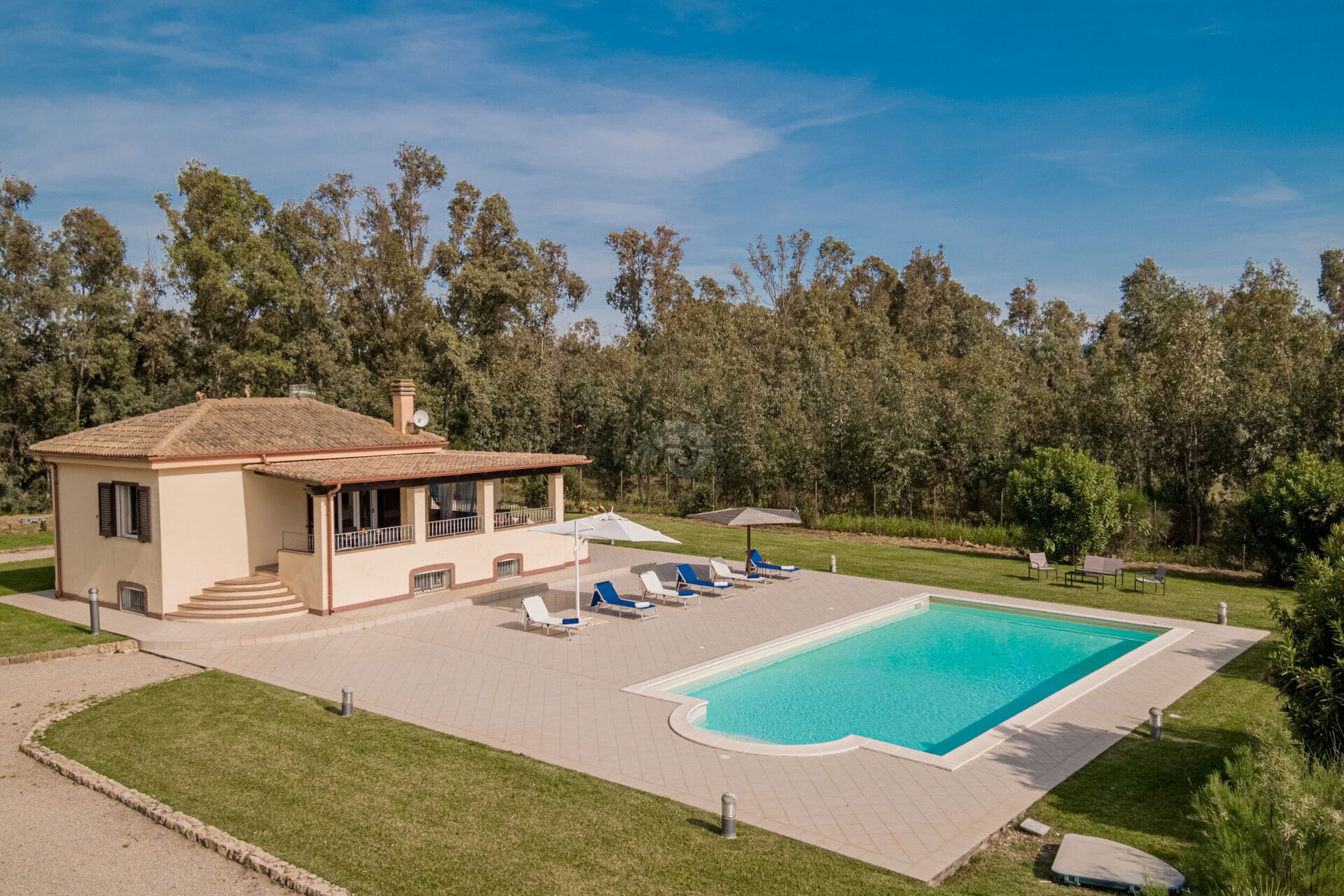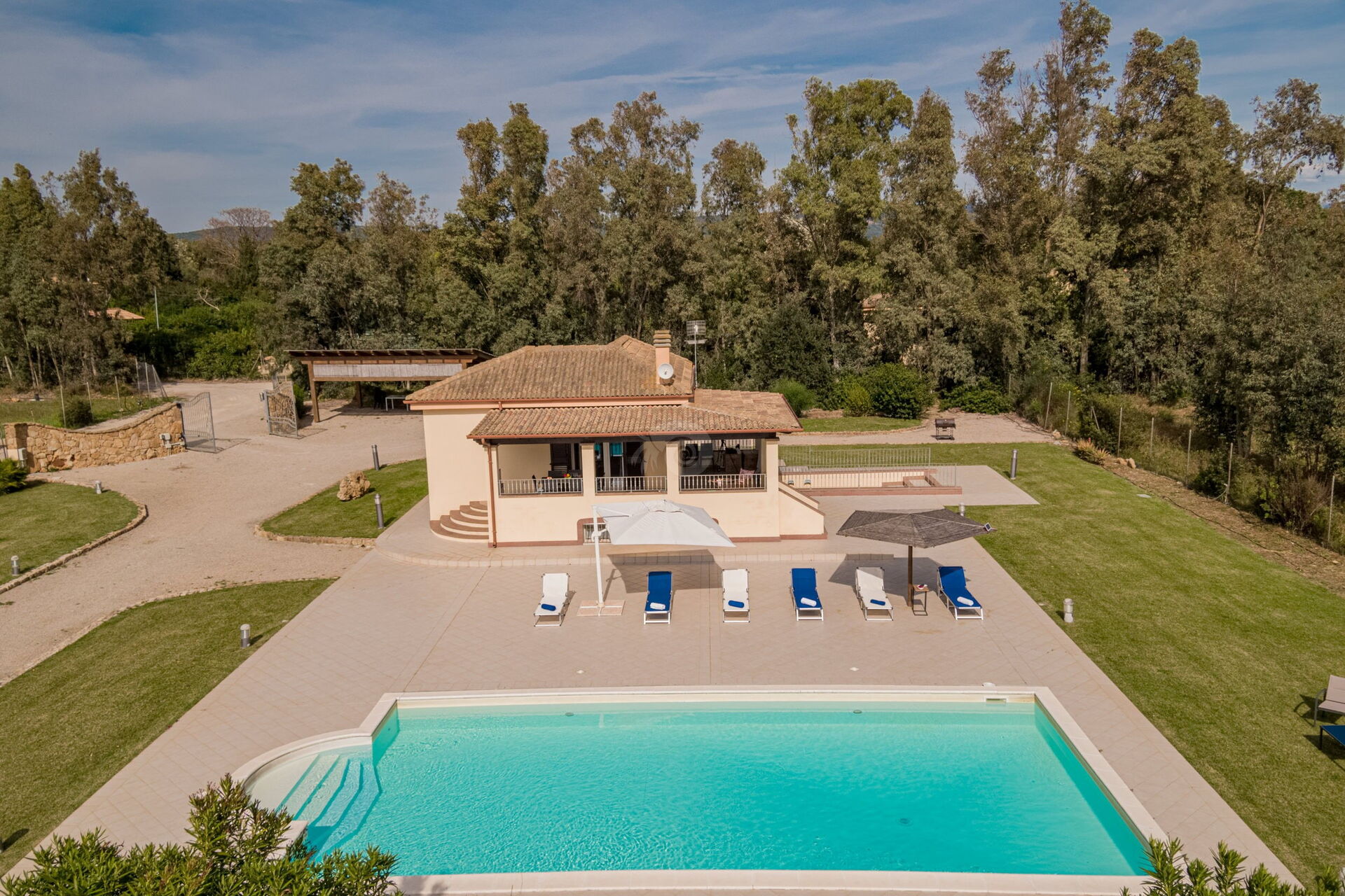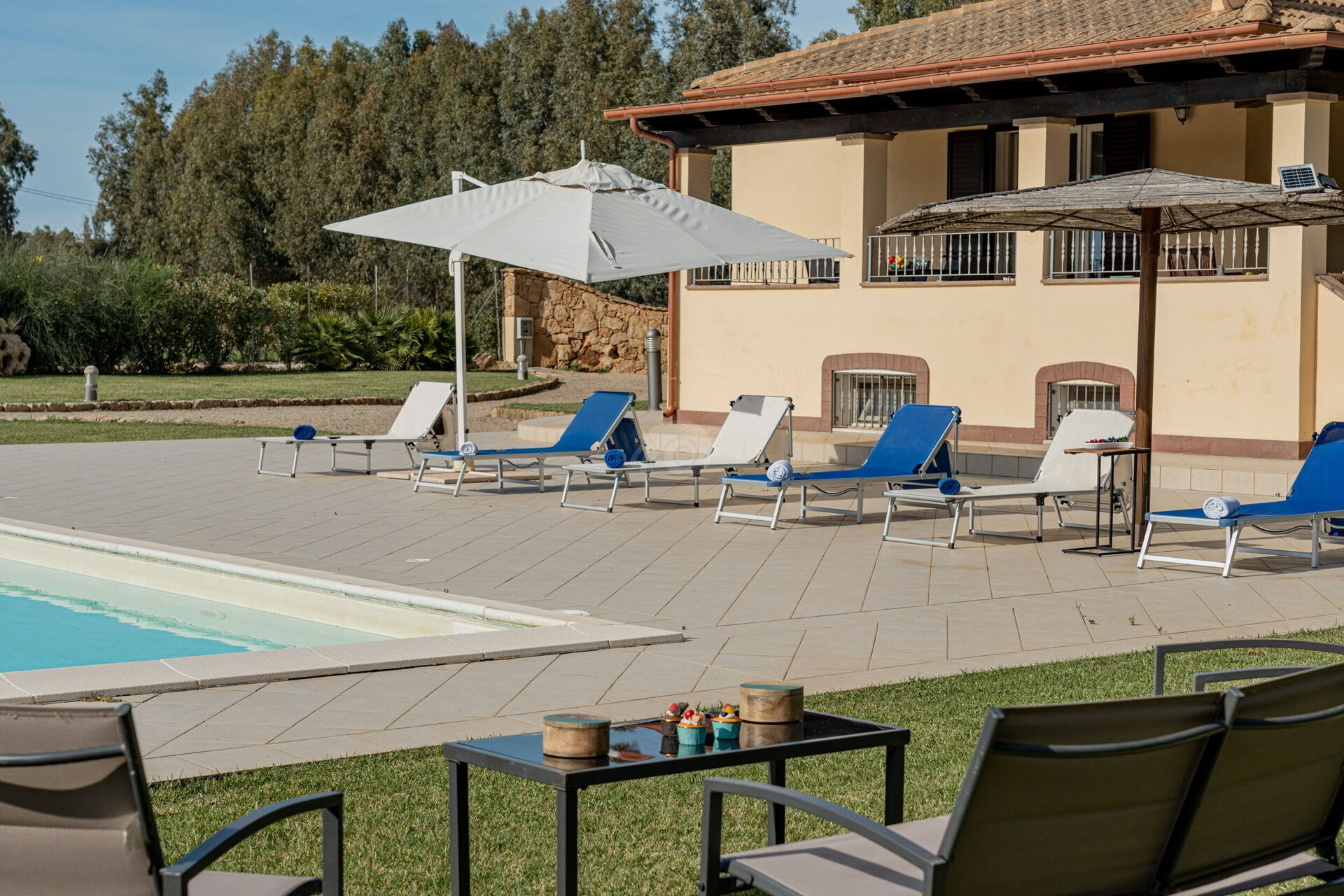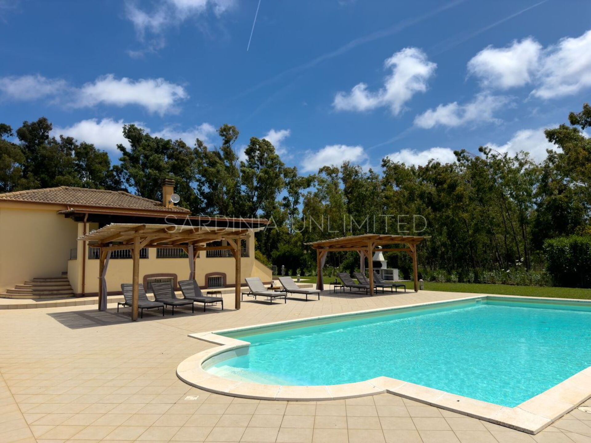 Diese Ferienvilla auf Sardinien verfügt über eine große und gemütliche Terrasse mit Grill und einem Außentisch, an dem Sie im Freien zu Mittag essen können. Die Terrasse überblickt einen großen, sorgfältig gepflasterten Bereich, der einen Solariumbereich mit Sonnenschirmen und Liegestühlen beherbergt und der den großen und klaren privaten Swimmingpool (16 x 5 m) umrahmt, der dank eines höheren Teils, in dem sich beide Erwachsenen vergnügen und entspannen können, gestaltet ist Es ist möglich zu tauchen, was für die Kleinen ist.