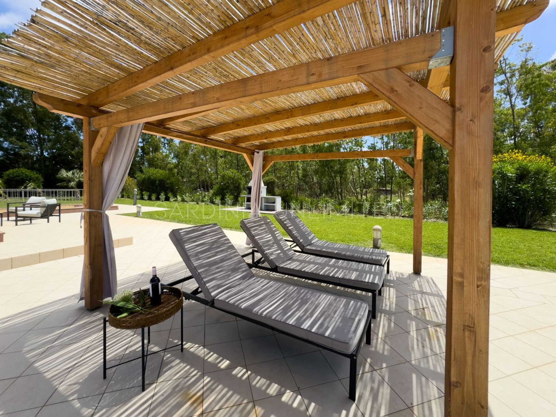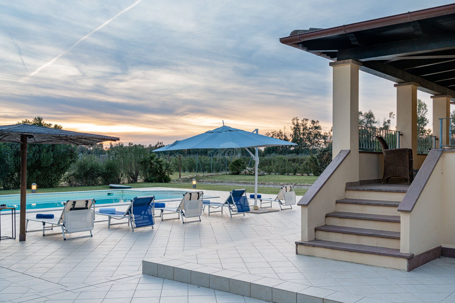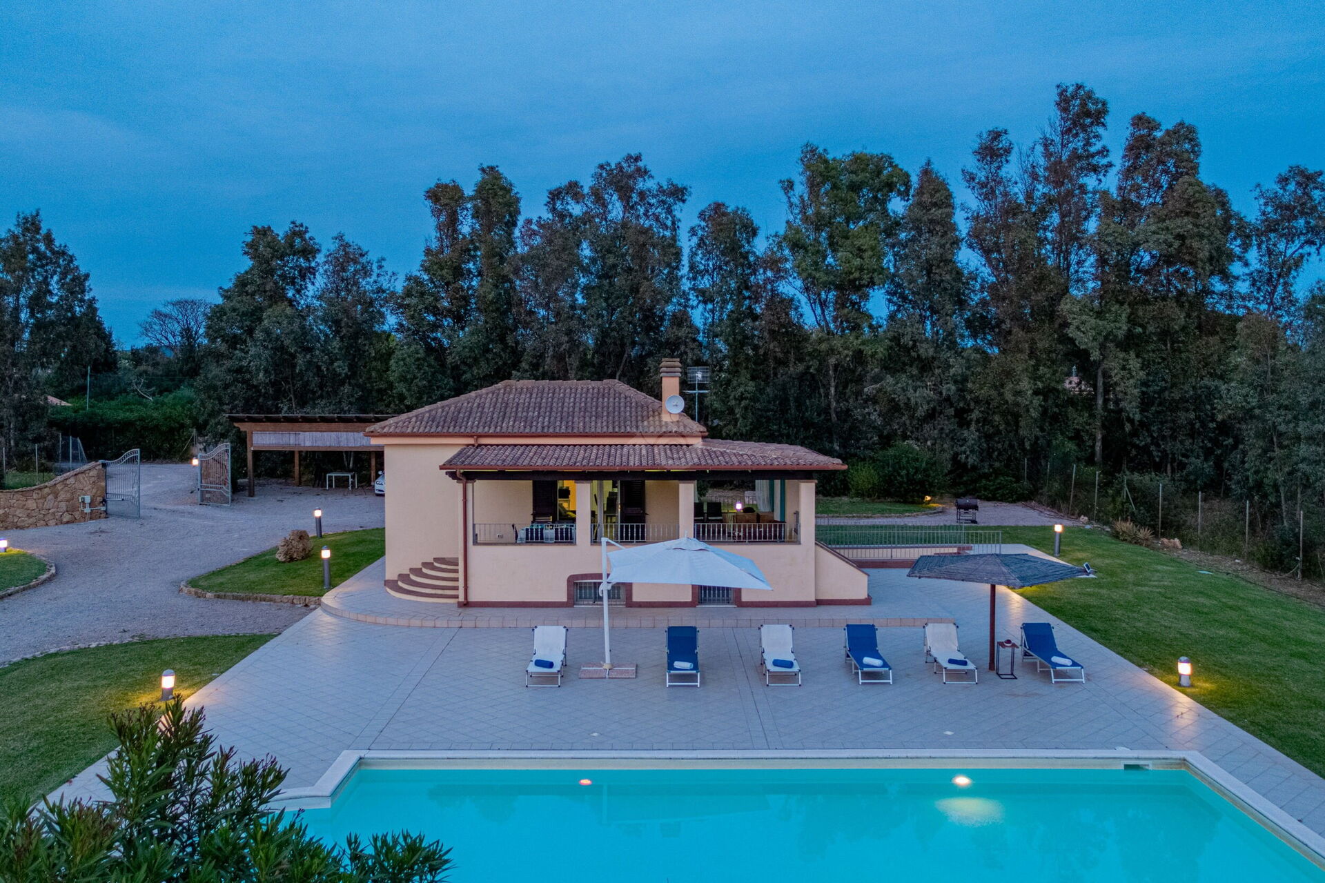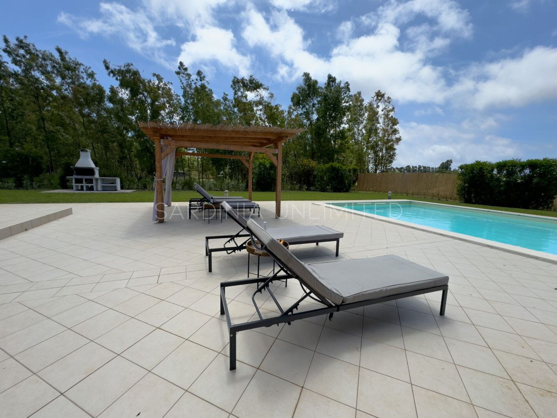 Diese Ferienvilla auf Sardinien verfügt über eine große und gemütliche Terrasse mit Grill und einem Außentisch, an dem Sie im Freien zu Mittag essen können. Die Terrasse überblickt einen großen, sorgfältig gepflasterten Bereich, der einen Solariumbereich mit Sonnenschirmen und Liegestühlen beherbergt und der den großen und klaren privaten Swimmingpool (16 x 5 m) umrahmt, der dank eines höheren Teils, in dem sich beide Erwachsenen vergnügen und entspannen können, gestaltet ist Es ist möglich zu tauchen, was für die Kleinen ist.