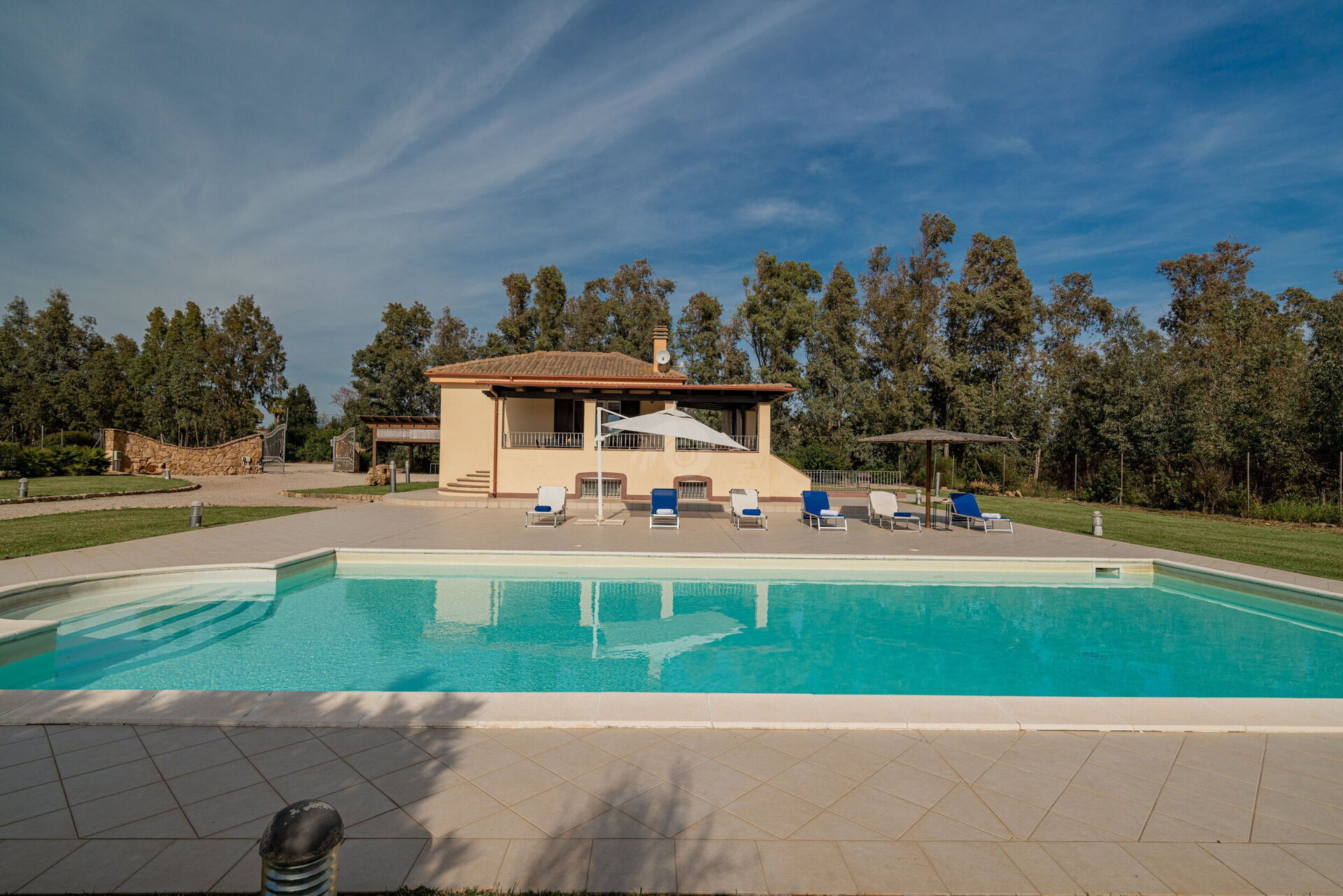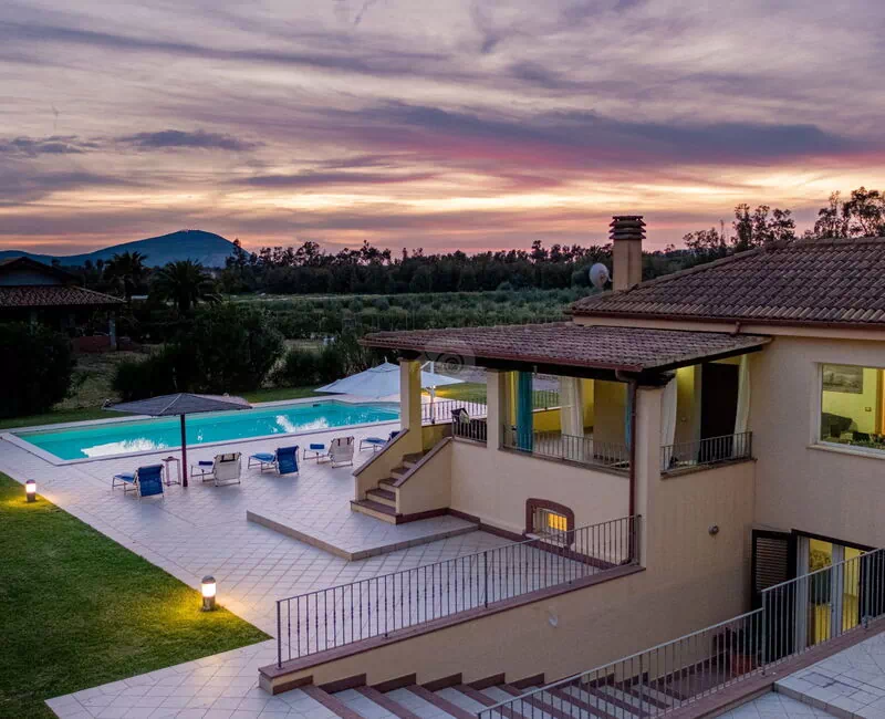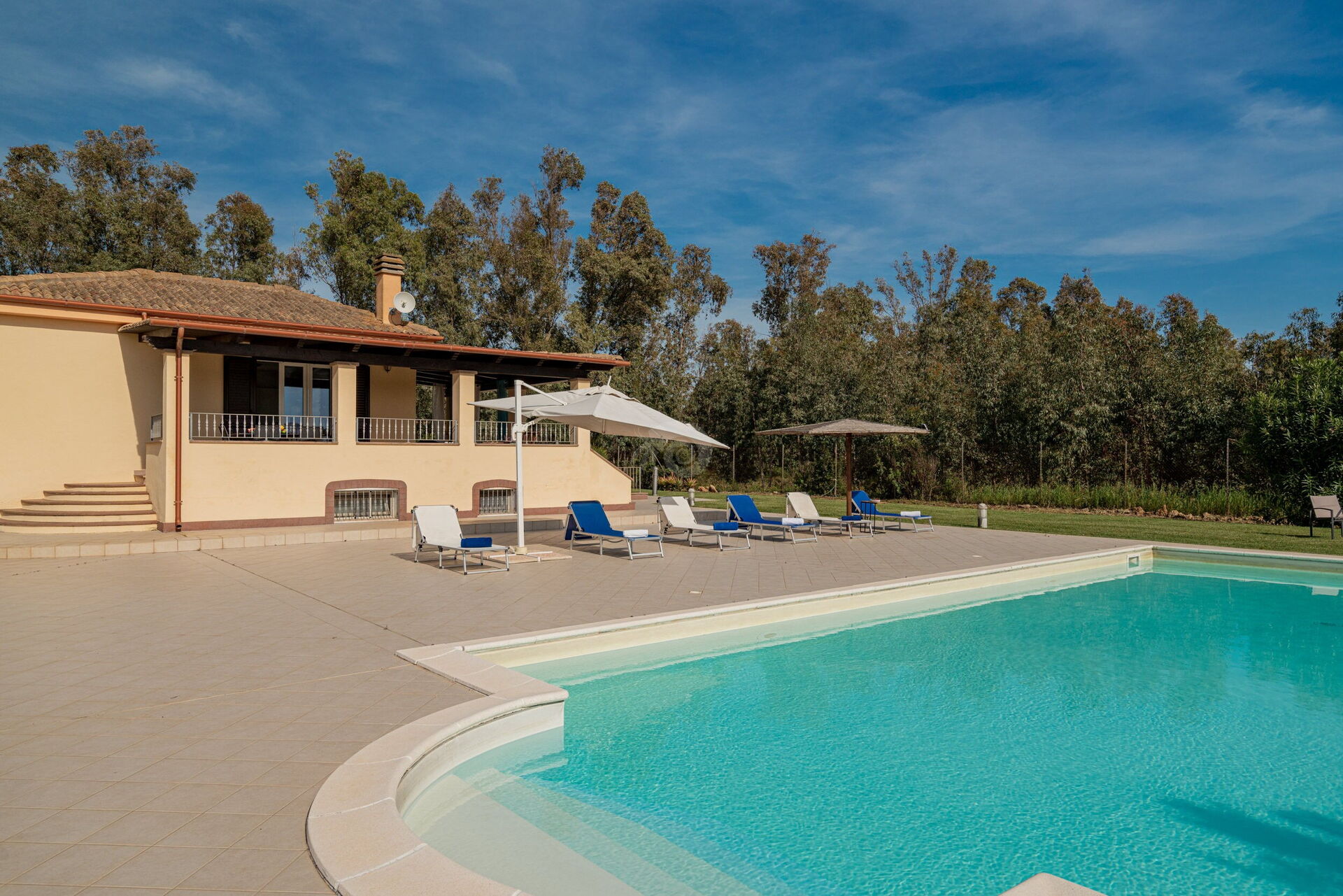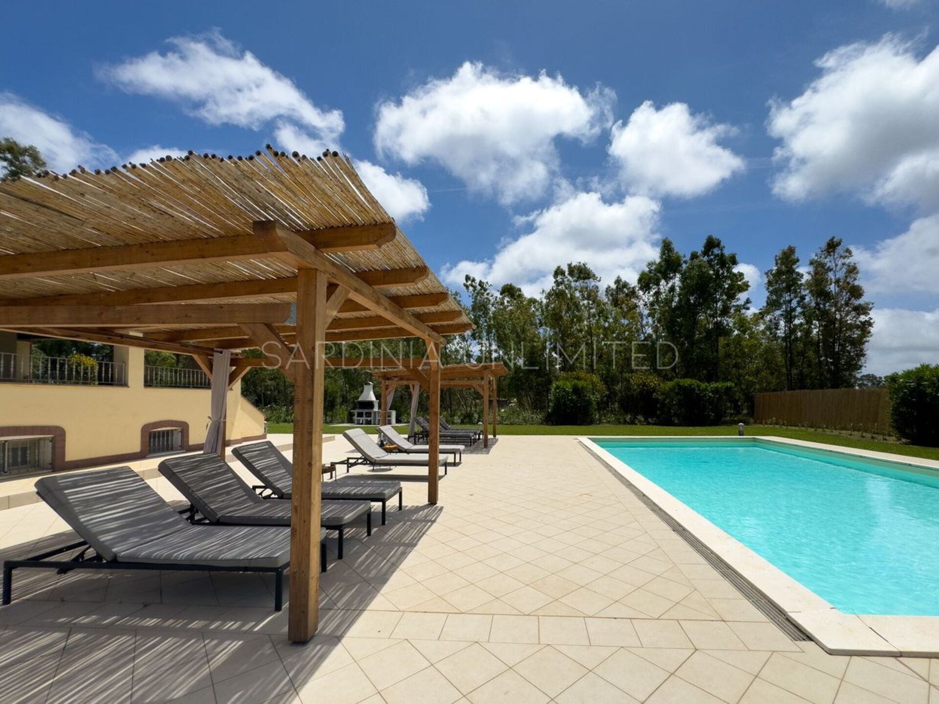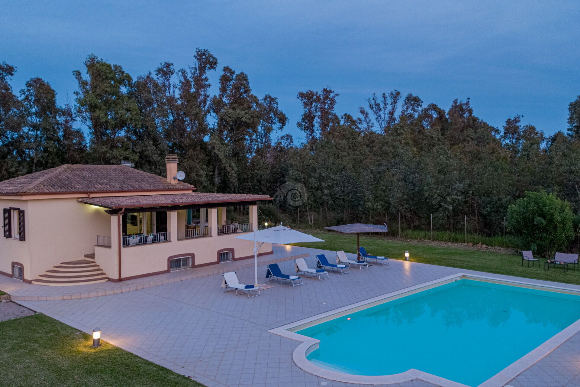 Diese Ferienvilla auf Sardinien verfügt über eine große und gemütliche Terrasse mit Grill und einem Außentisch, an dem Sie im Freien zu Mittag essen können. Die Terrasse überblickt einen großen, sorgfältig gepflasterten Bereich, der einen Solariumbereich mit Sonnenschirmen und Liegestühlen beherbergt und der den großen und klaren privaten Swimmingpool (16 x 5 m) umrahmt, der dank eines höheren Teils, in dem sich beide Erwachsenen vergnügen und entspannen können, gestaltet ist Es ist möglich zu tauchen, was für die Kleinen ist.