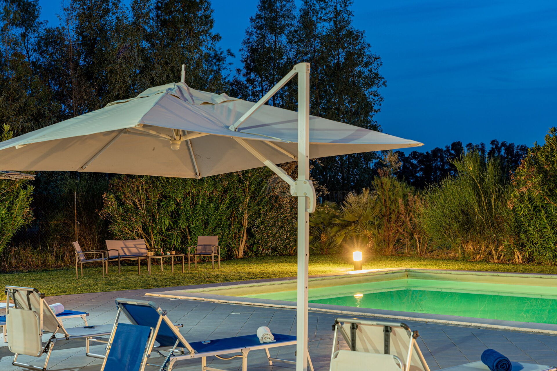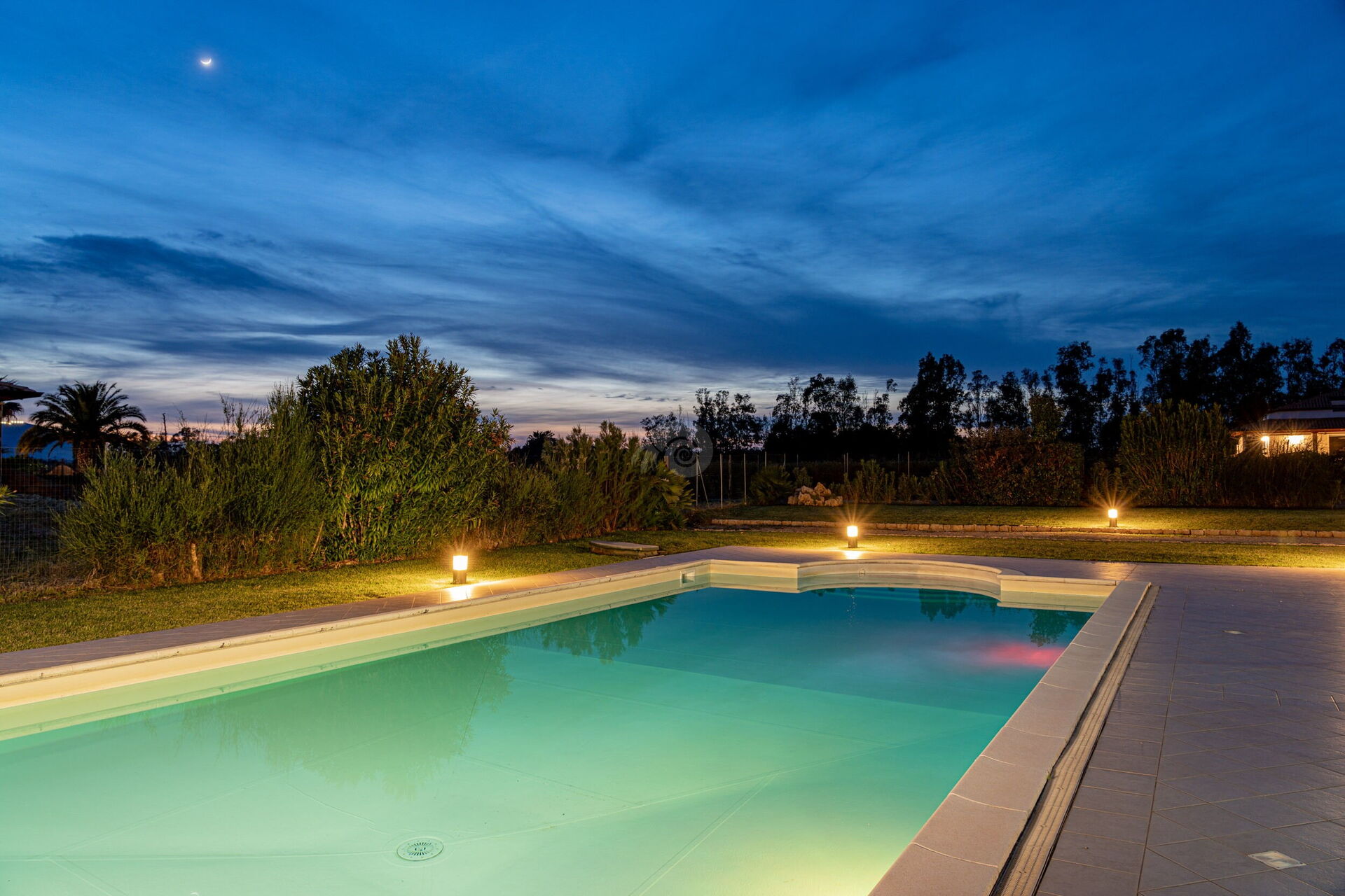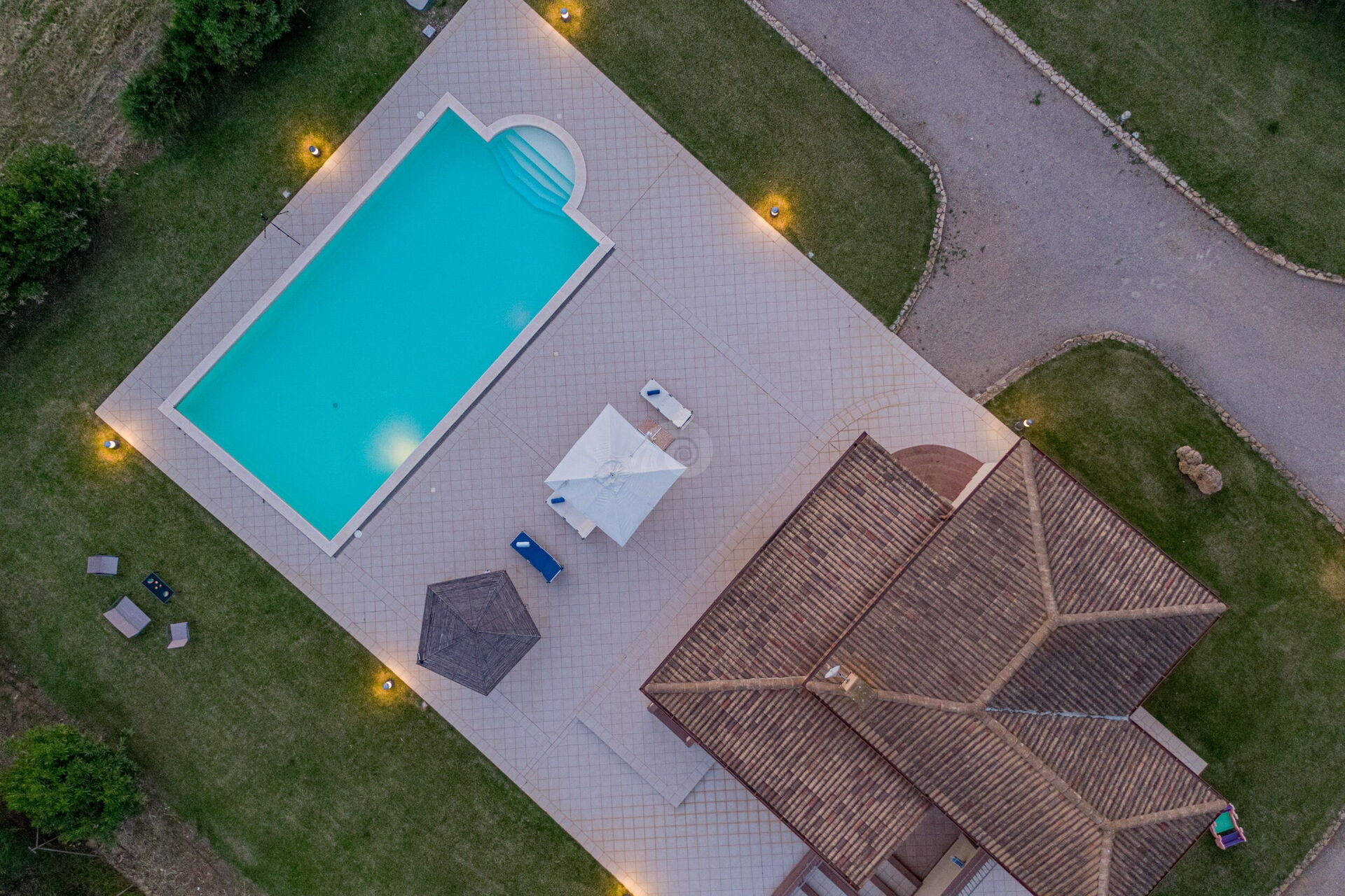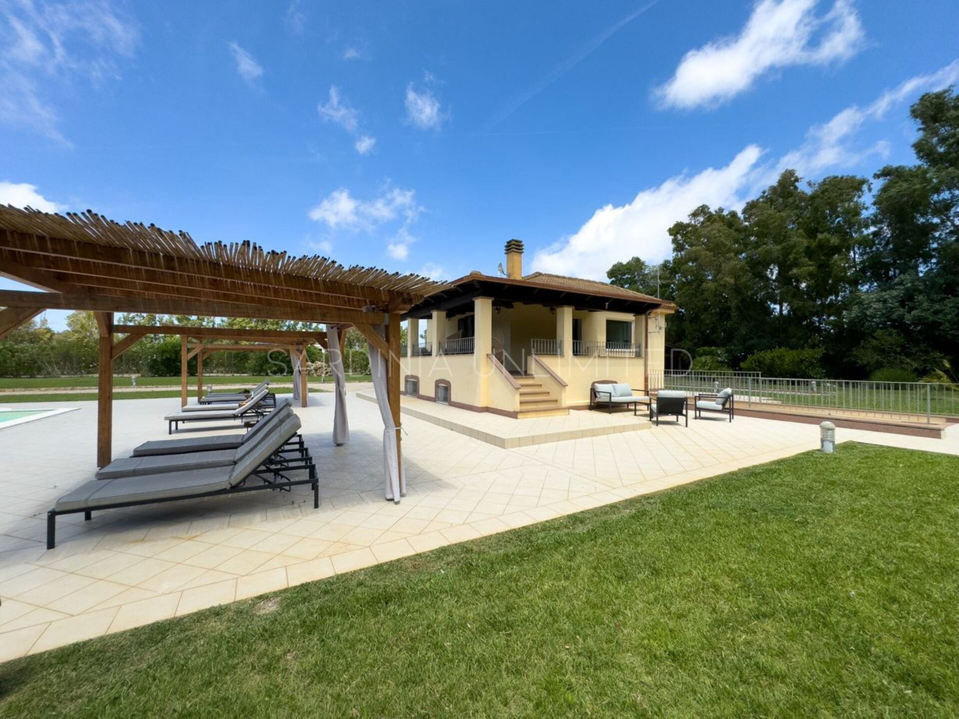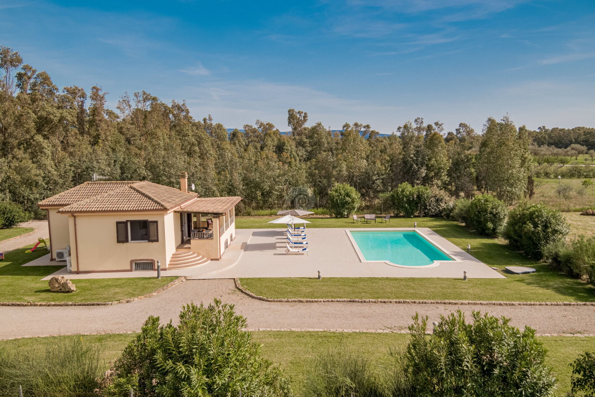 Diese Ferienvilla auf Sardinien verfügt über eine große und gemütliche Terrasse mit Grill und einem Außentisch, an dem Sie im Freien zu Mittag essen können. Die Terrasse überblickt einen großen, sorgfältig gepflasterten Bereich, der einen Solariumbereich mit Sonnenschirmen und Liegestühlen beherbergt und der den großen und klaren privaten Swimmingpool (16 x 5 m) umrahmt, der dank eines höheren Teils, in dem sich beide Erwachsenen vergnügen und entspannen können, gestaltet ist Es ist möglich zu tauchen, was für die Kleinen ist.