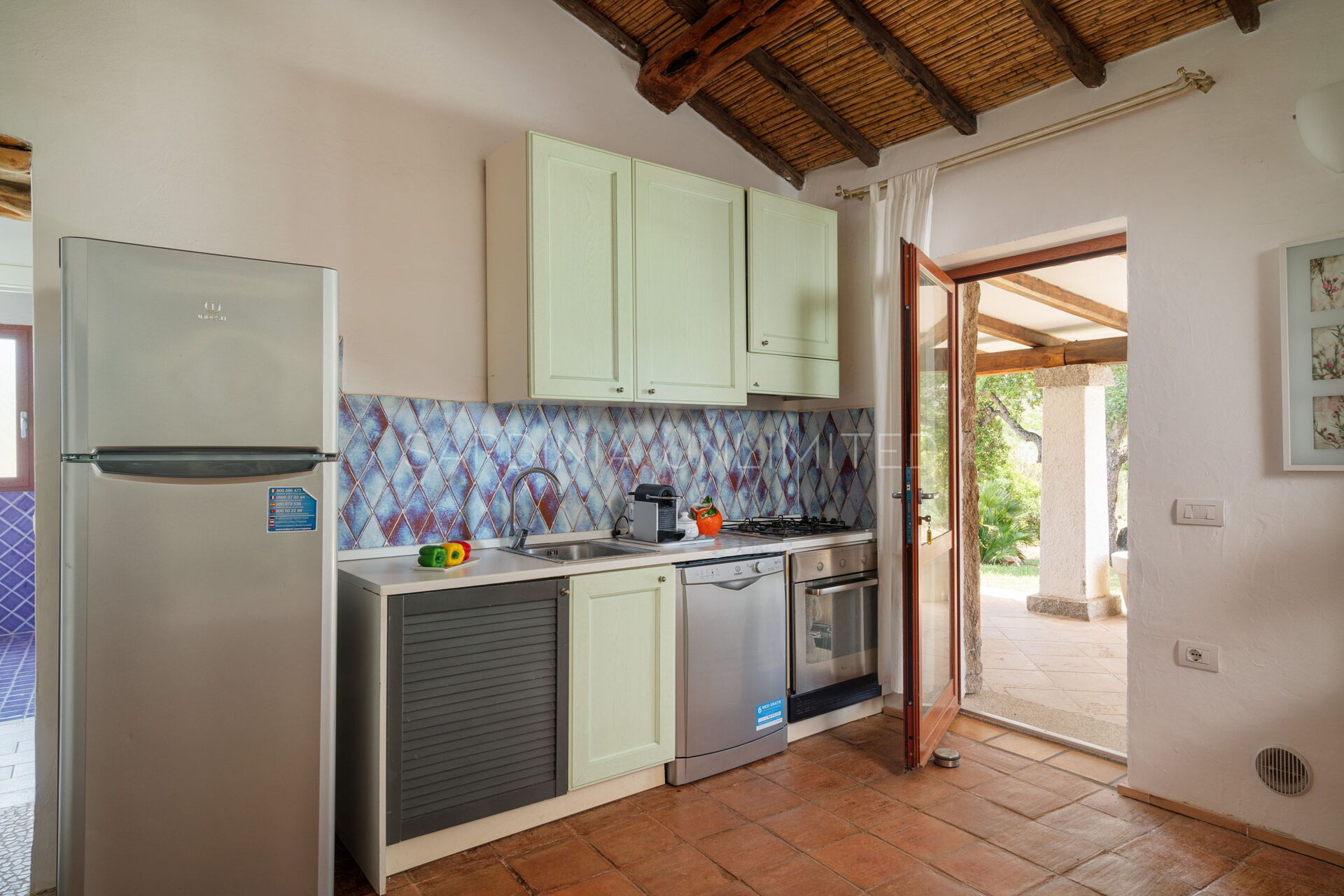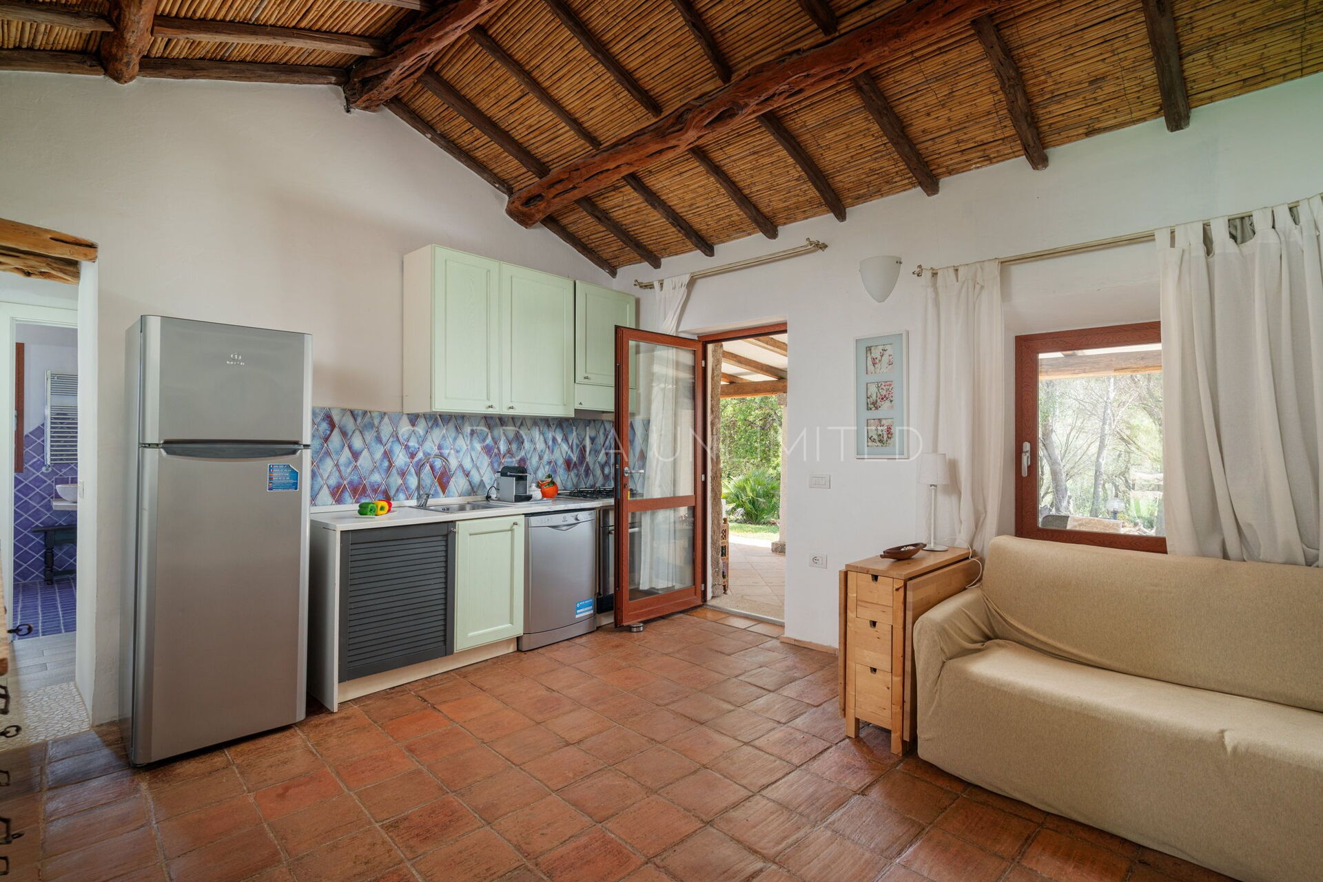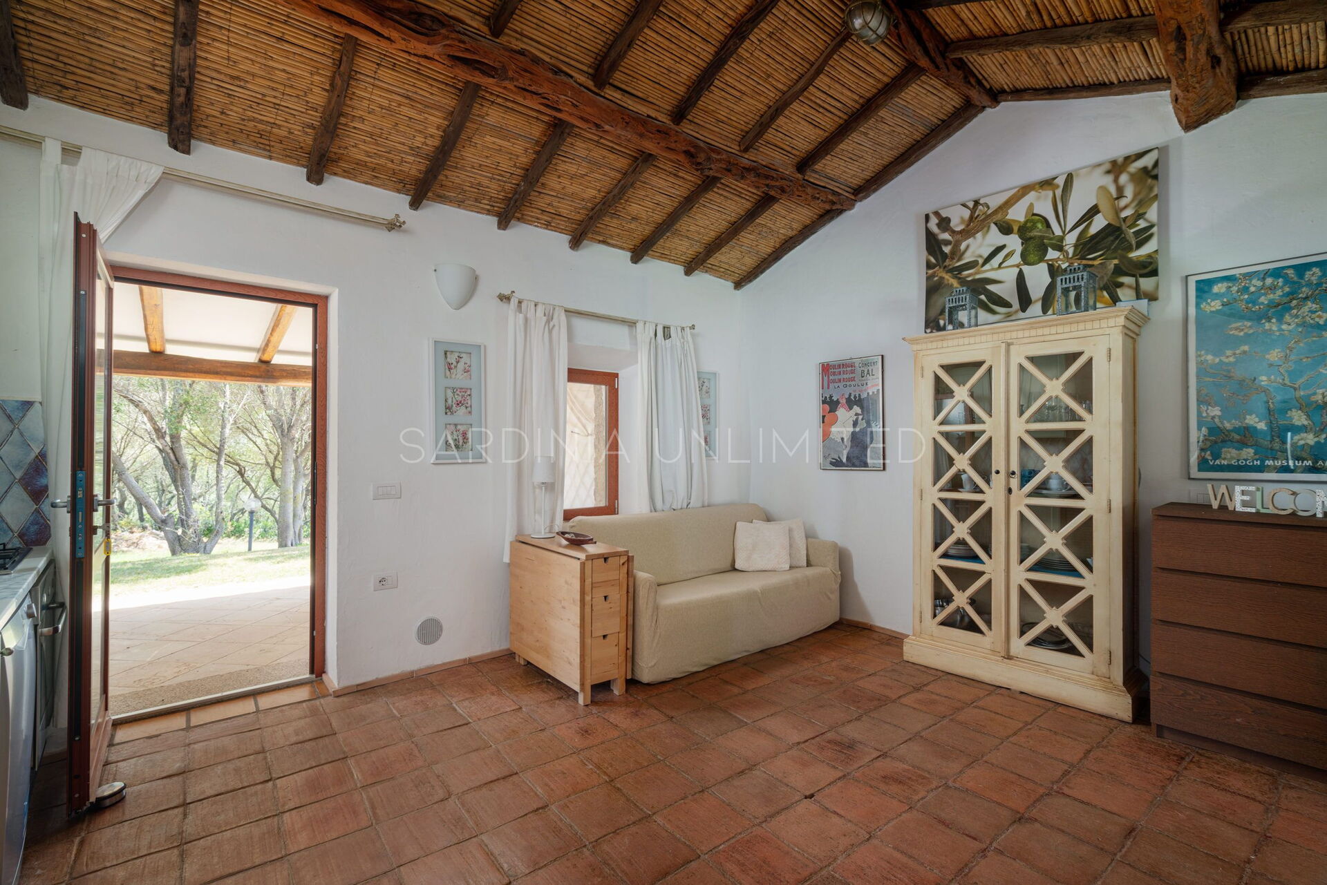 Dieses Ferienhaus auf Sardinien verfügt über einen großen Panoramagarten, ideal für Kinder, um Spaß zu haben oder angenehme Momente der Entspannung zu verbringen. Um die Düfte und Farben der umliegenden Natur zu genießen, gibt es eine große Veranda mit einem Tisch für angenehme Mahlzeiten im Freien und einen Solariumbereich. Villetta Dahlia verfügt außerdem über ein kleines und einladendes Nebengebäude mit einem Doppelbett und eigenem Bad.