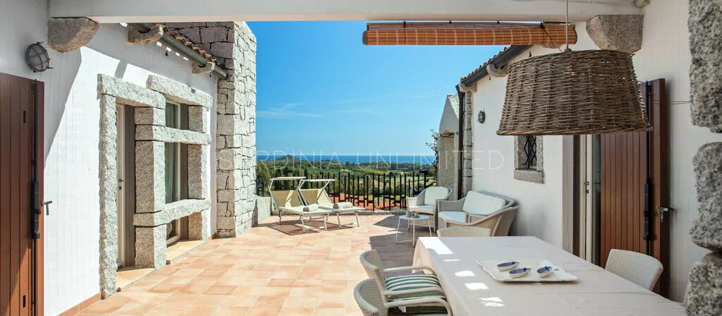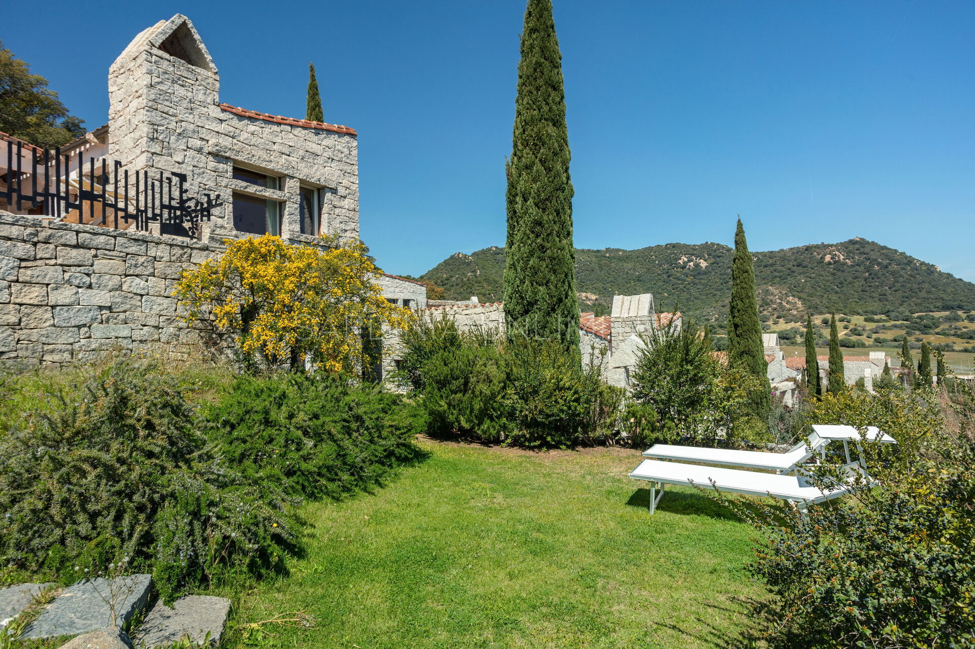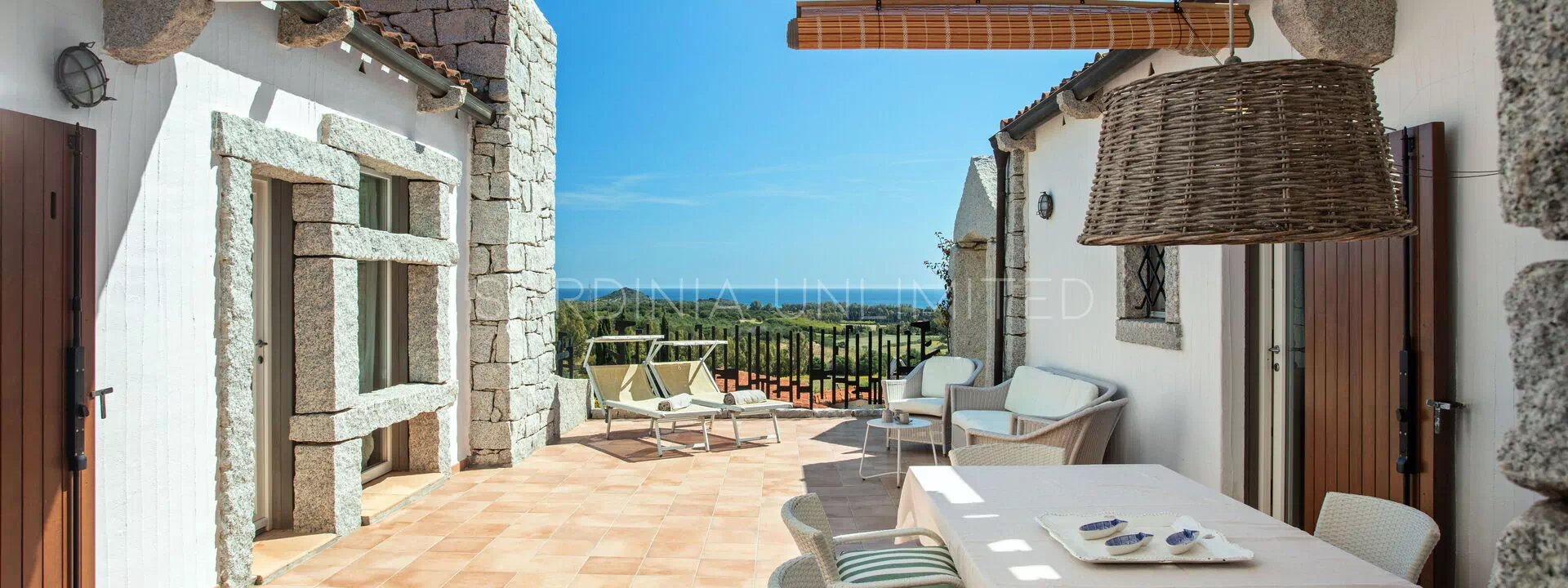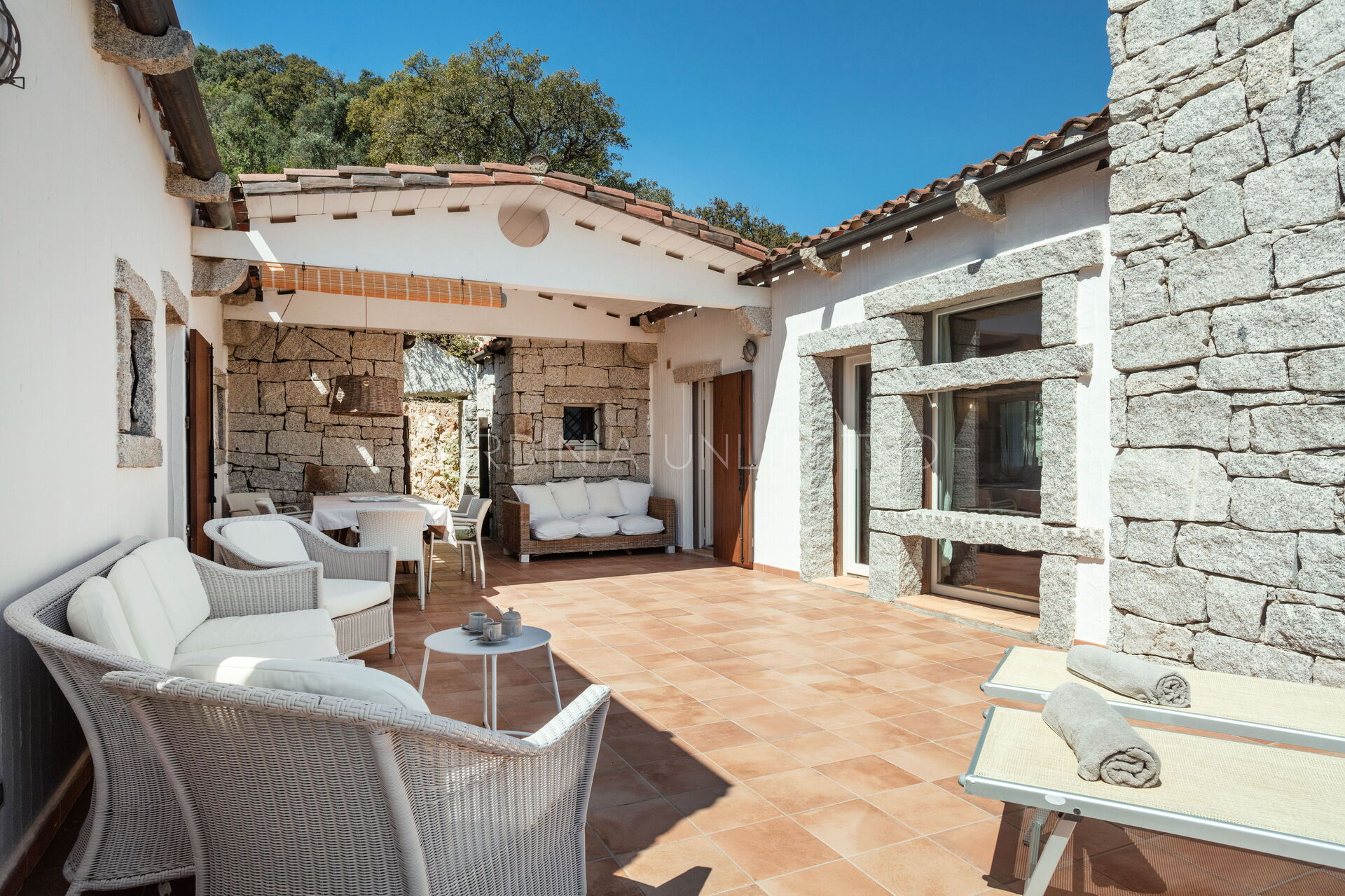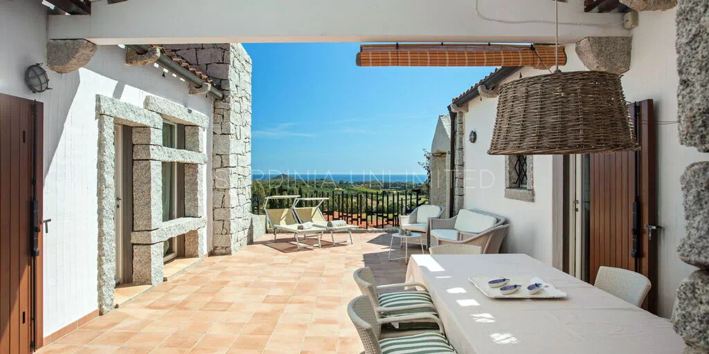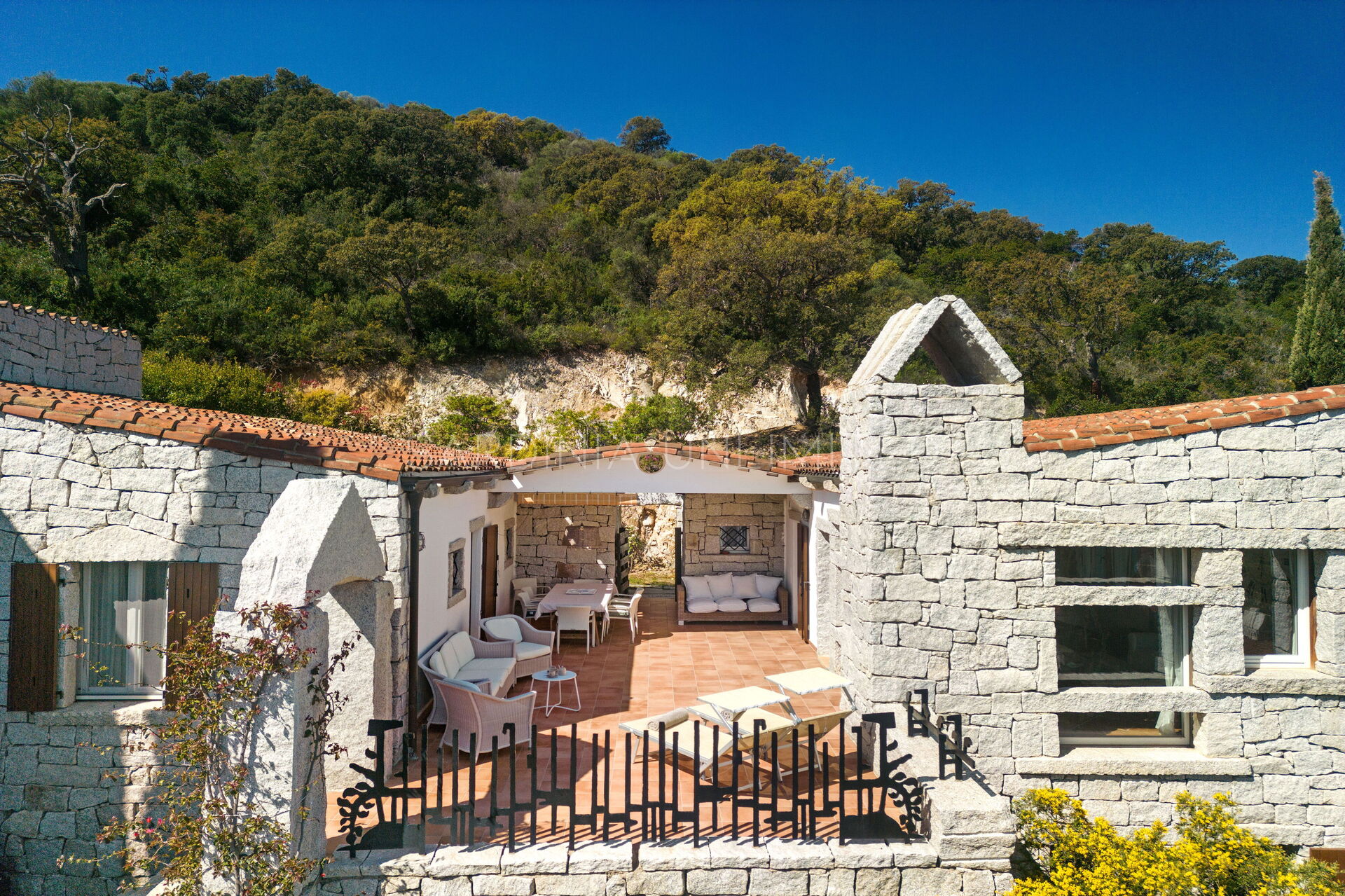 Die unregelmäßigen Formen des Granits, die das gesamte Dorf auszeichnen, stehen in völliger Harmonie mit der umgebenden Natur und vermitteln warme Einblicke in die Landschaften vergangener Zeiten. Der Charme der Natur mit ihren Farben und Düften lässt sich bequem von der großen und hellen Außenterrasse mit Meerblick bewundern, die mit einem Solariumbereich ausgestattet ist, wo Sie angenehme Momente in Gesellschaft verbringen können. Das Ganze wird von imposanten Steinblöcken begrenzt, die die atemberaubende Landschaft im Hintergrund zu umrahmen scheinen.