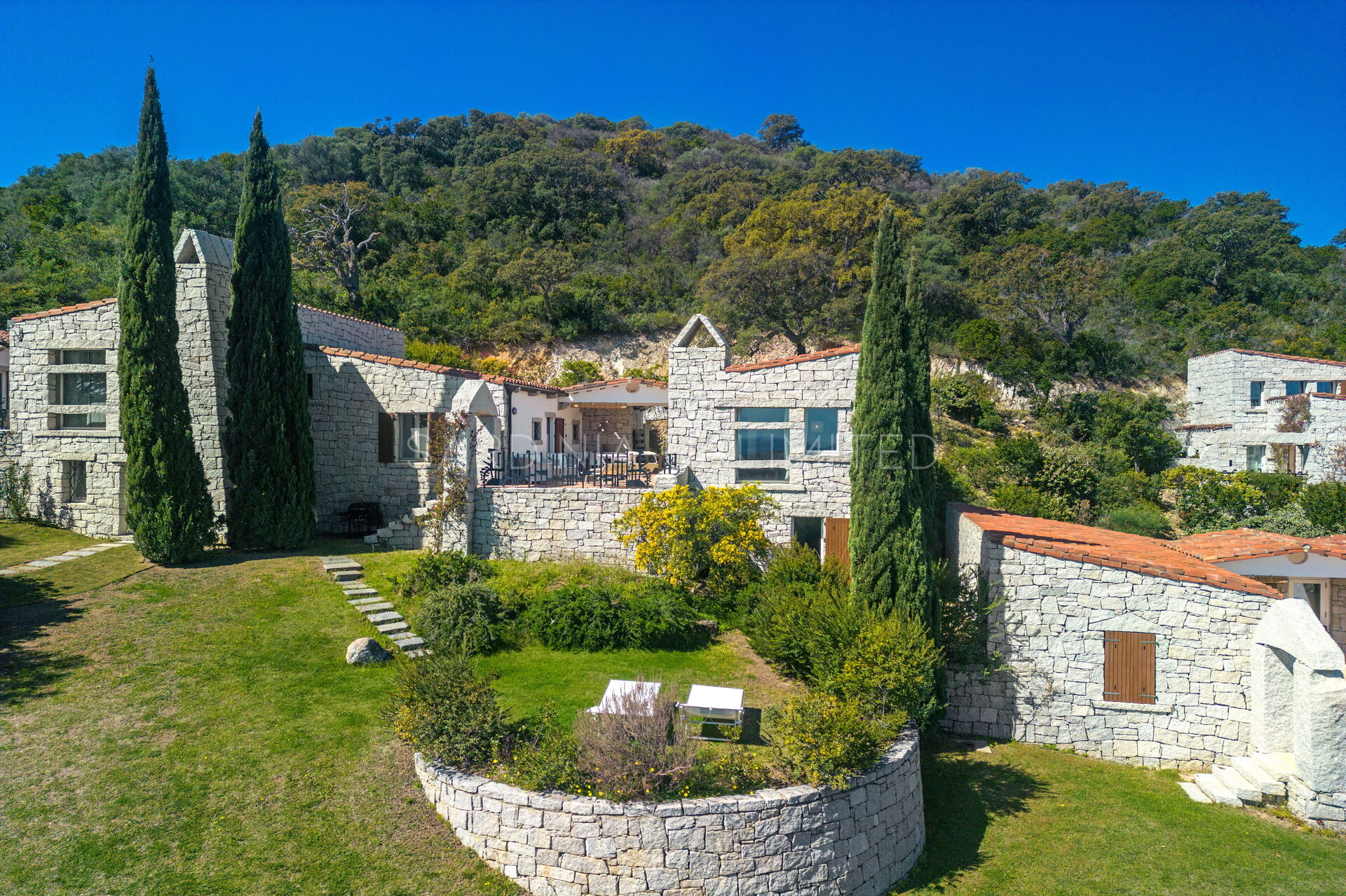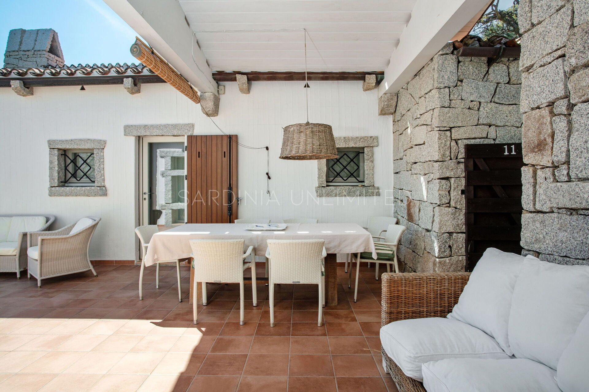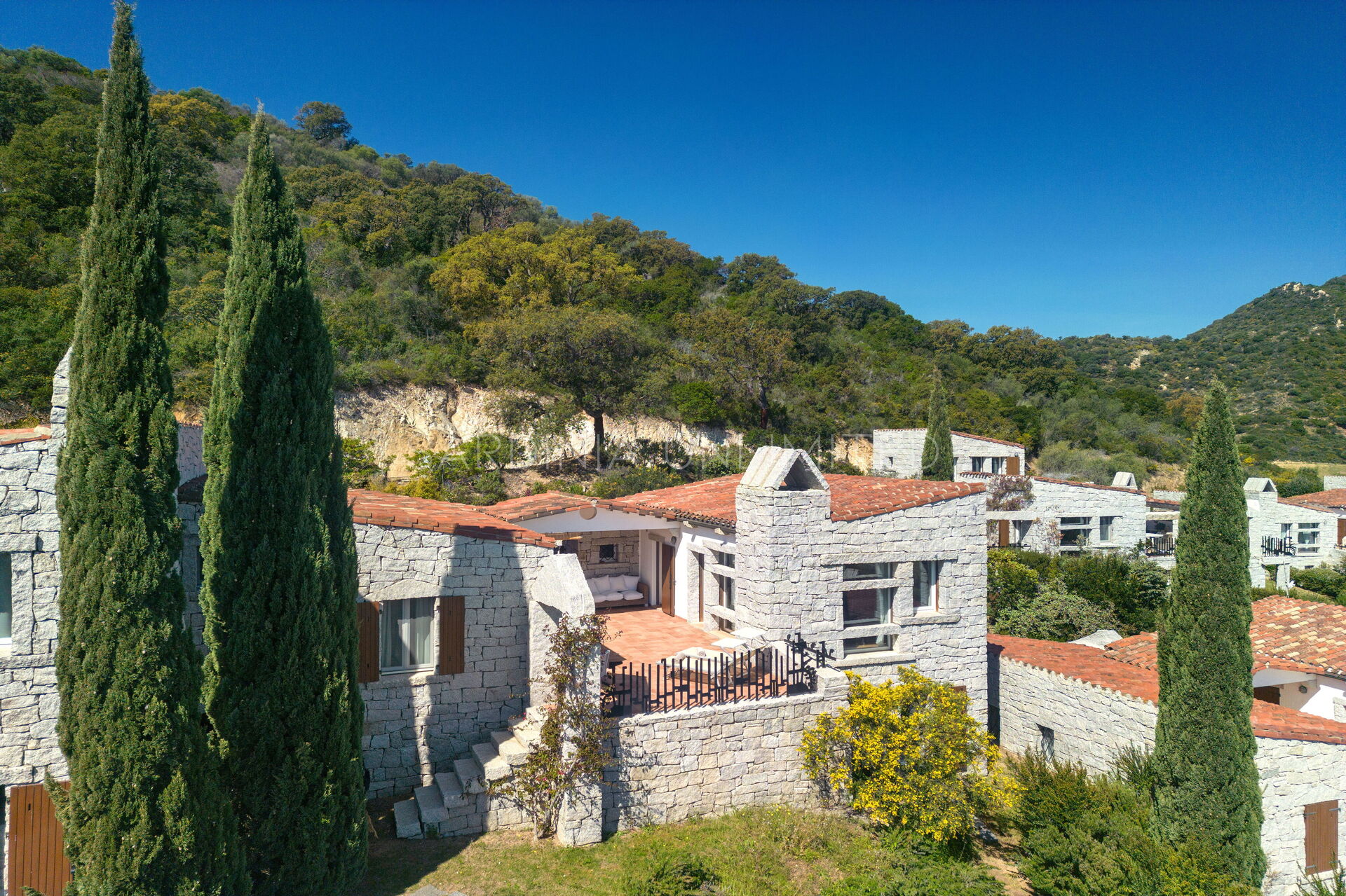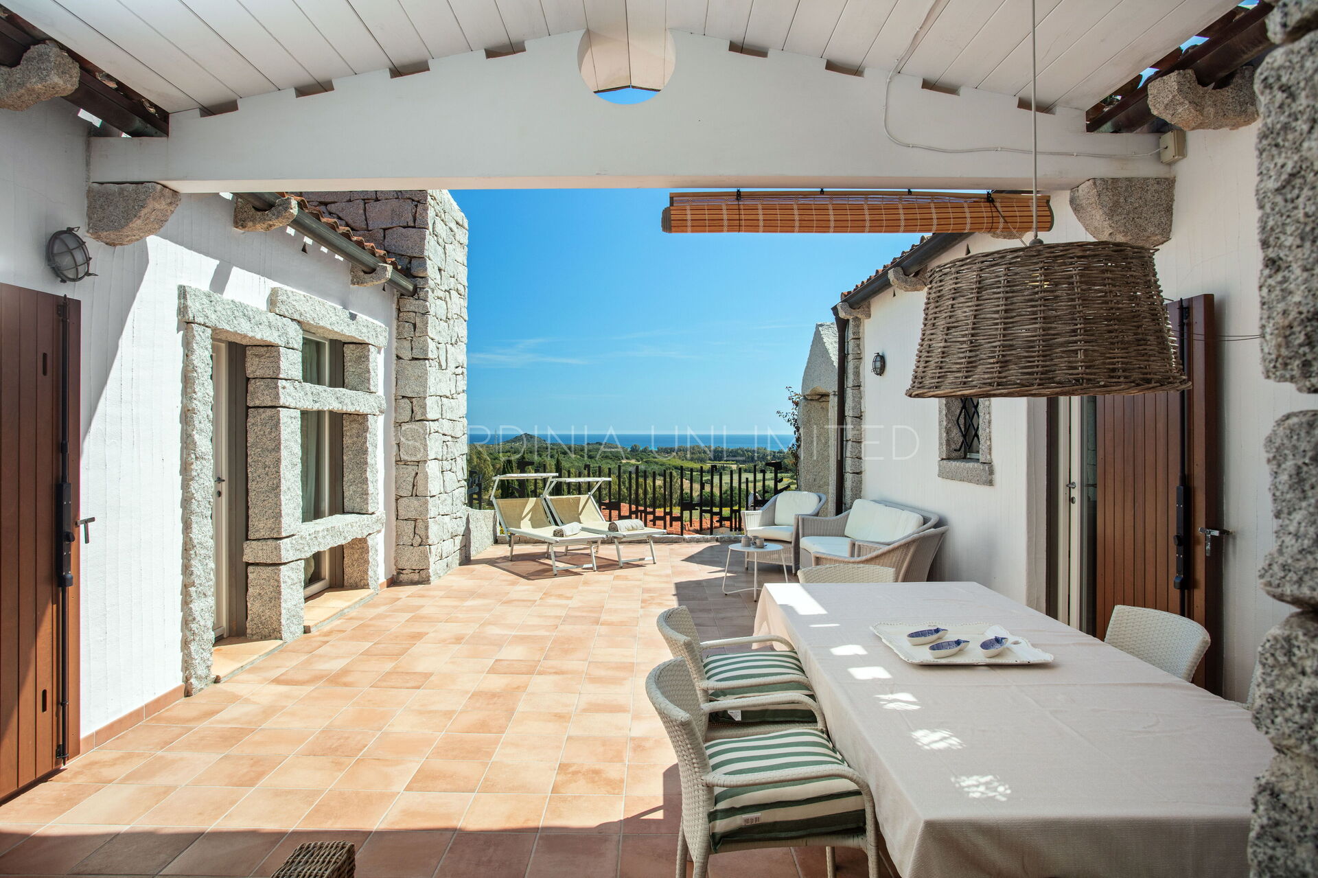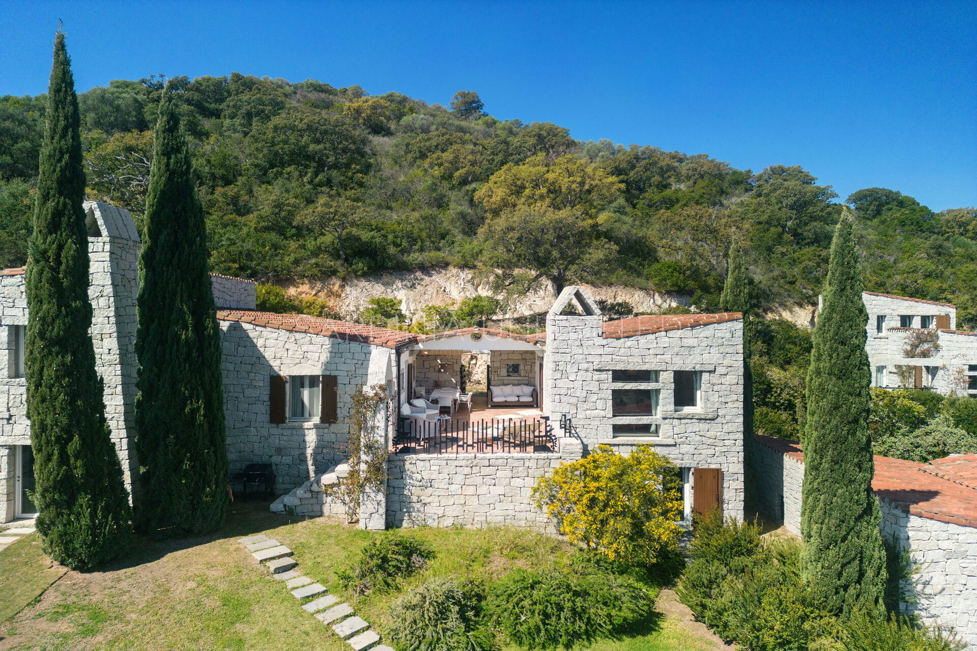 Die unregelmäßigen Formen des Granits, die das gesamte Dorf auszeichnen, stehen in völliger Harmonie mit der umgebenden Natur und vermitteln warme Einblicke in die Landschaften vergangener Zeiten. Der Charme der Natur mit ihren Farben und Düften lässt sich bequem von der großen und hellen Außenterrasse mit Meerblick bewundern, die mit einem Solariumbereich ausgestattet ist, wo Sie angenehme Momente in Gesellschaft verbringen können. Das Ganze wird von imposanten Steinblöcken begrenzt, die die atemberaubende Landschaft im Hintergrund zu umrahmen scheinen.