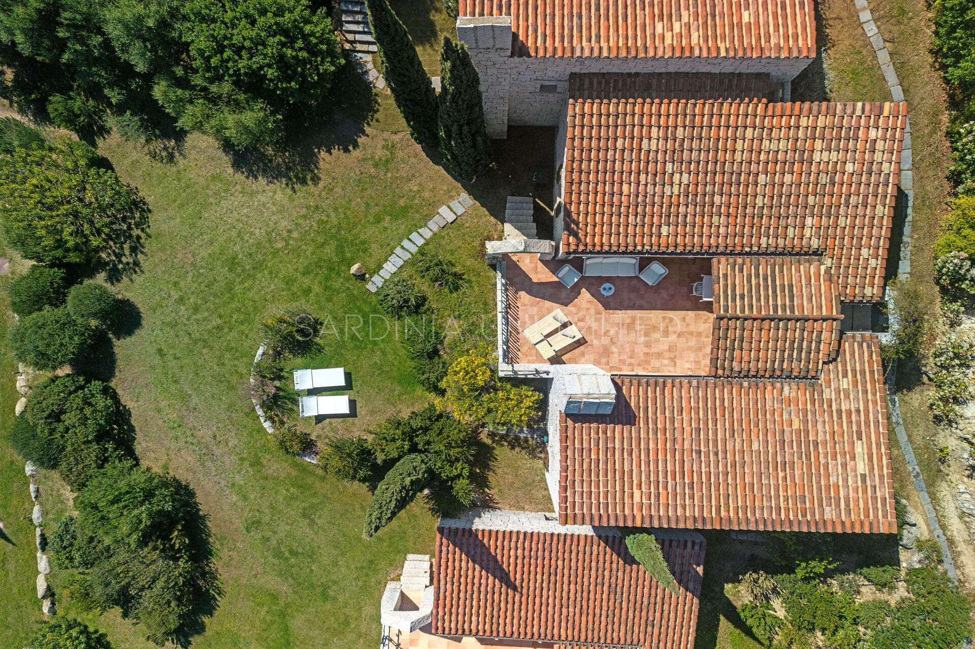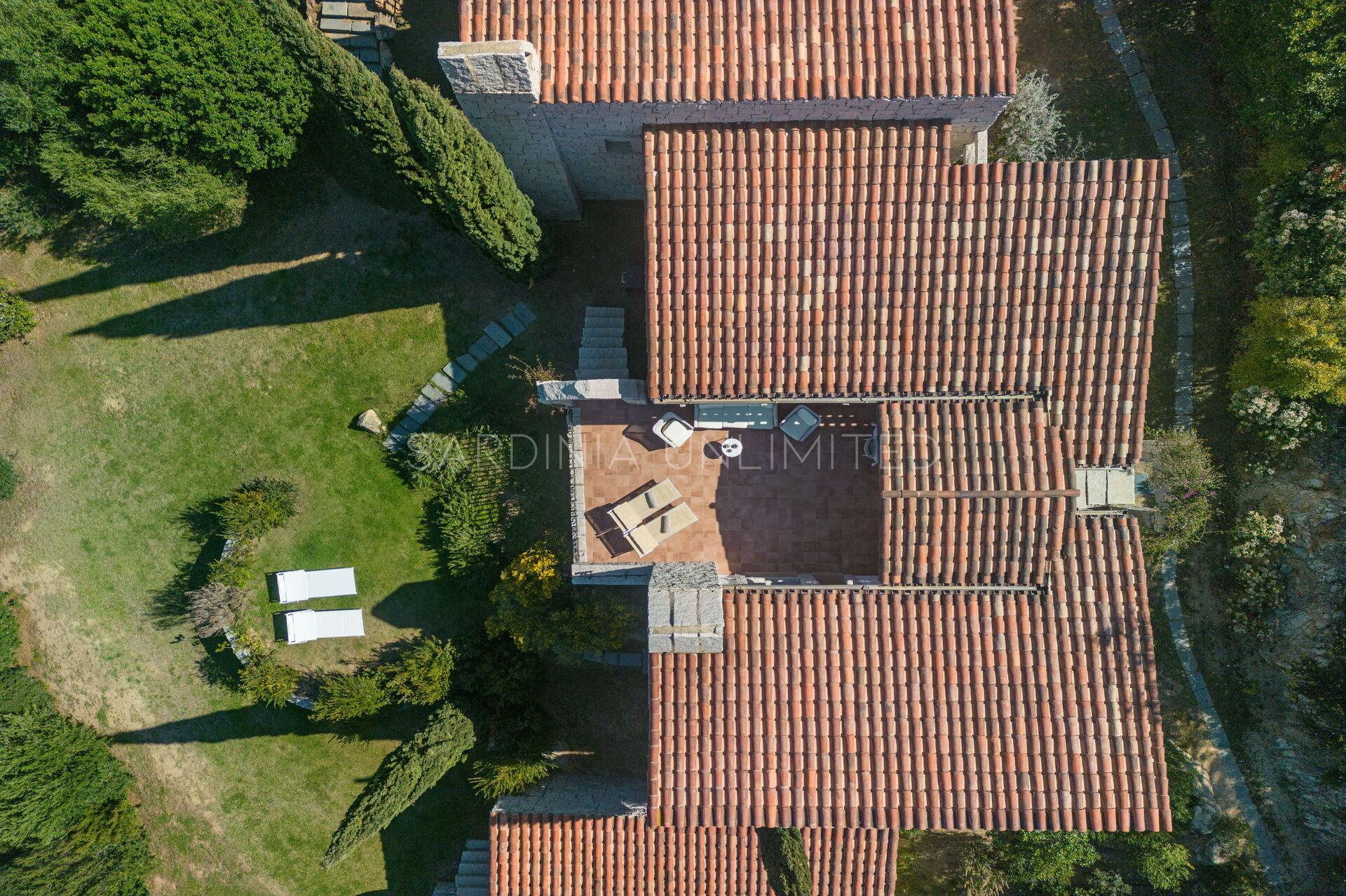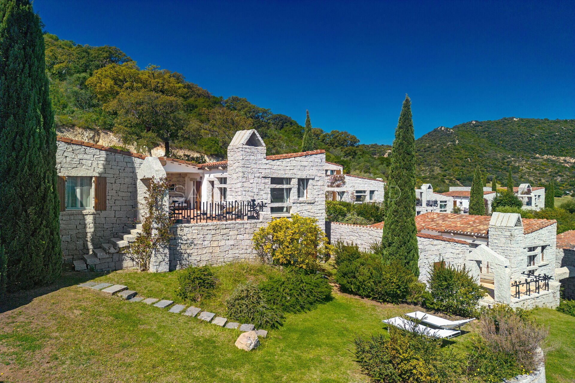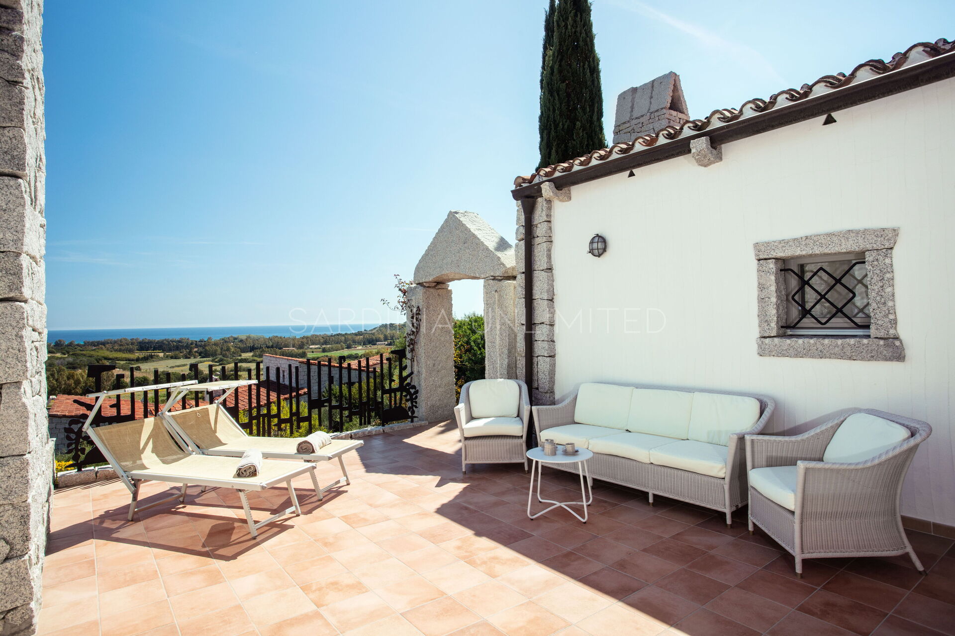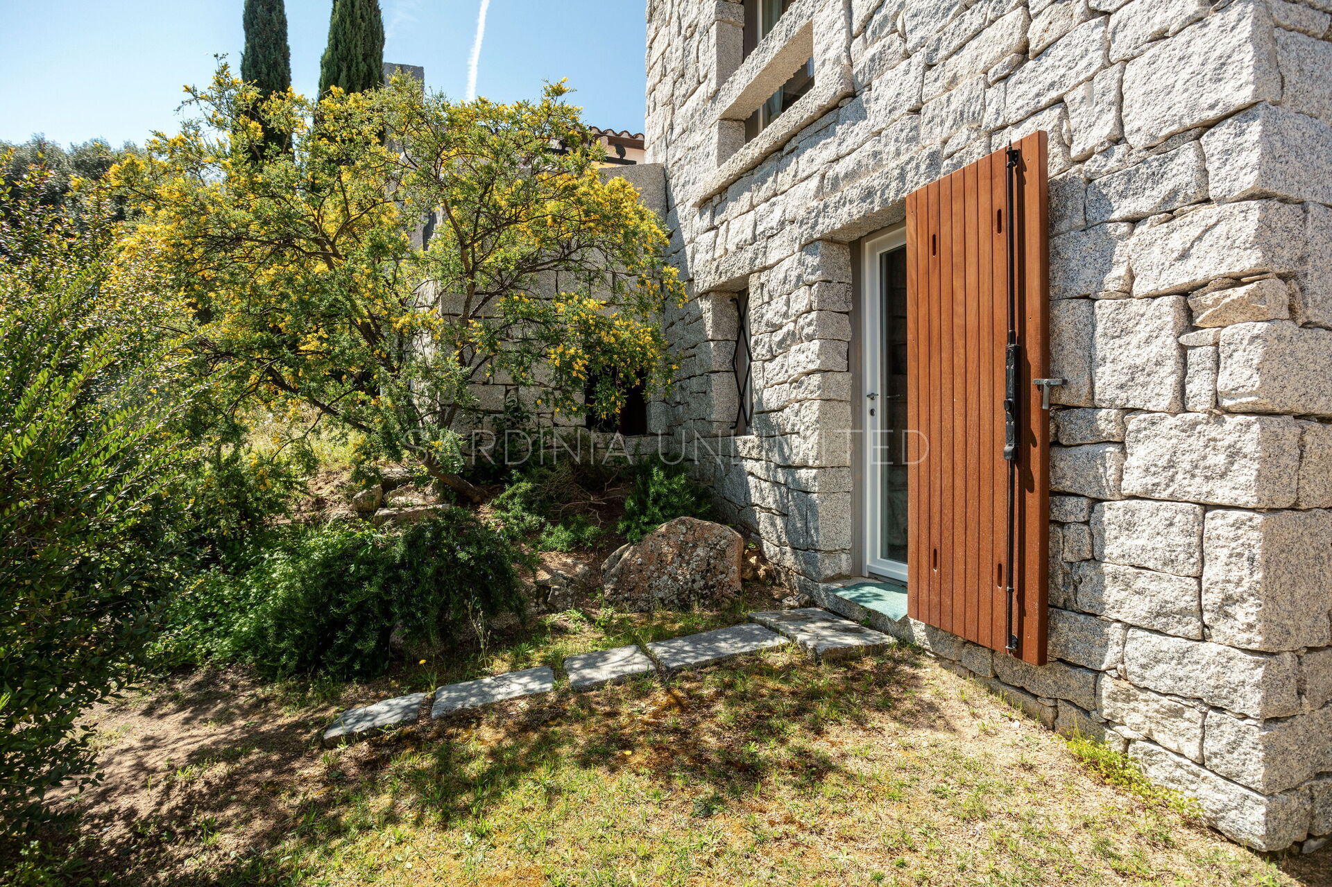 Die unregelmäßigen Formen des Granits, die das gesamte Dorf auszeichnen, stehen in völliger Harmonie mit der umgebenden Natur und vermitteln warme Einblicke in die Landschaften vergangener Zeiten. Der Charme der Natur mit ihren Farben und Düften lässt sich bequem von der großen und hellen Außenterrasse mit Meerblick bewundern, die mit einem Solariumbereich ausgestattet ist, wo Sie angenehme Momente in Gesellschaft verbringen können. Das Ganze wird von imposanten Steinblöcken begrenzt, die die atemberaubende Landschaft im Hintergrund zu umrahmen scheinen.