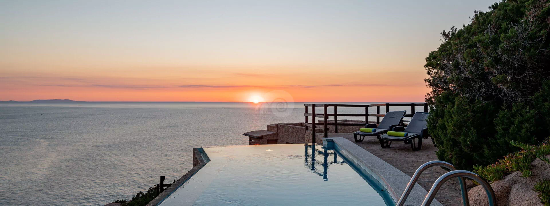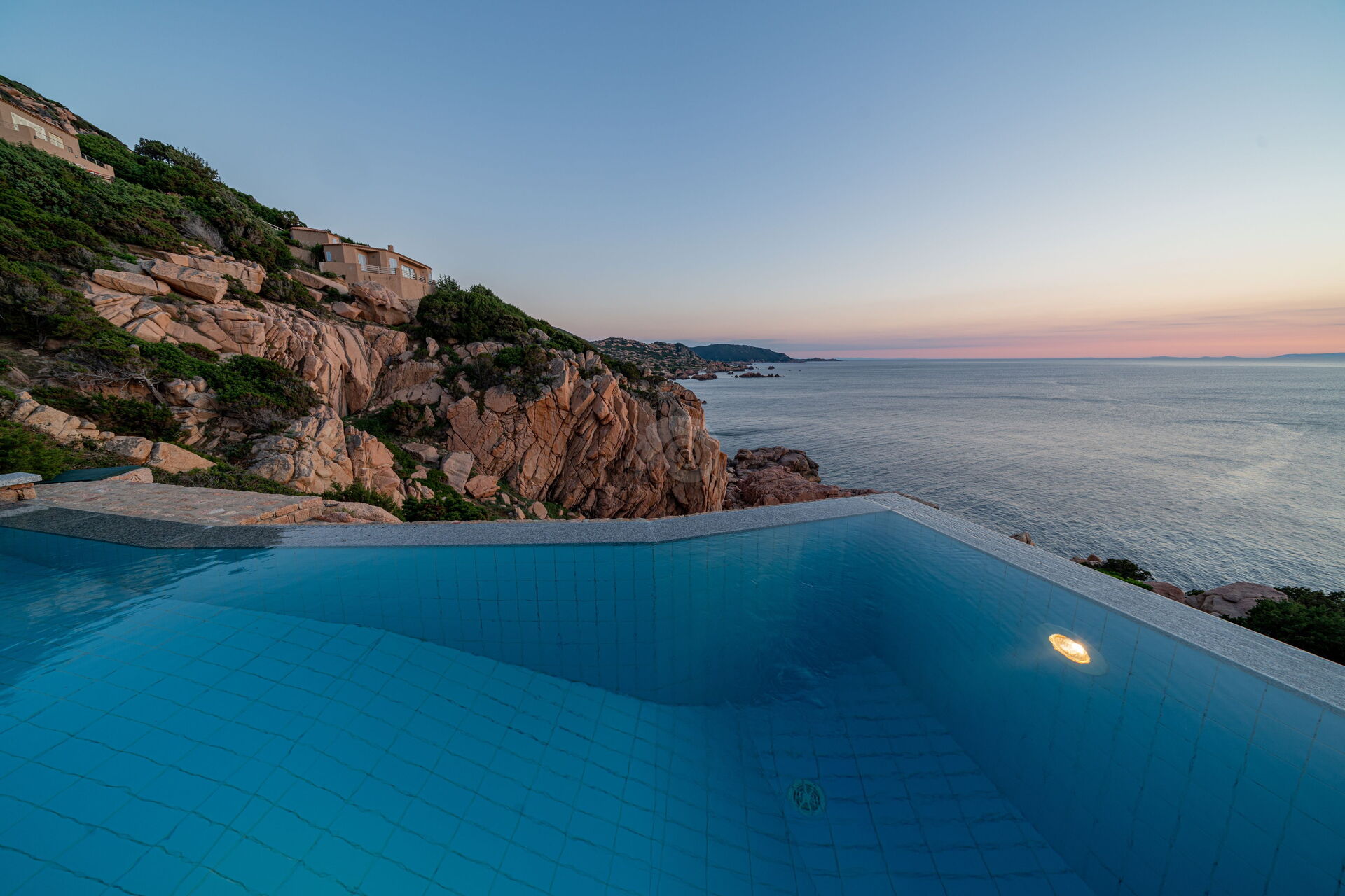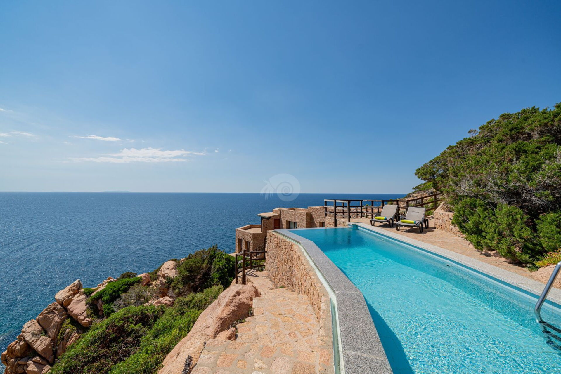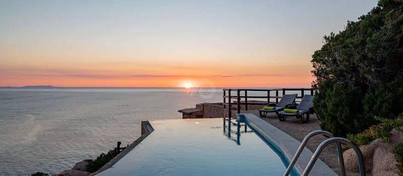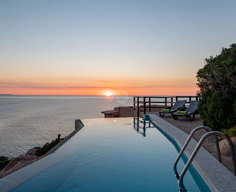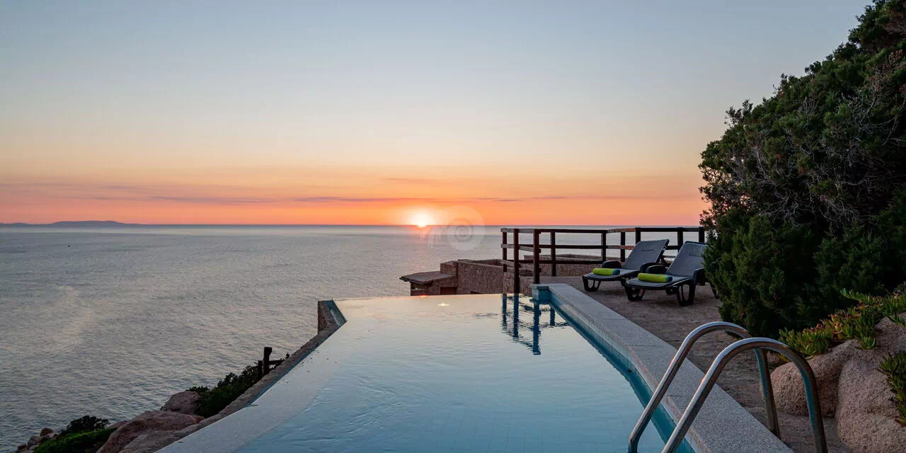 Der Infinity-Pool, der mit einem Ruhebereich ausgestattet ist, befindet sich auf den Granitfelsen, die die Landschaft der Costa Paradiso charakterisieren. Diese Felsen wurden vom Wind im Laufe der Jahre geformt und neu gestaltet, um ihr die unterschiedlichsten Formen zu verleihen.