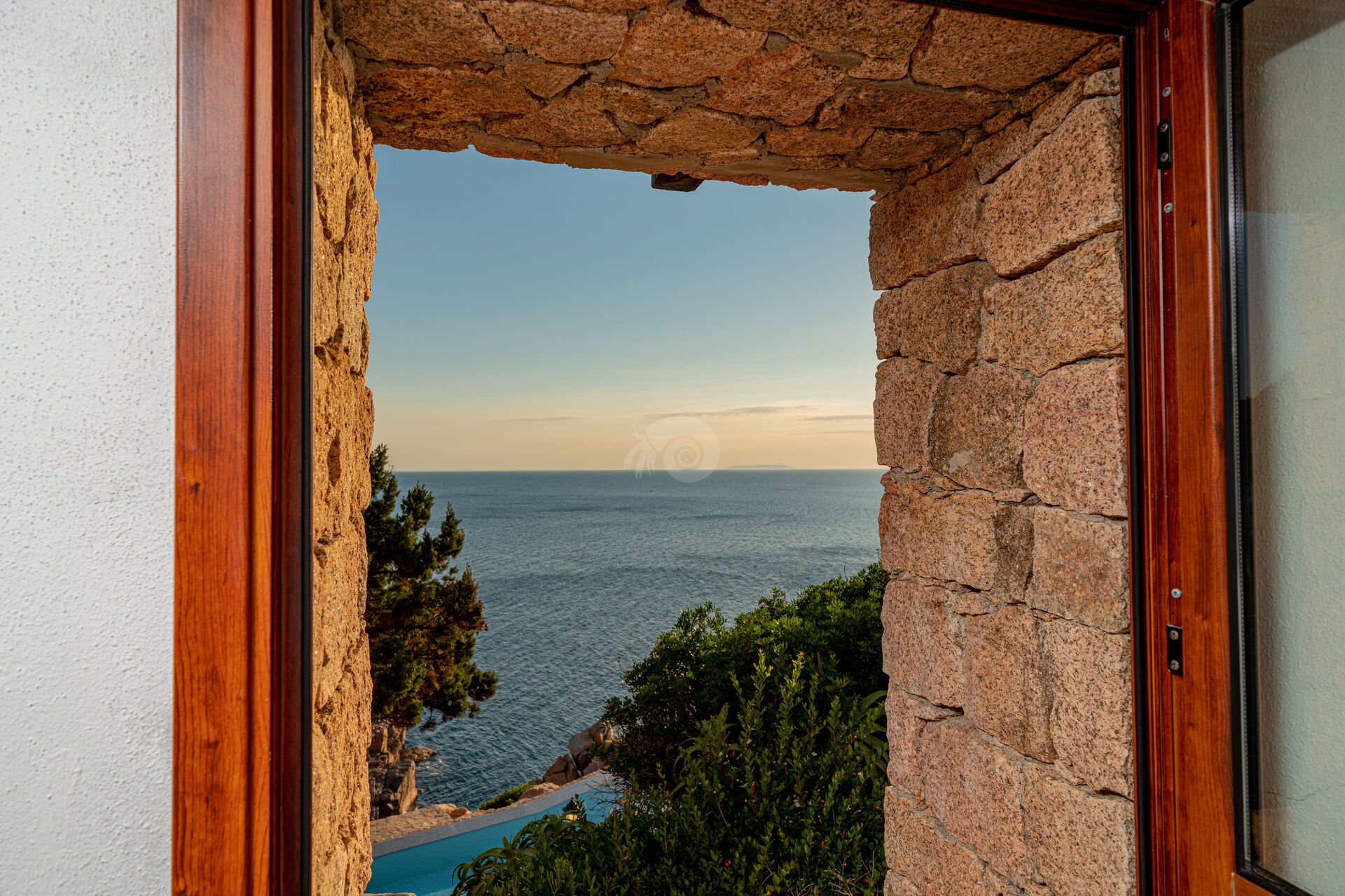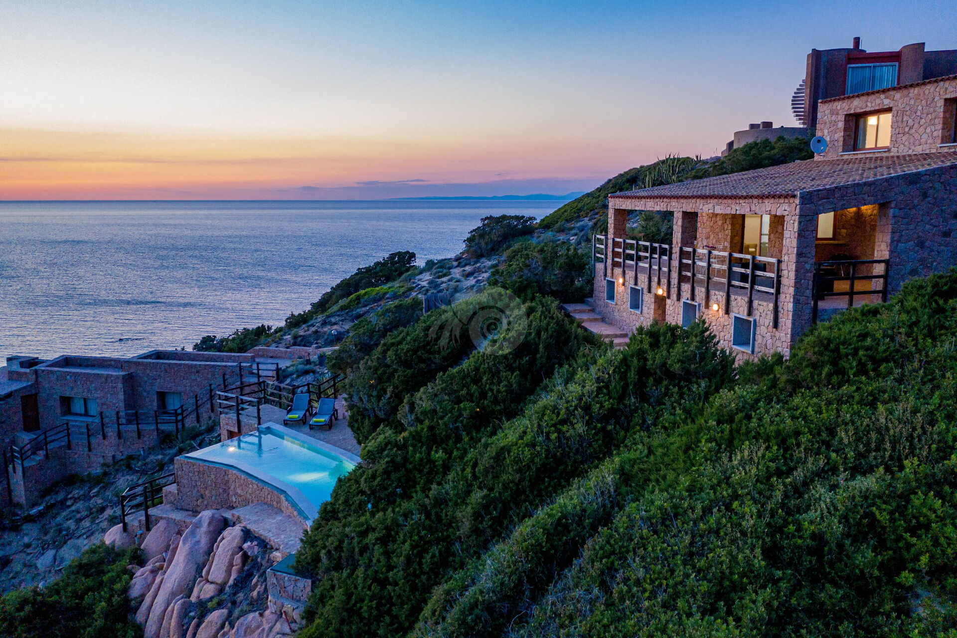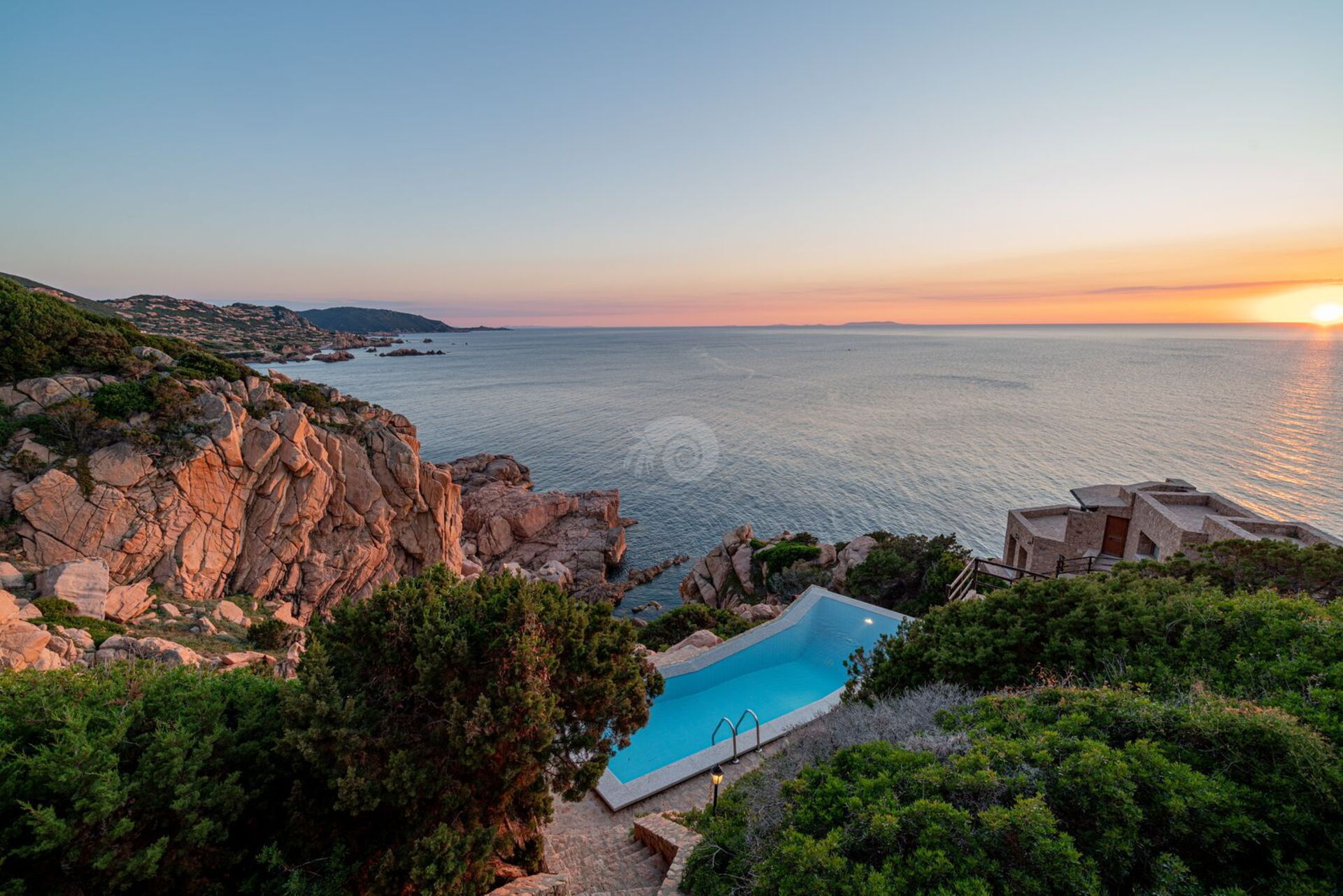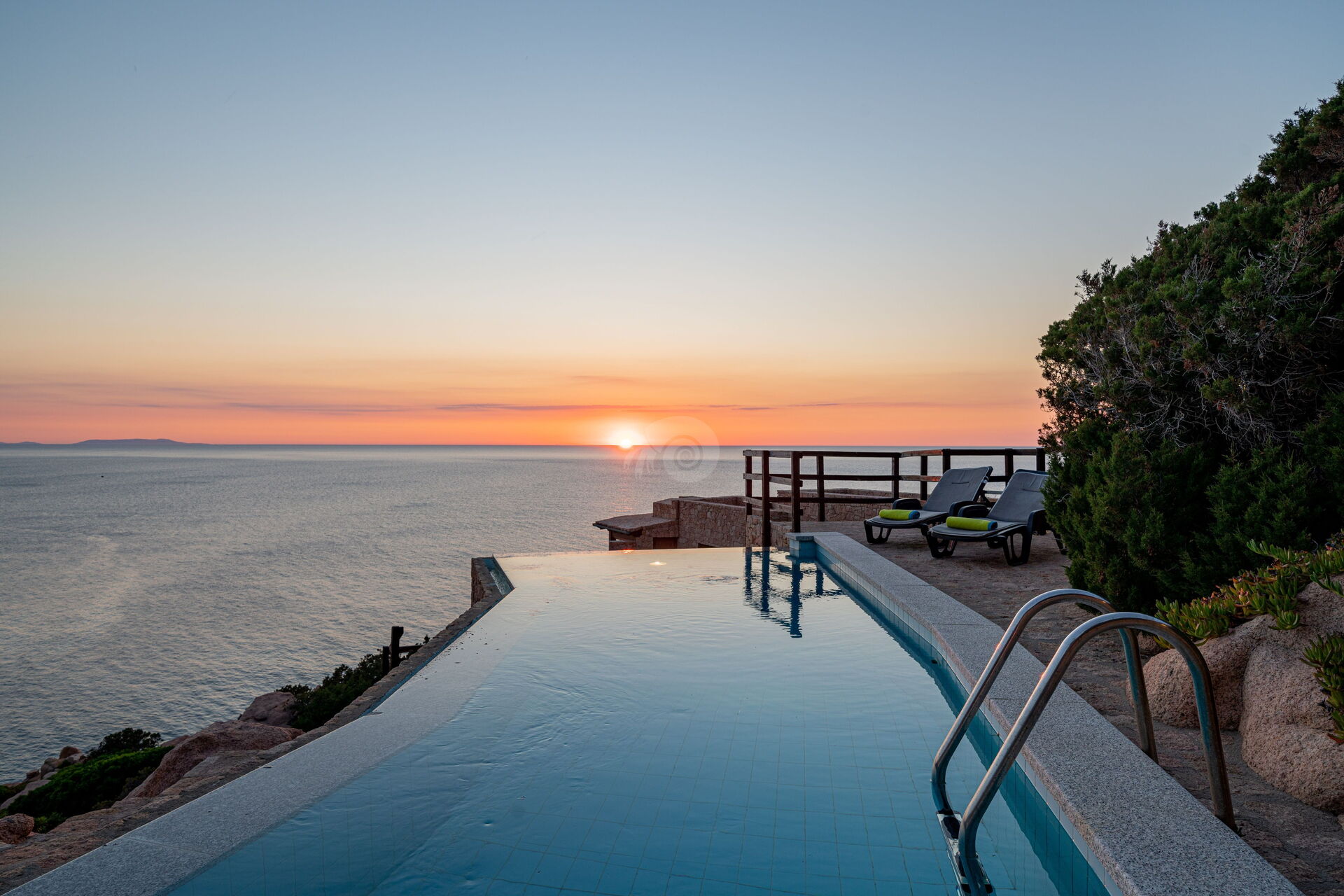 Der Infinity-Pool, der mit einem Ruhebereich ausgestattet ist, befindet sich auf den Granitfelsen, die die Landschaft der Costa Paradiso charakterisieren. Diese Felsen wurden vom Wind im Laufe der Jahre geformt und neu gestaltet, um ihr die unterschiedlichsten Formen zu verleihen.
