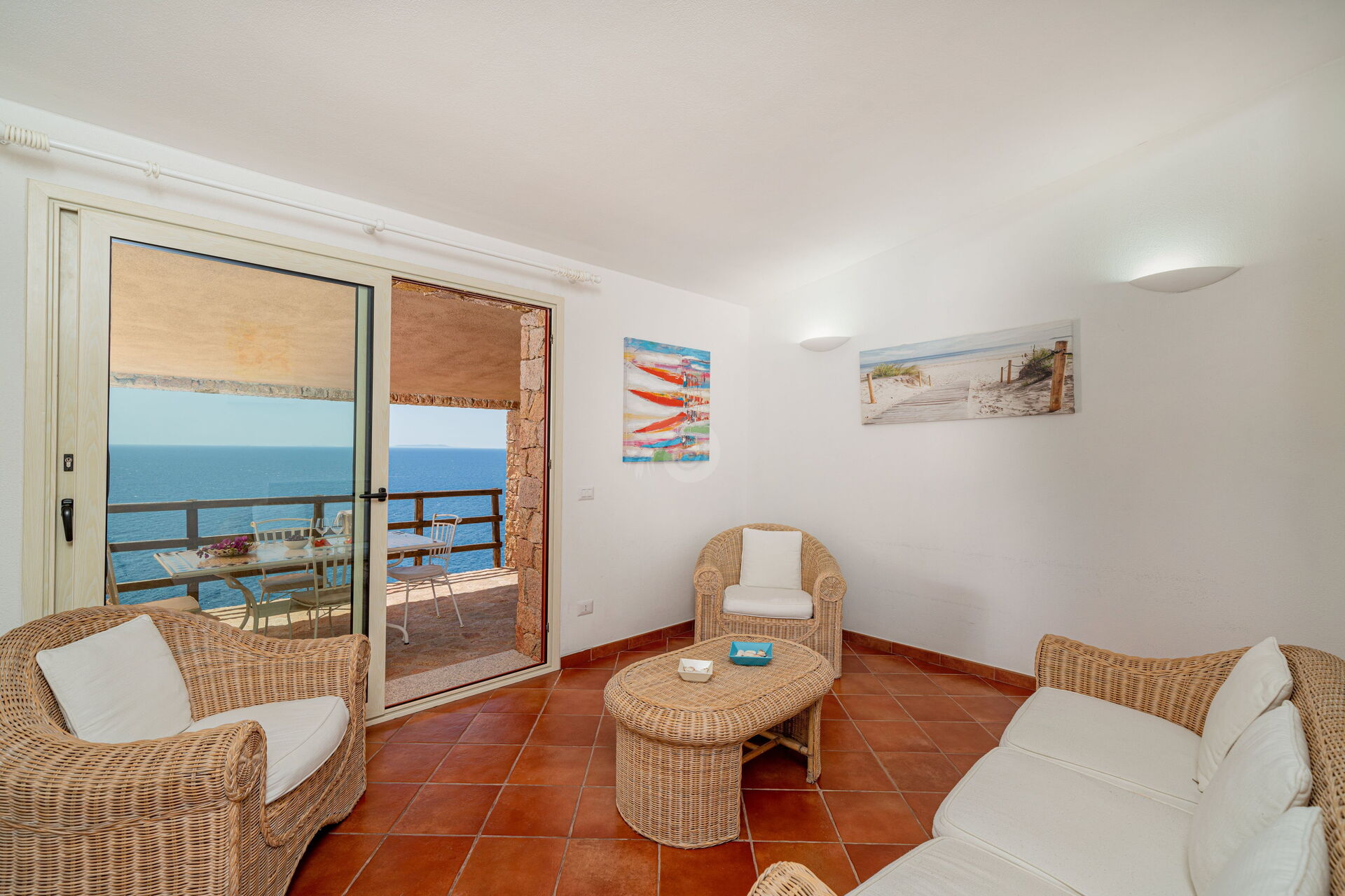 Auf der mittleren Ebene bietet das Wohnzimmer mit voll ausgestatteter Küchenzeile einen Blick auf eine wunderschöne Panoramaterrasse mit Blick auf das Meer, ideal als Erholung von der Sonne oder zum Essen im Freien. Die Terrasse ist so eingerichtet, dass sie sowohl als Entspannungsbereich als auch zum Probieren typischer Gerichte im Freien oder als saftiges gegrilltes Fleisch oder Fisch beim Grillen dient.