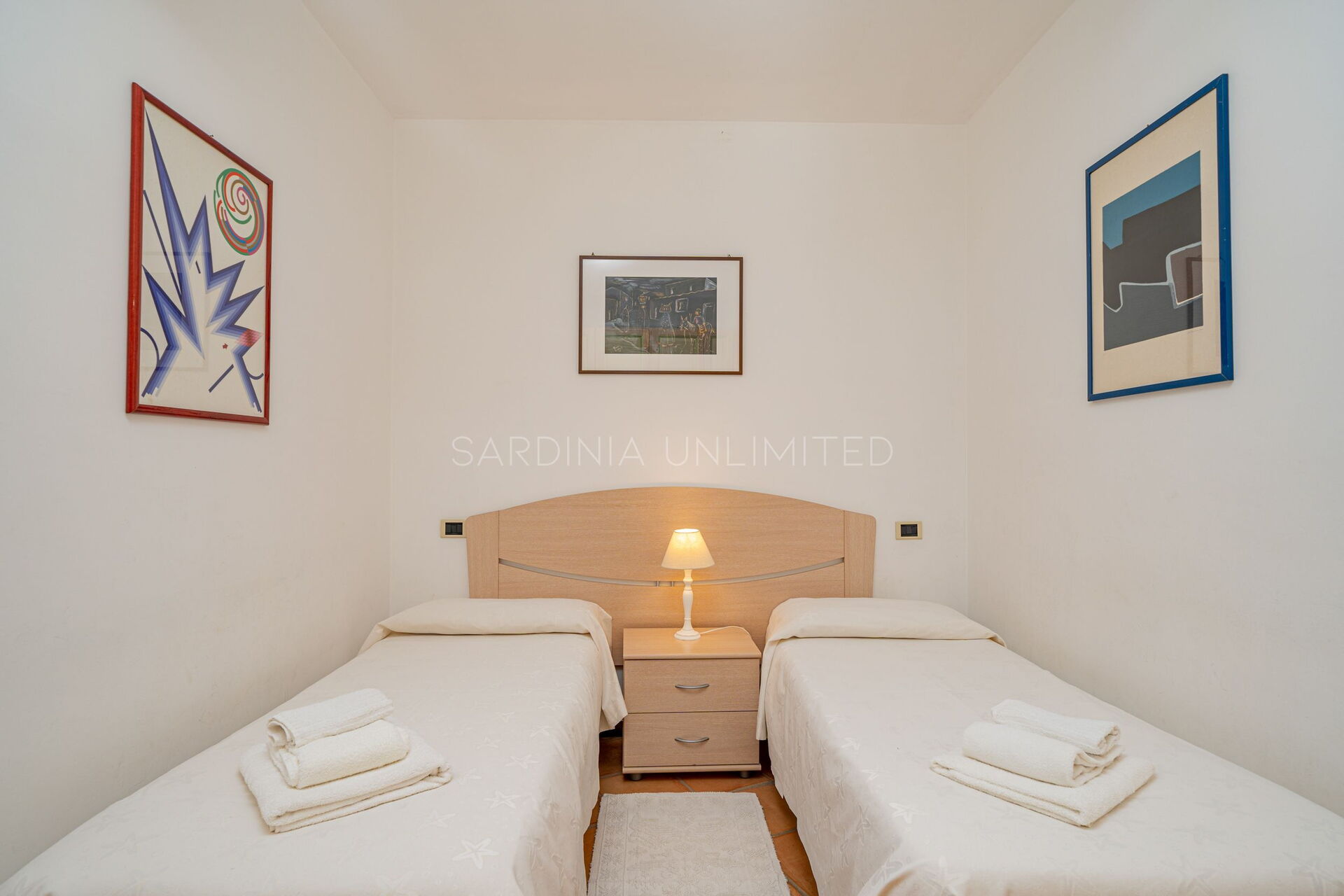 Der andere Zugang ist über den externen Essbereich möglich, der direkt zu einem hellen offenen Raum führt, der aus einer voll ausgestatteten Küche, einem Tisch und einem bequemen Sofa besteht. Das andere Schlafzimmer, ebenfalls im sardischen Stil, besteht aus zwei Einzelbetten. Die Unterkunft umfasst ein Badezimmer mit Holzoberflächen.