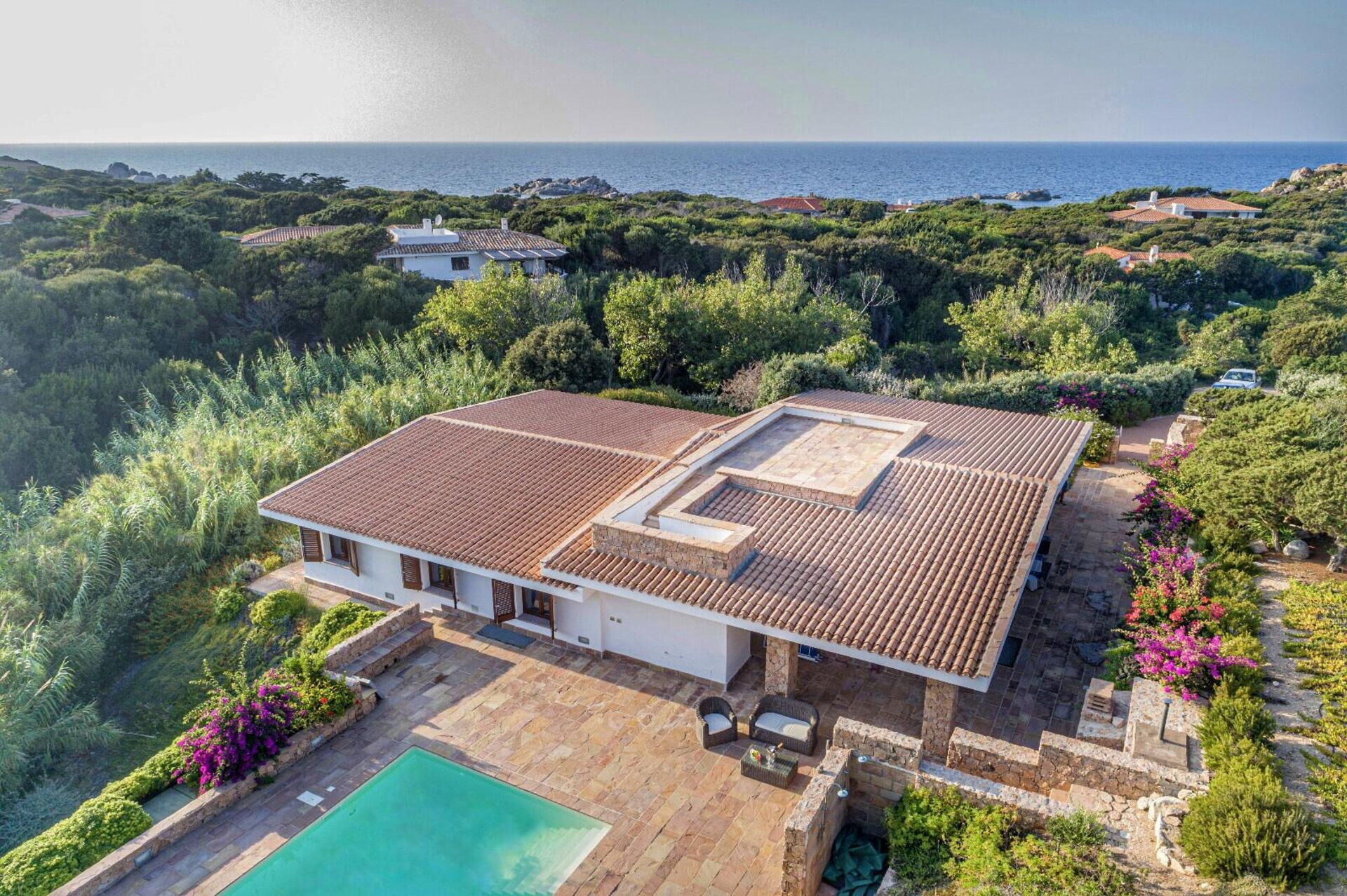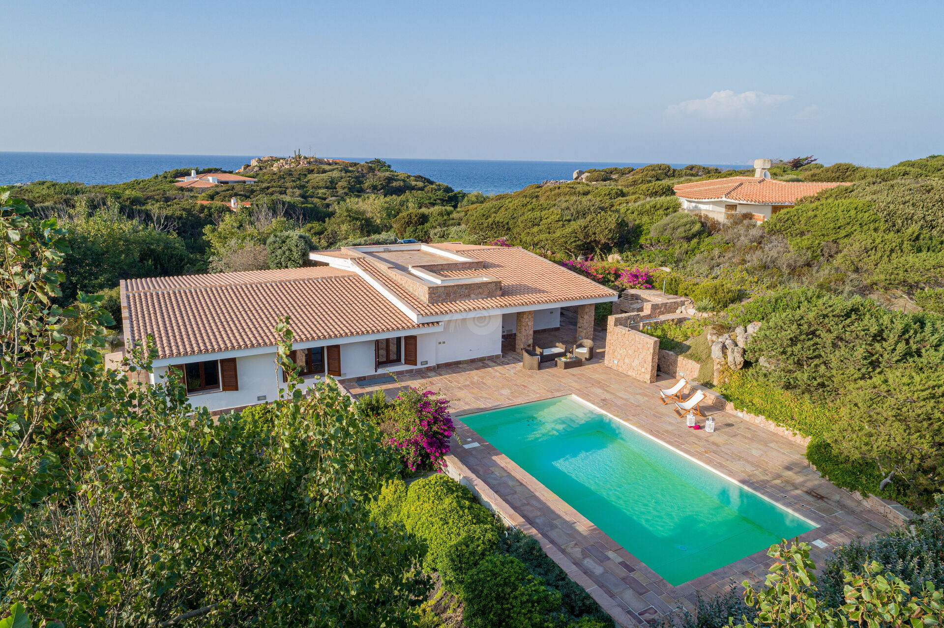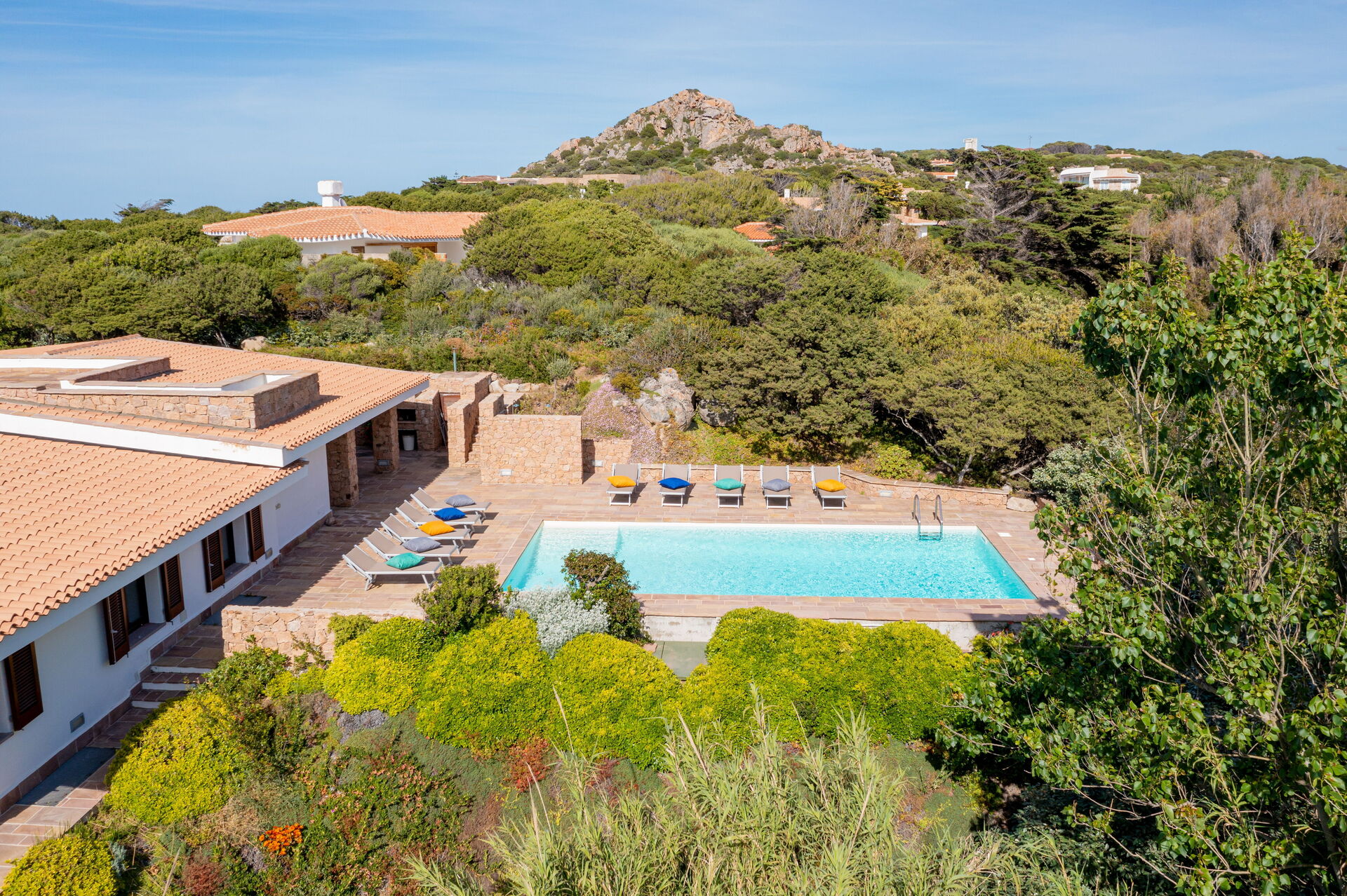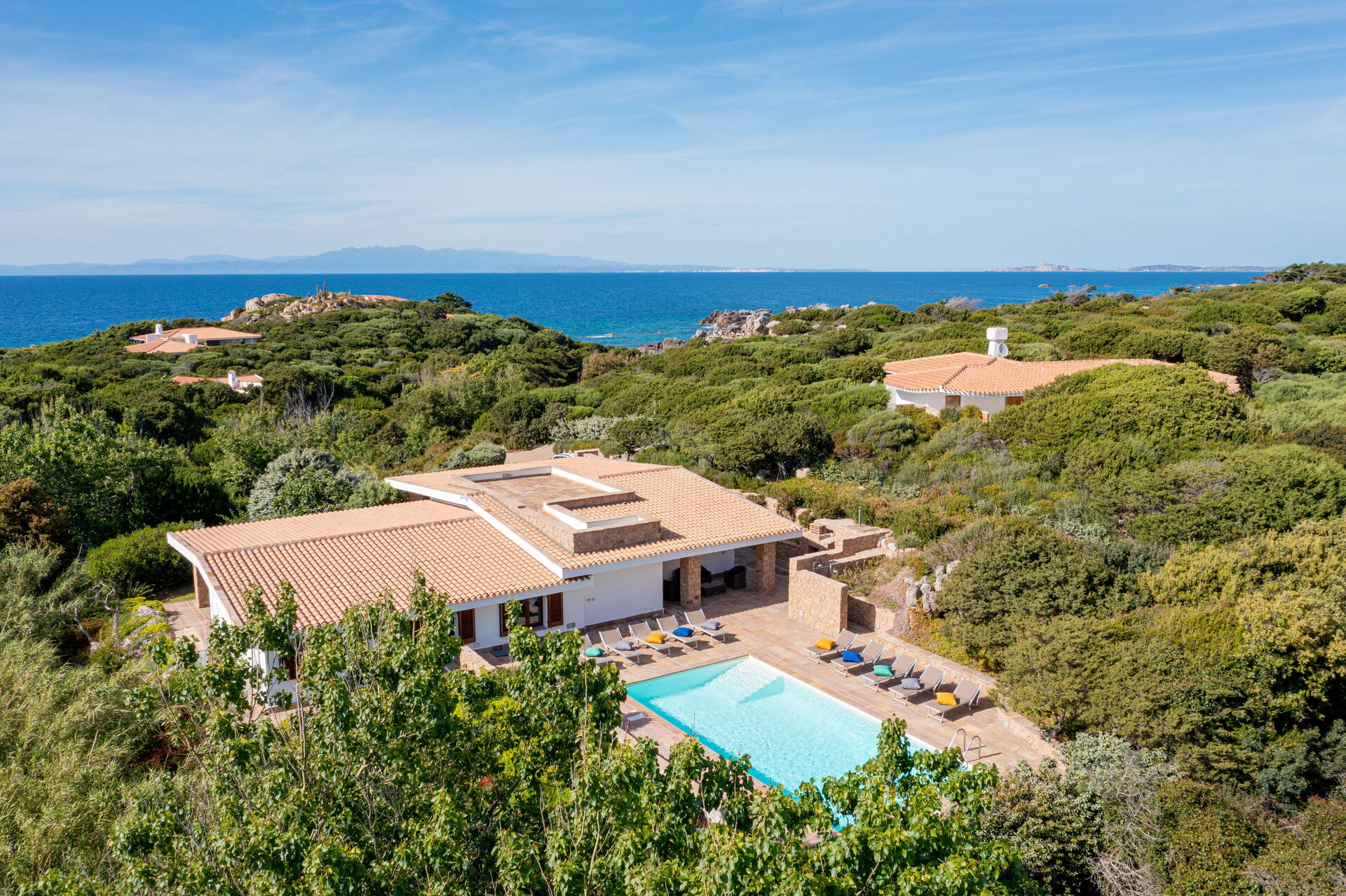 Die Villa Belle befindet sich in ruhiger Lage, nur wenige Schritte vom Meer und einer kleinen Bucht namens Baia dell'Amore entfernt, in einem exklusiven Wohnpark in Portobello di Gallura im Norden Sardiniens.