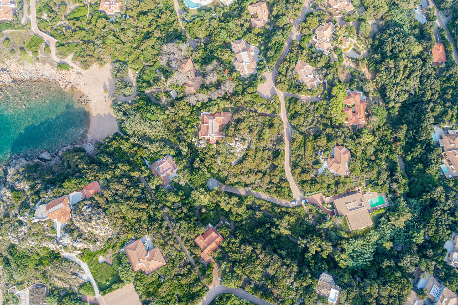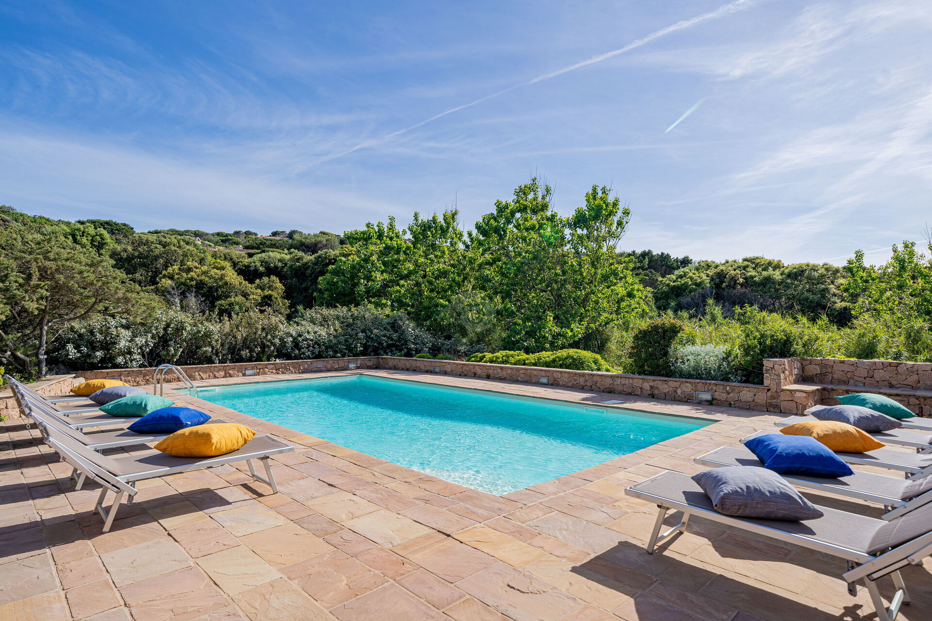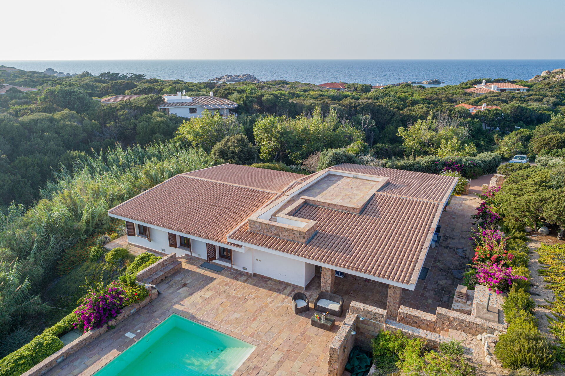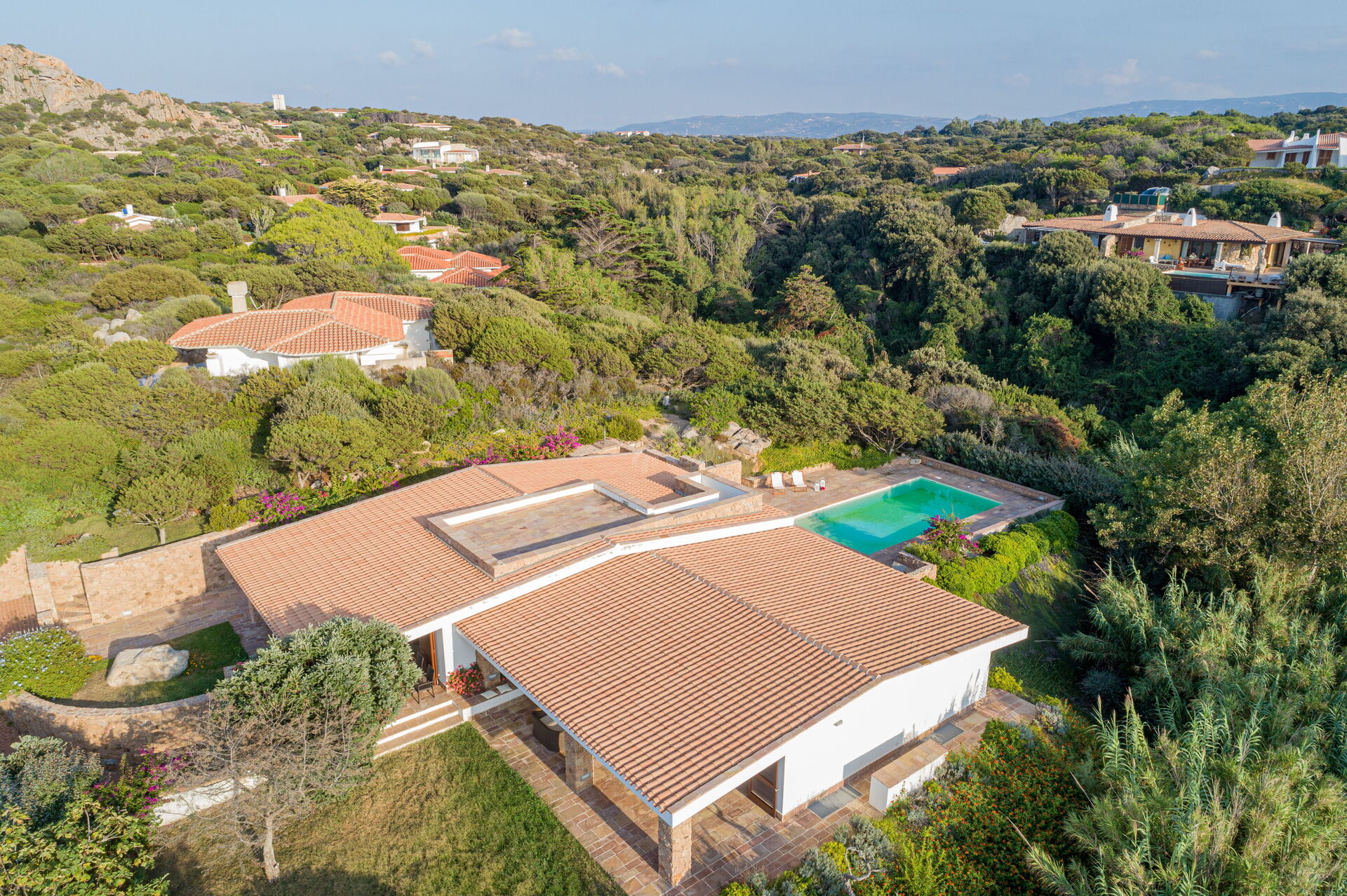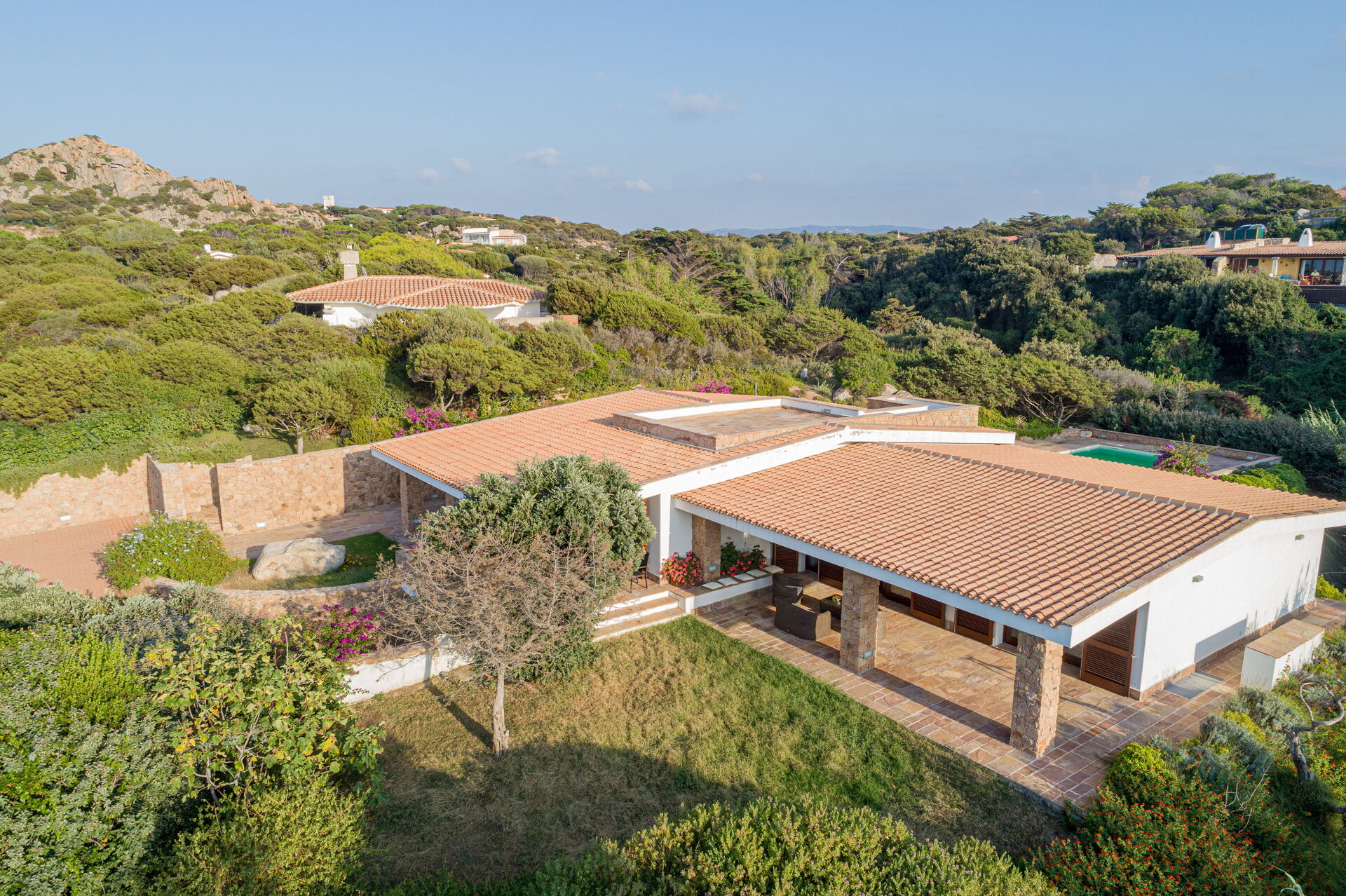 Die Villa Belle befindet sich in ruhiger Lage, nur wenige Schritte vom Meer und einer kleinen Bucht namens Baia dell'Amore entfernt, in einem exklusiven Wohnpark in Portobello di Gallura im Norden Sardiniens.