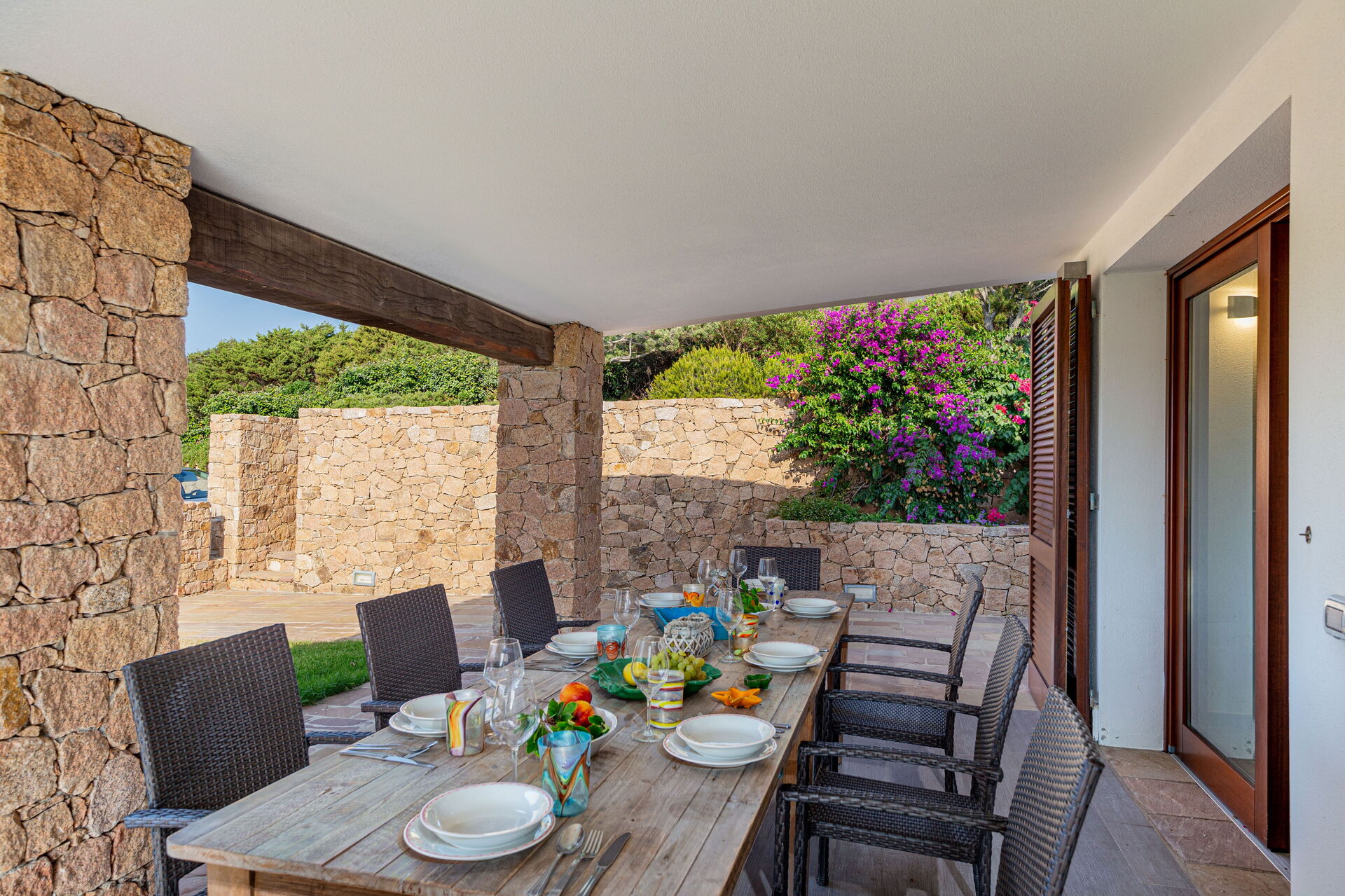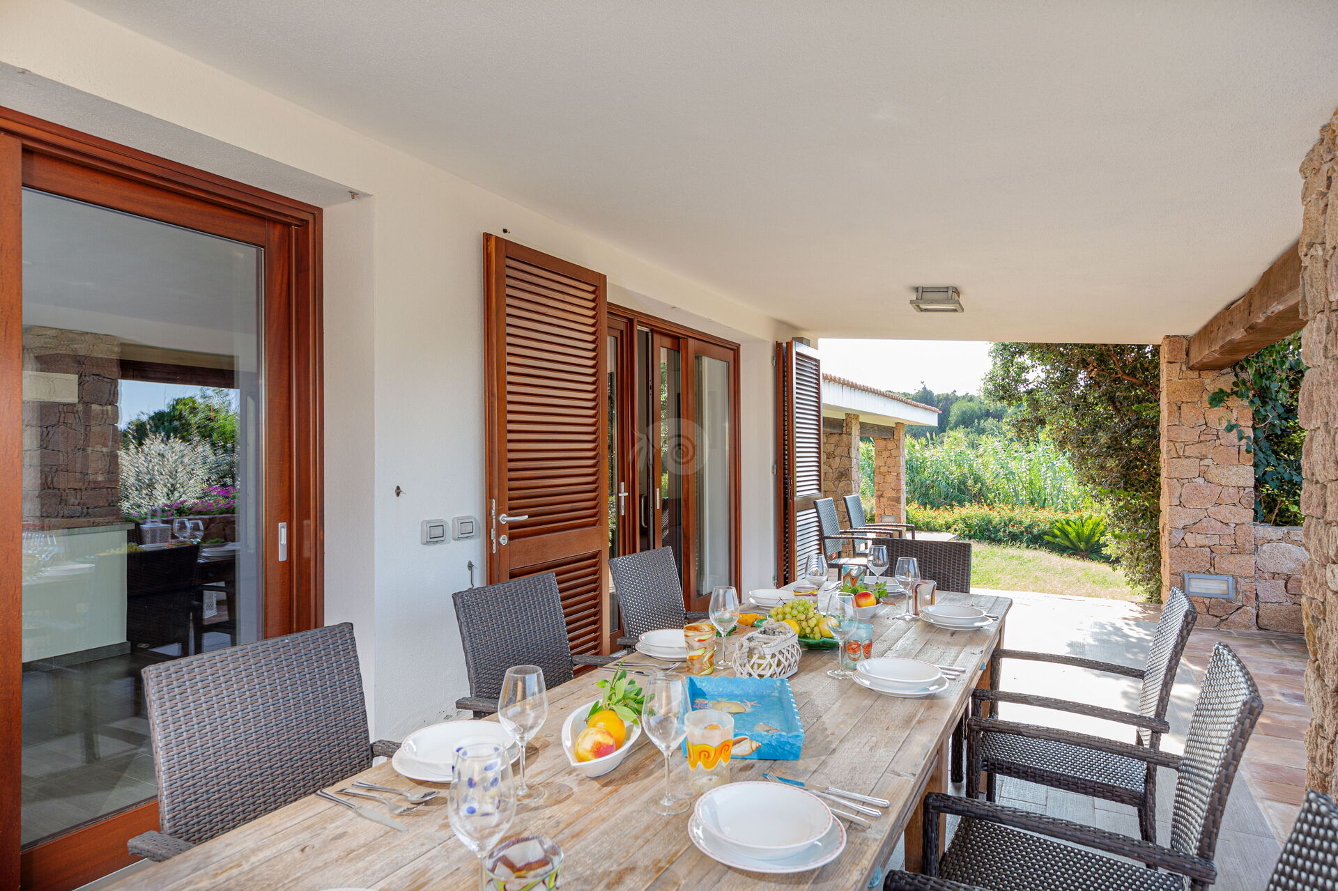 Vor der Villa befindet sich eine große überdachte Veranda mit Essbereich und Gartenmöbeln. Es gibt auch einen Grill und eine Außendusche.
