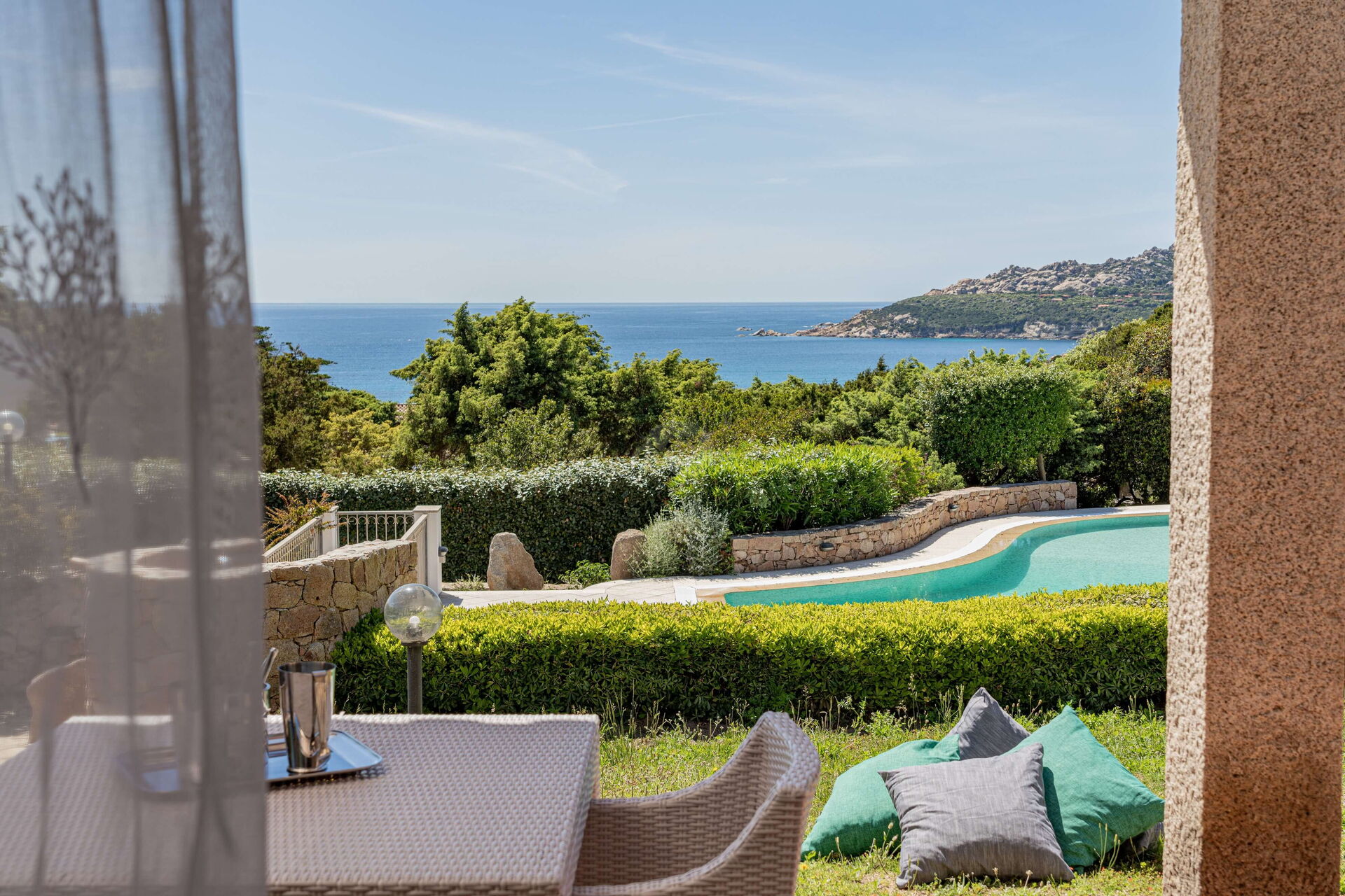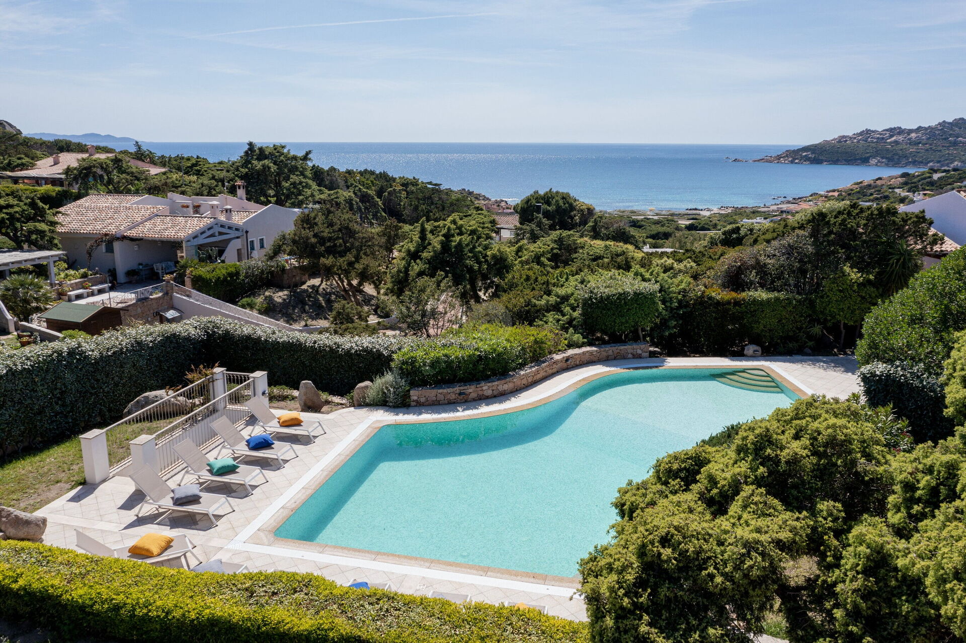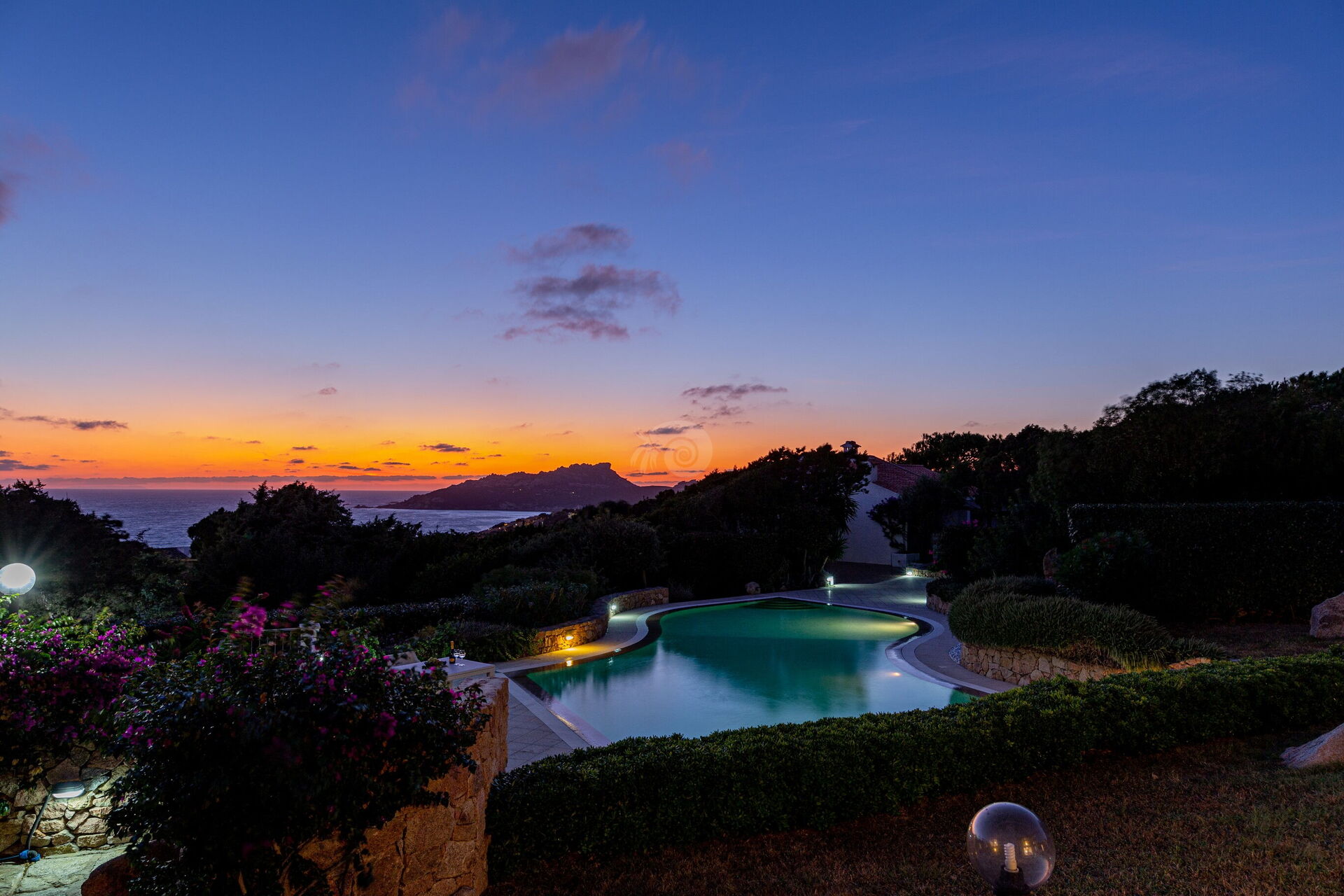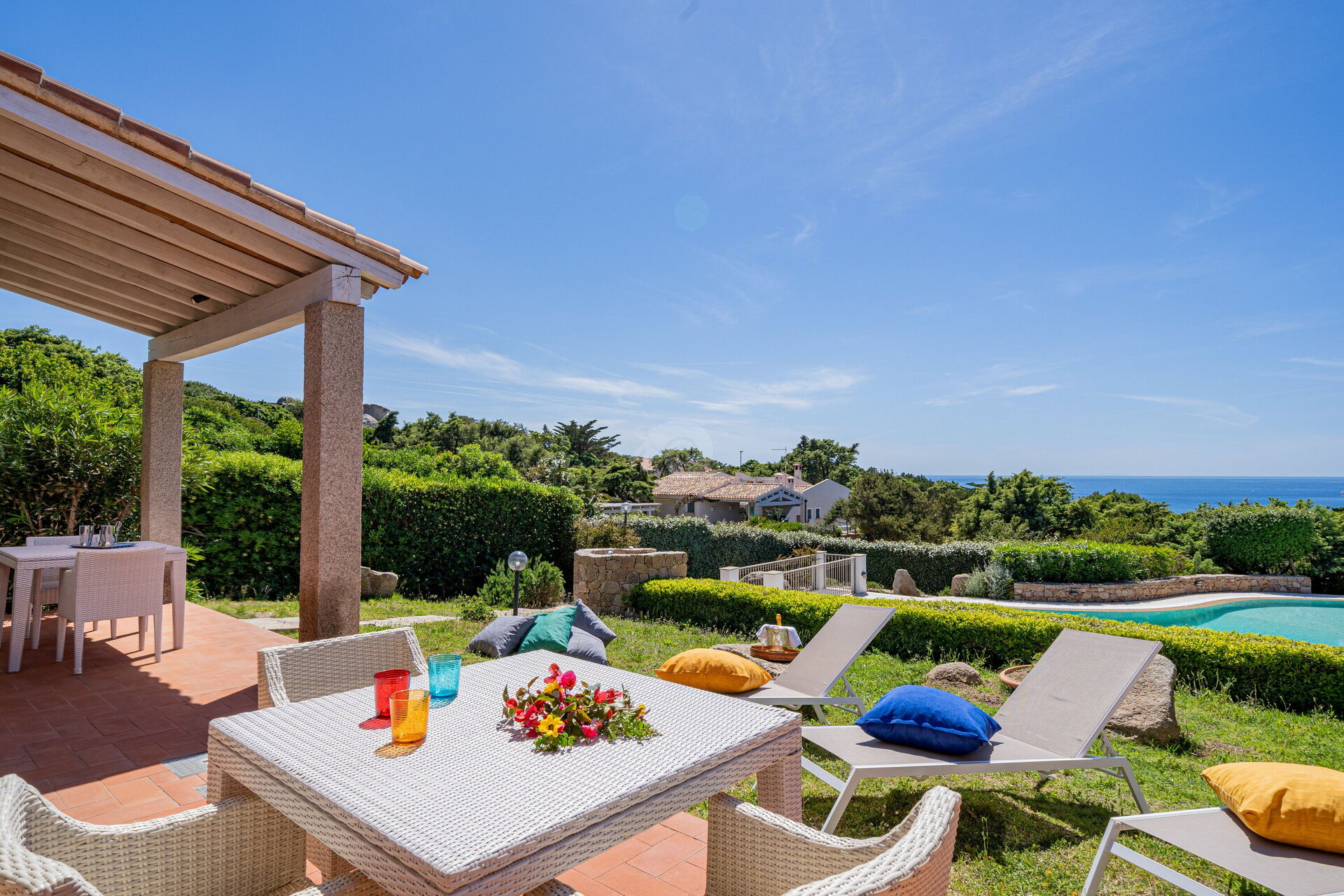 Von der Veranda mit Blick auf den Pool genießen Sie einen herrlichen Meerblick, der noch mehr geschätzt wird, wenn Sie einen Aperitif vor dem Sonnenuntergang genießen. Ideal, falls Sie eine tolle Villa auf Sardinien mieten möchten.
