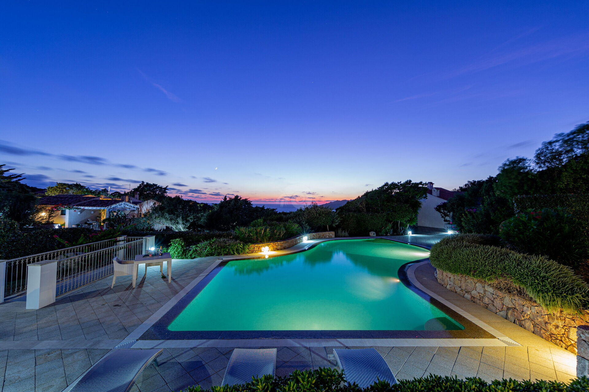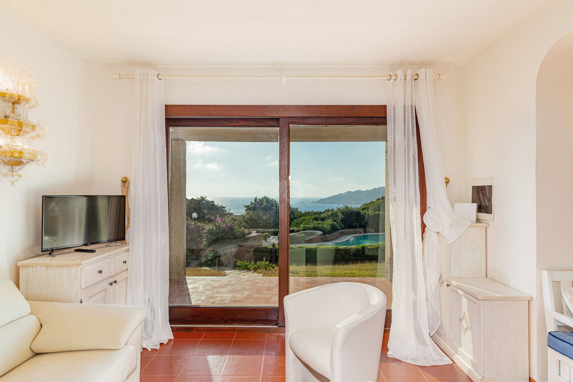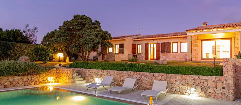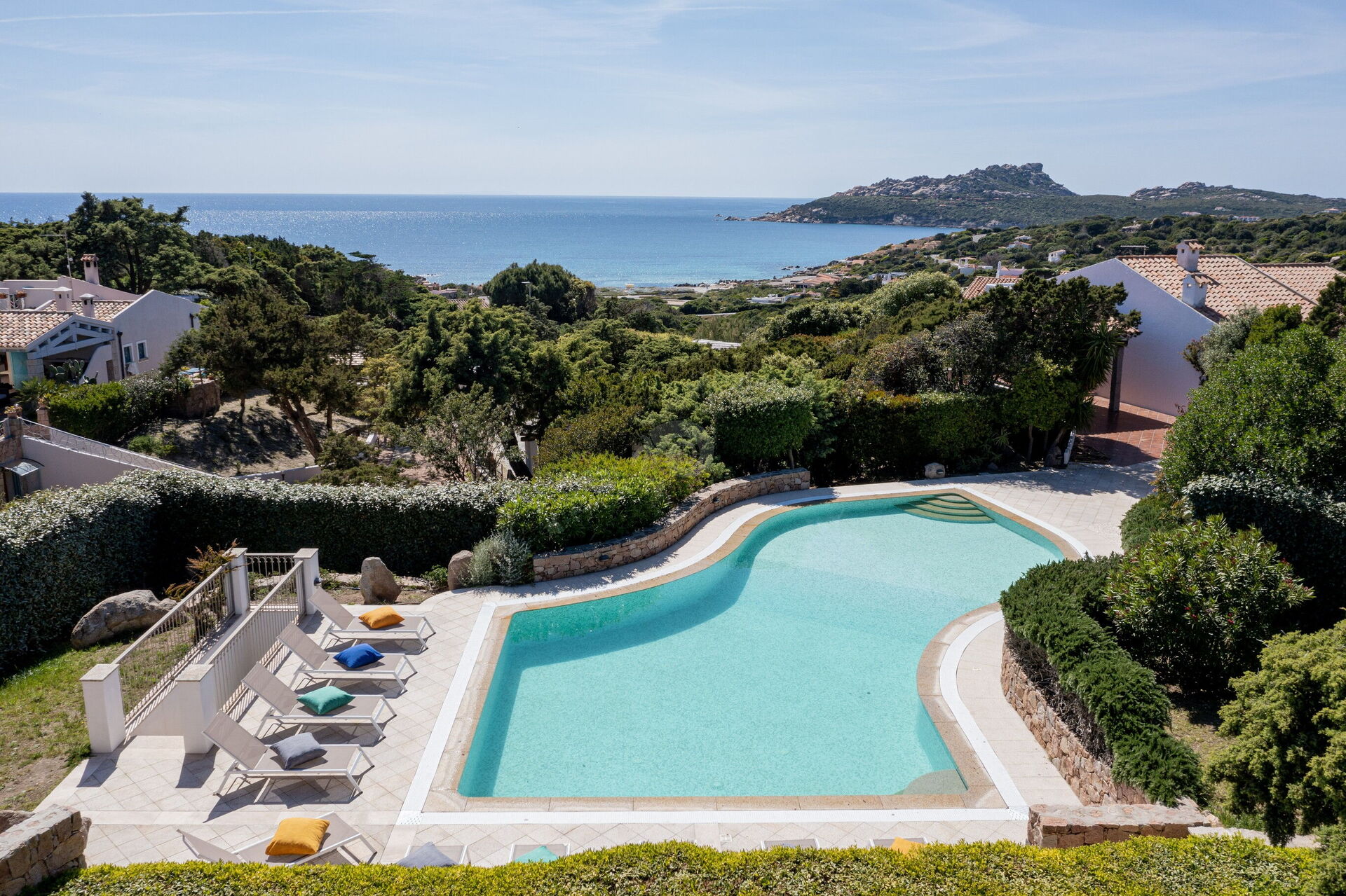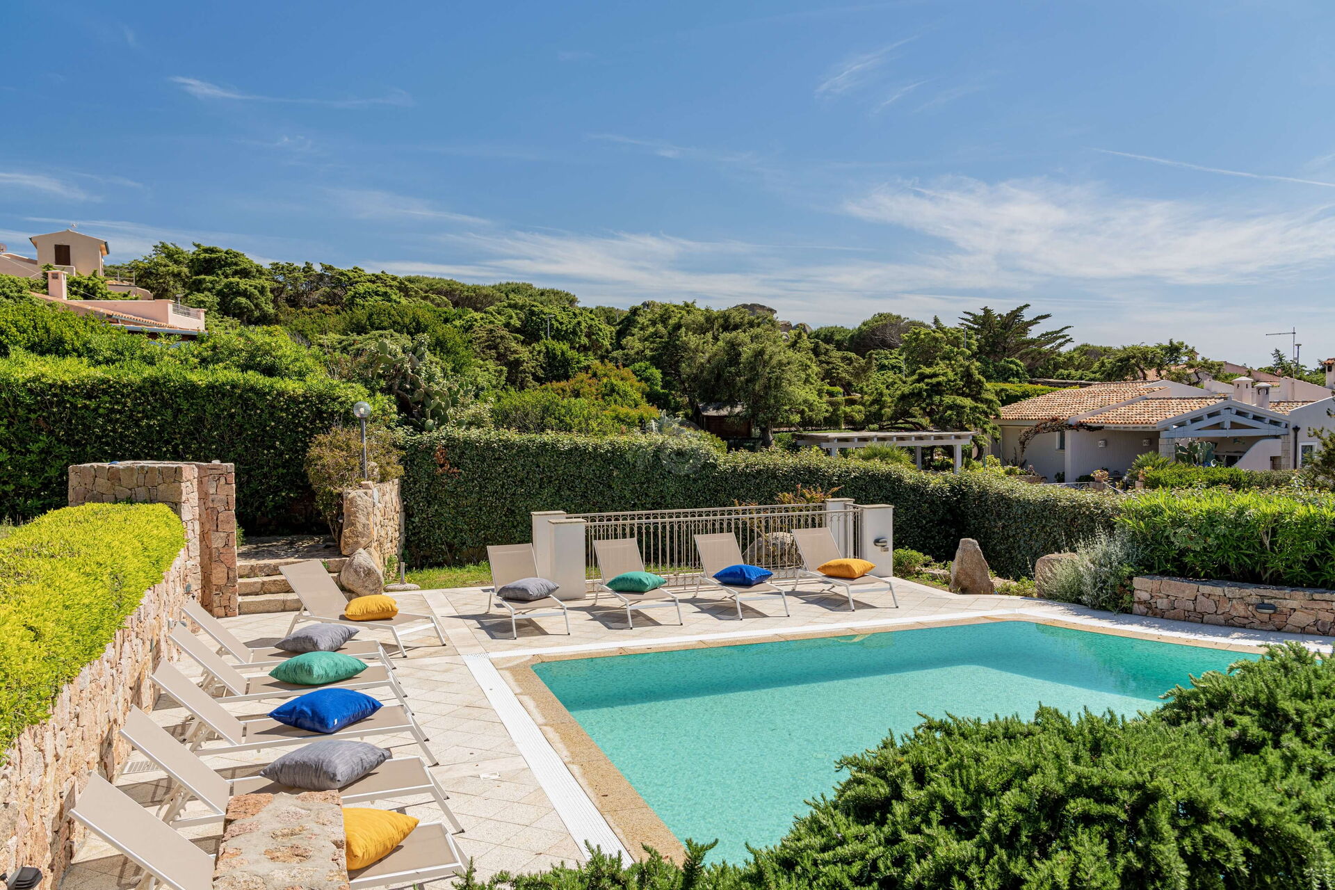 Von der Veranda mit Blick auf den Pool genießen Sie einen herrlichen Meerblick, der noch mehr geschätzt wird, wenn Sie einen Aperitif vor dem Sonnenuntergang genießen. Ideal, falls Sie eine tolle Villa auf Sardinien mieten möchten.