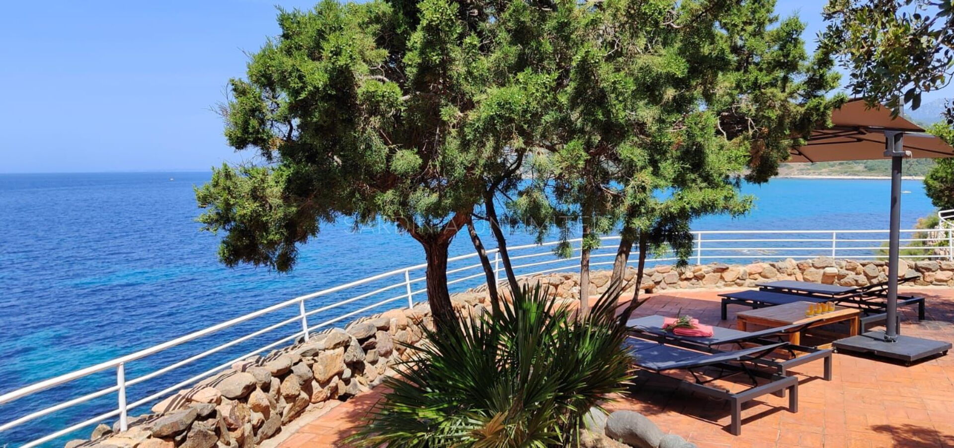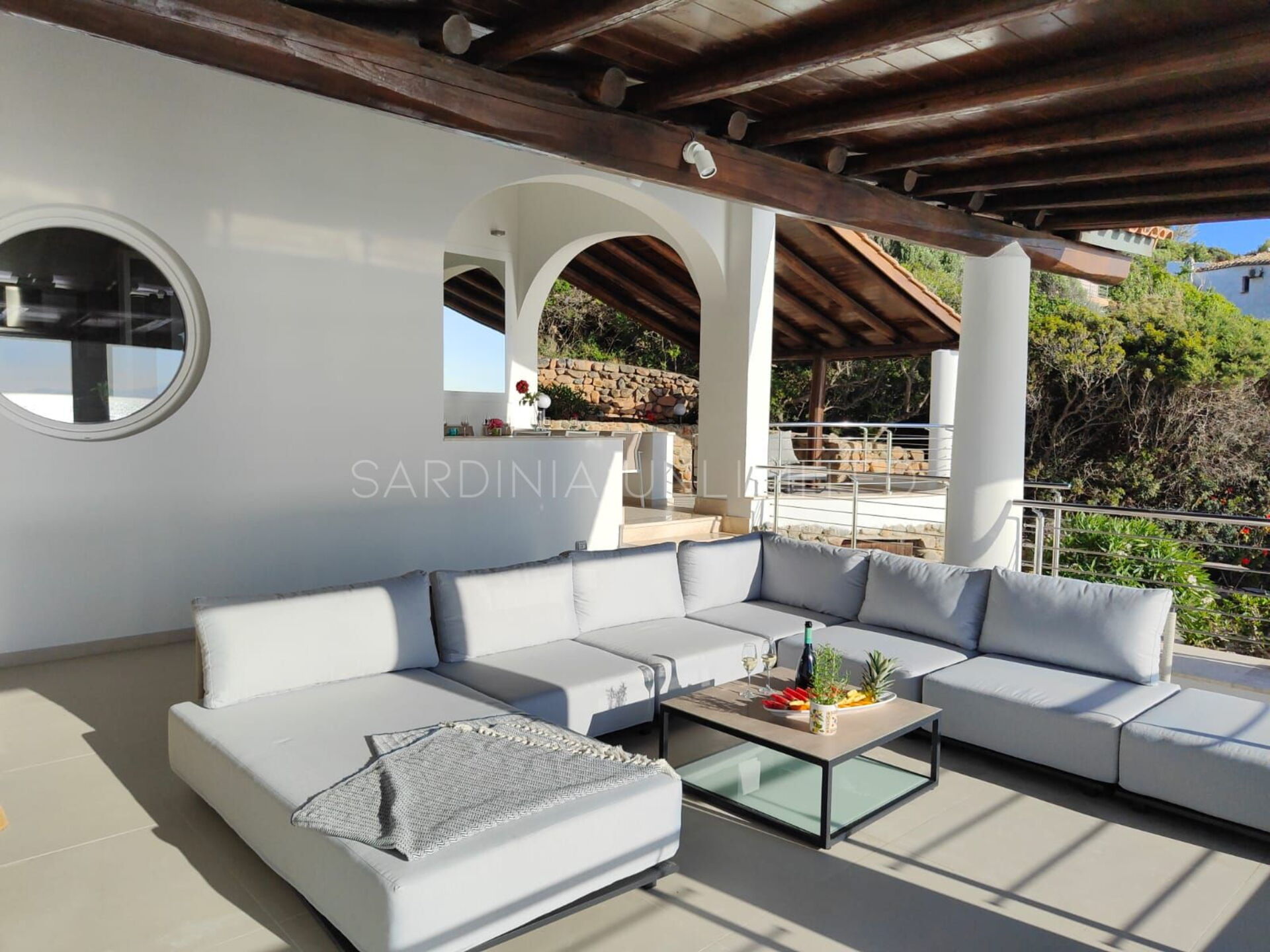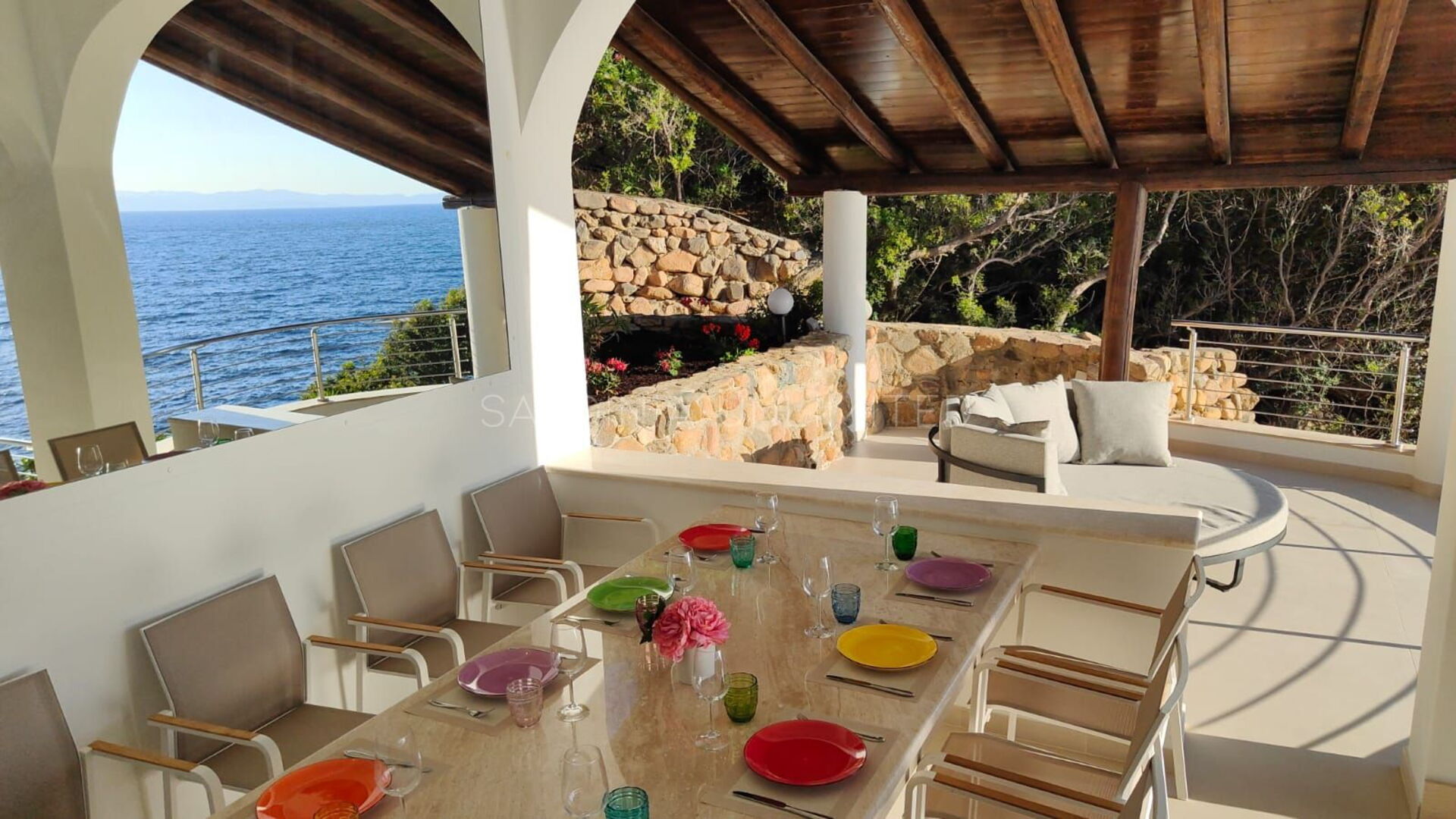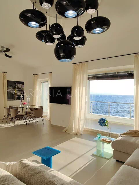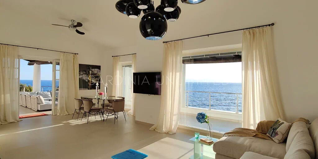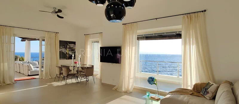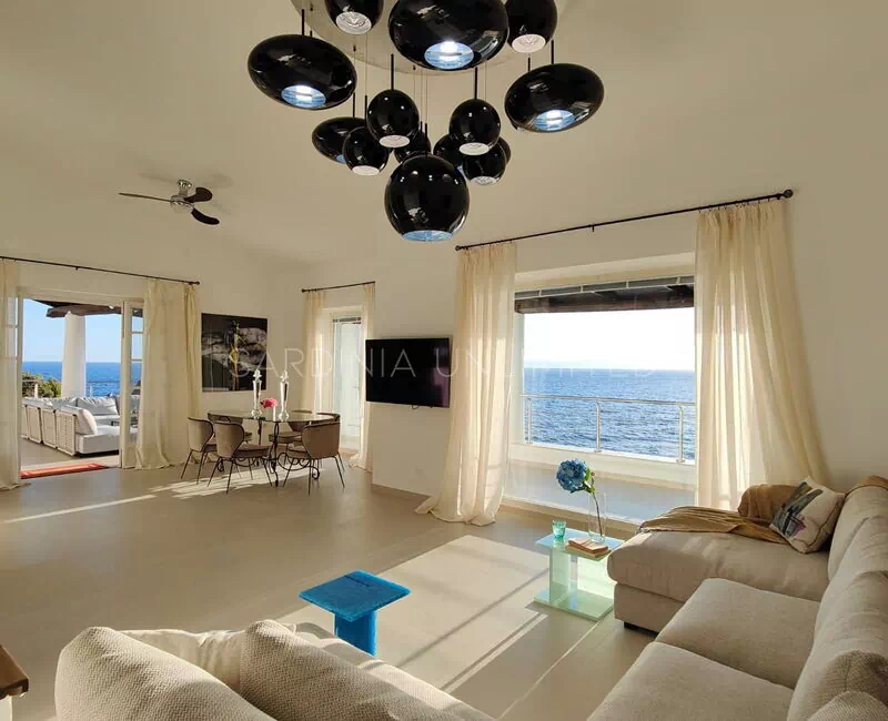 Diese Villa mit direktem Meerzugang auf Sardinien, umgeben von den unendlichen Schattierungen der mediterranen Macchia und den intensiven Farben des Meeres, ist eine luxuriöse Oase der Entspannung. Aus diesem Grund verfügt das Anwesen über zahlreiche und faszinierende Außenbereiche, die sowohl der Freizeit als auch der Geselligkeit gewidmet sind, wie zum Beispiel eine geräumige Veranda mit einem bequemen Tisch mit Blick auf das Meer, flankiert von einem Loungebereich, in dem sich ein geräumiges Ecksofa befindet, um einen herrlichen Aufenthalt zu genießen Aperitif mit Meerblick.