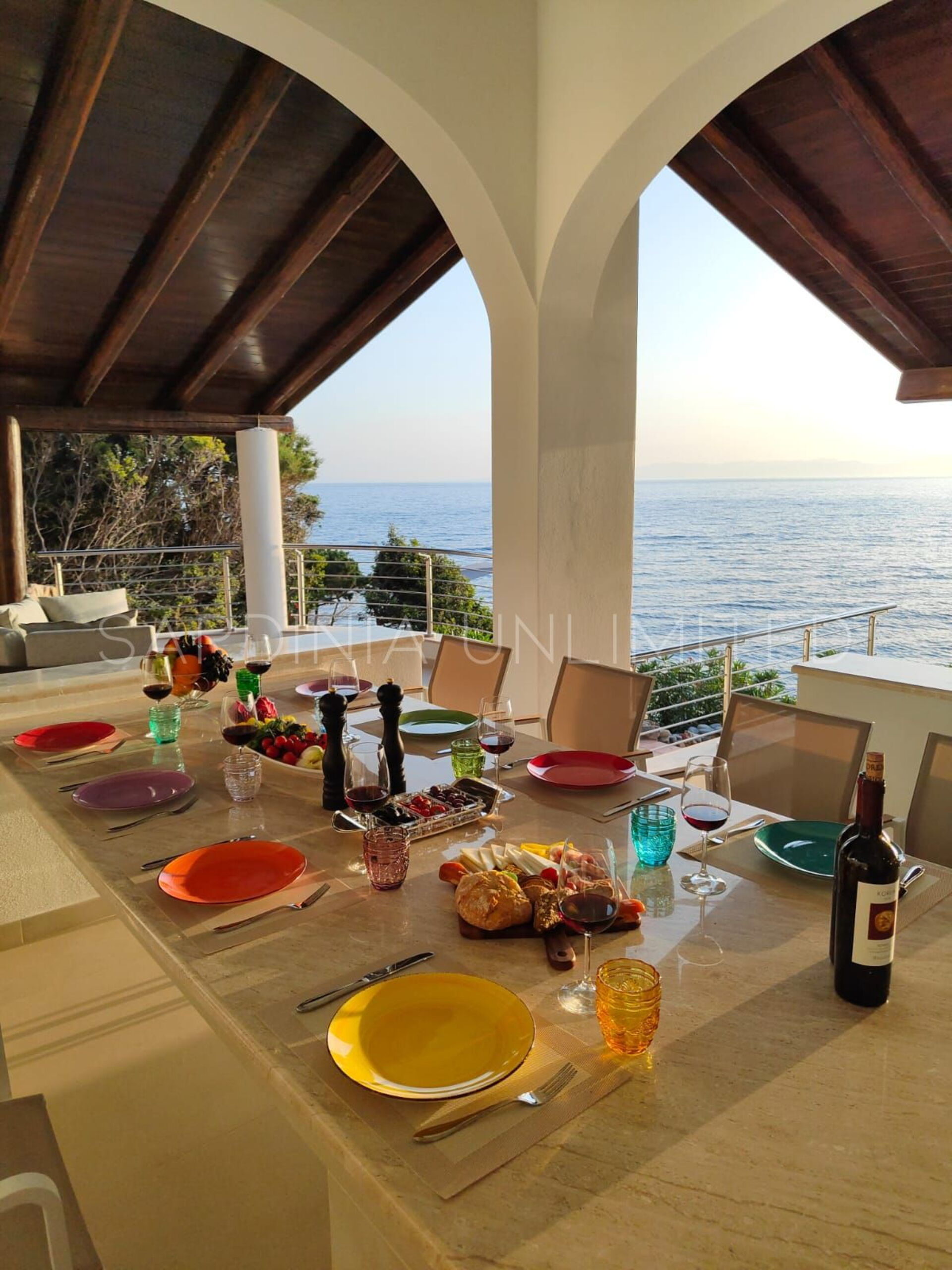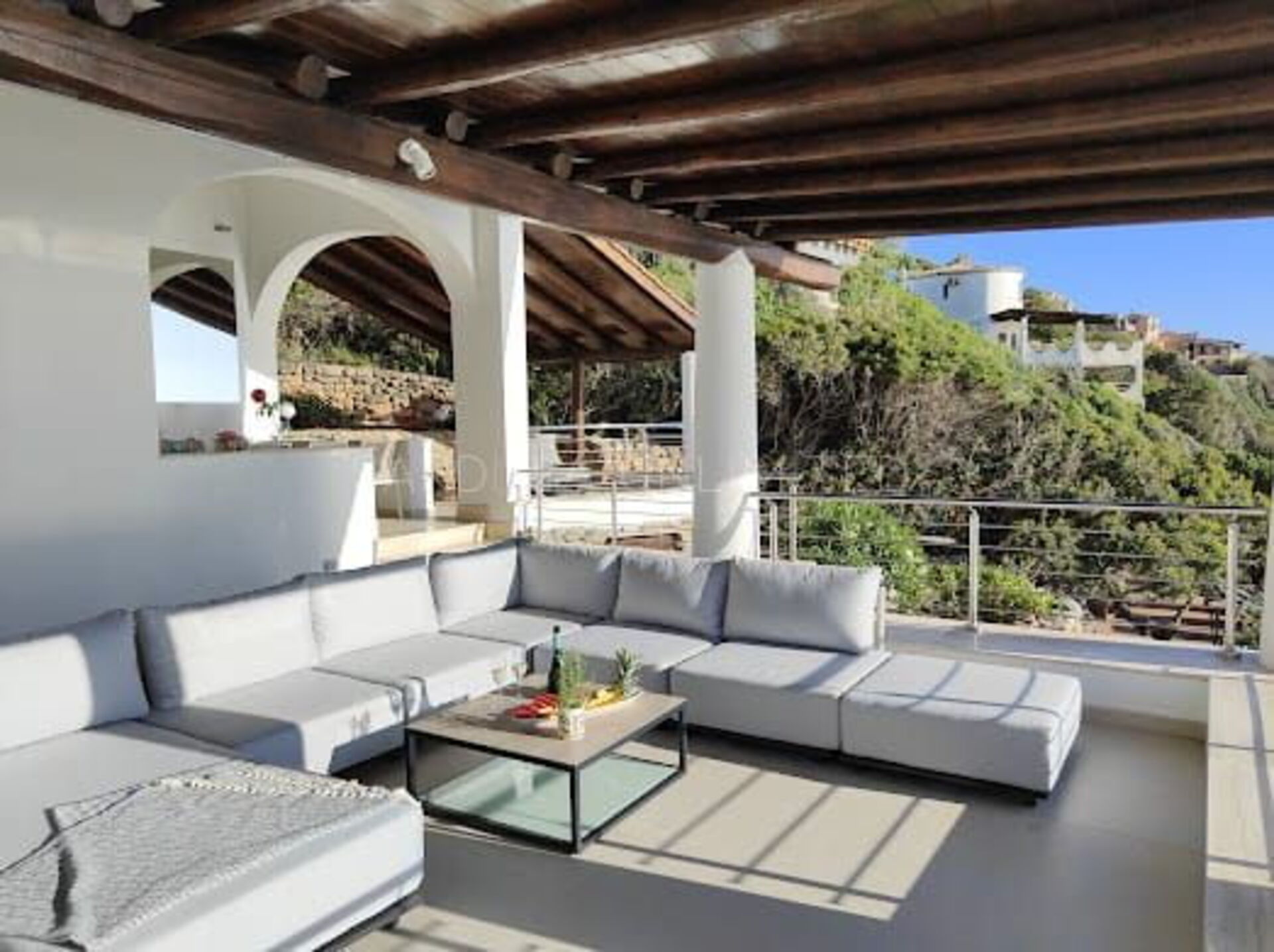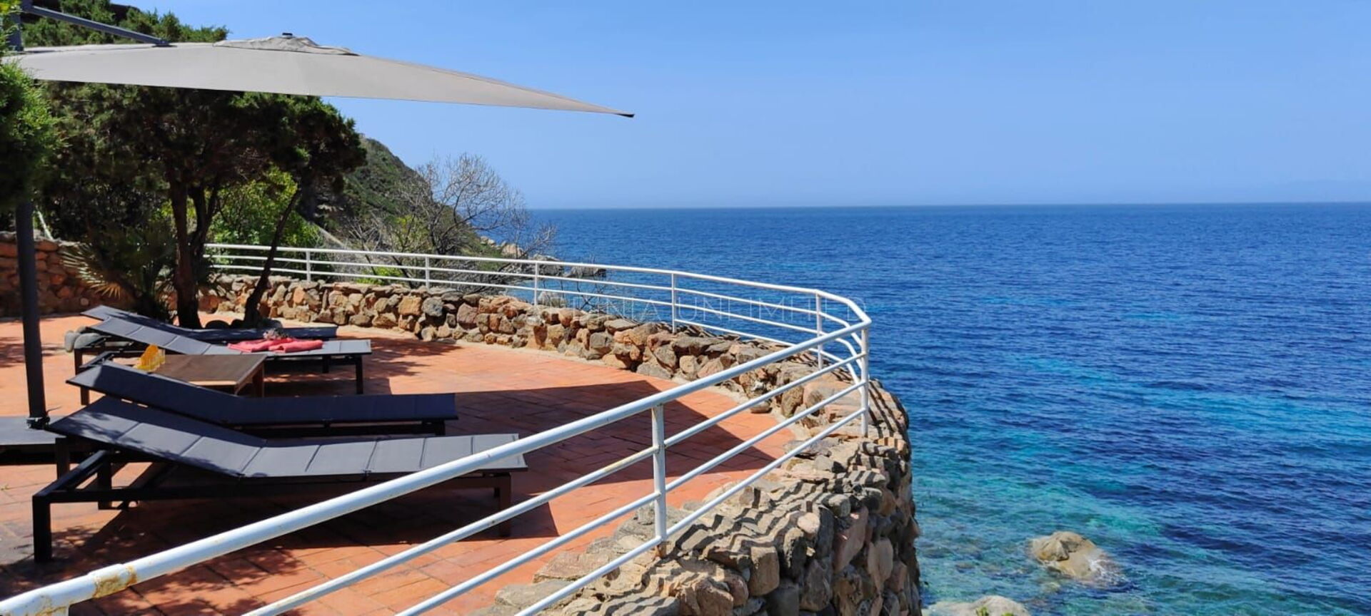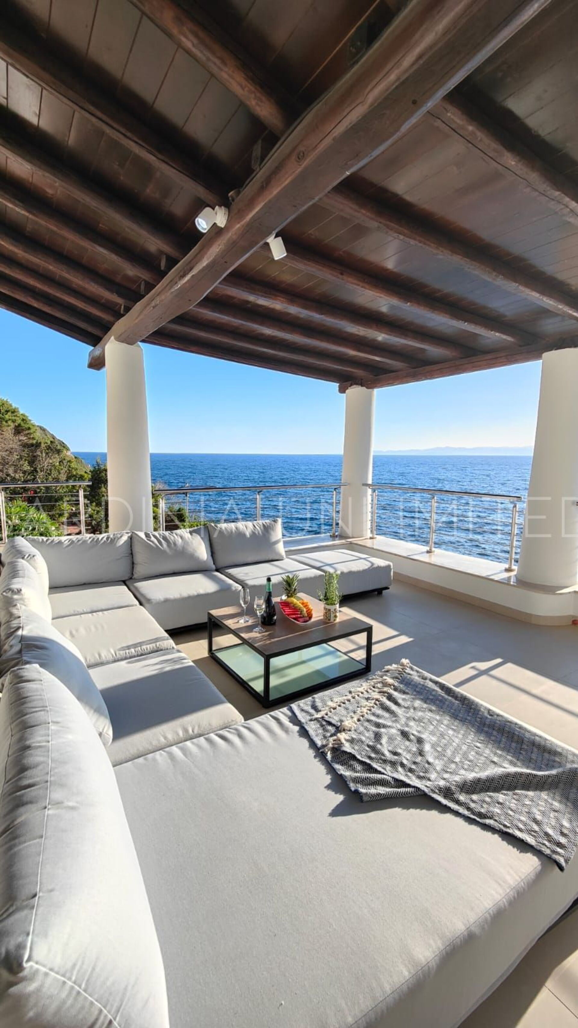 Diese Villa mit direktem Meerzugang auf Sardinien, umgeben von den unendlichen Schattierungen der mediterranen Macchia und den intensiven Farben des Meeres, ist eine luxuriöse Oase der Entspannung. Aus diesem Grund verfügt das Anwesen über zahlreiche und faszinierende Außenbereiche, die sowohl der Freizeit als auch der Geselligkeit gewidmet sind, wie zum Beispiel eine geräumige Veranda mit einem bequemen Tisch mit Blick auf das Meer, flankiert von einem Loungebereich, in dem sich ein geräumiges Ecksofa befindet, um einen herrlichen Aufenthalt zu genießen Aperitif mit Meerblick.