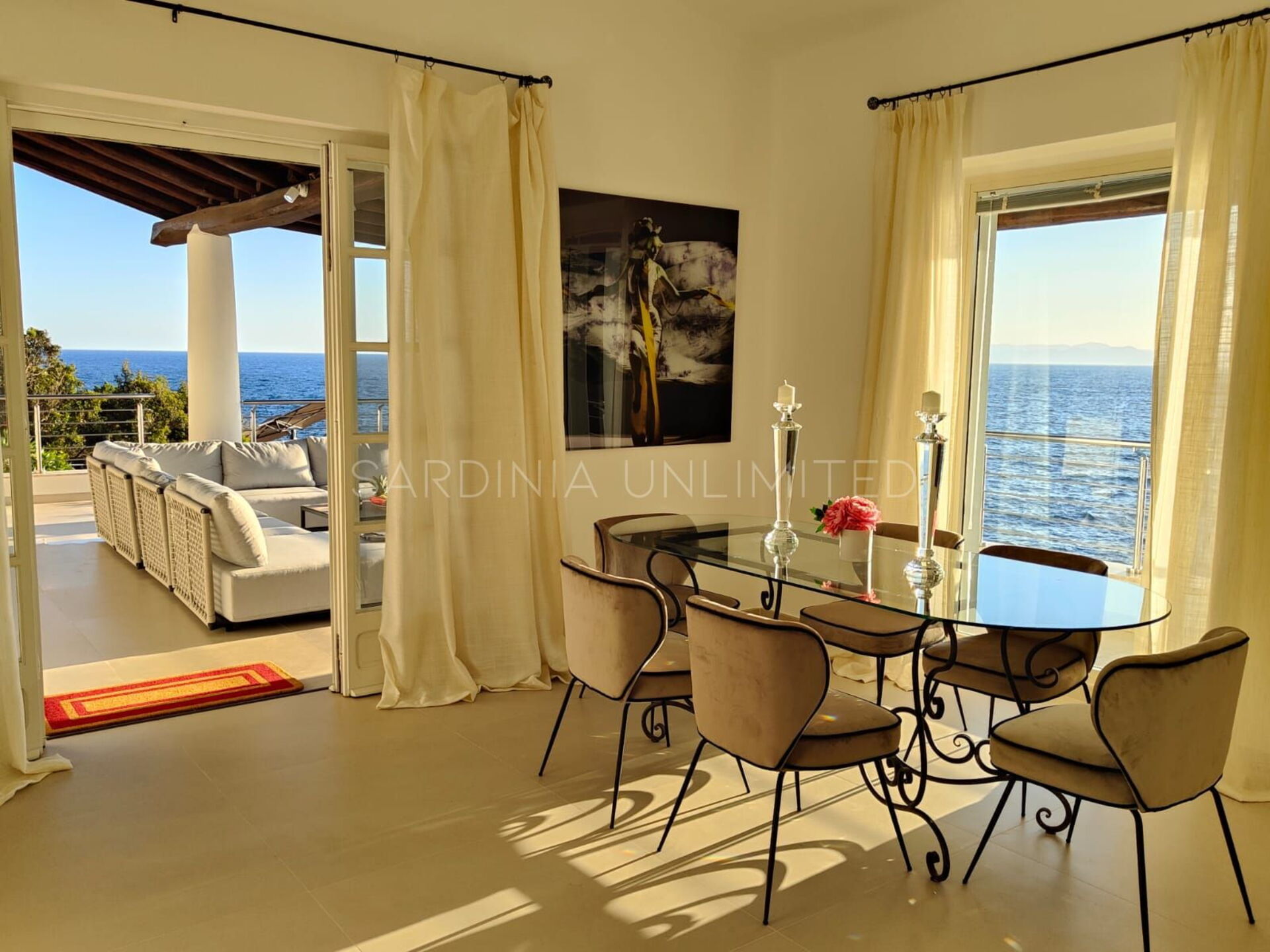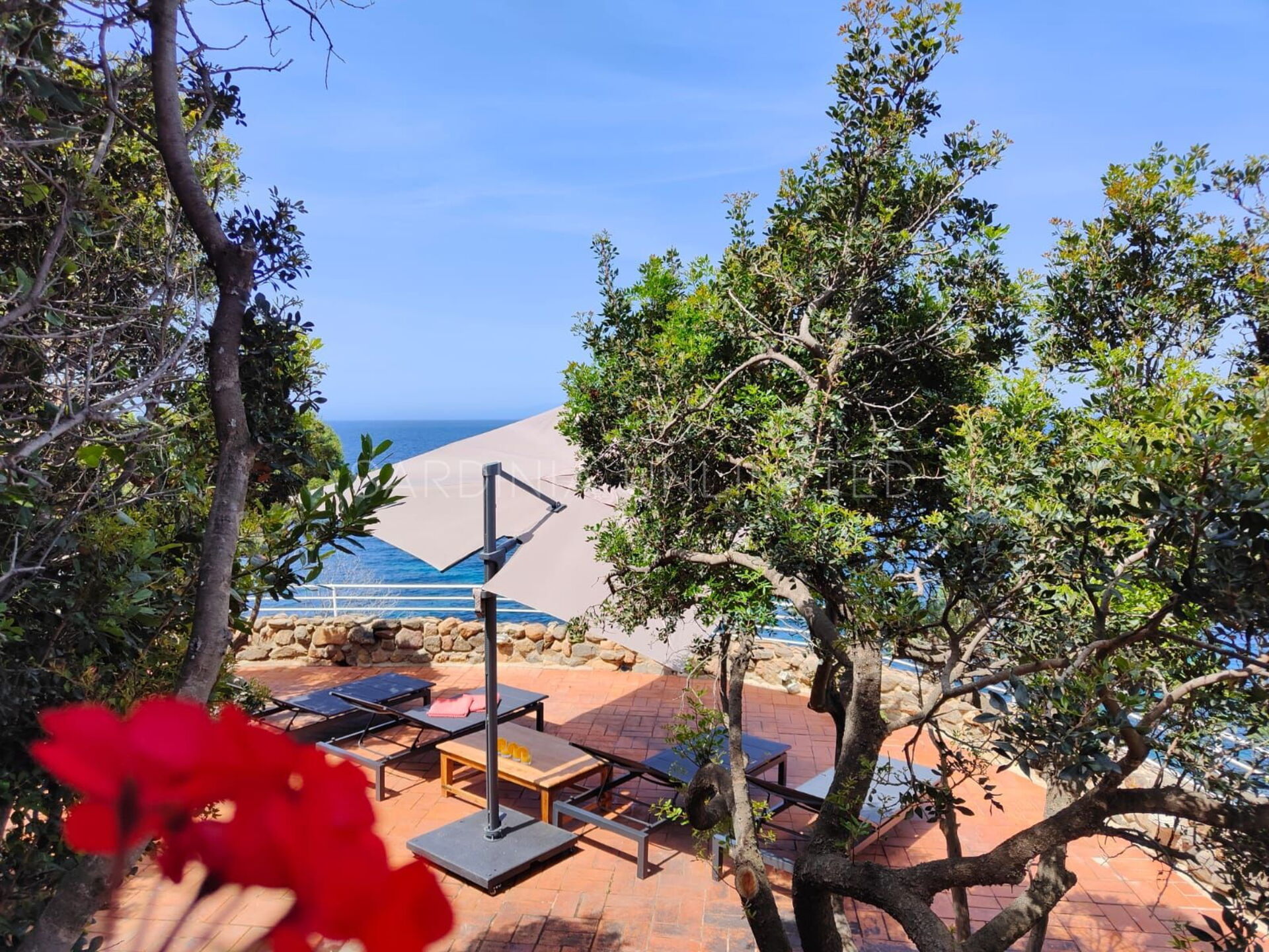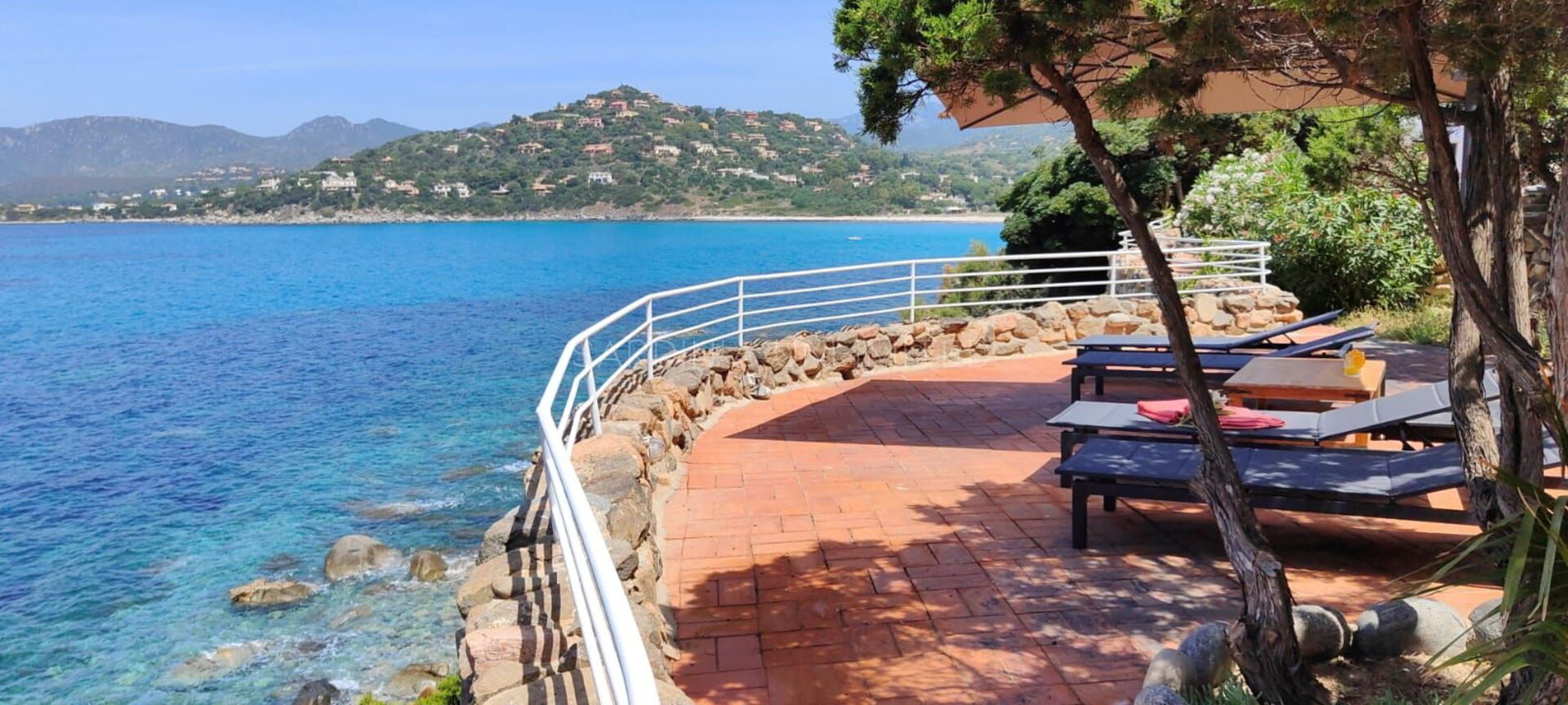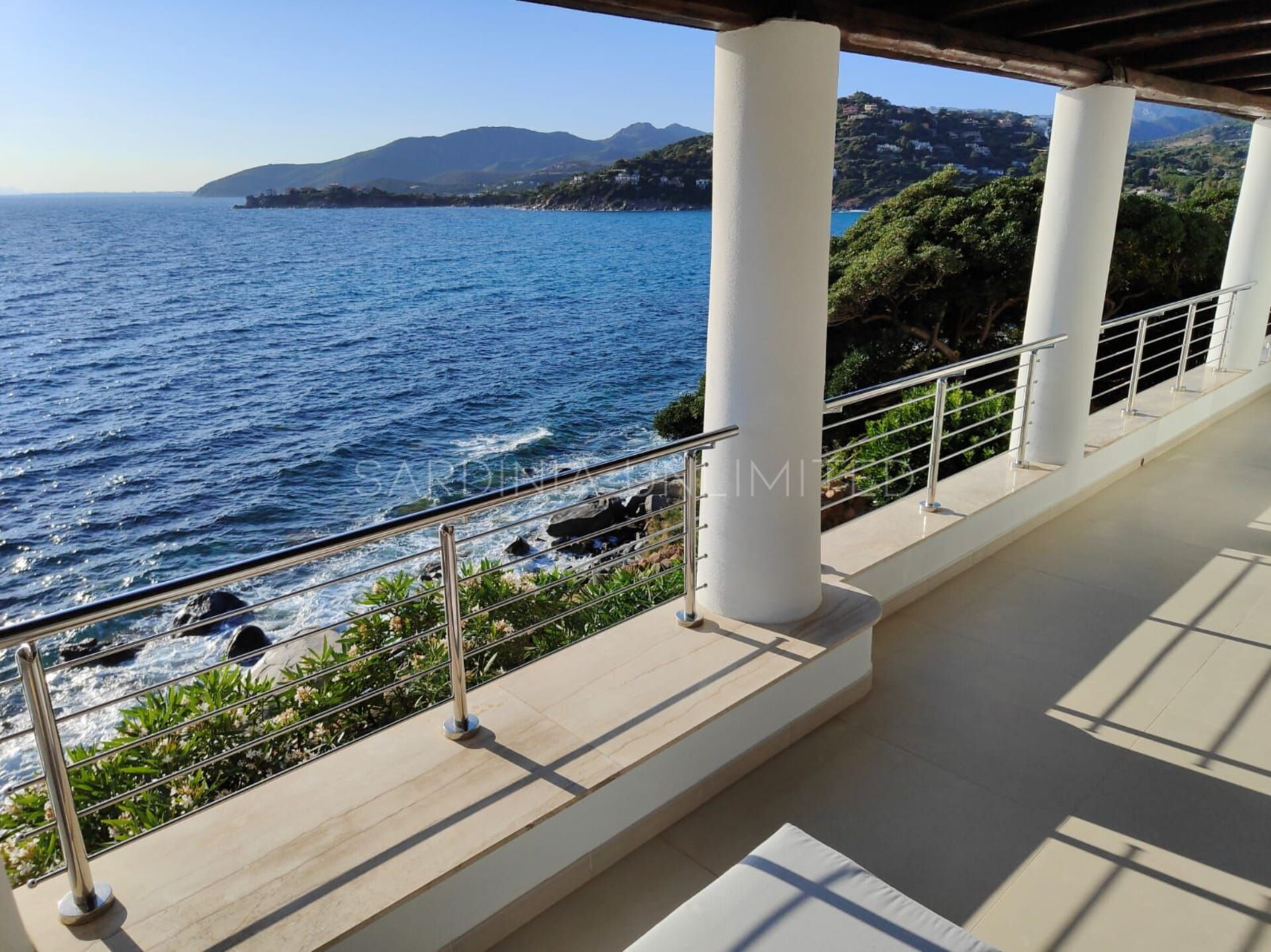 Diese Villa mit direktem Meerzugang auf Sardinien, umgeben von den unendlichen Schattierungen der mediterranen Macchia und den intensiven Farben des Meeres, ist eine luxuriöse Oase der Entspannung. Aus diesem Grund verfügt das Anwesen über zahlreiche und faszinierende Außenbereiche, die sowohl der Freizeit als auch der Geselligkeit gewidmet sind, wie zum Beispiel eine geräumige Veranda mit einem bequemen Tisch mit Blick auf das Meer, flankiert von einem Loungebereich, in dem sich ein geräumiges Ecksofa befindet, um einen herrlichen Aufenthalt zu genießen Aperitif mit Meerblick.