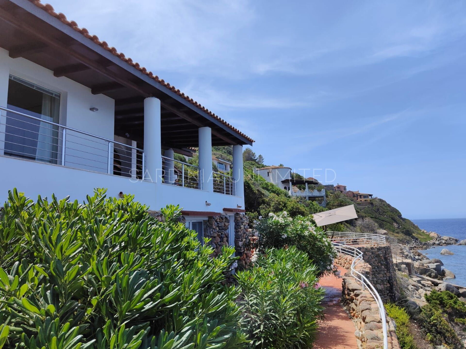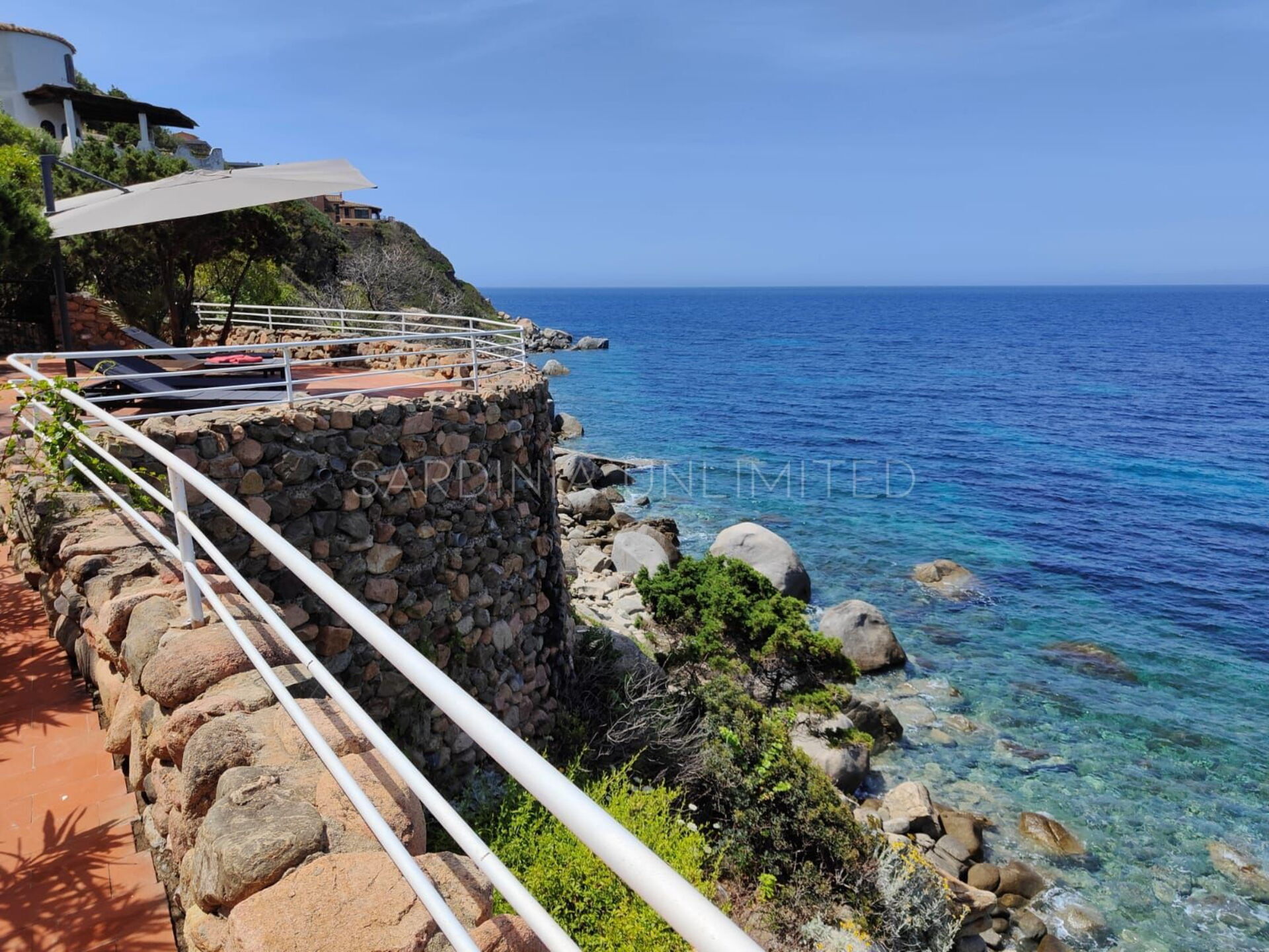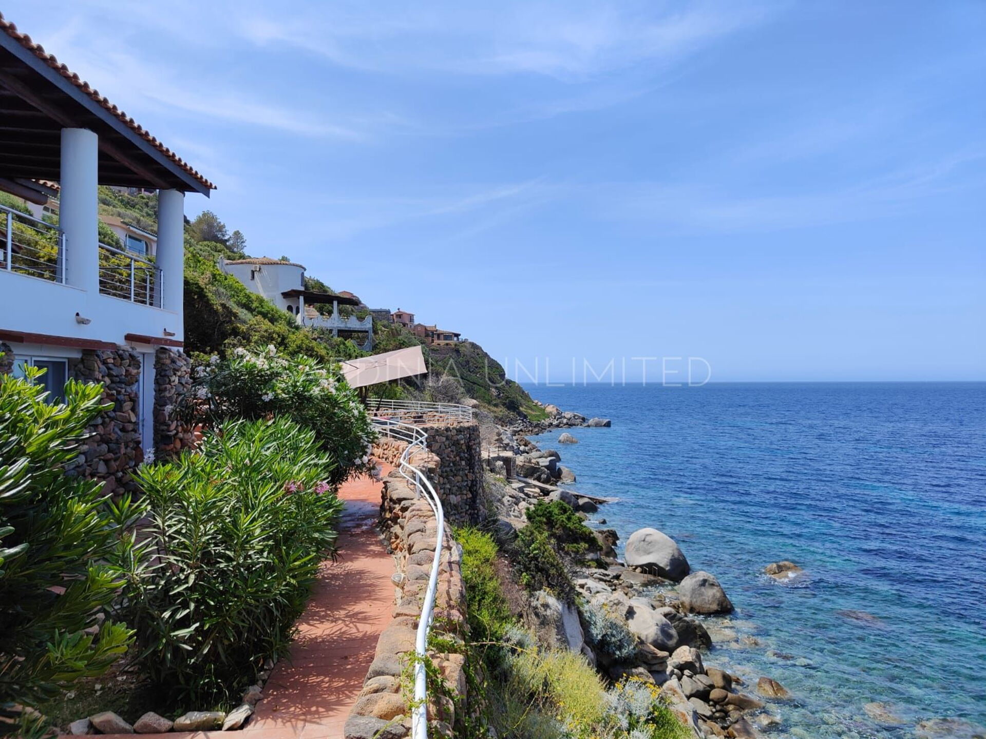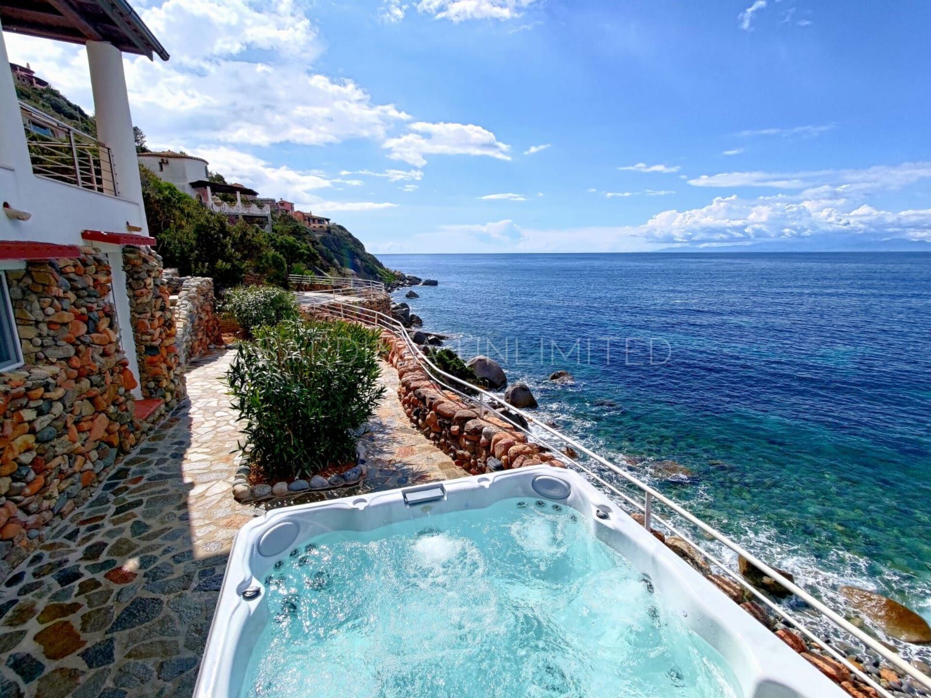 Vom Loungebereich ist es möglich, über einen gepflasterten Panoramaweg in die untere Ebene hinunterzugehen, wo sich ein großer Solariumbereich und ein Hydromassagebecken befinden. Weiter führt der Weg direkt zum Meer.