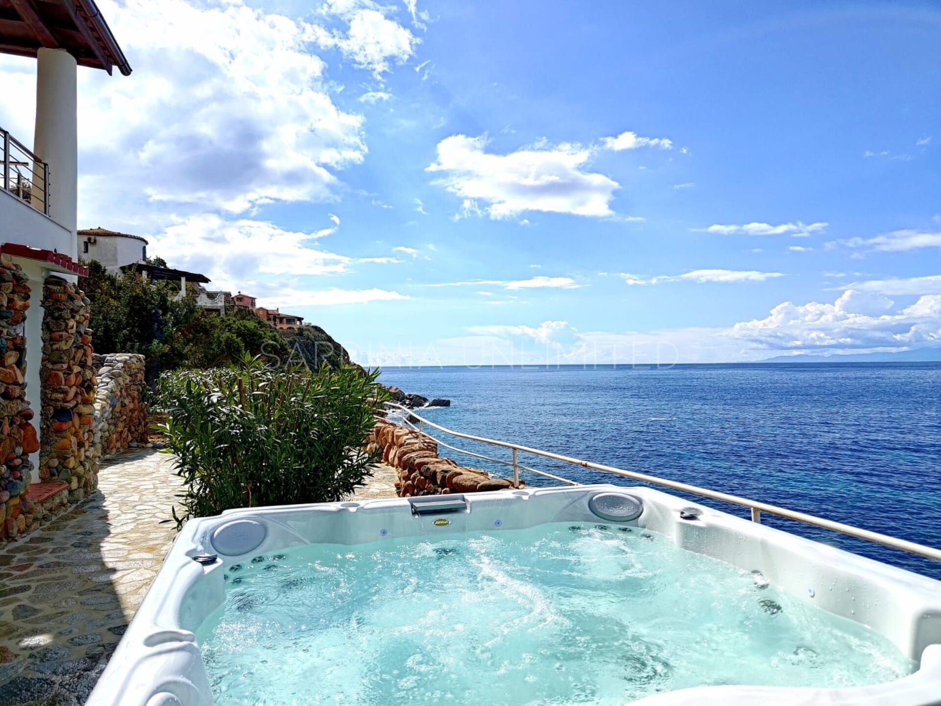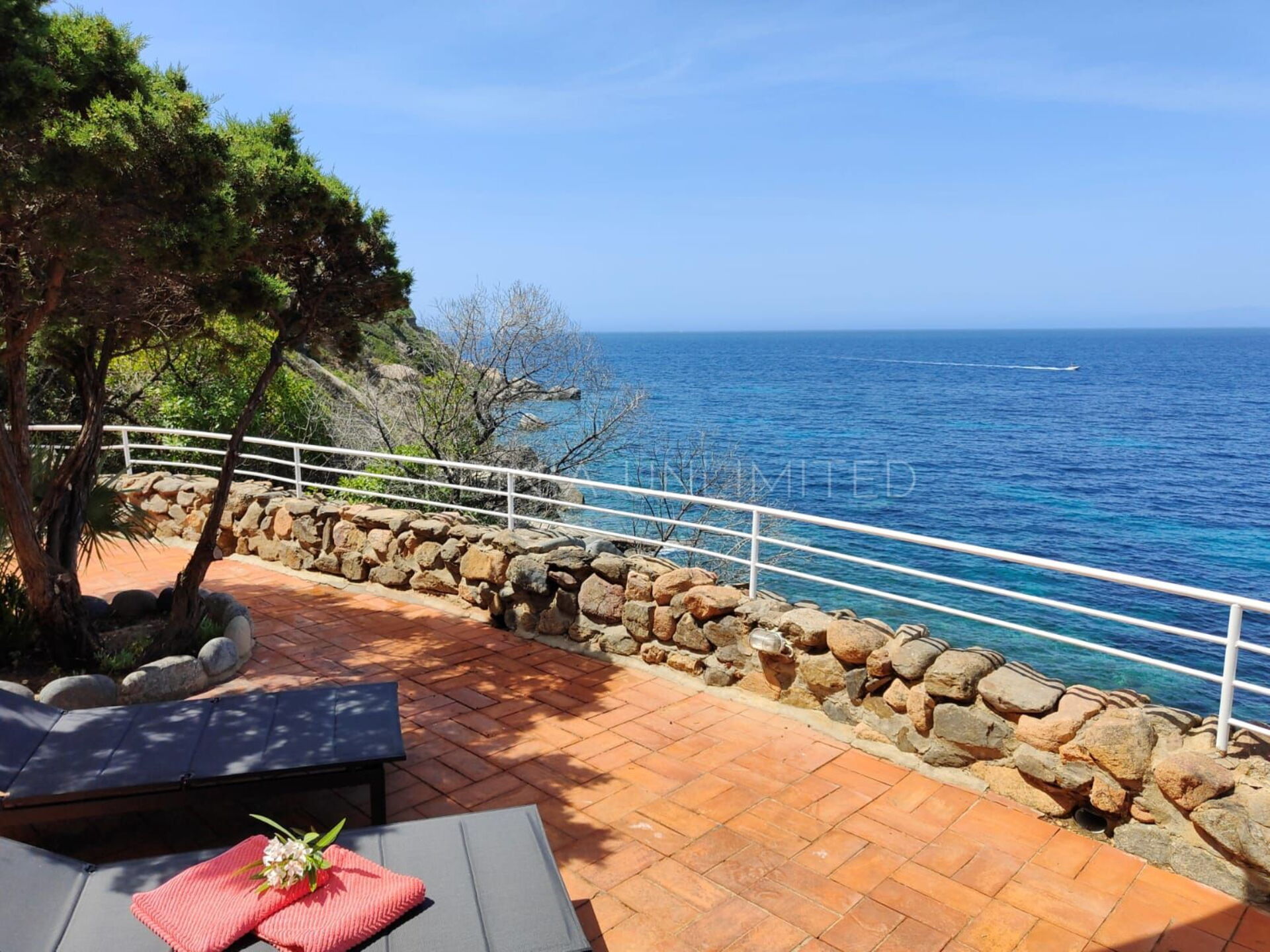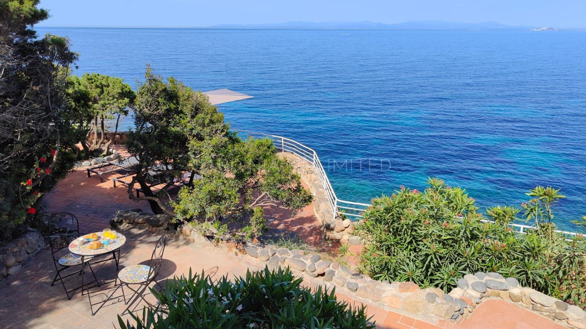 Vom Loungebereich ist es möglich, über einen gepflasterten Panoramaweg in die untere Ebene hinunterzugehen, wo sich ein großer Solariumbereich und ein Hydromassagebecken befinden. Weiter führt der Weg direkt zum Meer.