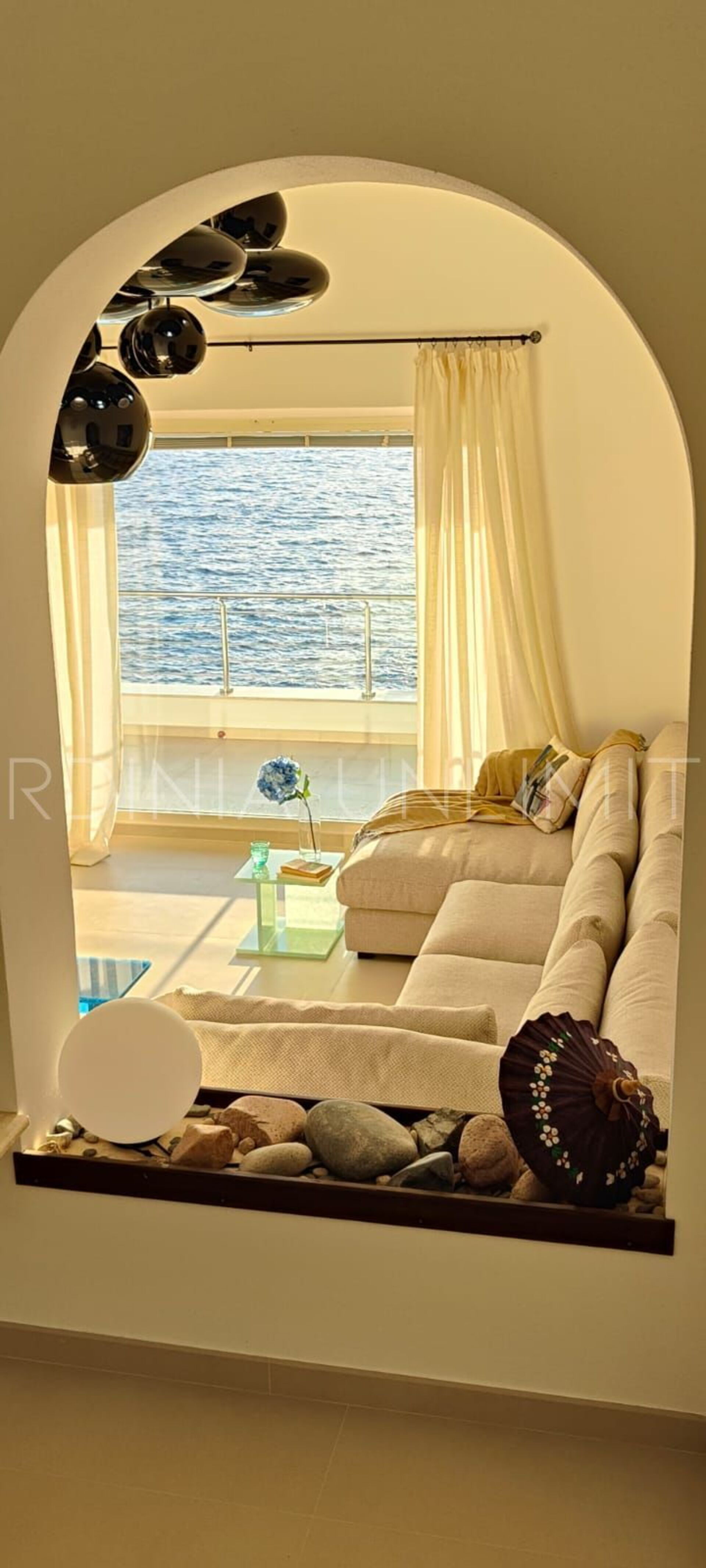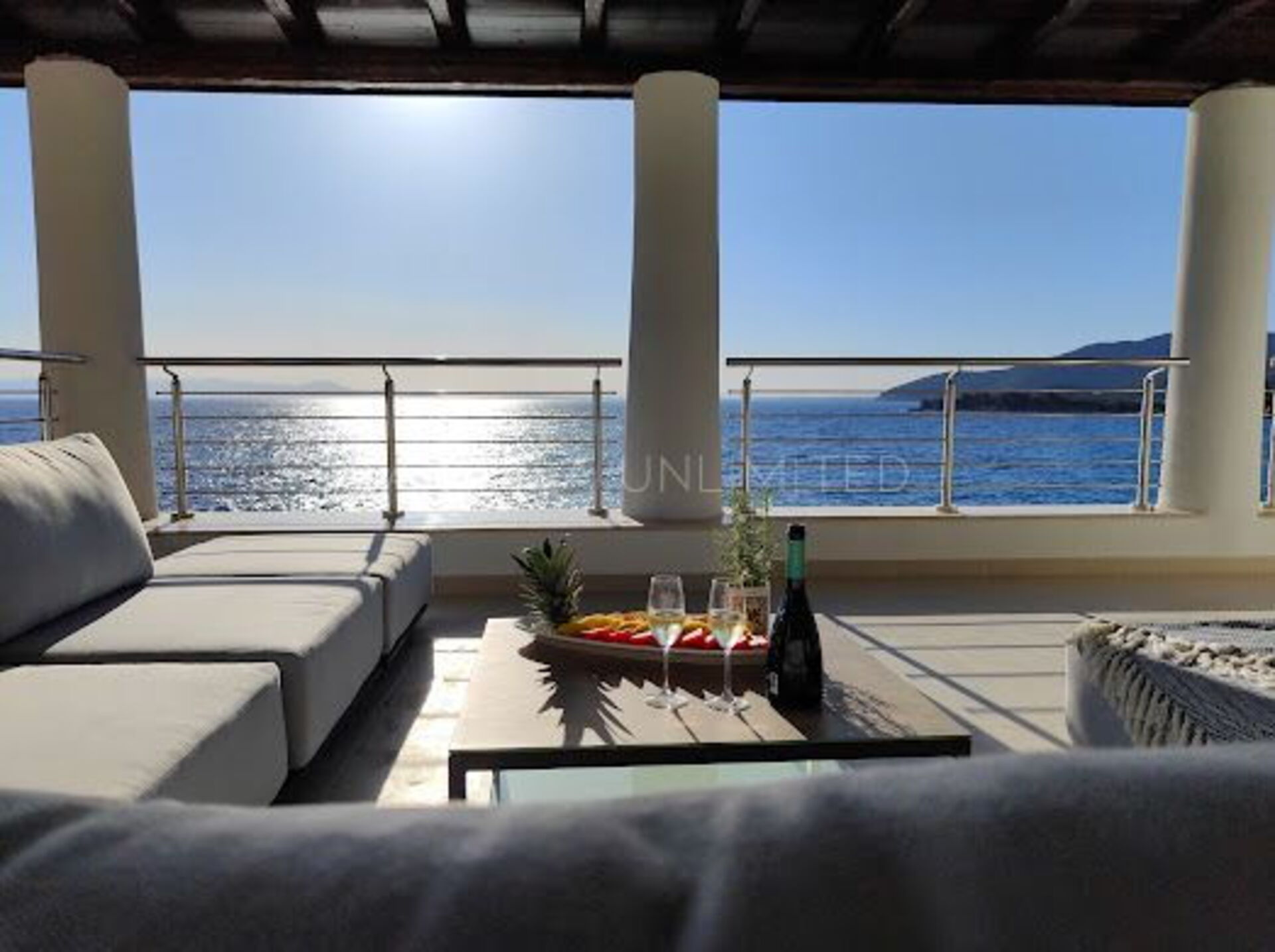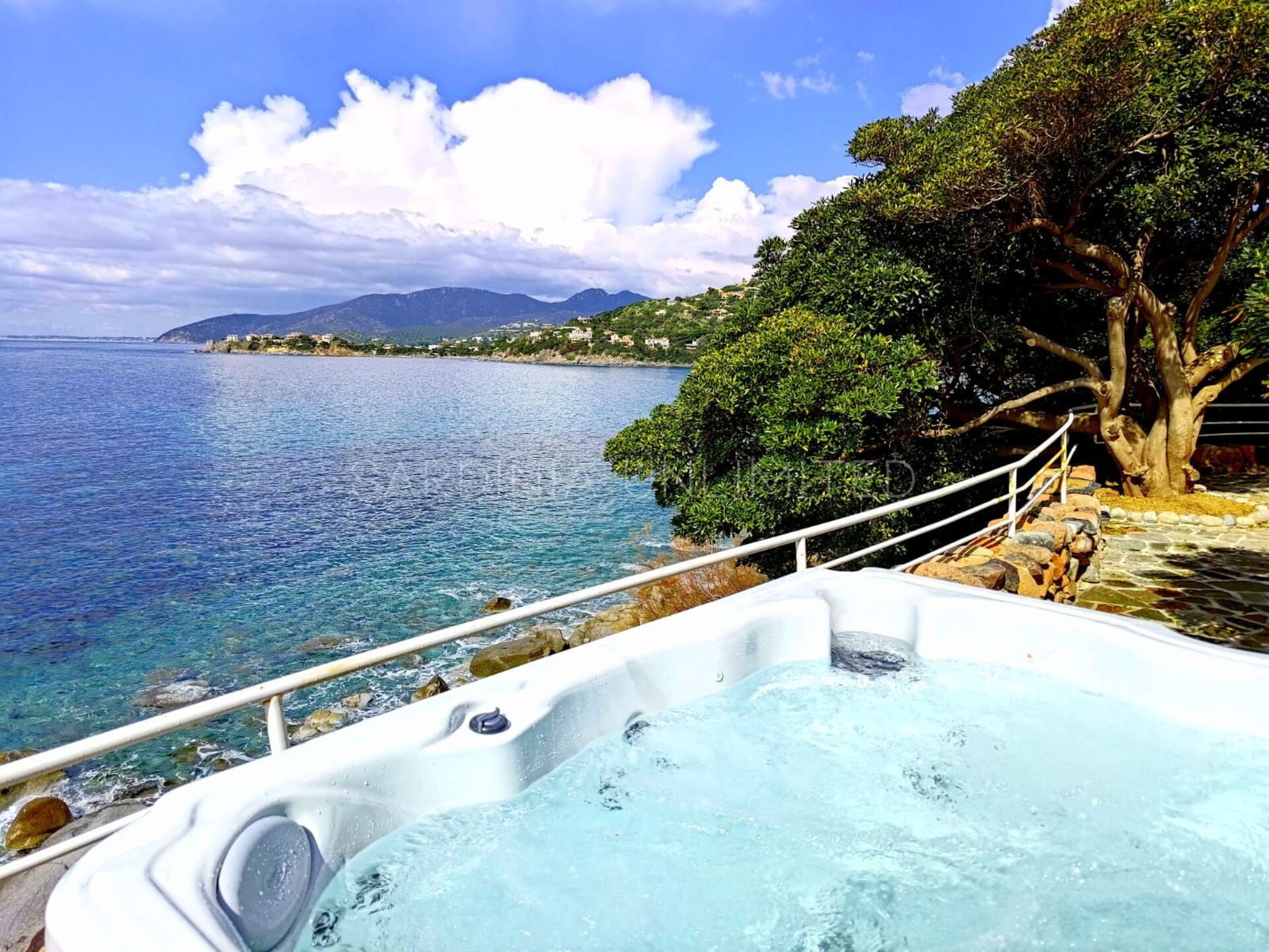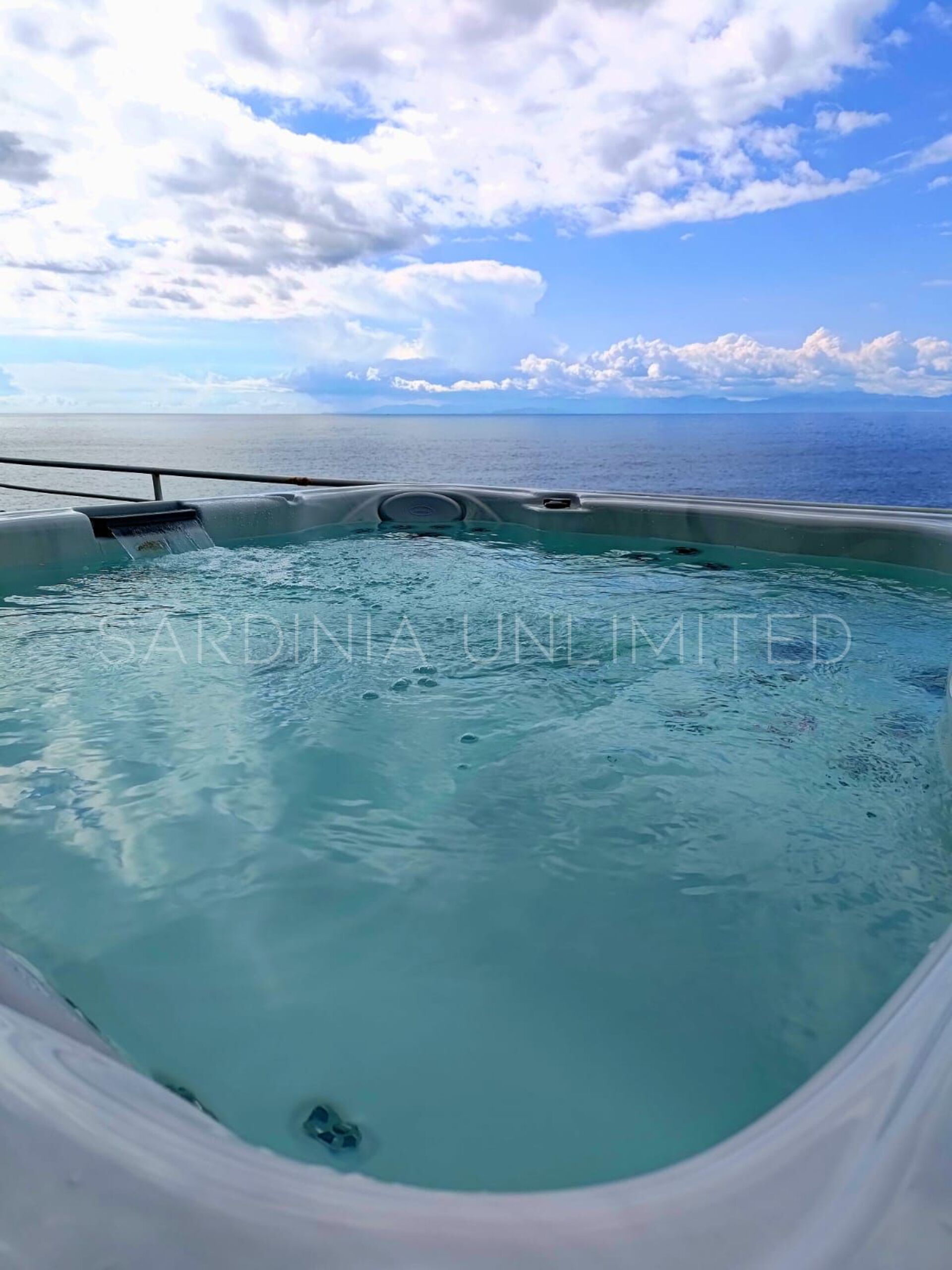 Vom Loungebereich ist es möglich, über einen gepflasterten Panoramaweg in die untere Ebene hinunterzugehen, wo sich ein großer Solariumbereich und ein Hydromassagebecken befinden. Weiter führt der Weg direkt zum Meer.