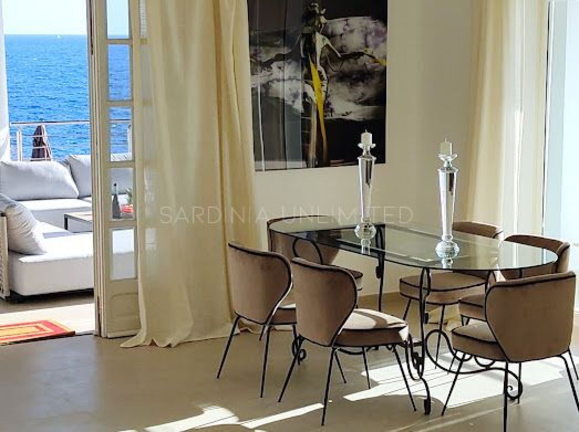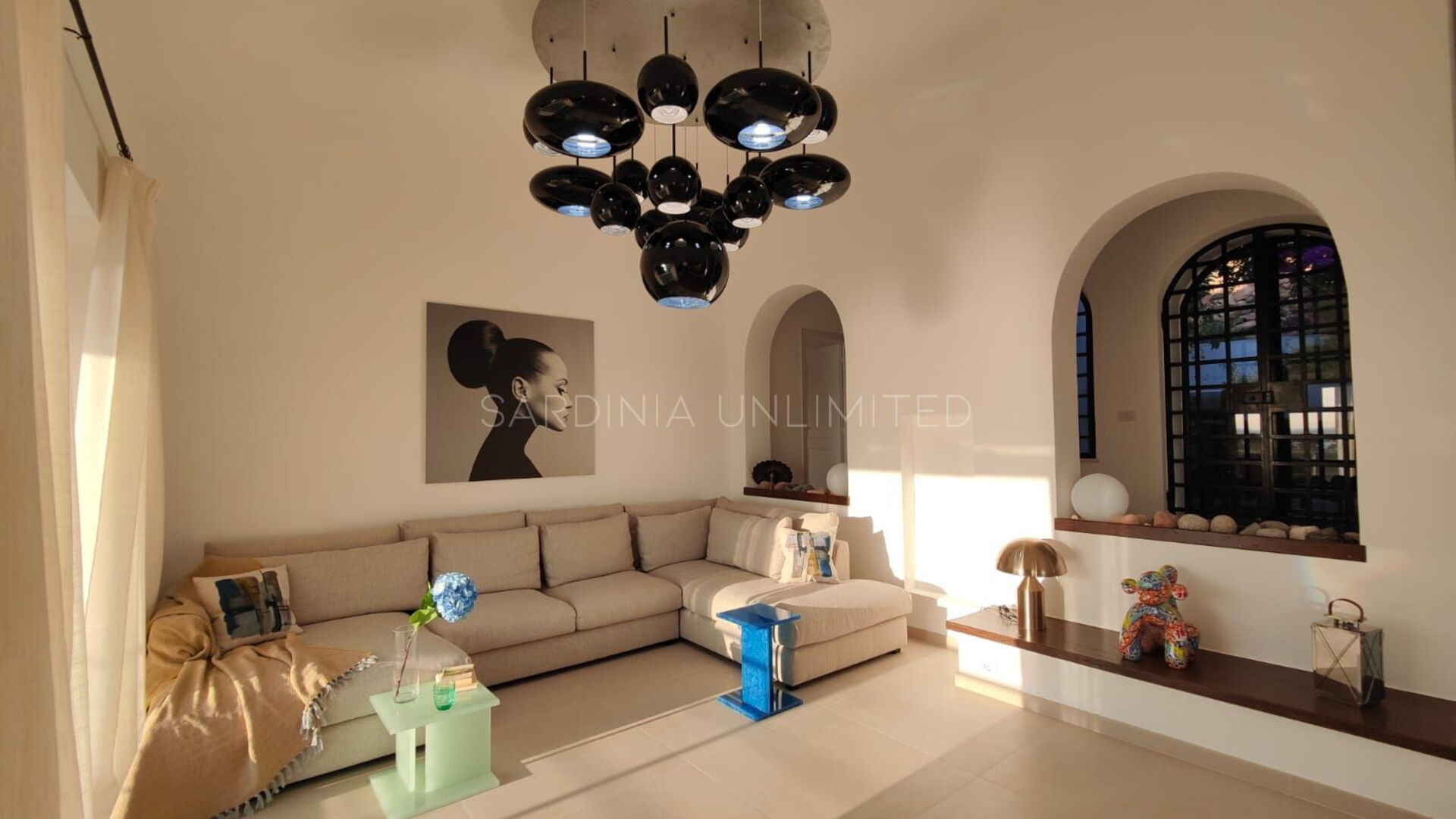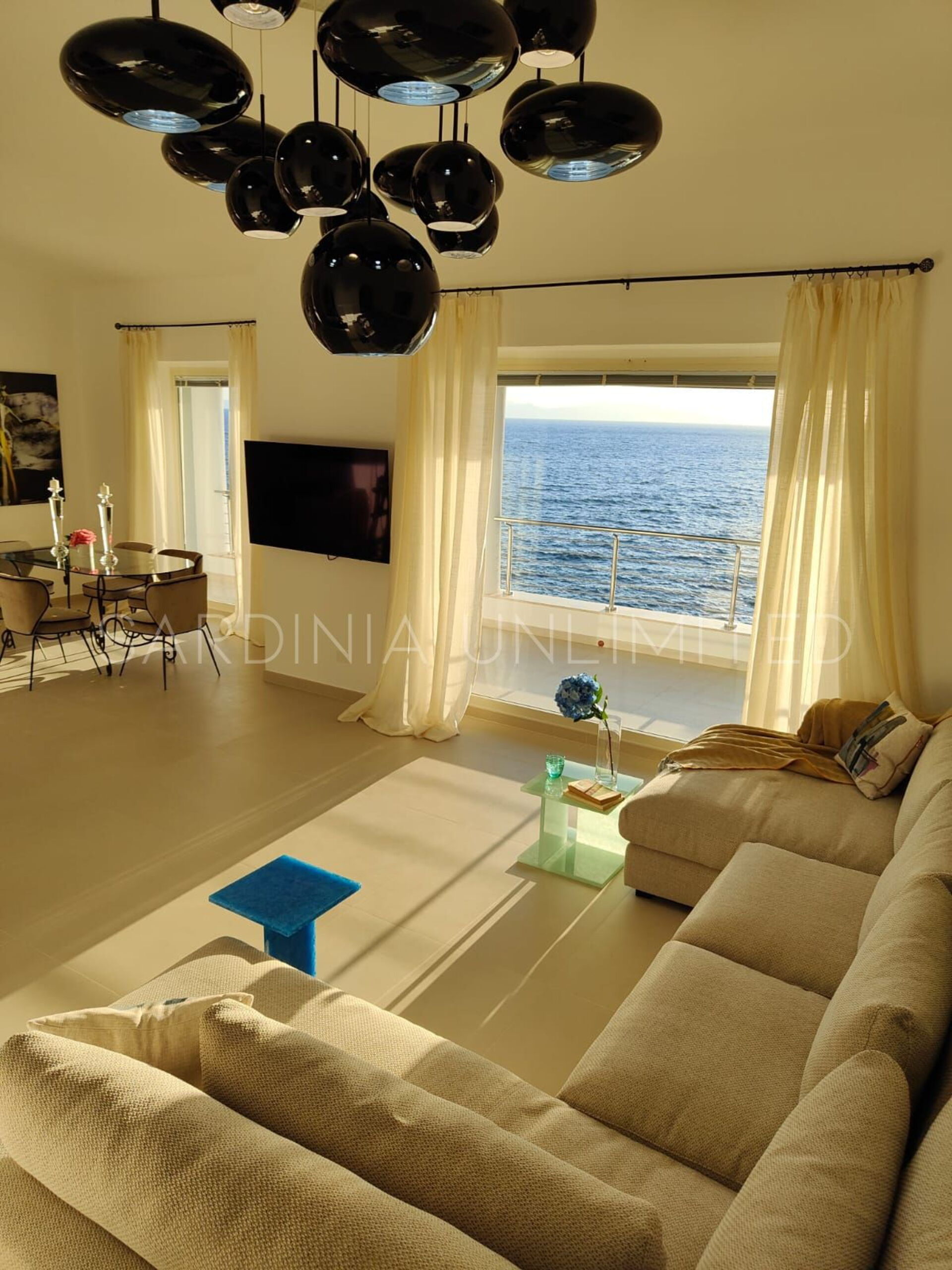 Villa Poesia d'Estate ist eine prächtige Villa auf Sardinien, das in einem entzückenden und raffinierten modernen Stil eingerichtet ist, der ihm eine bezaubernde Note von Eleganz verleiht. Am Eingang befindet sich ein geräumiger Wohnbereich mit einem bequemen Ecksofa und einem edlen Glastisch, in dem dank der Kombination der hellen und sanften Farben der Möbel mit den großen Panoramafenstern viel Licht herrscht. All dies trägt dazu bei, ein Gefühl der Kontinuität zwischen dem Innenraum und der geräumigen Außenveranda zu schaffen.