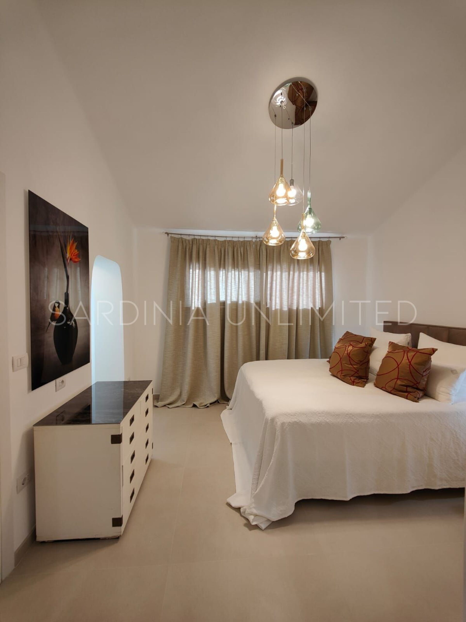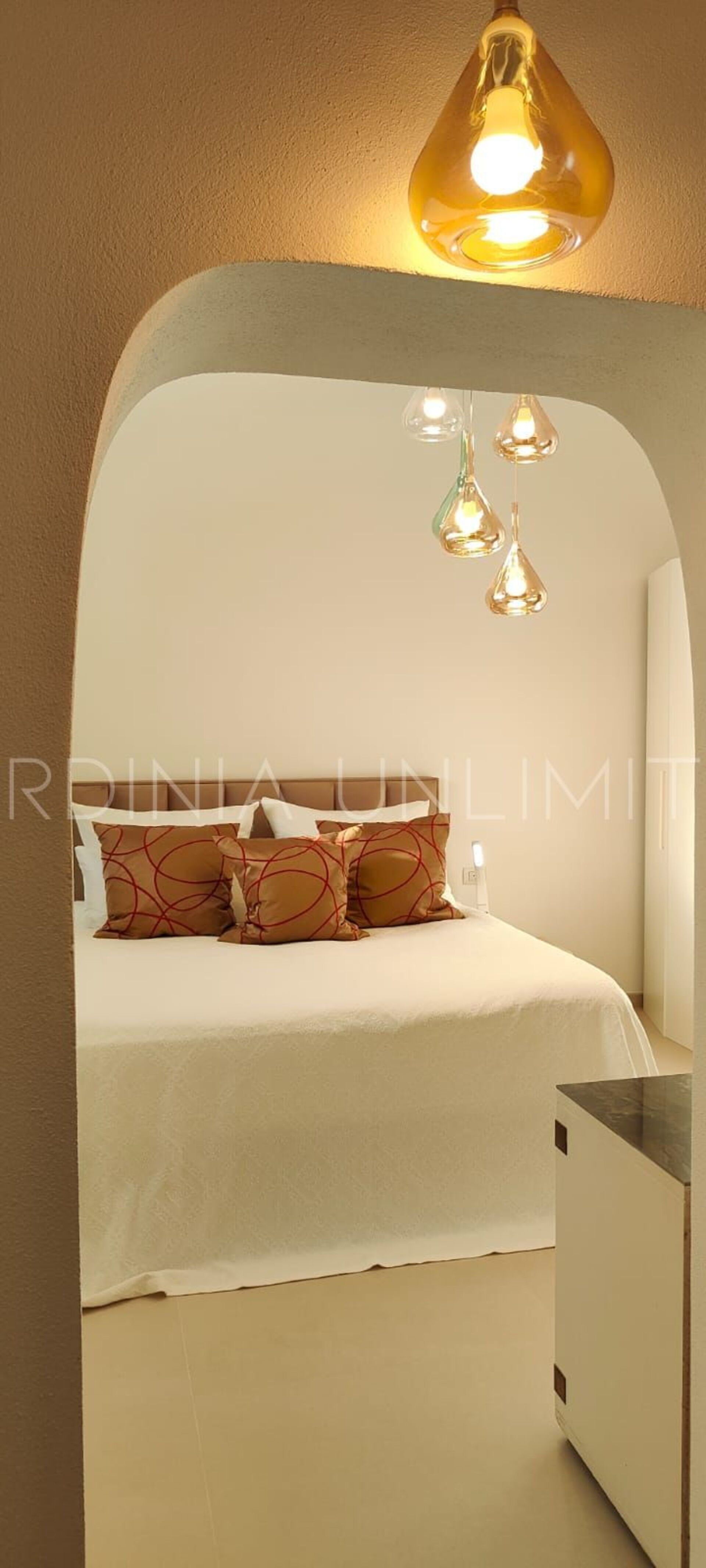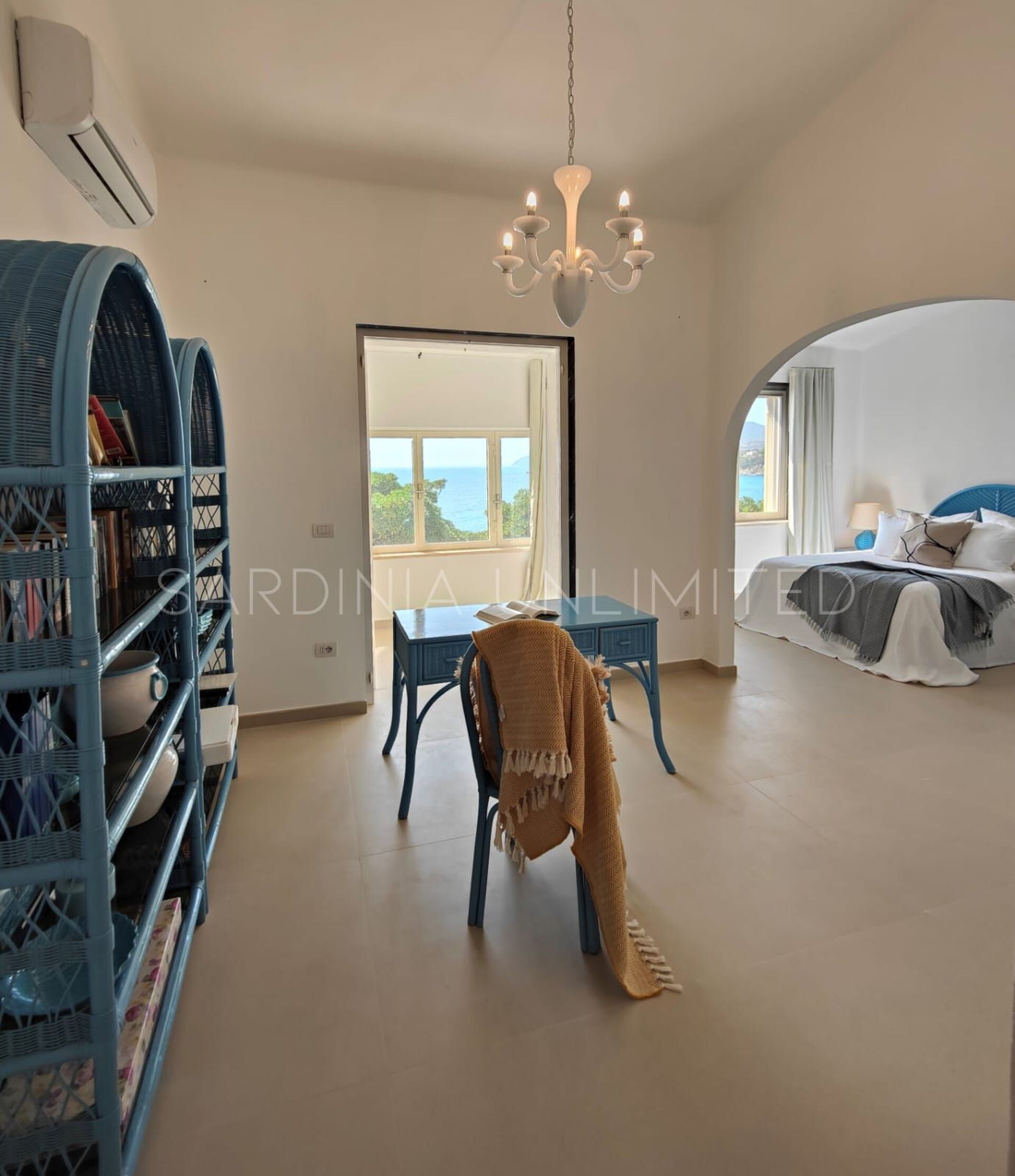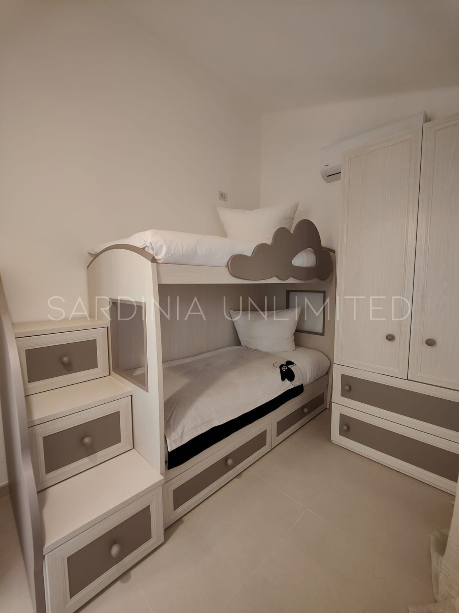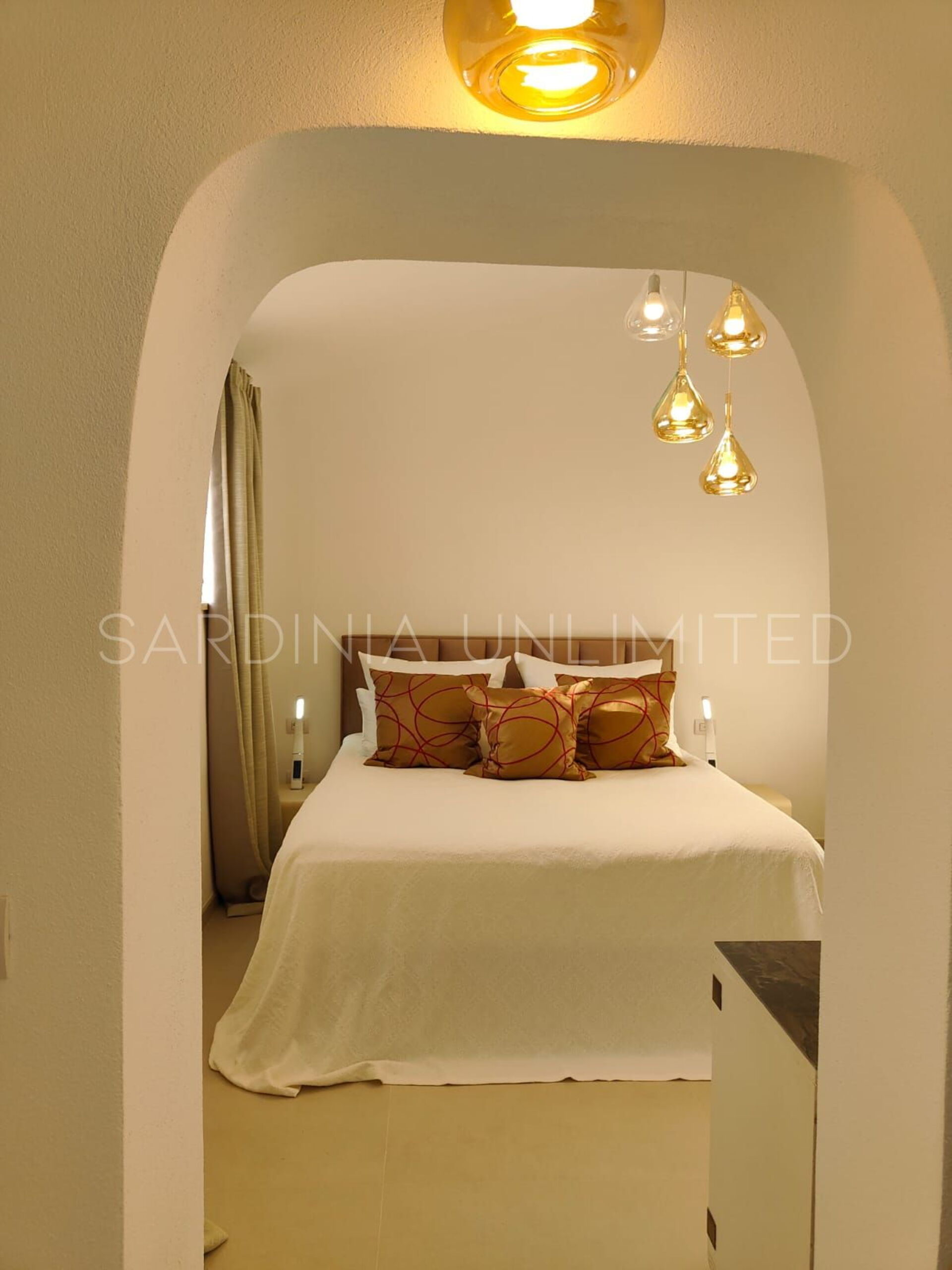 Der Schlafbereich behält den gleichen Charme und die gleiche Eleganz wie der Rest des Hauses. Tatsächlich gibt es in der Villa eine große Master-Suite, die als multifunktionaler Raum konzipiert ist: ein großer offener Raum, in dem die Räume durch Gewölbebögen getrennt sind und der aus einem Doppelbett, einem geräumigen begehbaren Kleiderschrank und einer bezaubernden Leseecke besteht und schließlich ein Hauptbadezimmer aus edlem schwarzem Marmor. In der Villa gibt es zwei weitere Doppelzimmer, beide mit eigenem Bad: Das erste ist mit einem Kinderzimmer kombiniert, in dem sich ein Etagenbett befindet, und das zweite zeichnet sich durch einen separaten Eingang aus.