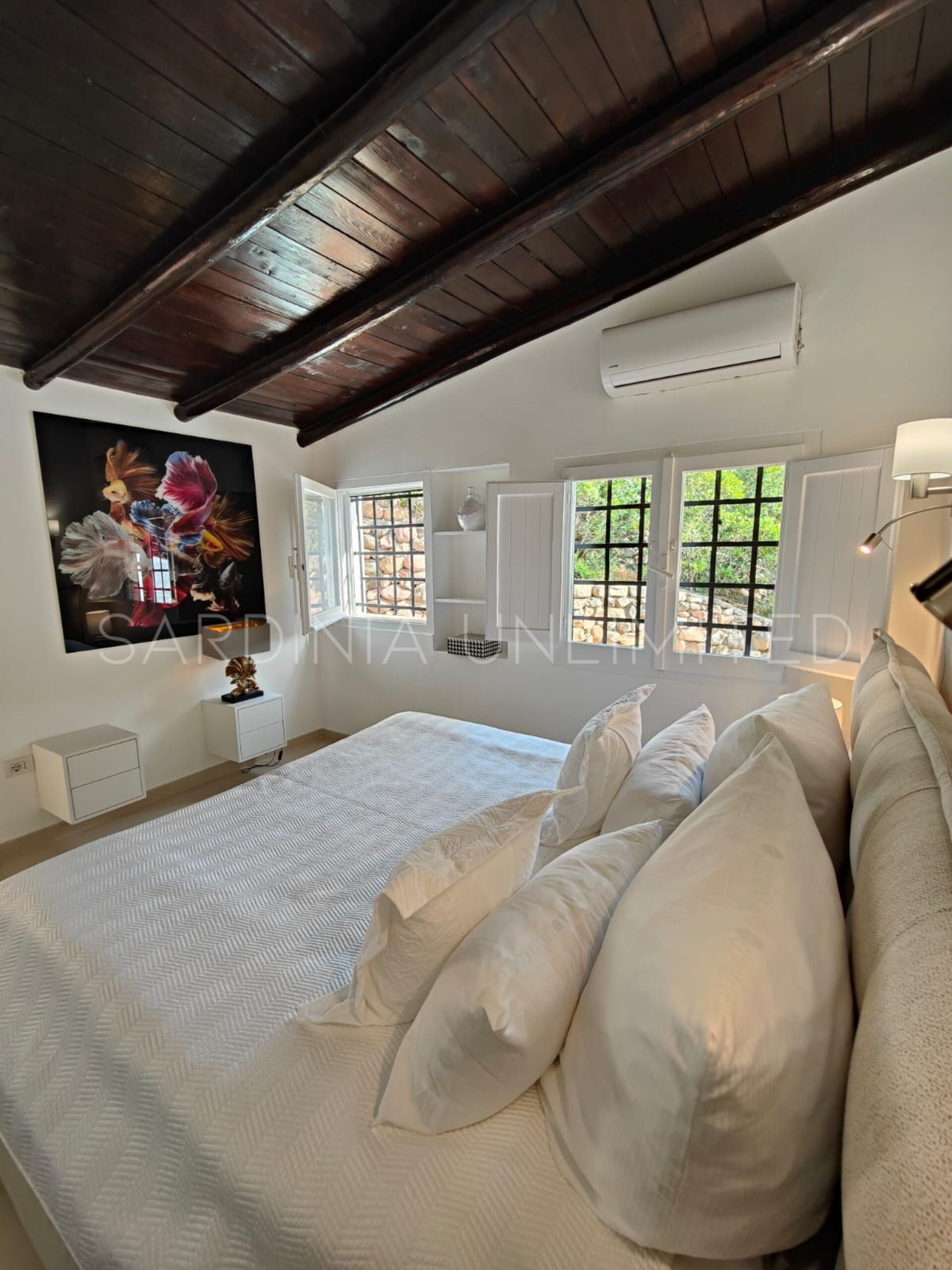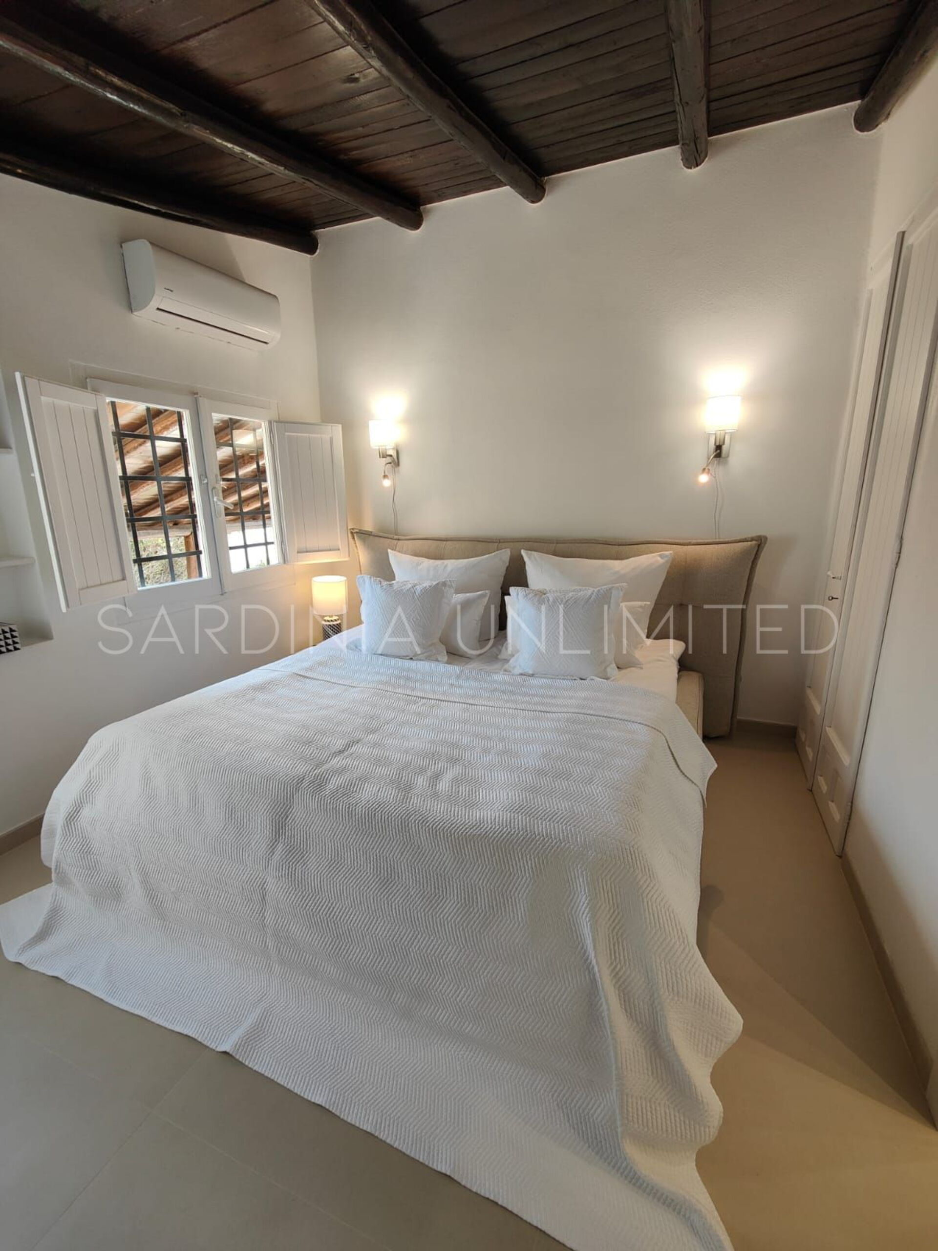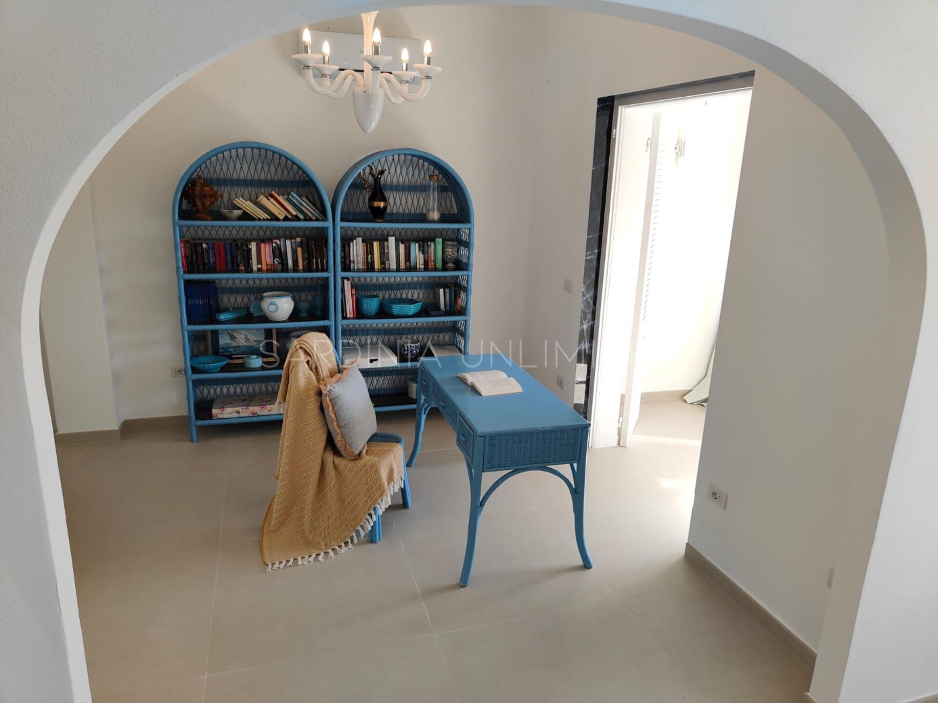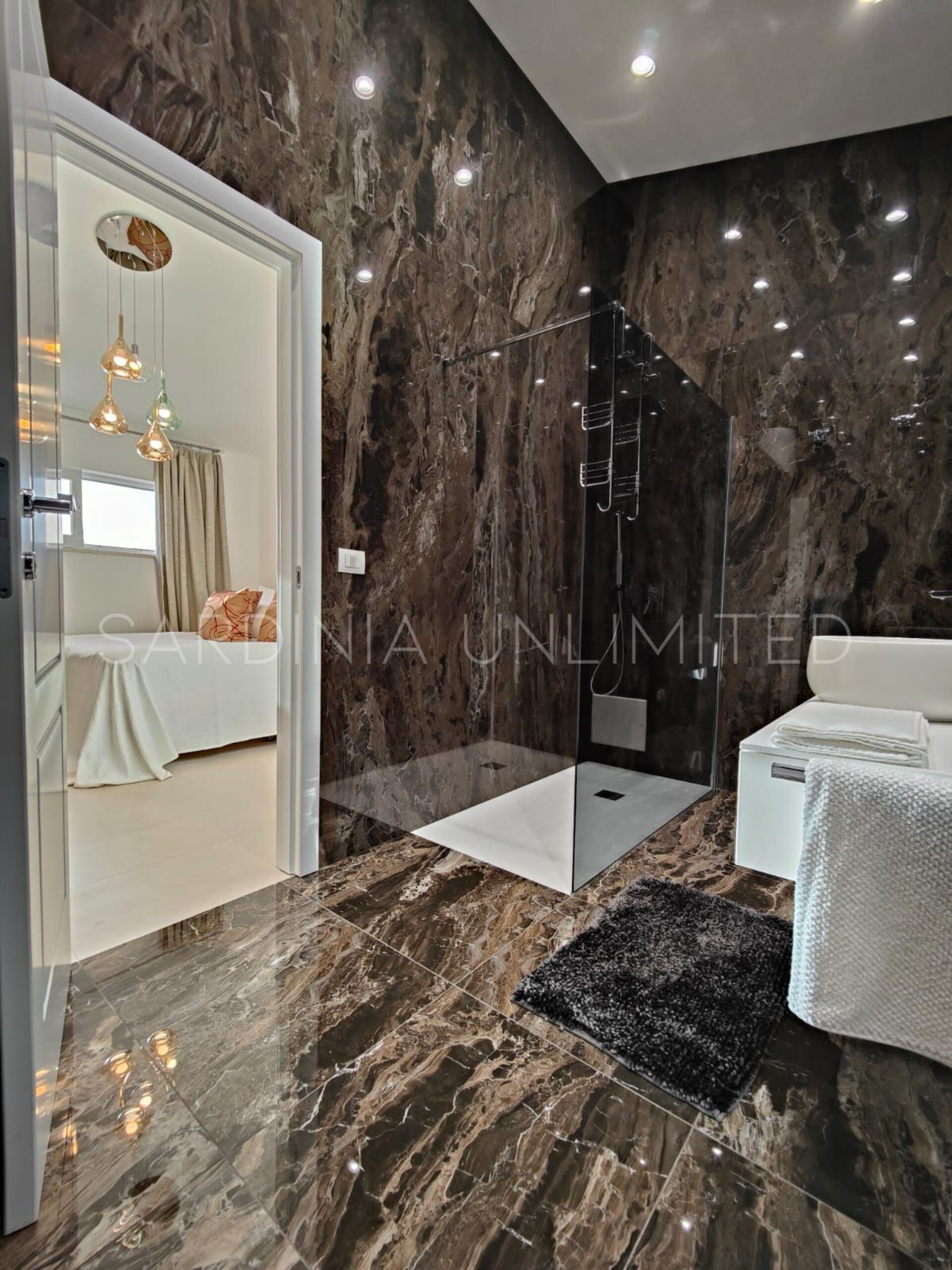 Der Schlafbereich behält den gleichen Charme und die gleiche Eleganz wie der Rest des Hauses. Tatsächlich gibt es in der Villa eine große Master-Suite, die als multifunktionaler Raum konzipiert ist: ein großer offener Raum, in dem die Räume durch Gewölbebögen getrennt sind und der aus einem Doppelbett, einem geräumigen begehbaren Kleiderschrank und einer bezaubernden Leseecke besteht und schließlich ein Hauptbadezimmer aus edlem schwarzem Marmor. In der Villa gibt es zwei weitere Doppelzimmer, beide mit eigenem Bad: Das erste ist mit einem Kinderzimmer kombiniert, in dem sich ein Etagenbett befindet, und das zweite zeichnet sich durch einen separaten Eingang aus.
