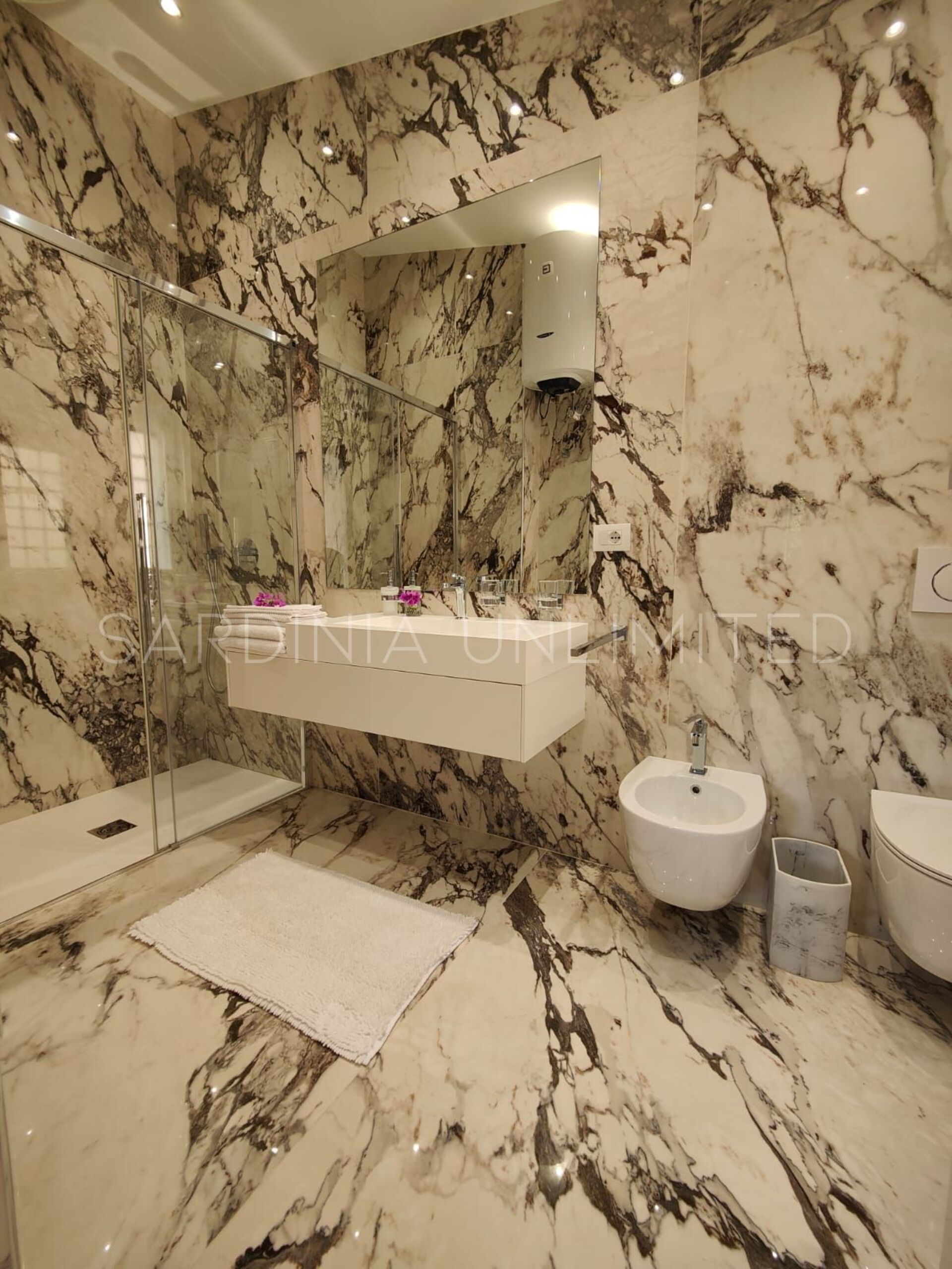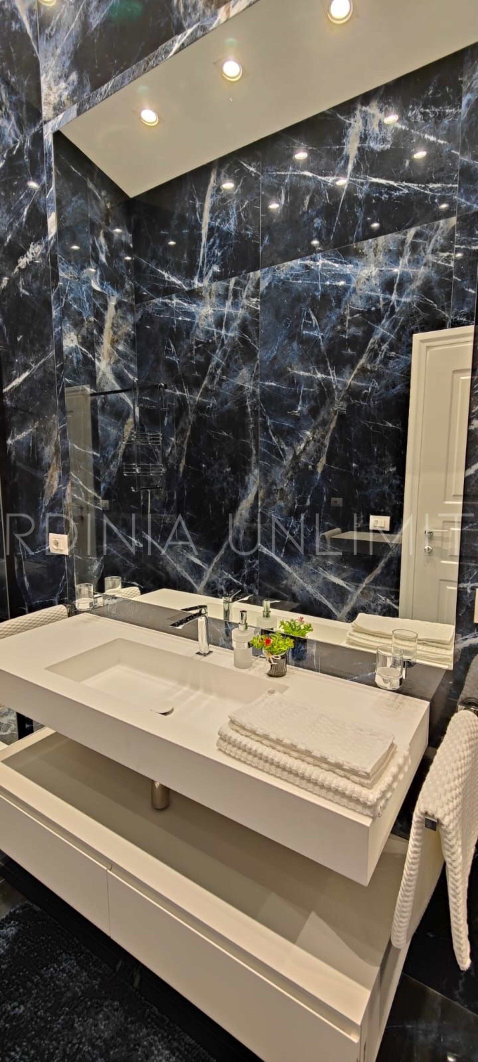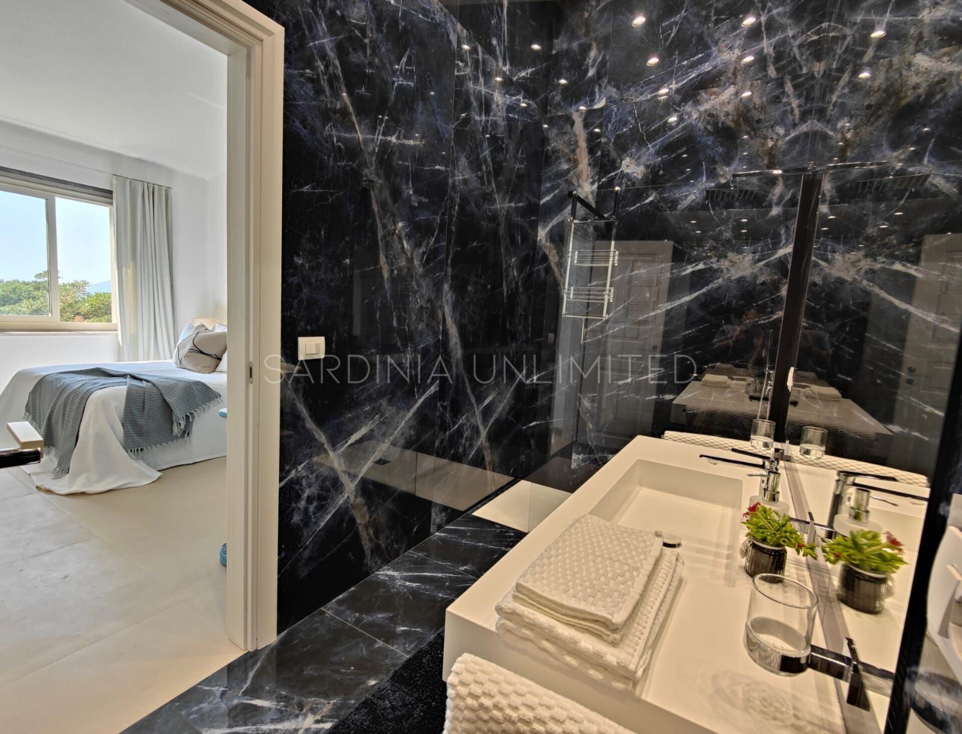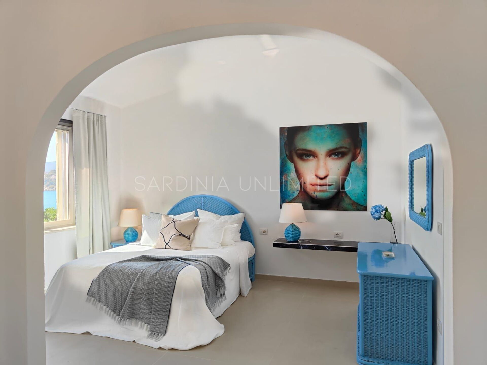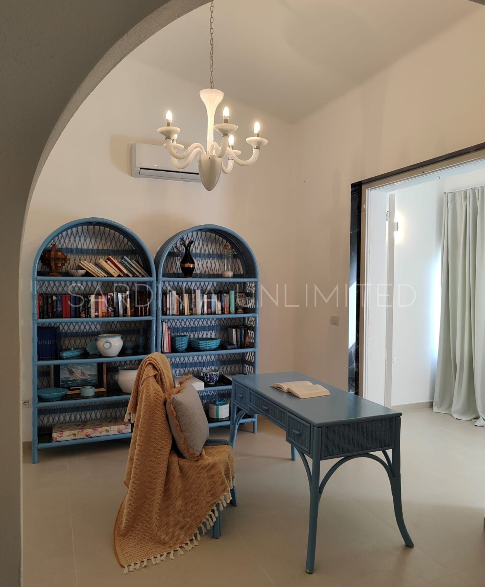 Der Schlafbereich behält den gleichen Charme und die gleiche Eleganz wie der Rest des Hauses. Tatsächlich gibt es in der Villa eine große Master-Suite, die als multifunktionaler Raum konzipiert ist: ein großer offener Raum, in dem die Räume durch Gewölbebögen getrennt sind und der aus einem Doppelbett, einem geräumigen begehbaren Kleiderschrank und einer bezaubernden Leseecke besteht und schließlich ein Hauptbadezimmer aus edlem schwarzem Marmor. In der Villa gibt es zwei weitere Doppelzimmer, beide mit eigenem Bad: Das erste ist mit einem Kinderzimmer kombiniert, in dem sich ein Etagenbett befindet, und das zweite zeichnet sich durch einen separaten Eingang aus.
