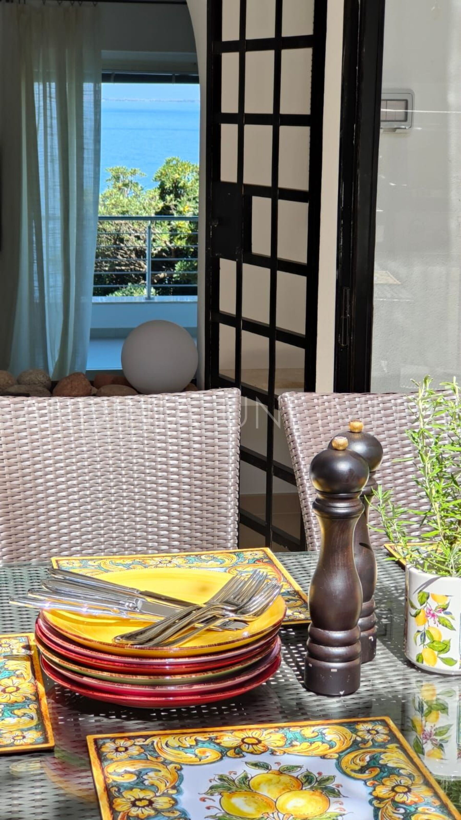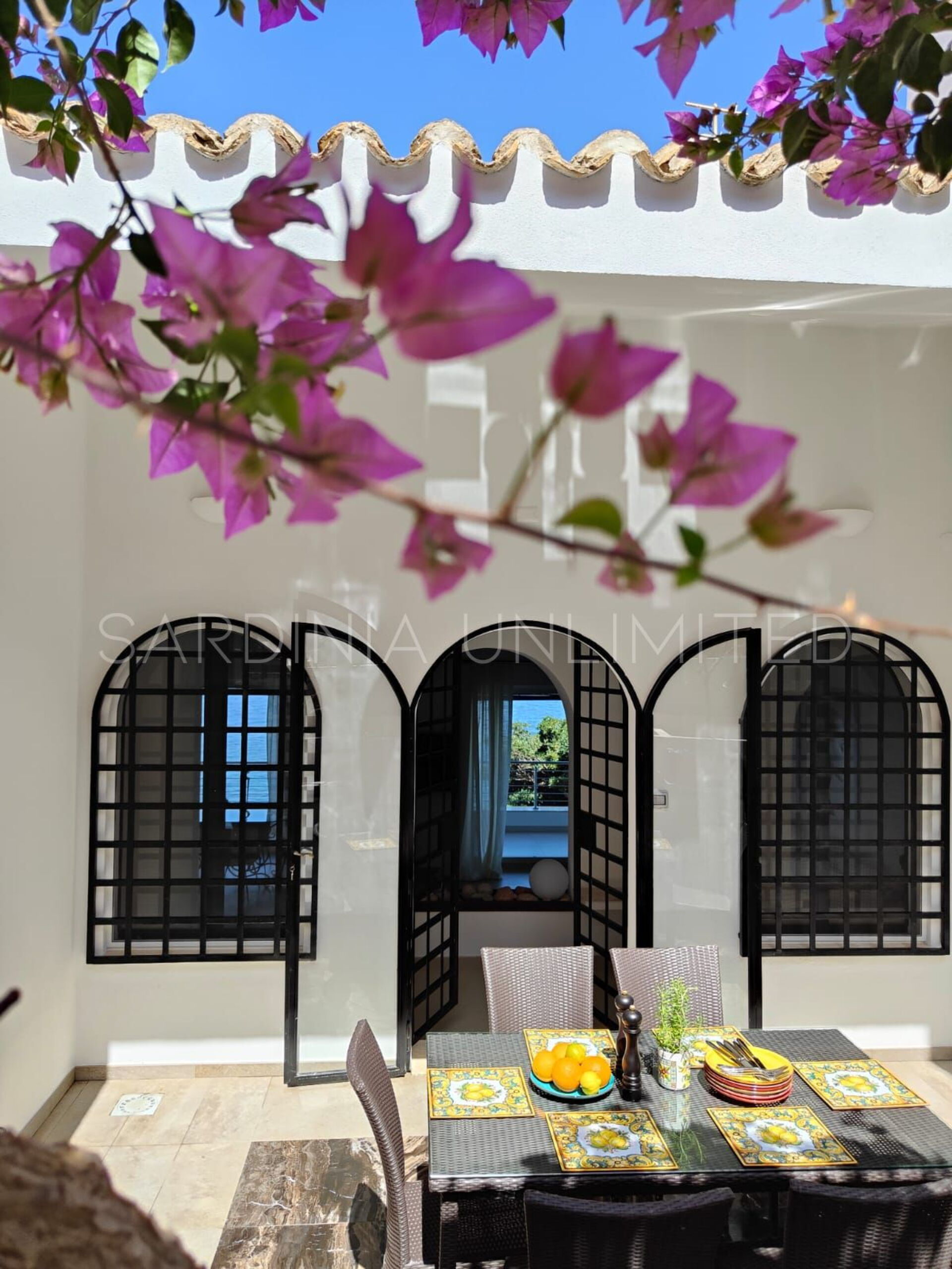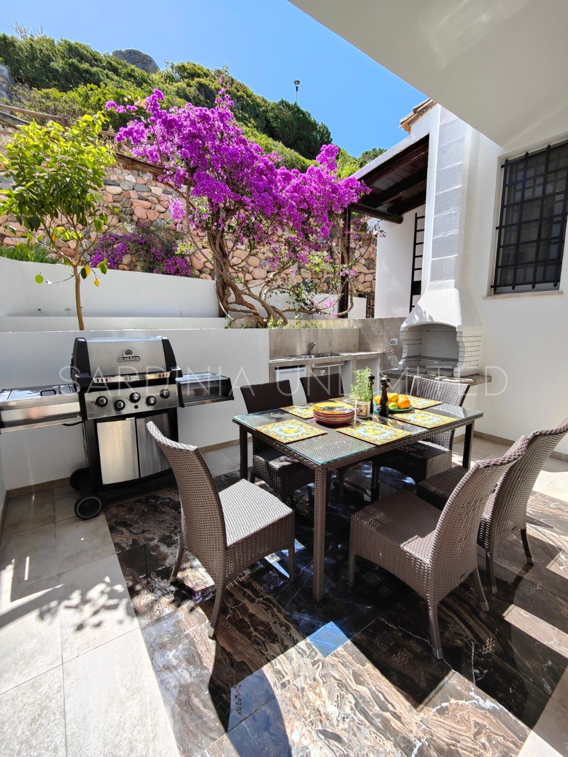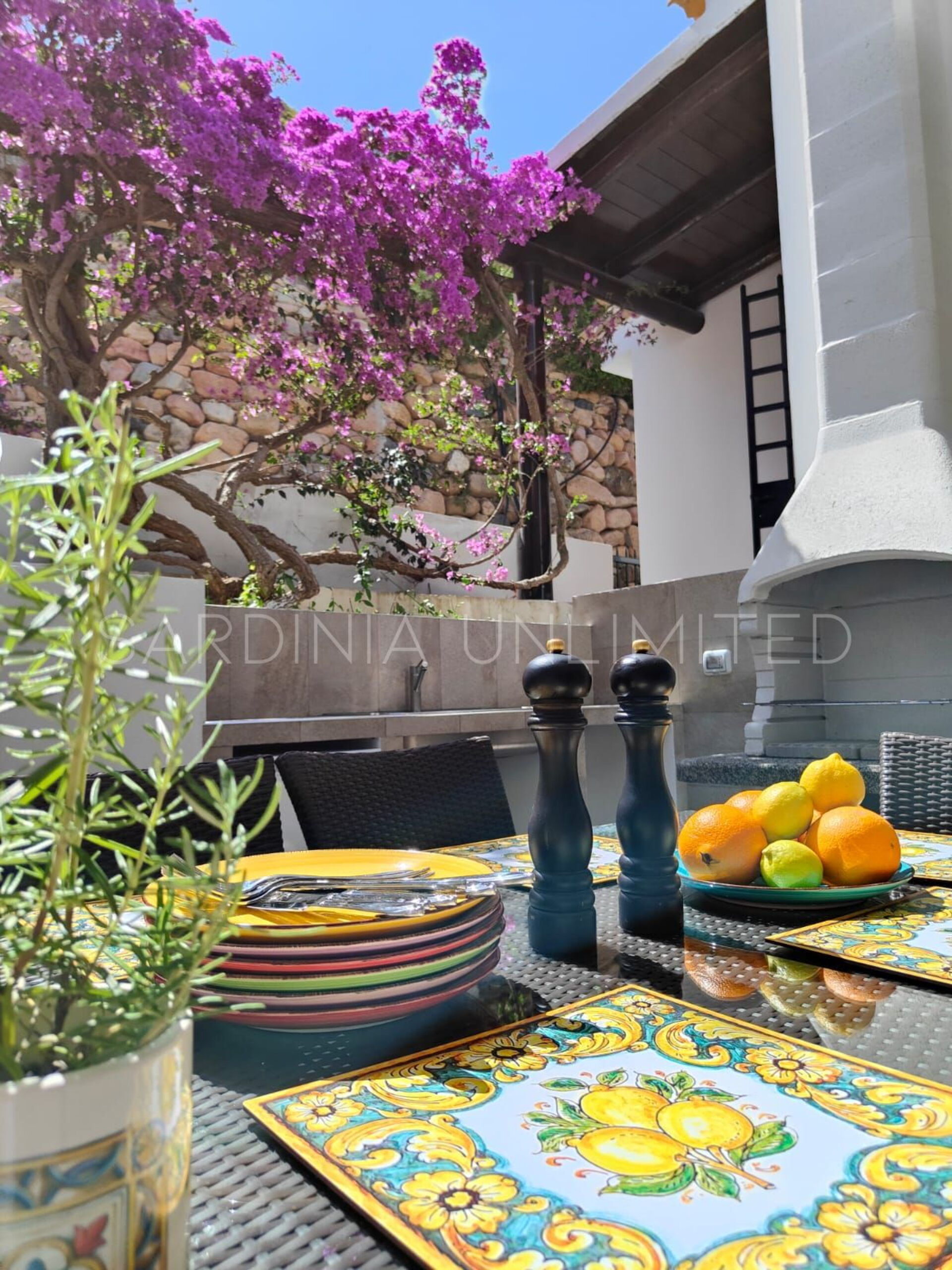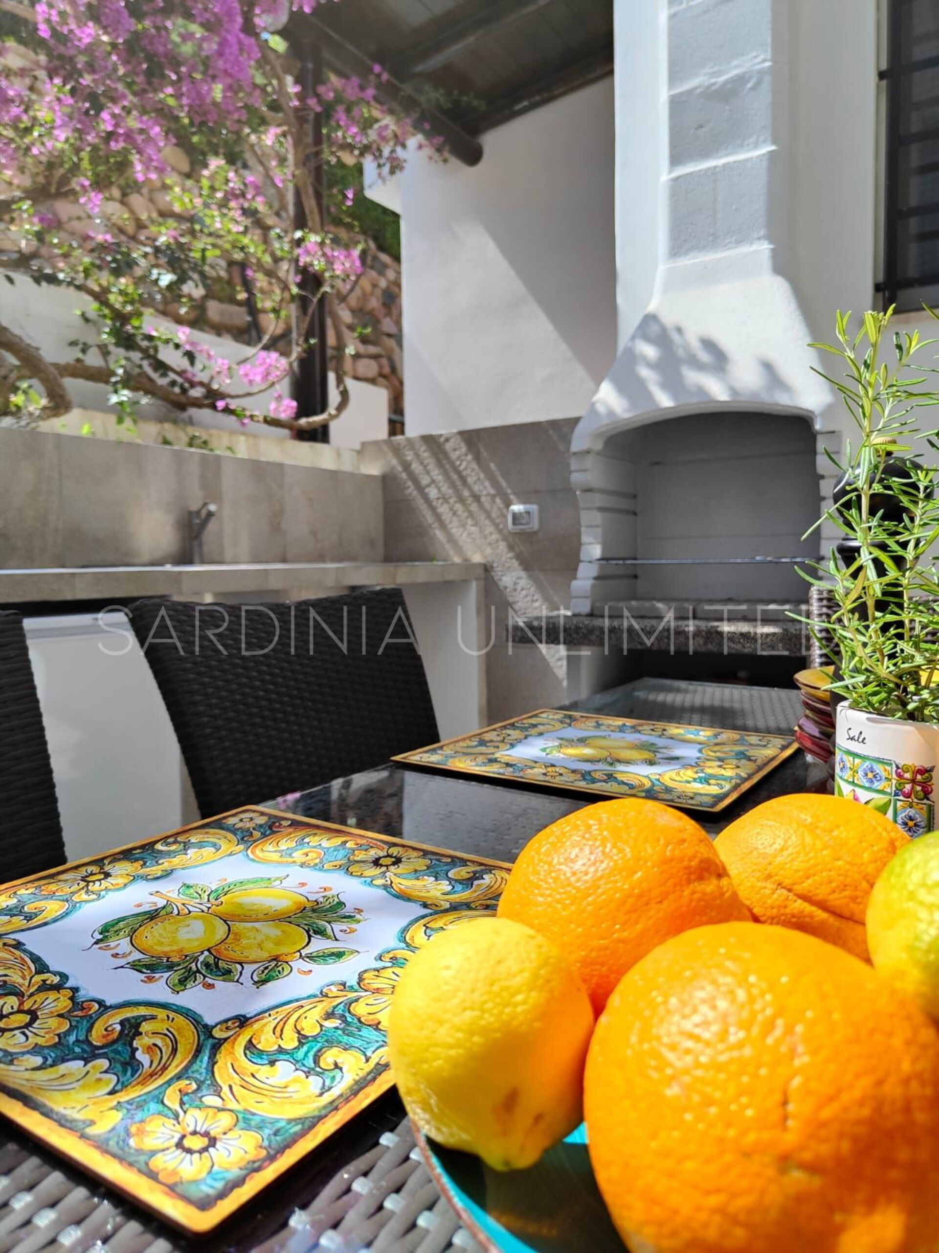 Auf der Rückseite der Villa gibt es einen weiteren Raum, der durch die Farbnoten der Bougainvillea und den Zitronenduft sehr elegant gestaltet ist und in dem sich ein Tisch zum Essen im Freien sowie ein bequemer Grill und ein Steinofen befinden.