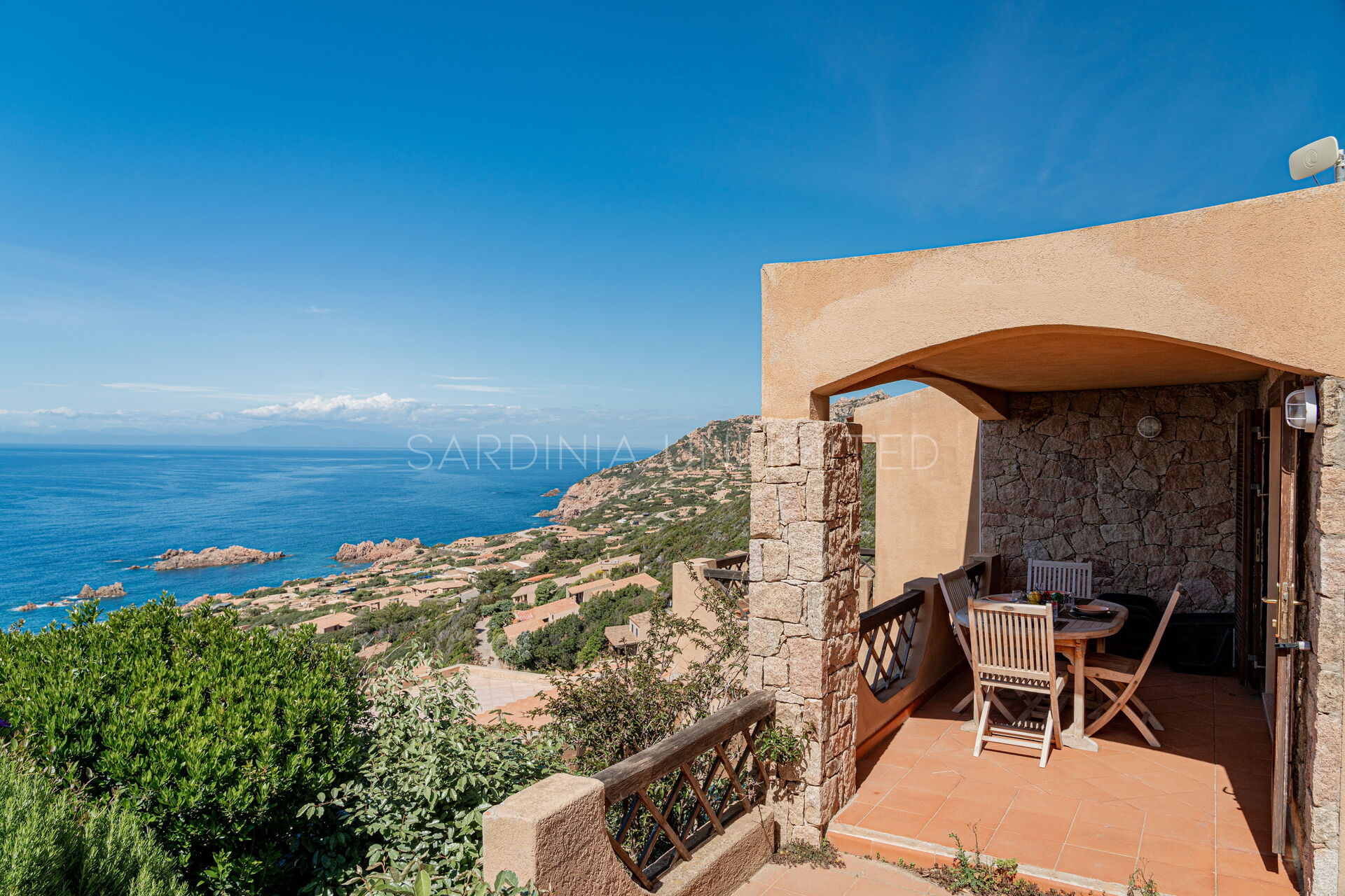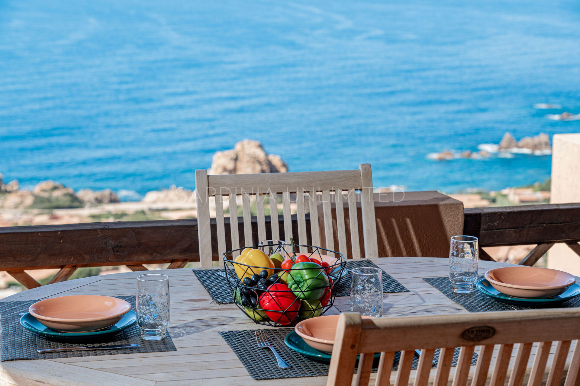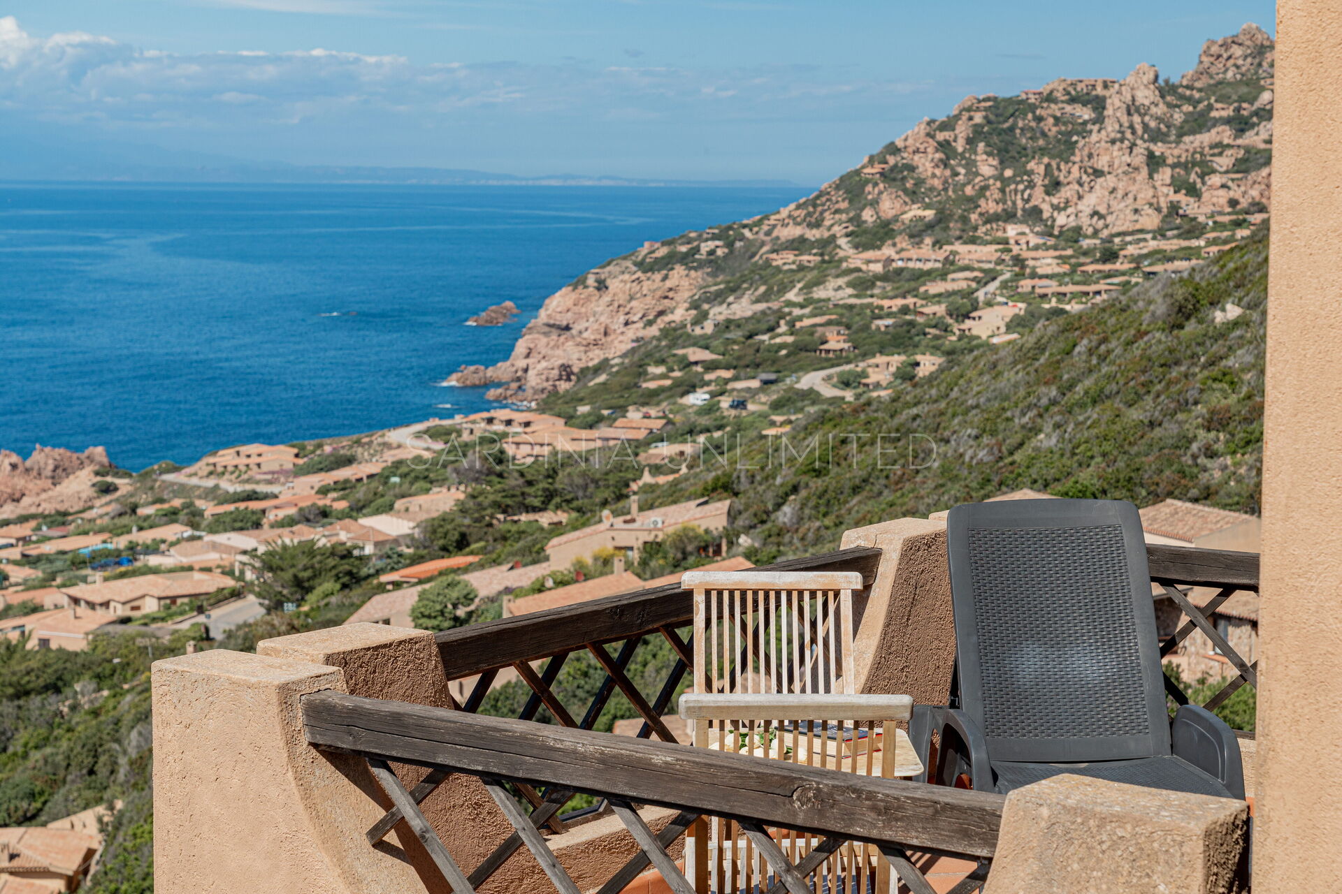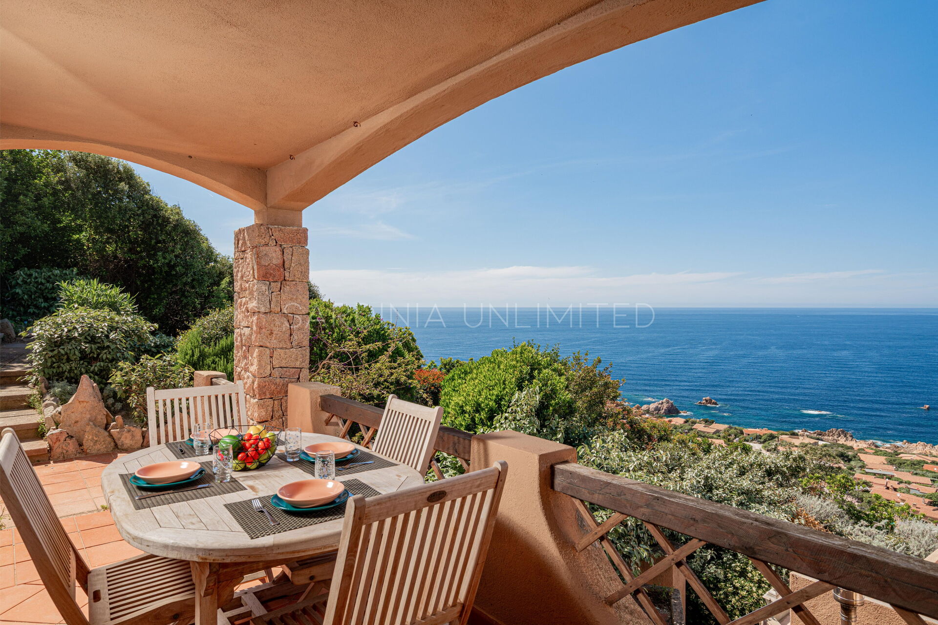 La véranda panoramique est le cœur de la maison : un lieu privilégié pour admirer le contraste entre la mer bleue, les collines verdoyantes et les rochers aux reflets rosés qui caractérisent cette portion de côte. Parfaite pour déjeuner en plein air ou pour profiter de moments de détente à l’ombre, elle offre une atmosphère paisible et silencieuse, immergée dans la nature sauvage et parfumée de la végétation locale. Juste à côté, un coin solarium confortable avec des chaises longues te permet de profiter pleinement de la lumière et de la chaleur méditerranéennes.