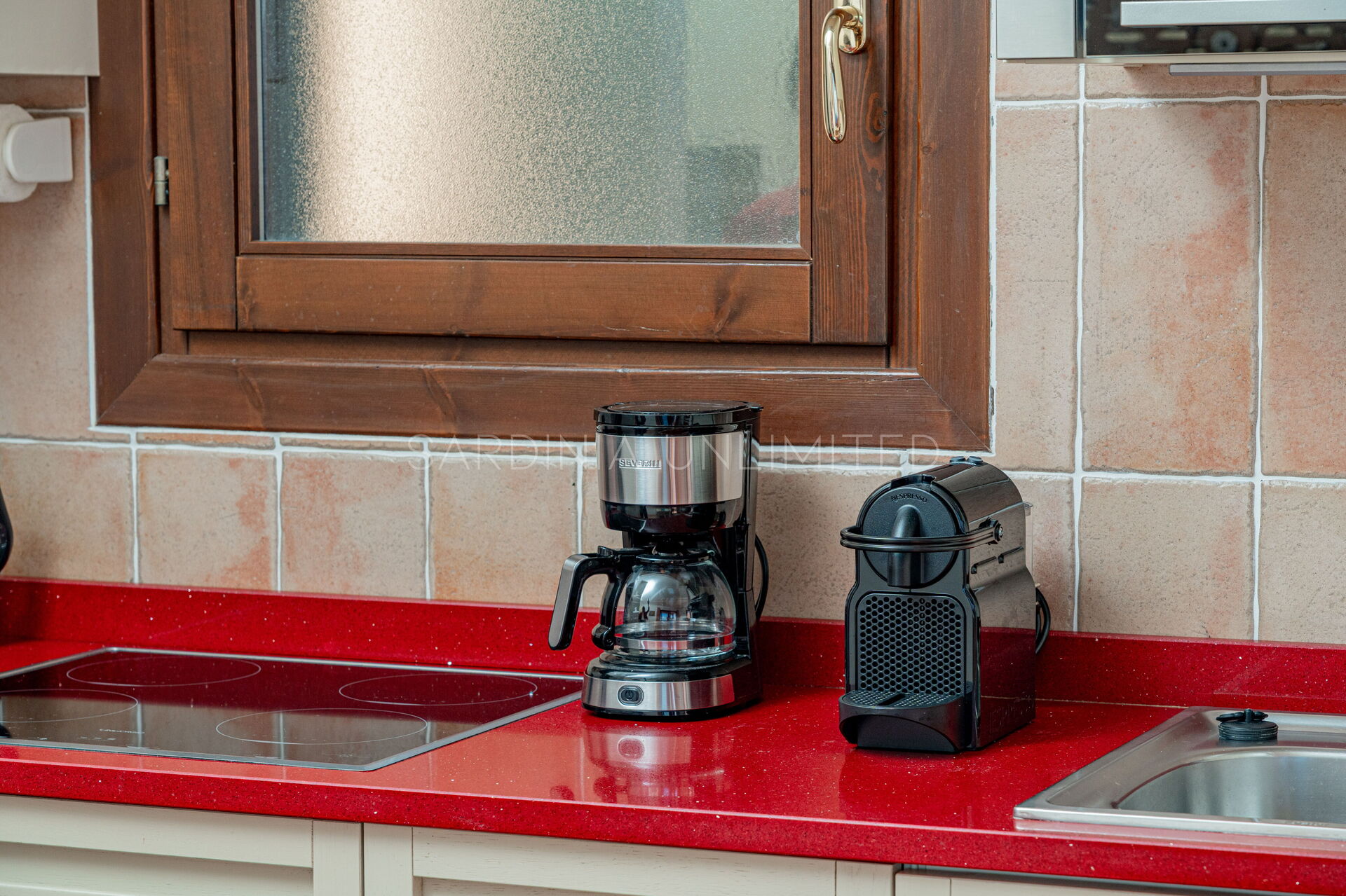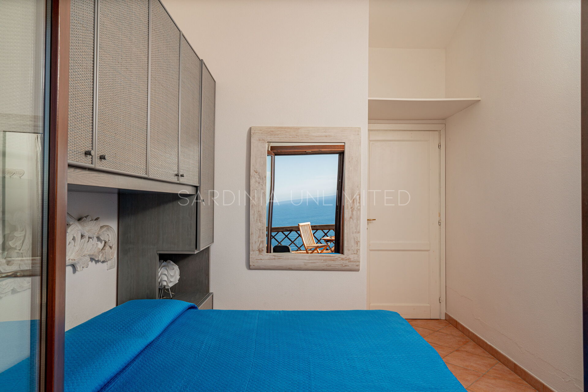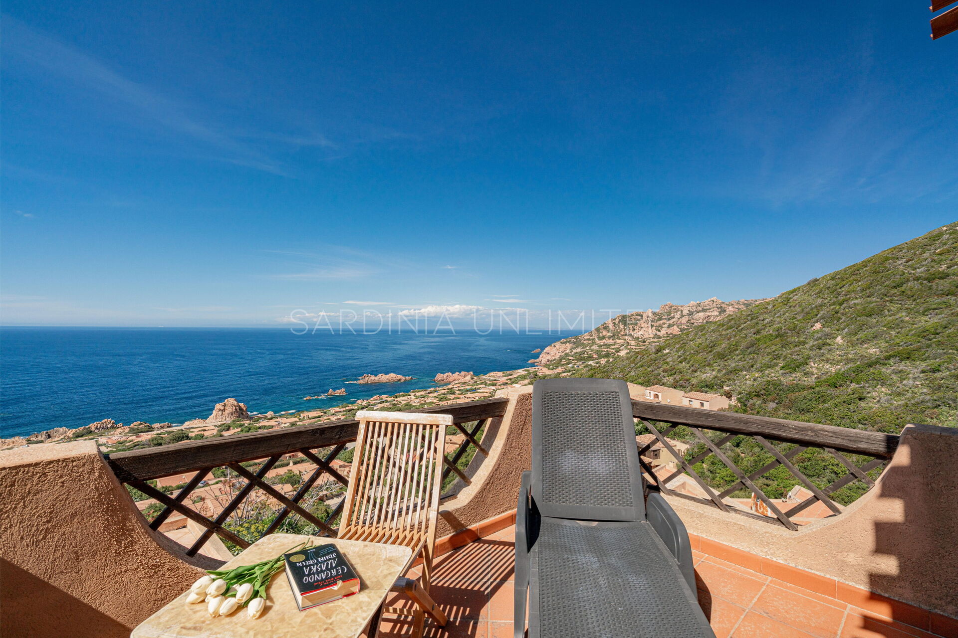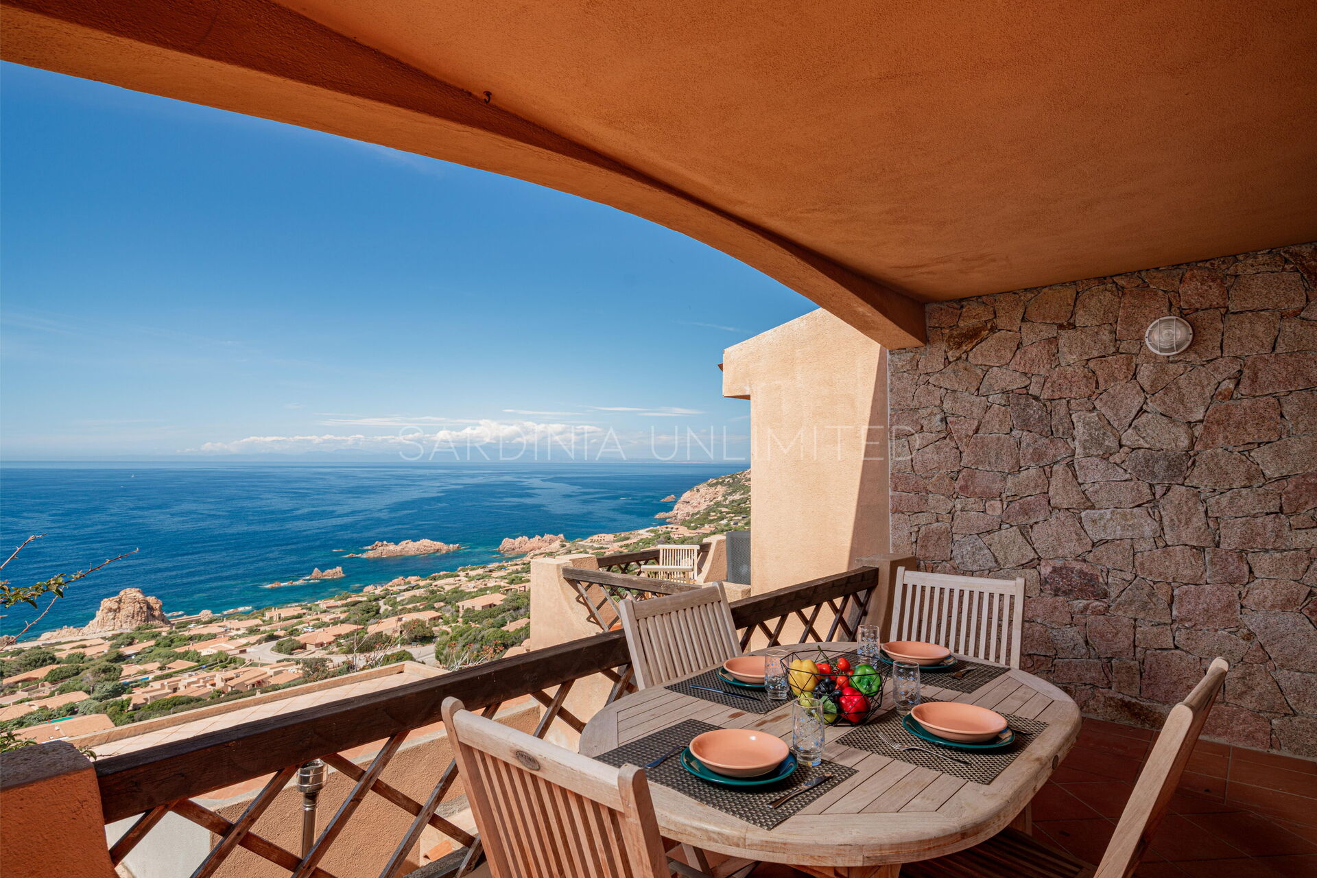 La véranda panoramique est le cœur de la maison : un lieu privilégié pour admirer le contraste entre la mer bleue, les collines verdoyantes et les rochers aux reflets rosés qui caractérisent cette portion de côte. Parfaite pour déjeuner en plein air ou pour profiter de moments de détente à l’ombre, elle offre une atmosphère paisible et silencieuse, immergée dans la nature sauvage et parfumée de la végétation locale. Juste à côté, un coin solarium confortable avec des chaises longues te permet de profiter pleinement de la lumière et de la chaleur méditerranéennes.