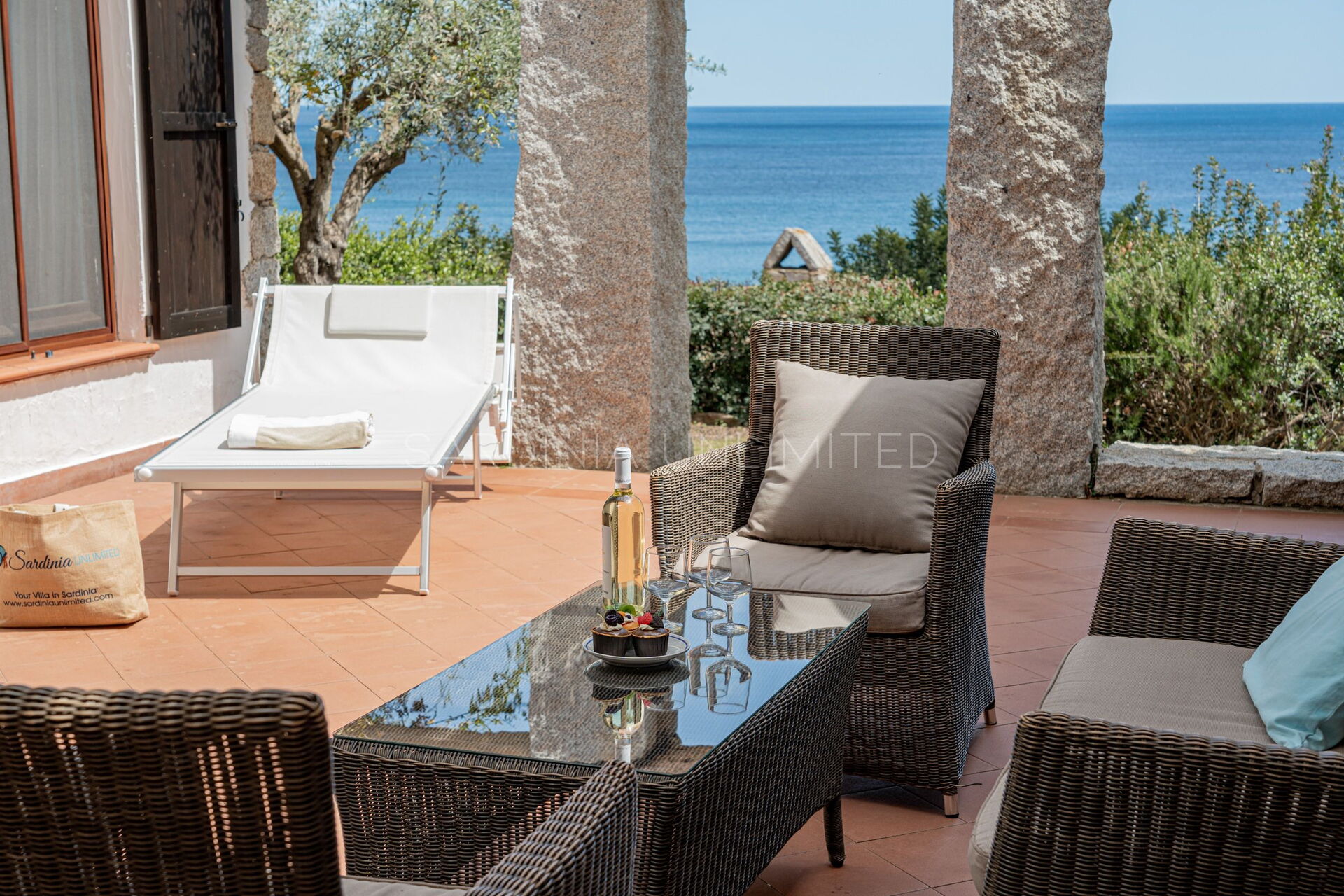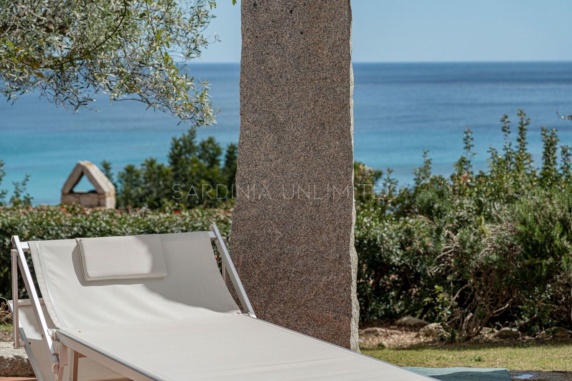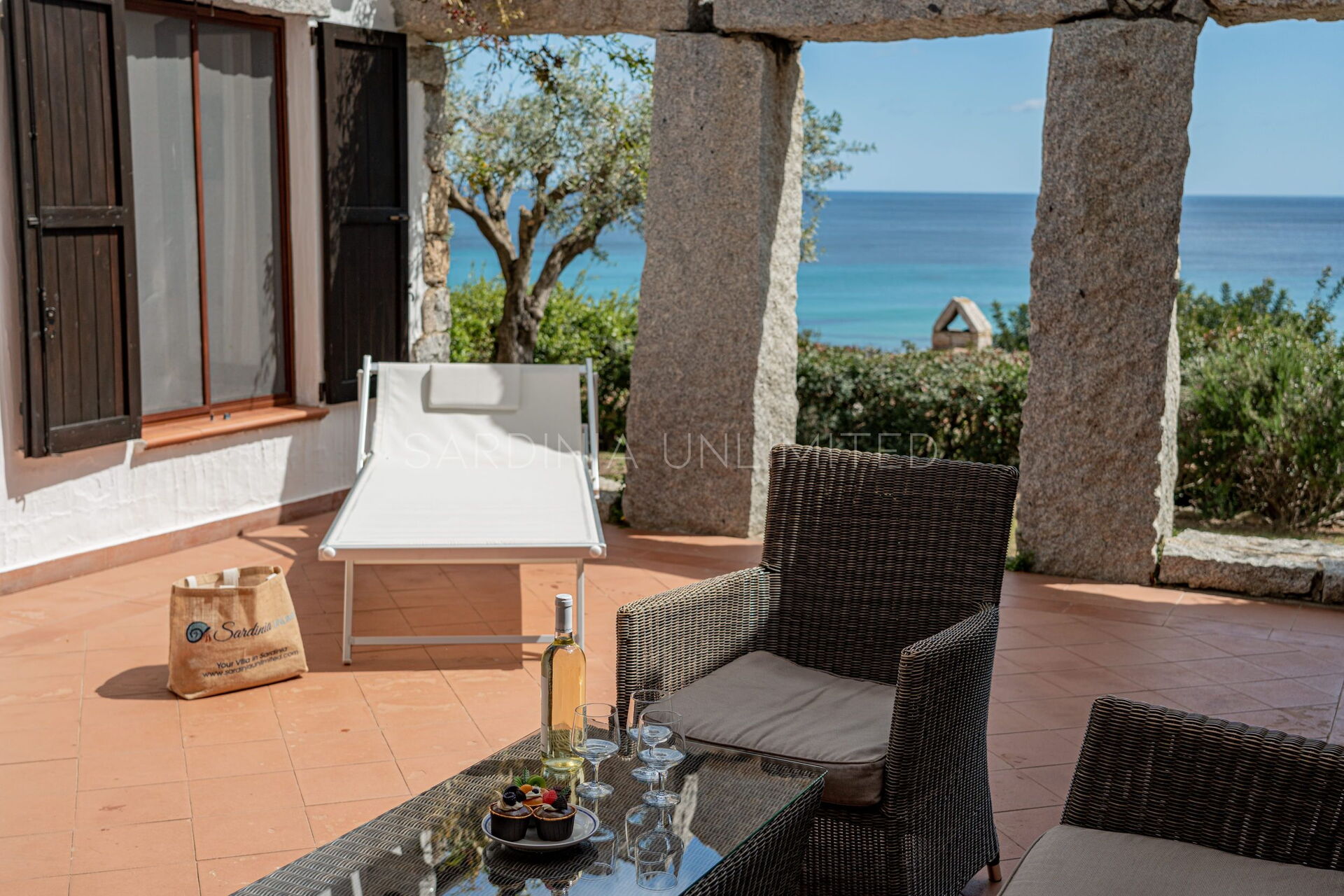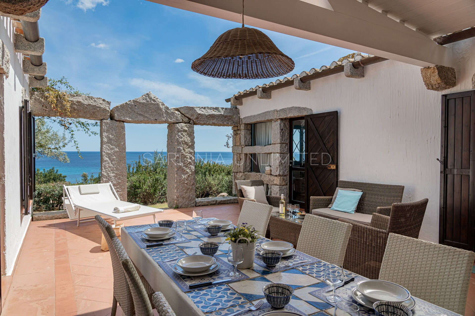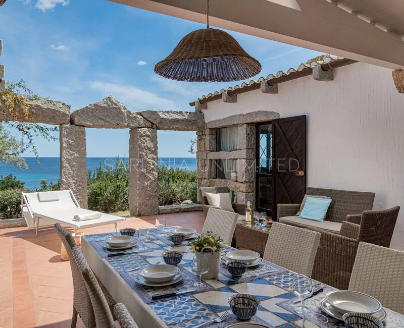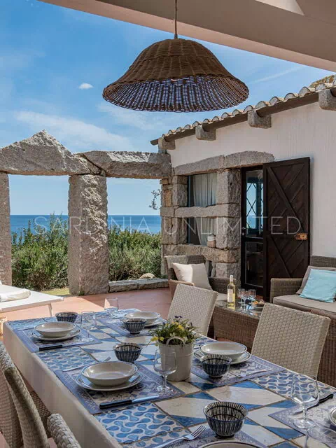 In this Sardinia sea villa it is possible to immerse yourself in this oasis of colors and ancient scents thanks to the large private patio equipped with a table where you can comfortably have lunch outdoors and a solarium area. The patio is bordered by a fascinating monolithic structure that creates a frame for the indigo sea and the greenery of the Mediterranean scrub shrubs.