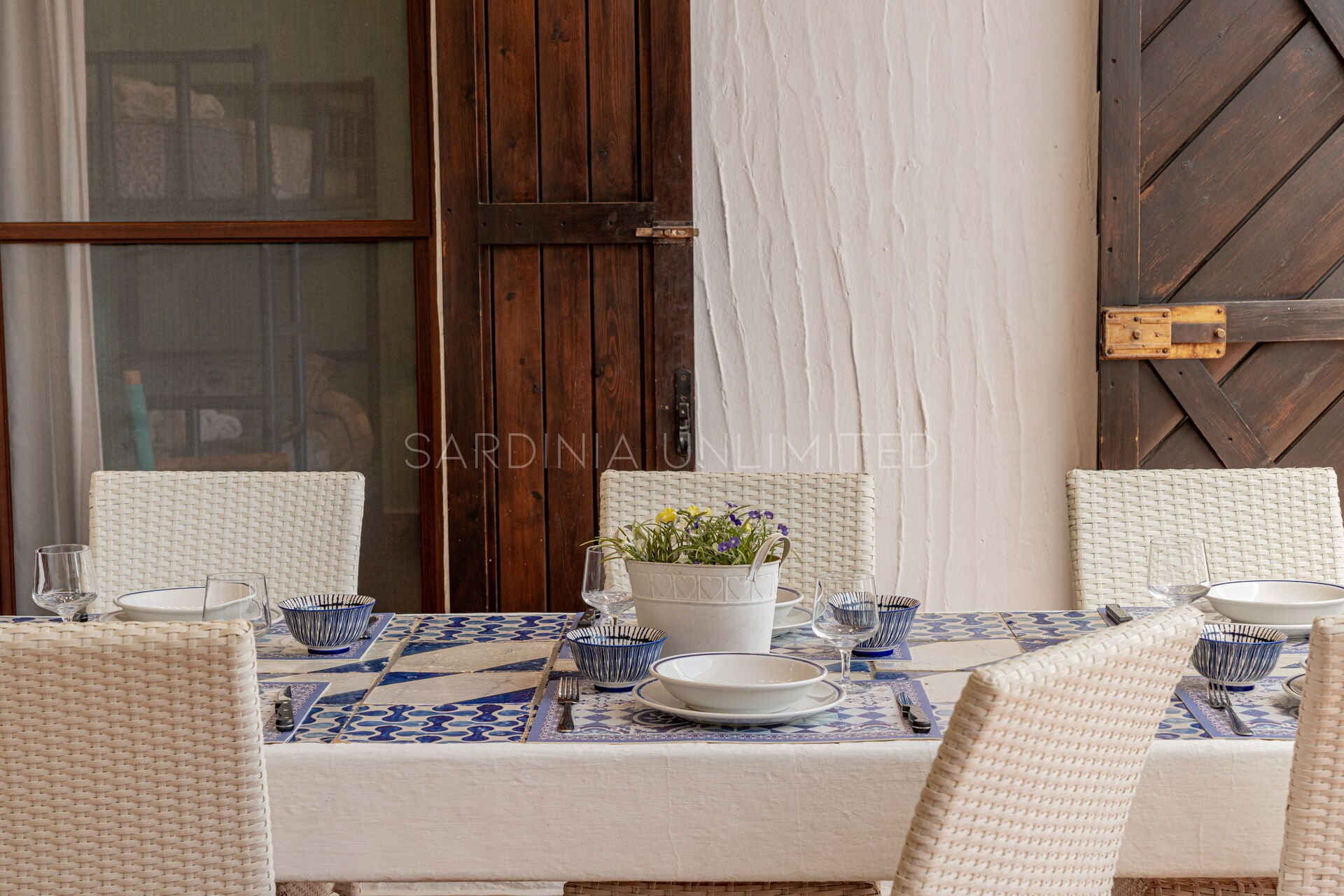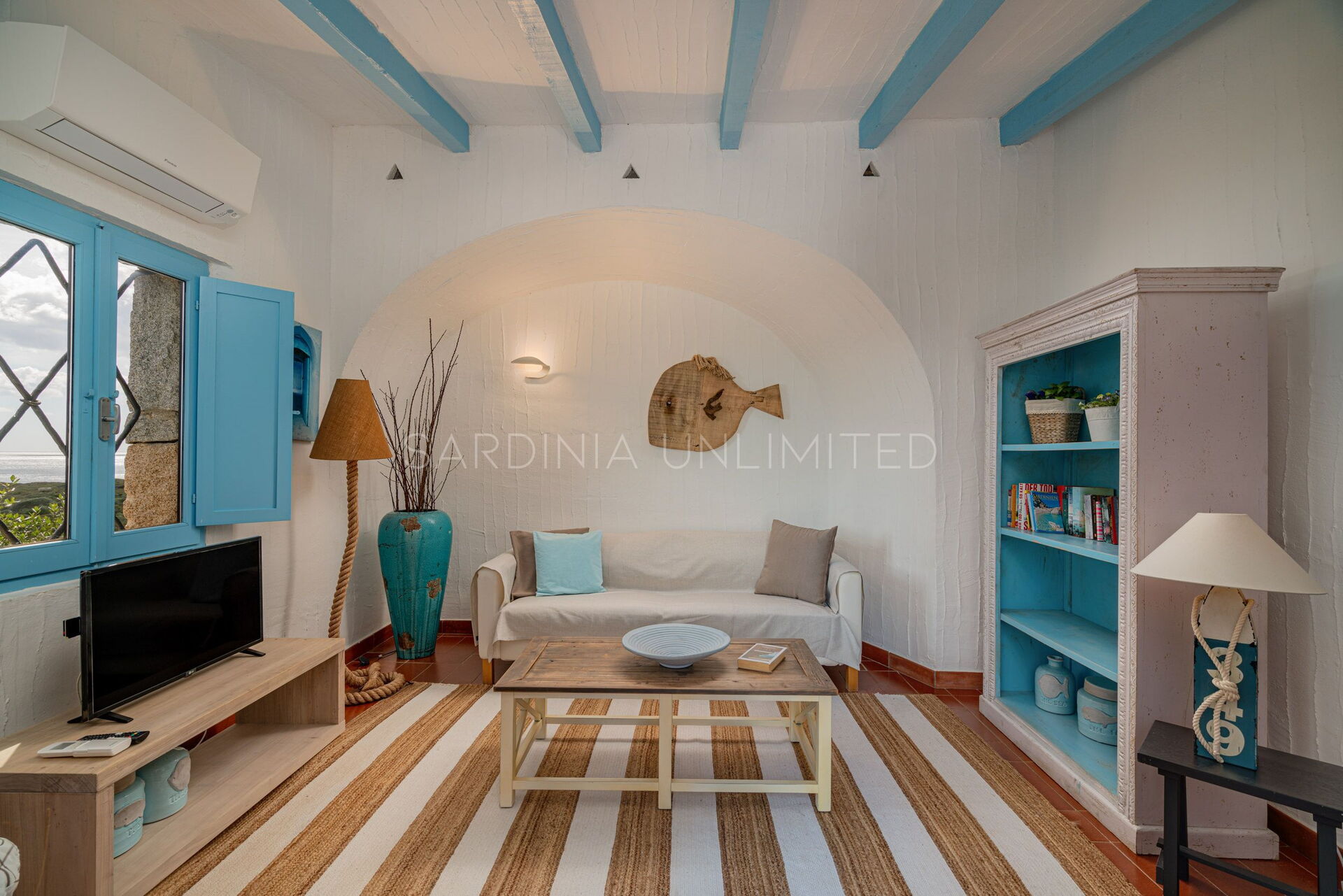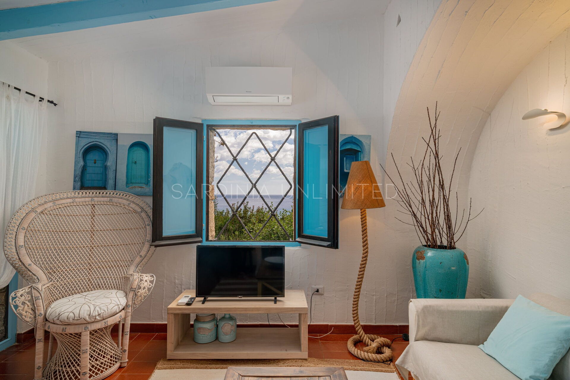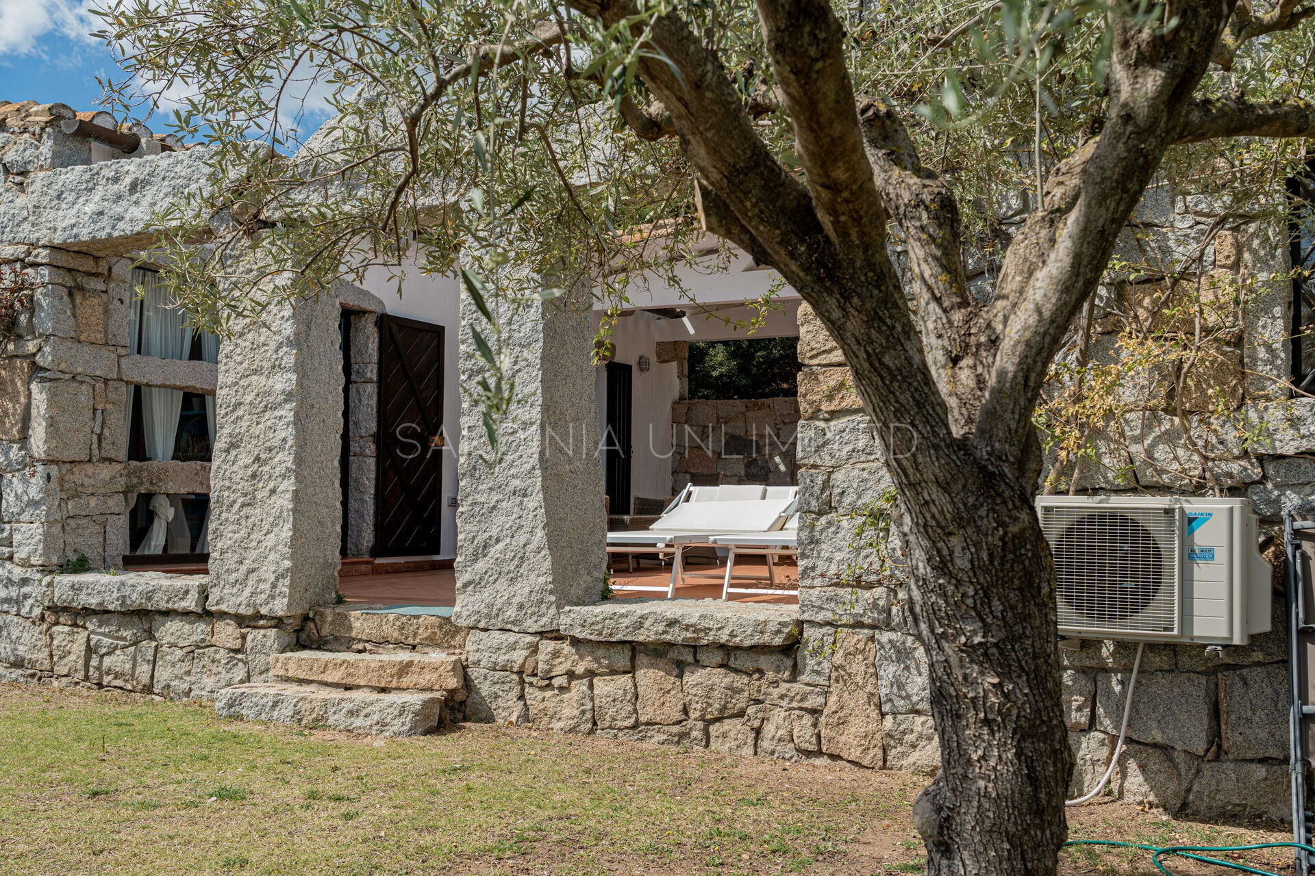 In this Sardinia sea villa it is possible to immerse yourself in this oasis of colors and ancient scents thanks to the large private patio equipped with a table where you can comfortably have lunch outdoors and a solarium area. The patio is bordered by a fascinating monolithic structure that creates a frame for the indigo sea and the greenery of the Mediterranean scrub shrubs.