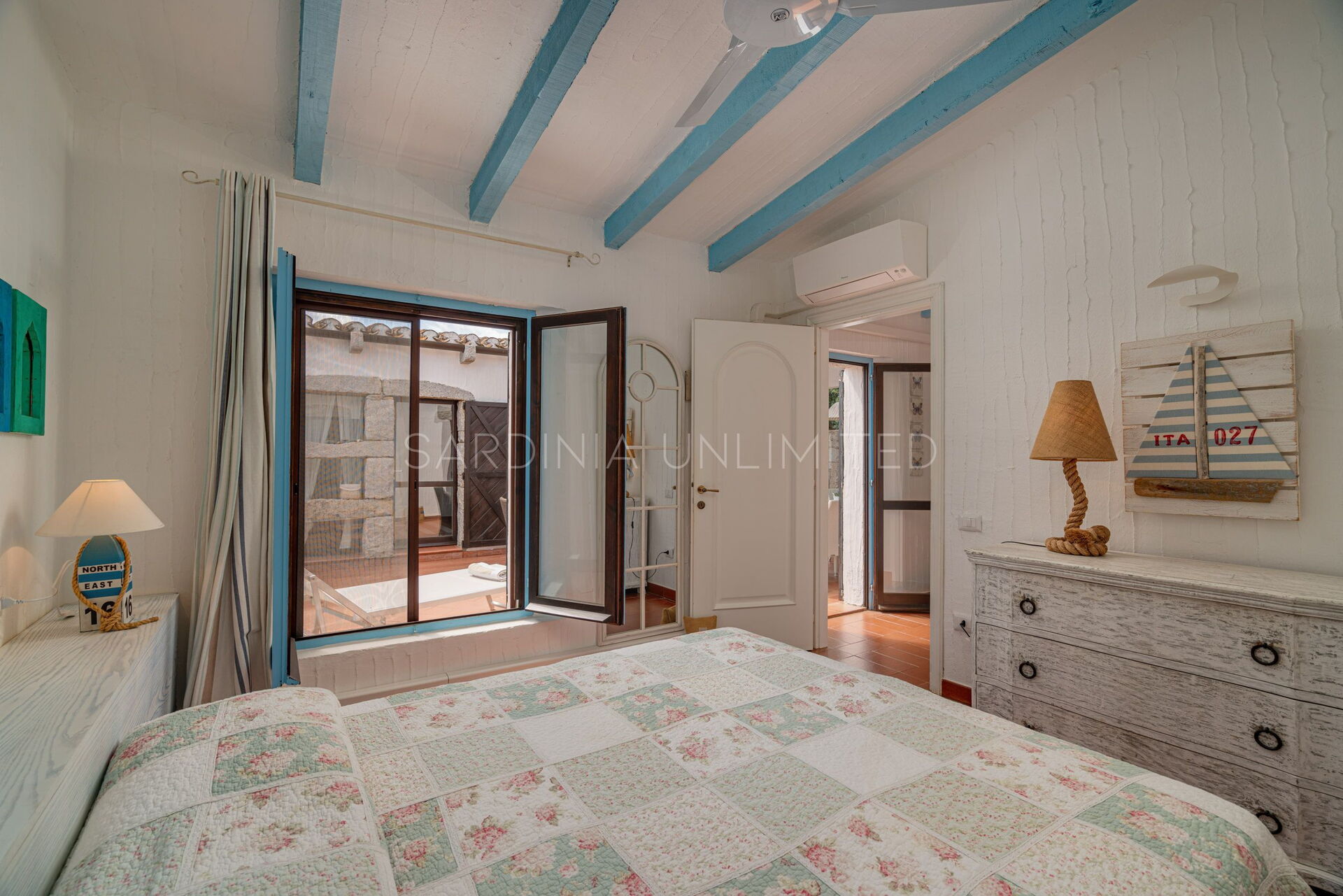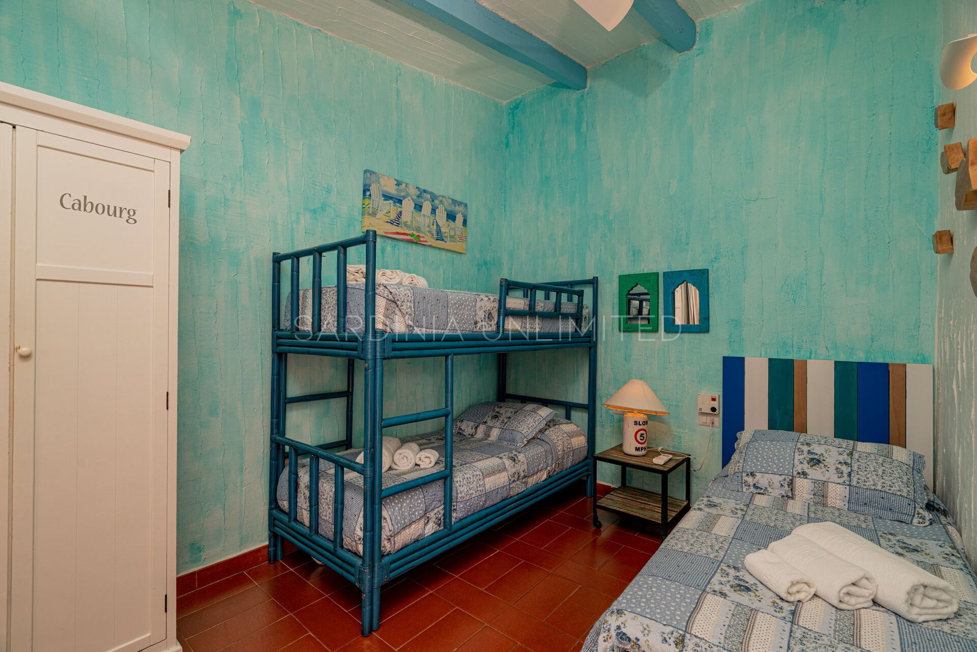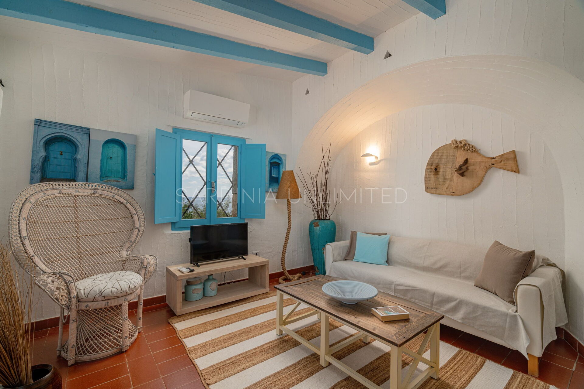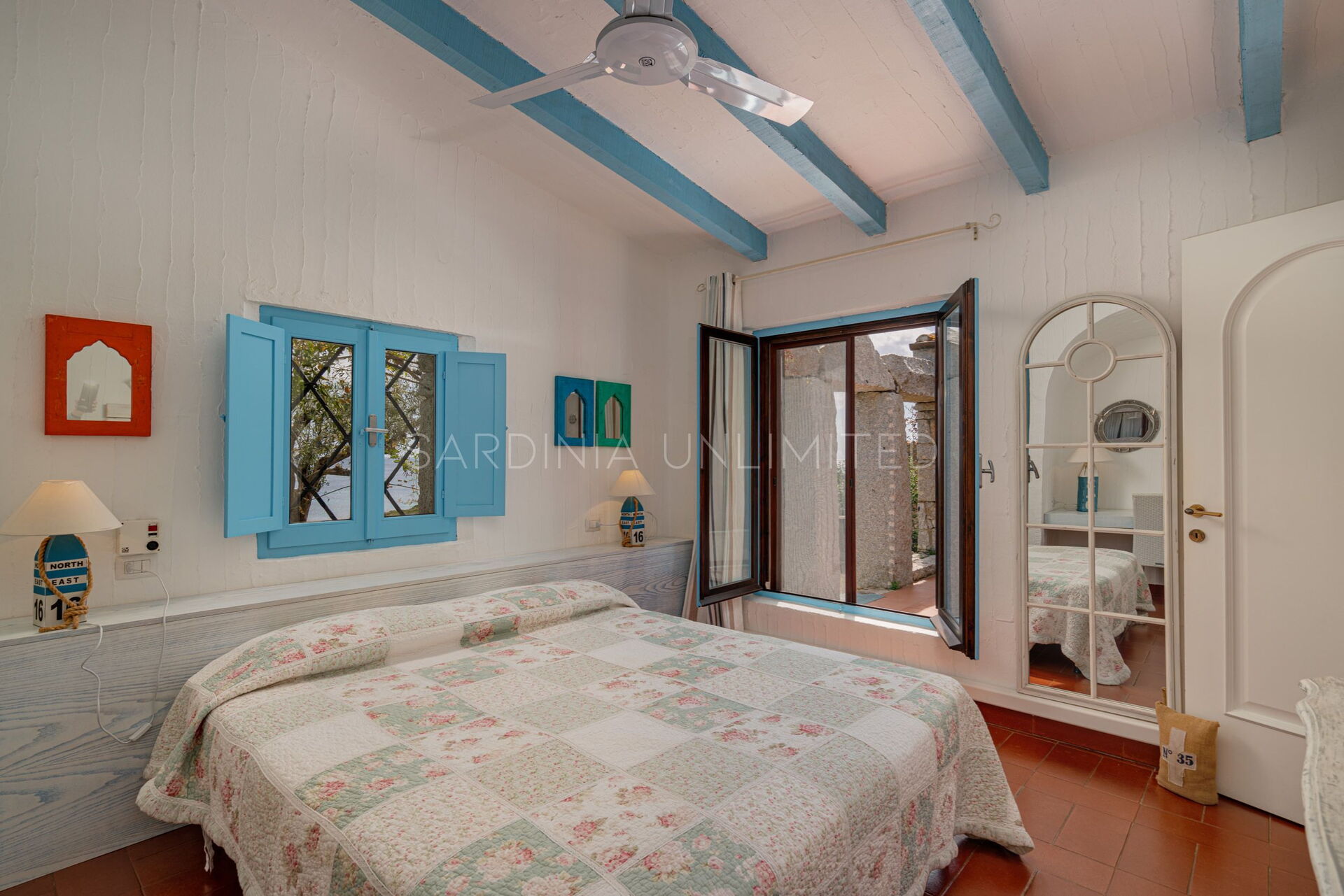 Villa Autumn Amber is a welcoming Sardinia vacation rental suitable for hosting a maximum of 5 guests. The simple furnishings reflect the balance of the surrounding landscape through large white walls from which the bright colors of the exposed beams and decorative elements emerge. At the entrance, a spacious fully equipped kitchen gives way to a comfortable living area with a sofa overlooking the sea. The sleeping area instead consists of a room with a single bed and a bunk bed, and a large and bright double bedroom. Two bathrooms complete the home.