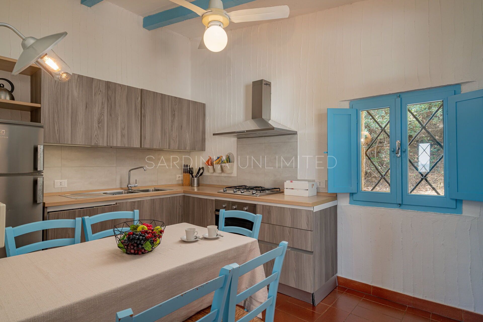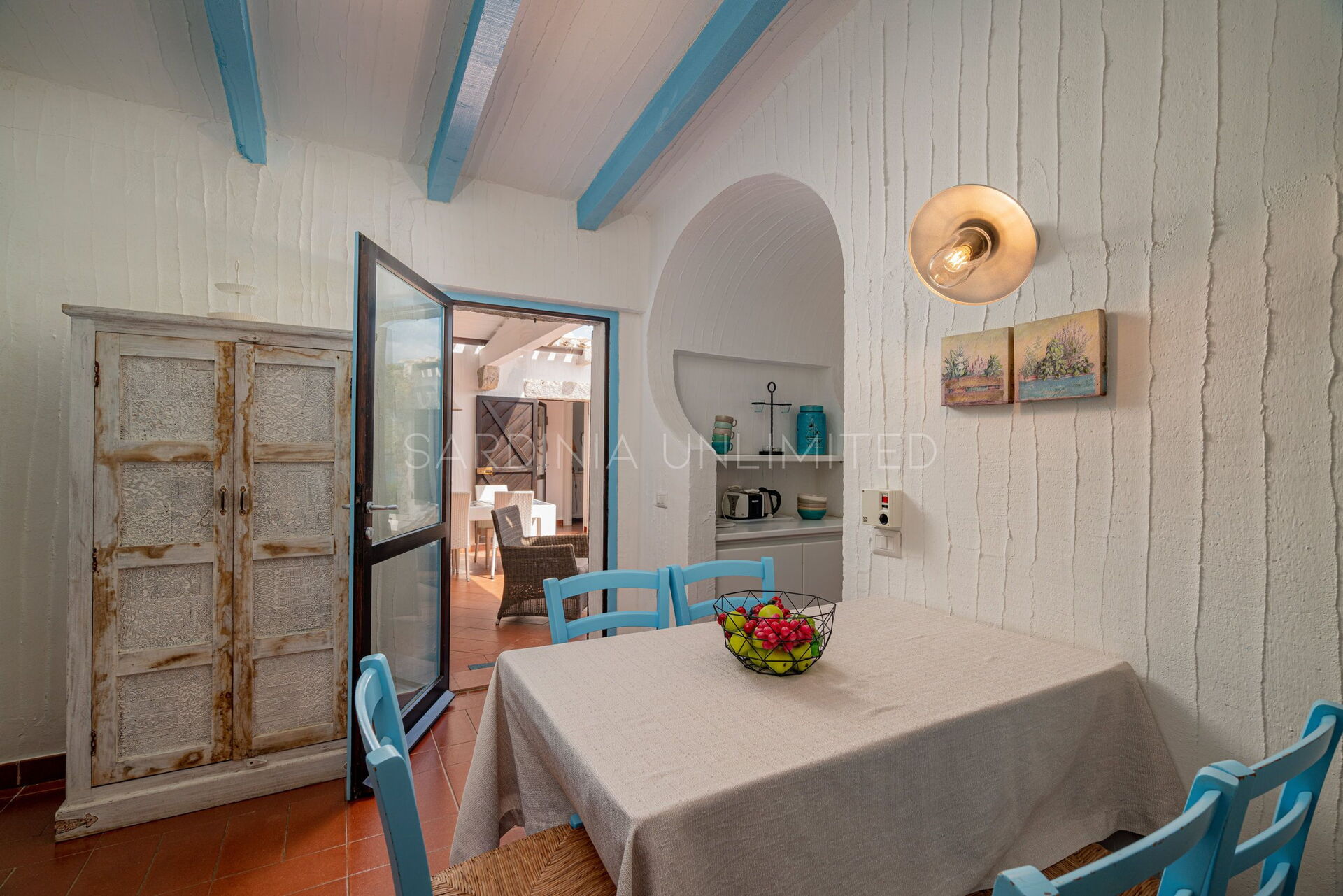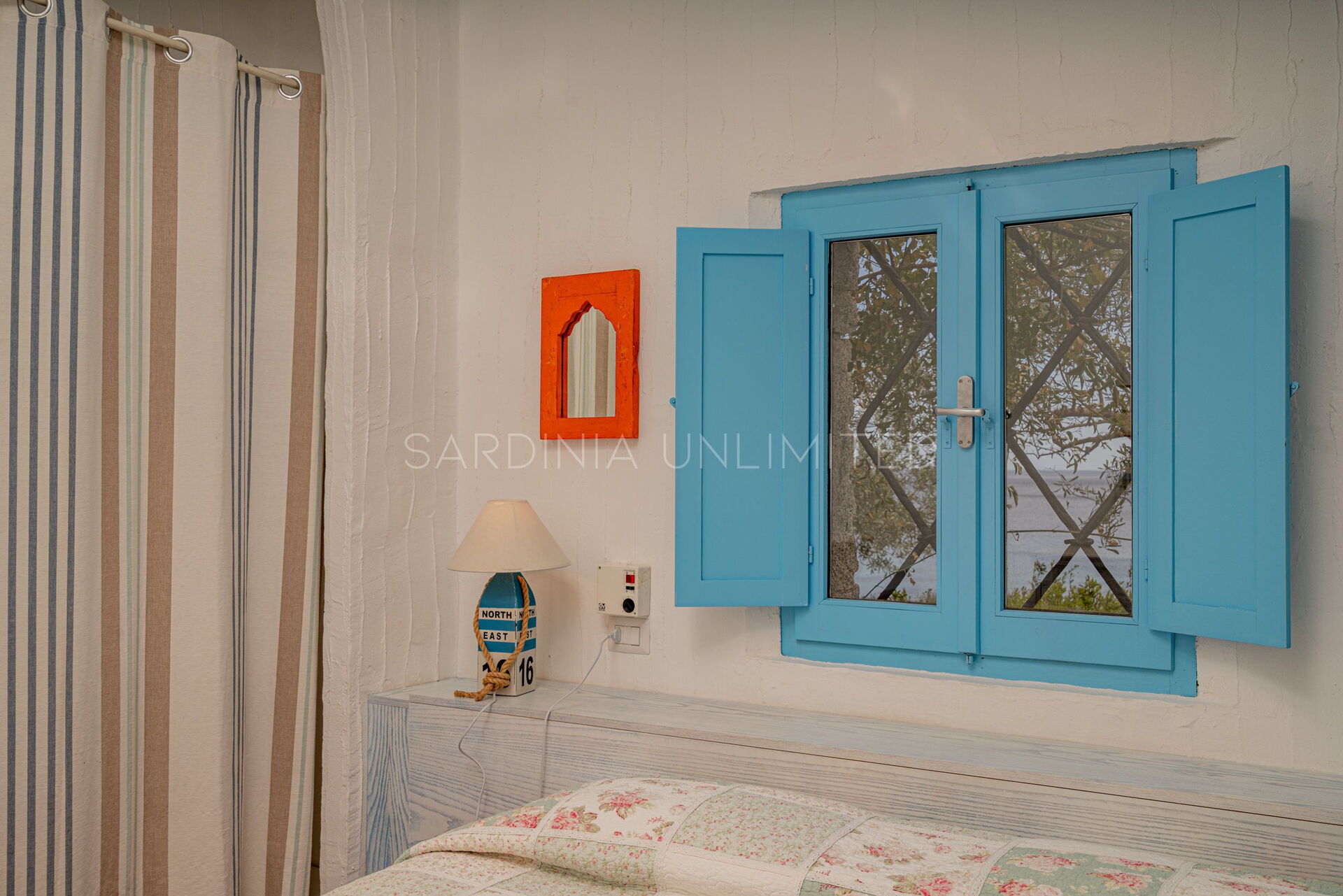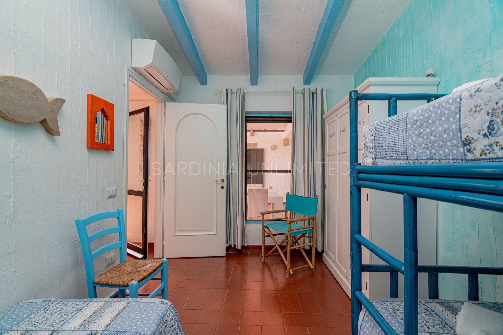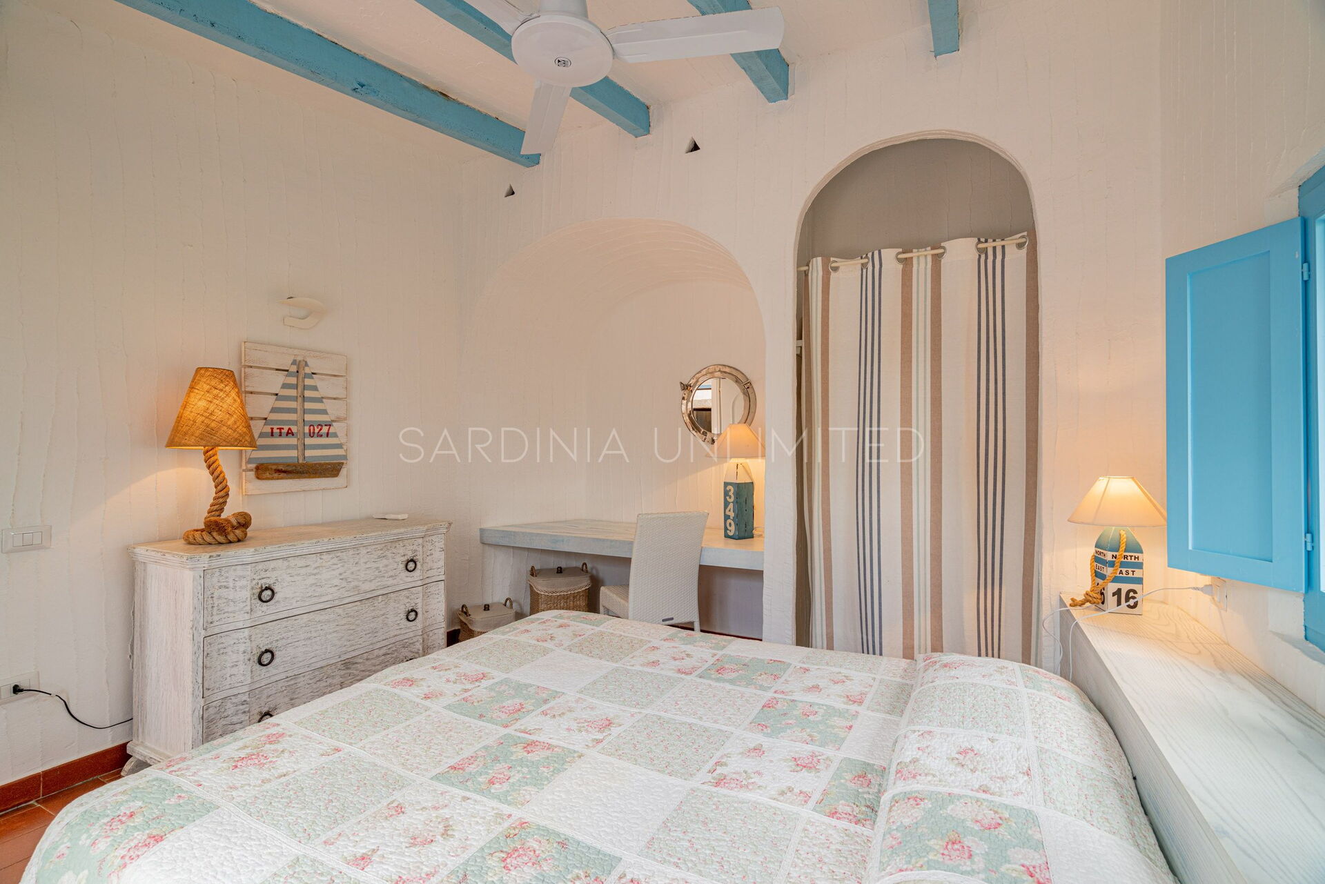 Villa Autumn Amber is a welcoming Sardinia vacation rental suitable for hosting a maximum of 5 guests. The simple furnishings reflect the balance of the surrounding landscape through large white walls from which the bright colors of the exposed beams and decorative elements emerge. At the entrance, a spacious fully equipped kitchen gives way to a comfortable living area with a sofa overlooking the sea. The sleeping area instead consists of a room with a single bed and a bunk bed, and a large and bright double bedroom. Two bathrooms complete the home.