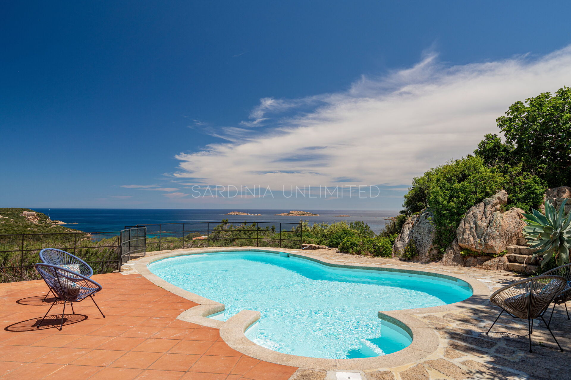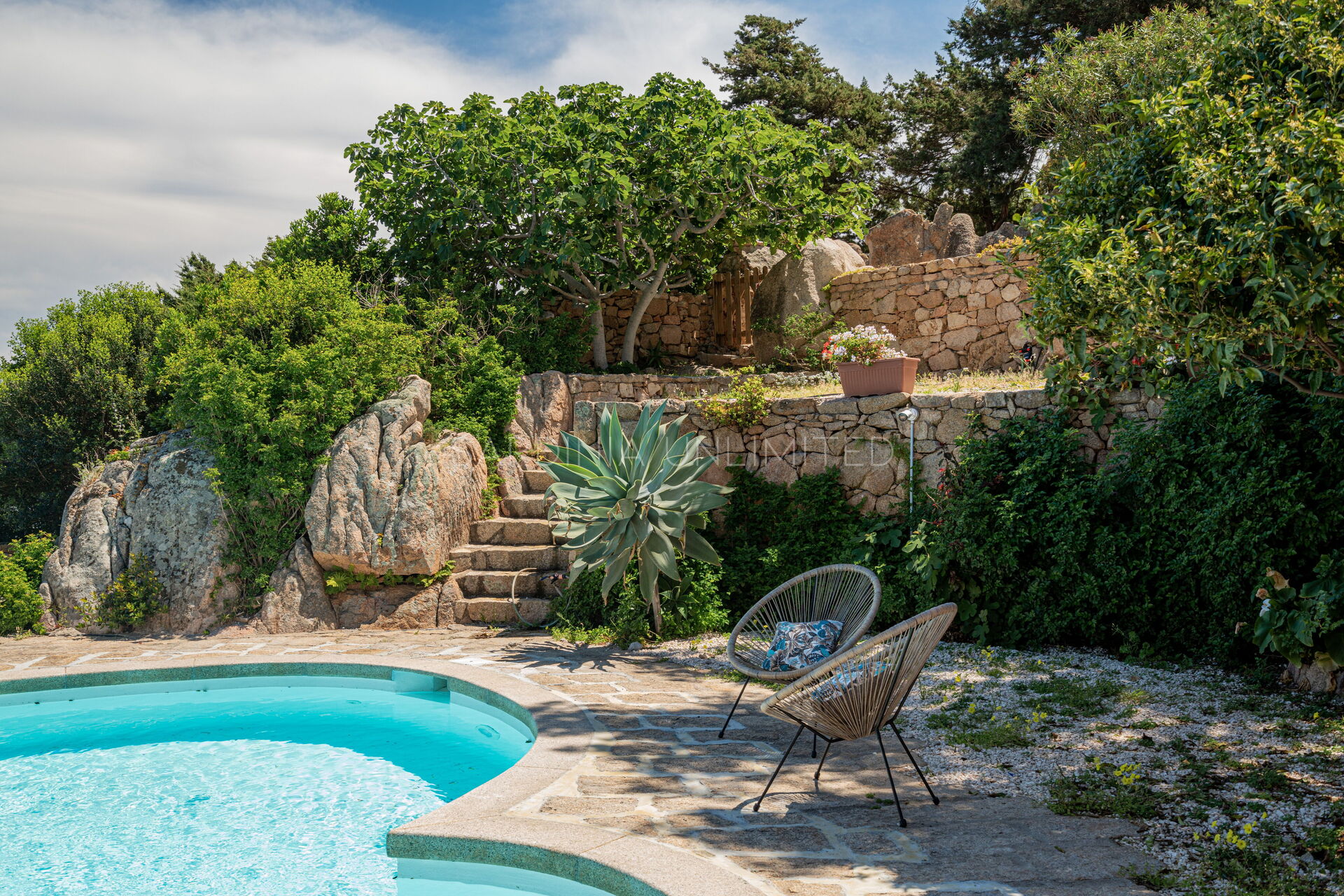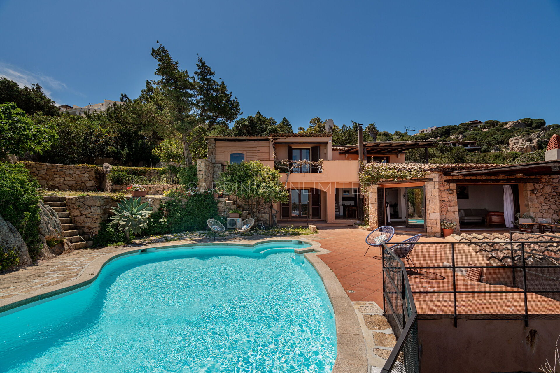 Pour admirer et profiter de ce spectacle de couleurs et de parfums, cette villa à Porto Cervo est équipée d'une véranda très spacieuse avec une table où prendre confortablement ses repas en plein air. En plus de la véranda, le vaste espace extérieur se compose d'un coin salon (zone lounge) et, sur la droite, d'une fantastique piscine de forme irrégulière avec un espace transats et une vue panoramique.