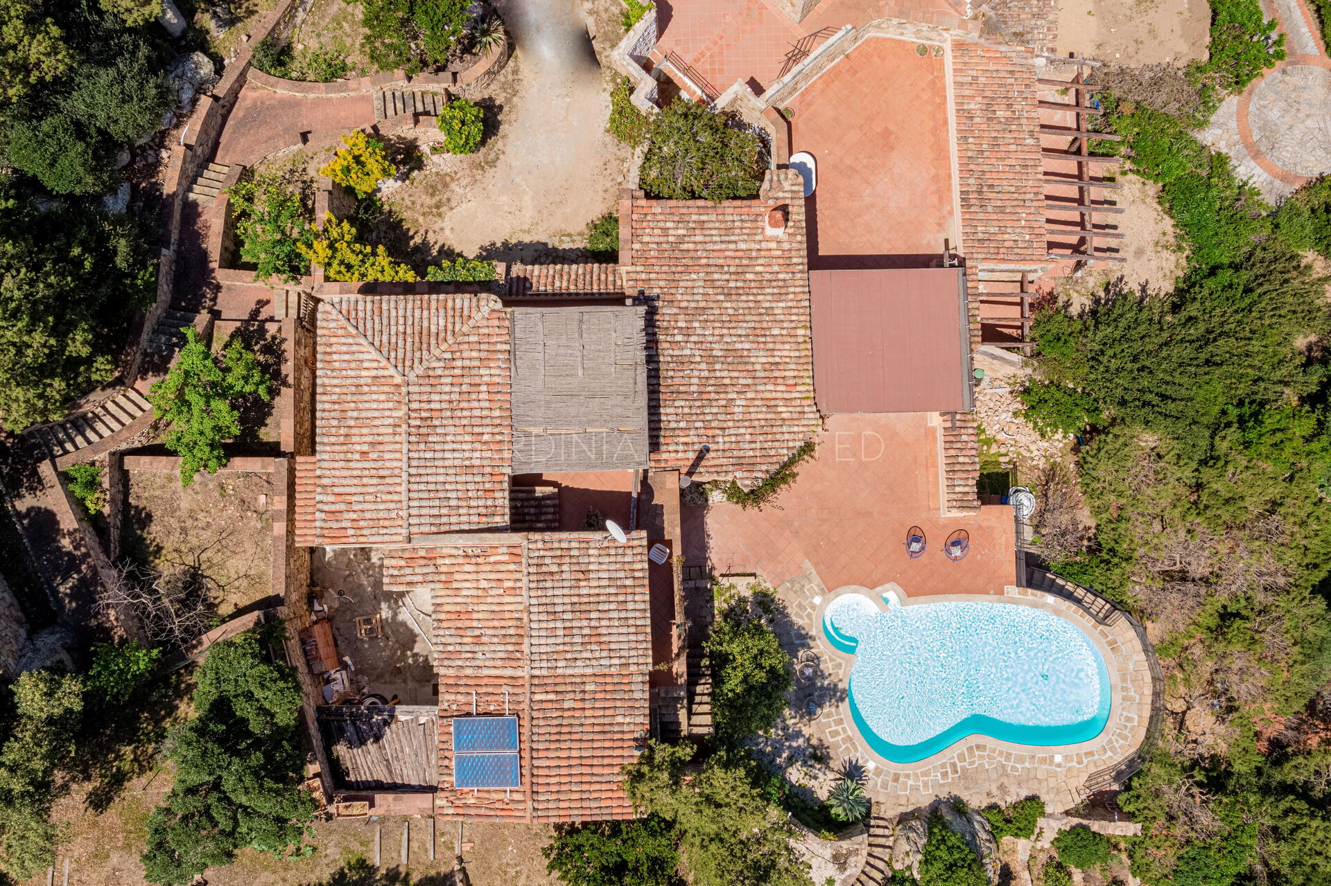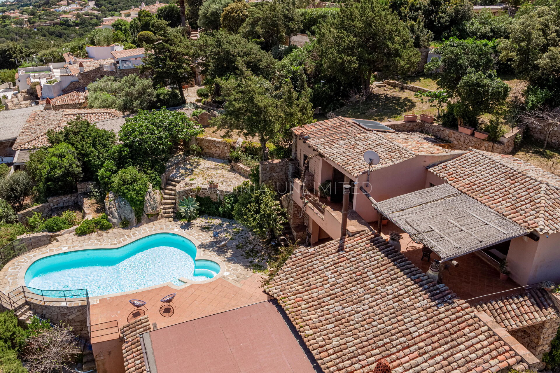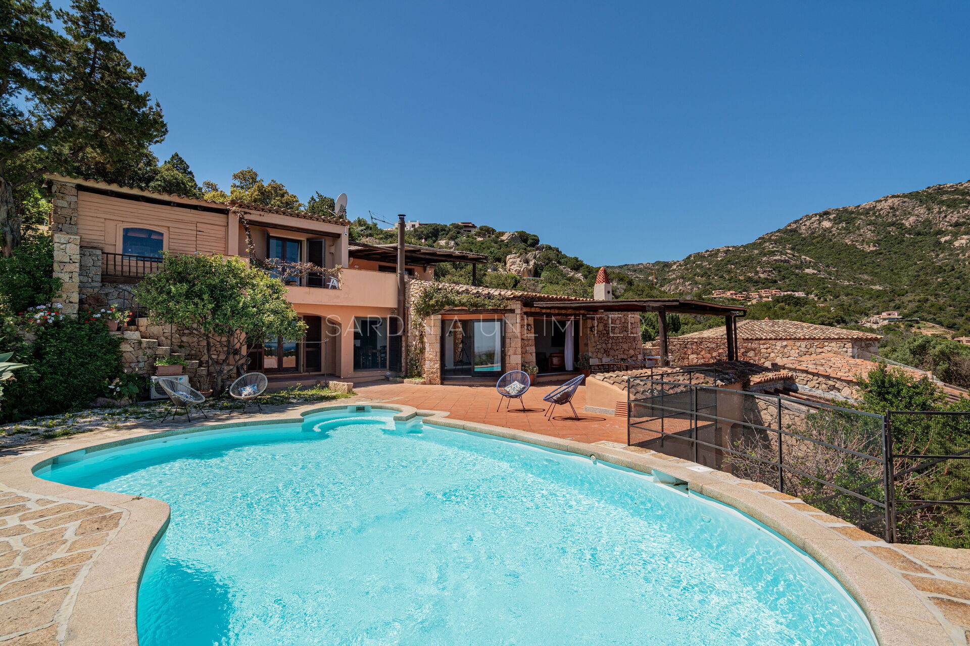 Pour admirer et profiter de ce spectacle de couleurs et de parfums, cette villa à Porto Cervo est équipée d'une véranda très spacieuse avec une table où prendre confortablement ses repas en plein air. En plus de la véranda, le vaste espace extérieur se compose d'un coin salon (zone lounge) et, sur la droite, d'une fantastique piscine de forme irrégulière avec un espace transats et une vue panoramique.