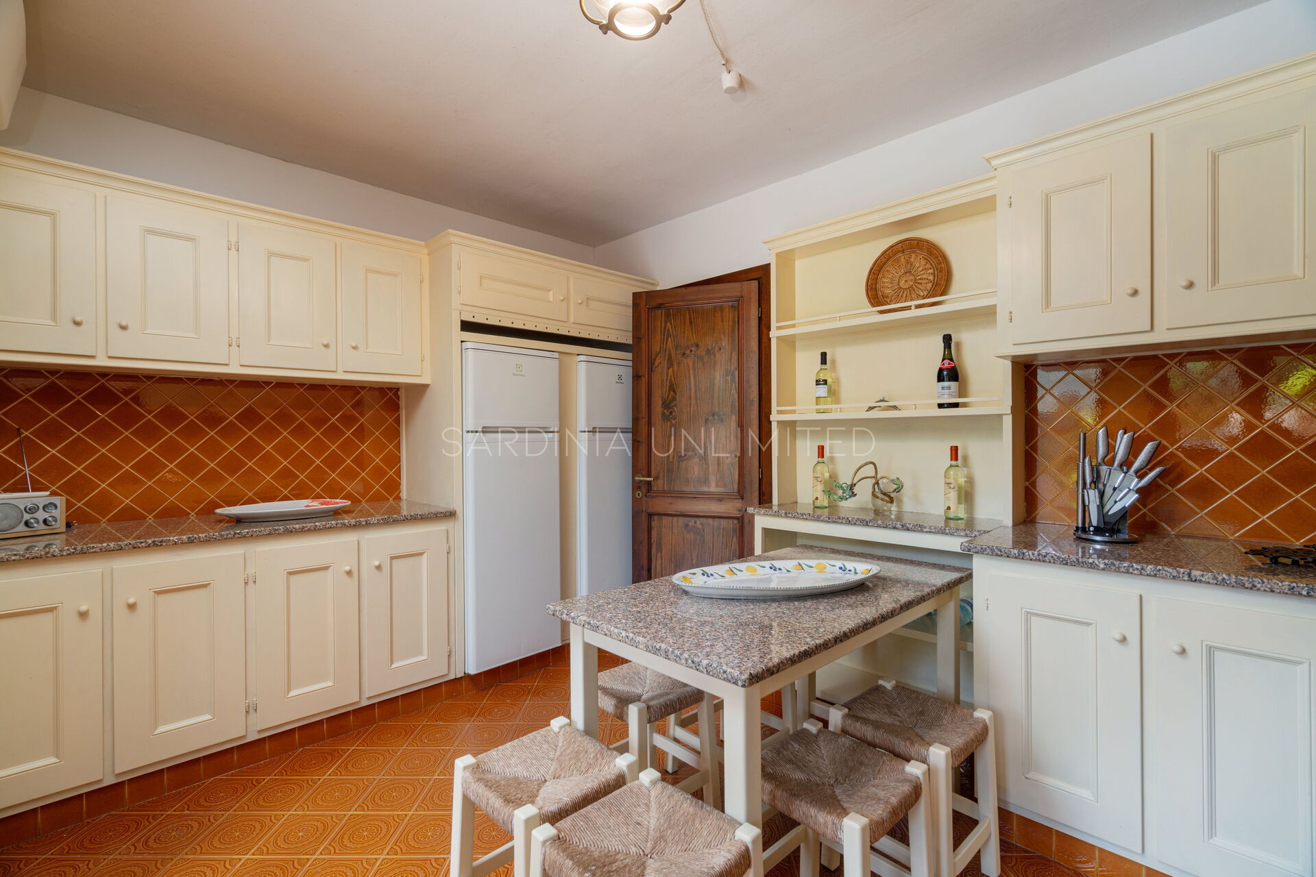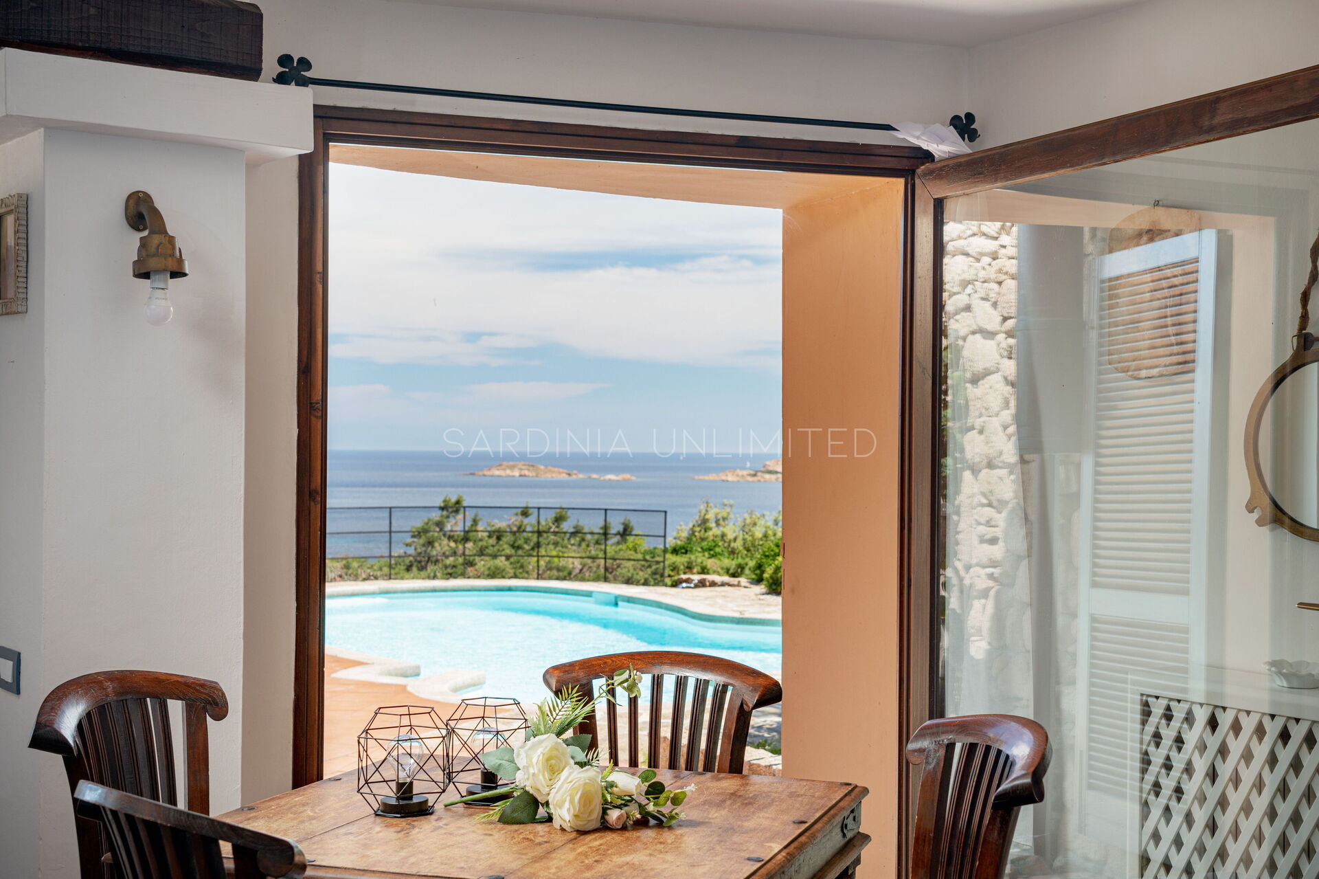 Villa Cercueil est une villa à louer en Sardaigne construite sur deux niveaux. Au rez-de-chaussée se trouve un vaste et lumineux espace ouvert (open space) composé d'un salon avec une cheminée en pierre et d'une salle à manger. Cet espace, entièrement de style classique, est caractérisé par l'omniprésence du blanc typique du style méditerranéen, qui contraste harmonieusement avec les tonalités sombres du bois présentes dans les éléments essentiels de la maison, comme les poutres du plafond et les linteaux qui séparent les différentes pièces.