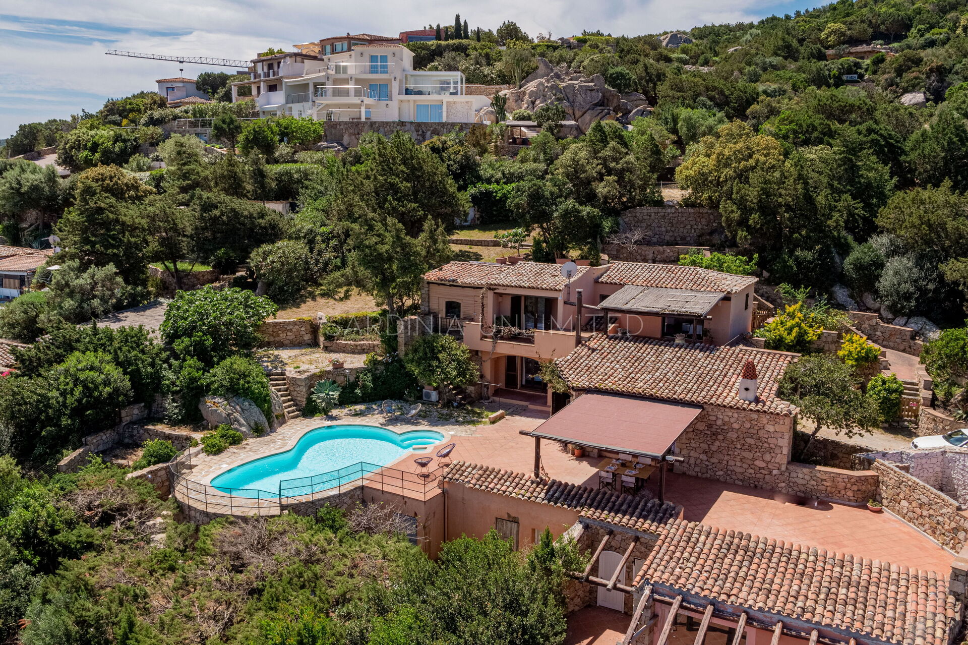 Harmonieusement nichée sur la colline de Pantogia se trouve la villa Cercueil, un fantastique exemple de villa de l'architecte Couëlle. Il a contribué à l'invention du style typique de la Costa Smeralda et à son édification, et il est également l'auteur d'œuvres emblématiques de ce lieu comme l'hôtel Cala di Volpe et de nombreuses résidences de luxe.