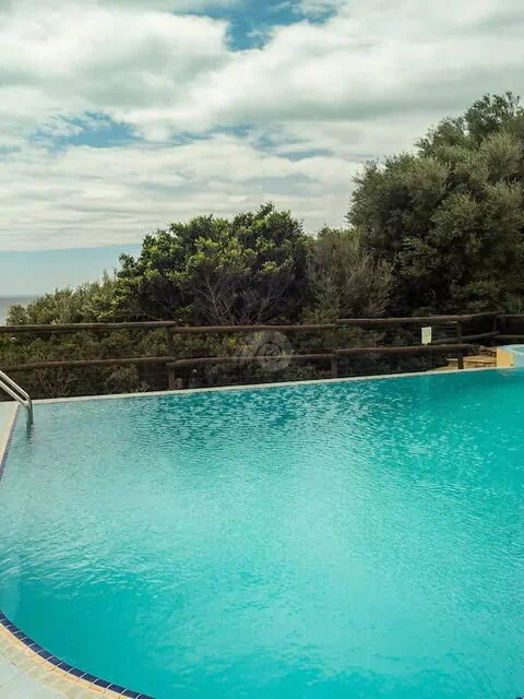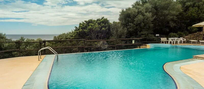 Sur la partie avant de la villa se trouve une véranda couverte, aménagée avec table et chaises, idéale pour prendre les repas en plein air. Juste en face, on trouve la magnifique piscine à débordement, de forme irrégulière, entourée d'un espace de détente équipé de chaises longues où il est possible de profiter du calme, immergé dans les senteurs du maquis méditerranéen et d'admirer les merveilleux couchers de soleil estivaux sur la mer.