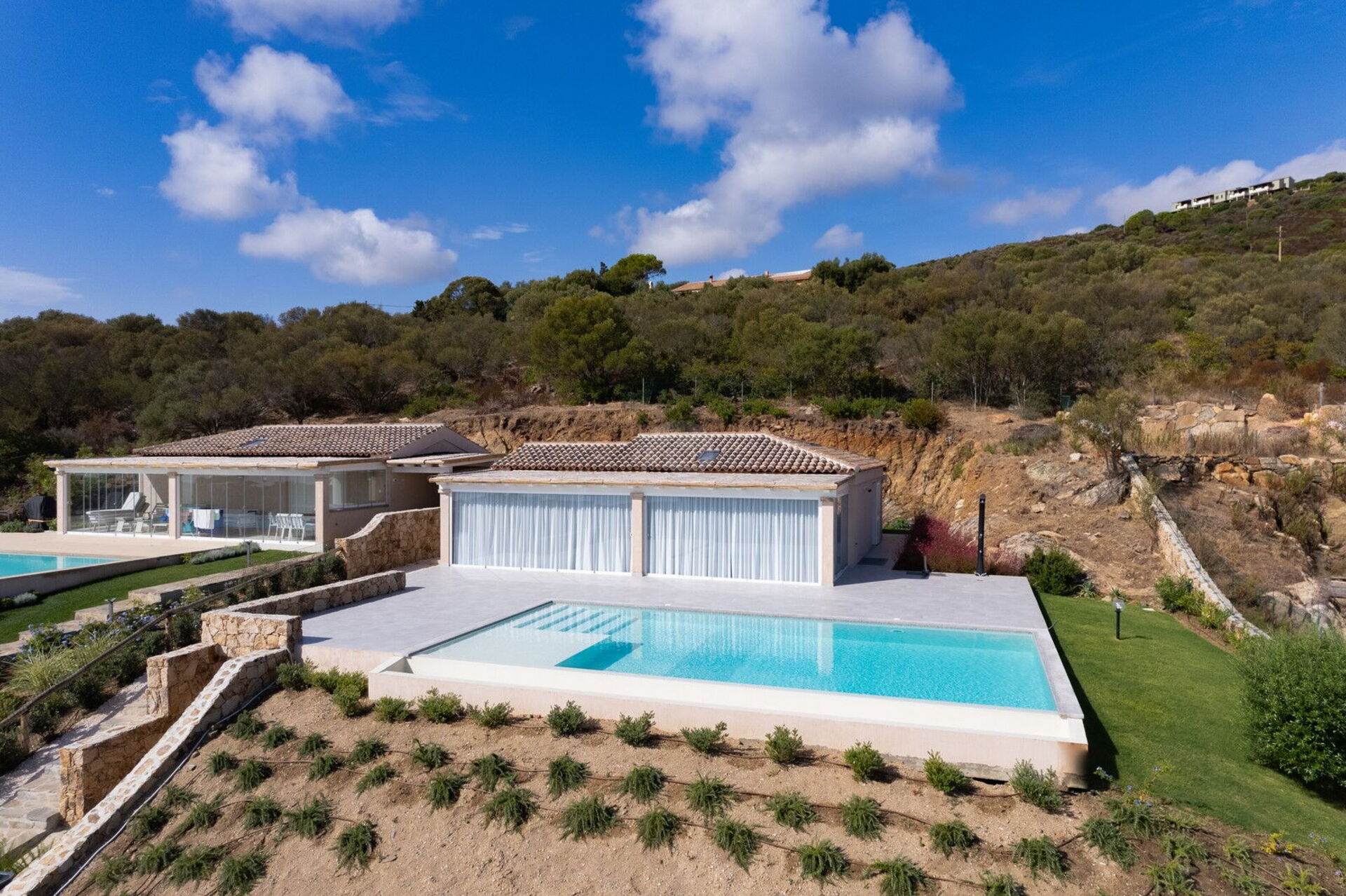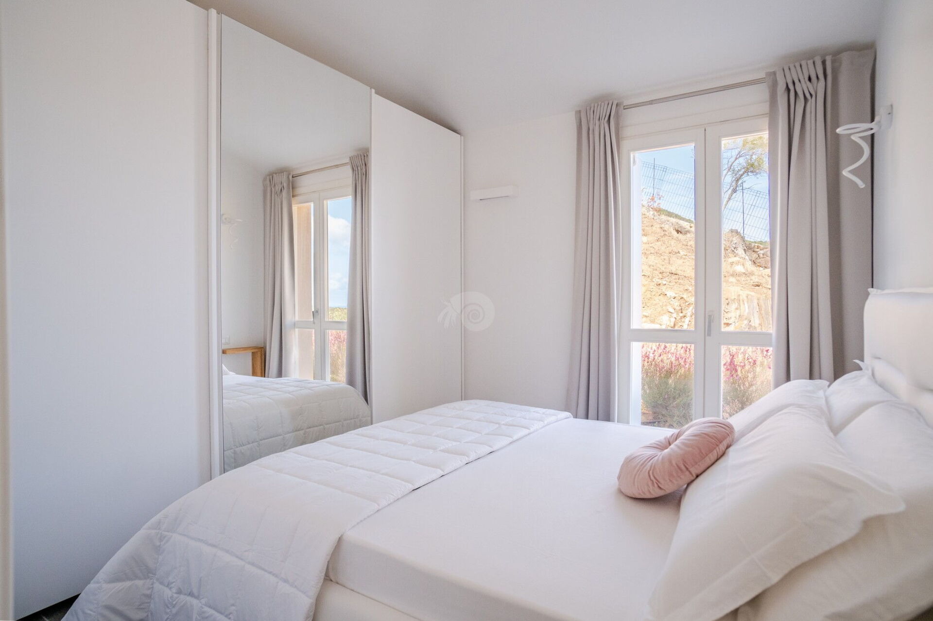 Villa Kalli Bloom è una villa di lusso in Sardegna arredata con raffinatezza. Nelle due camere matrimoniali, ciascuna con bagno en-suite, la nobiltà del bianco si fonde perfettamente con la ricercatezza del legno e dei dettagli che risultano ancora più iridescenti dal contrasto con la policromia dello sfondo mediterraneo. Lo stesso candore caratterizza sia la spaziosa cucina panoramica che si affaccia sulla piscina privata, che l’ampio living room dall’arredamento equilibrato e temperato che, nell’insieme, conferiscono all’ambiente un’armonia sublime.