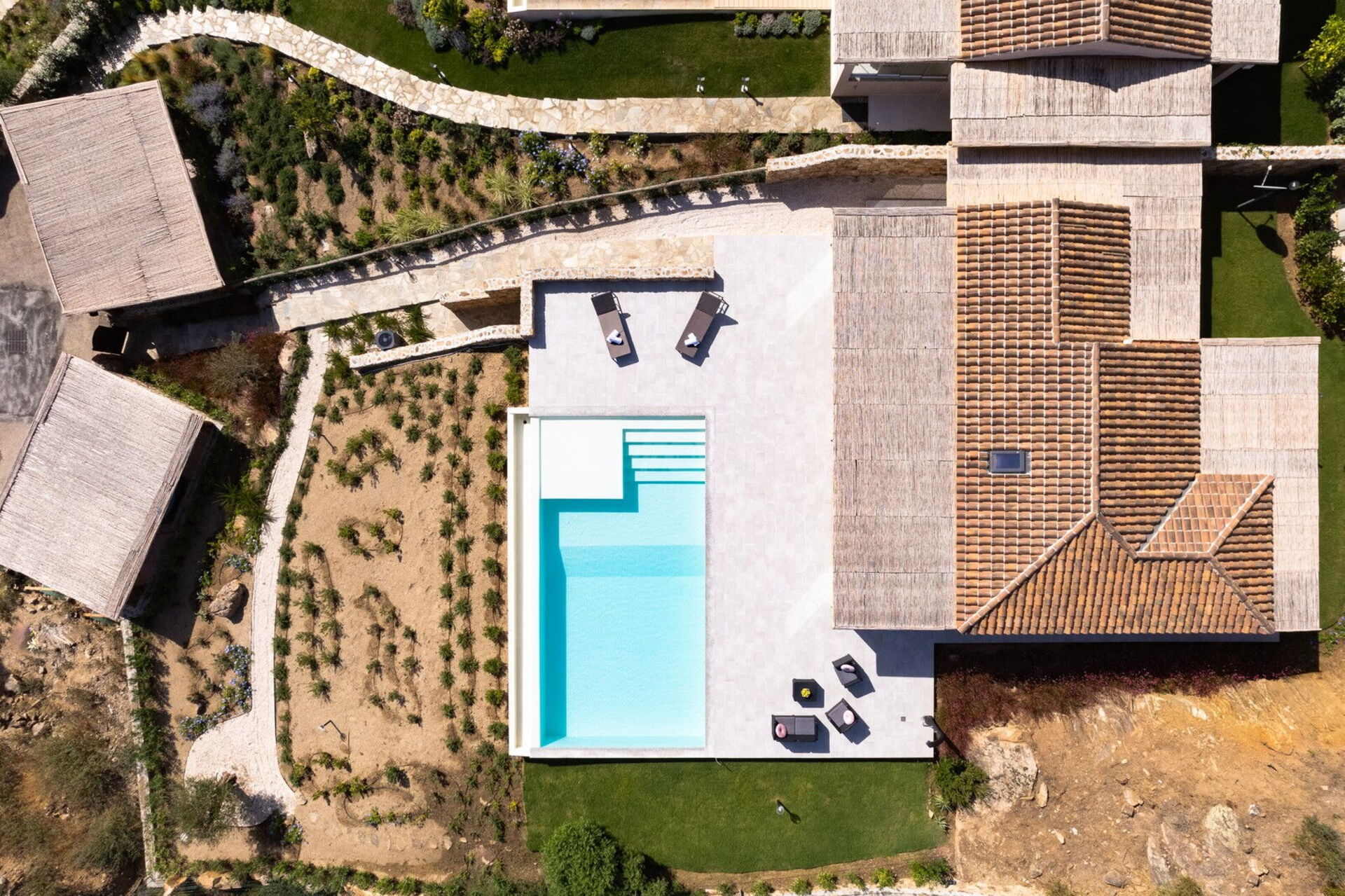Infatti, la proprietà si contraddistingue per la sua ampia veranda open space finemente arredata con una cucina dall’architettura semplice e dai colori cangianti che le conferiscono una luminosità assoluta. L’ampiezza dell’open space si estende al giardino, per la maggior parte pavimentato in pietra chiara, che crea un effetto di continuità con i colori della grande piscina turchese a sfioro, delimitata da un grazioso tappeto di macchia mediterranea.