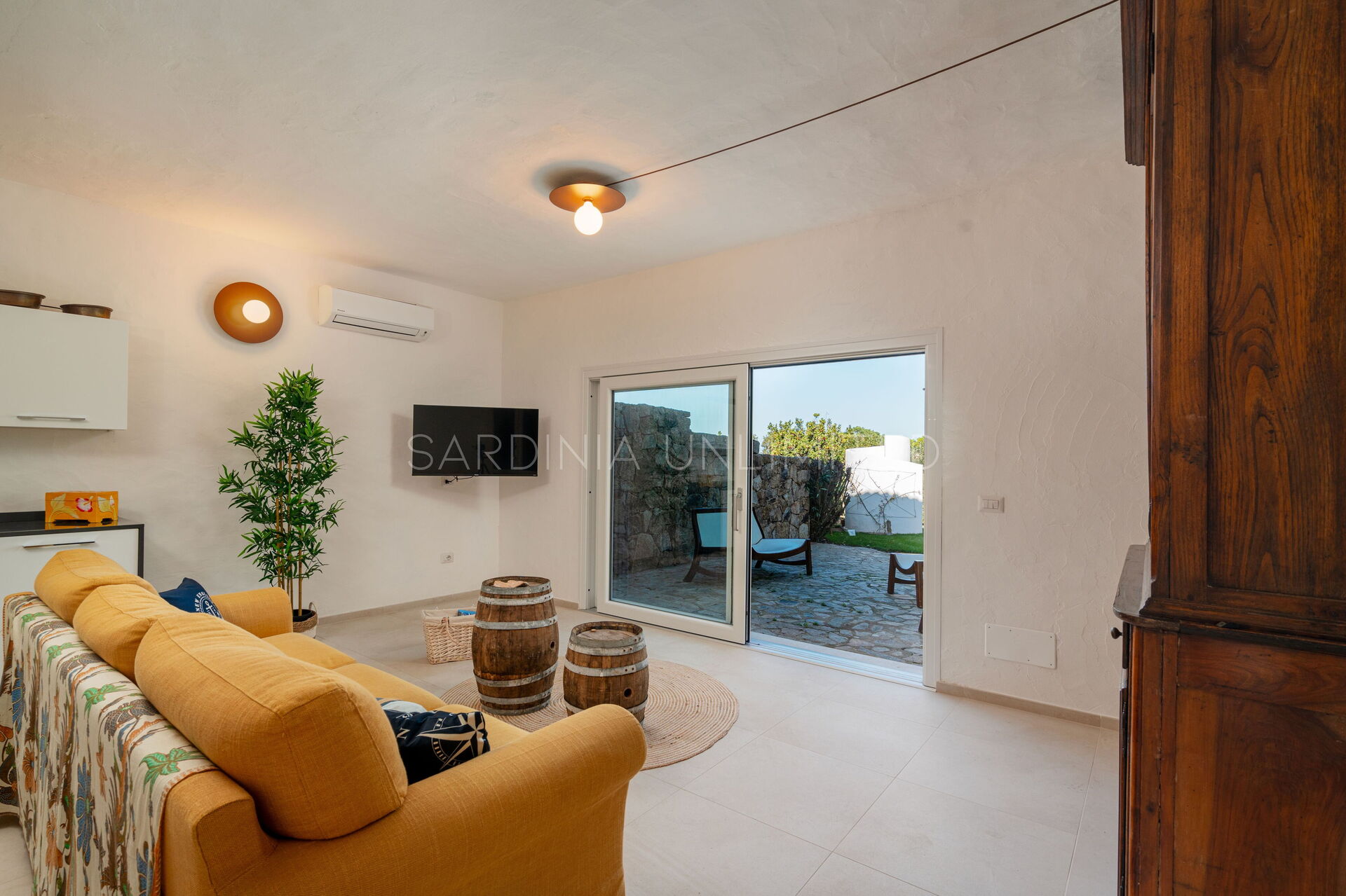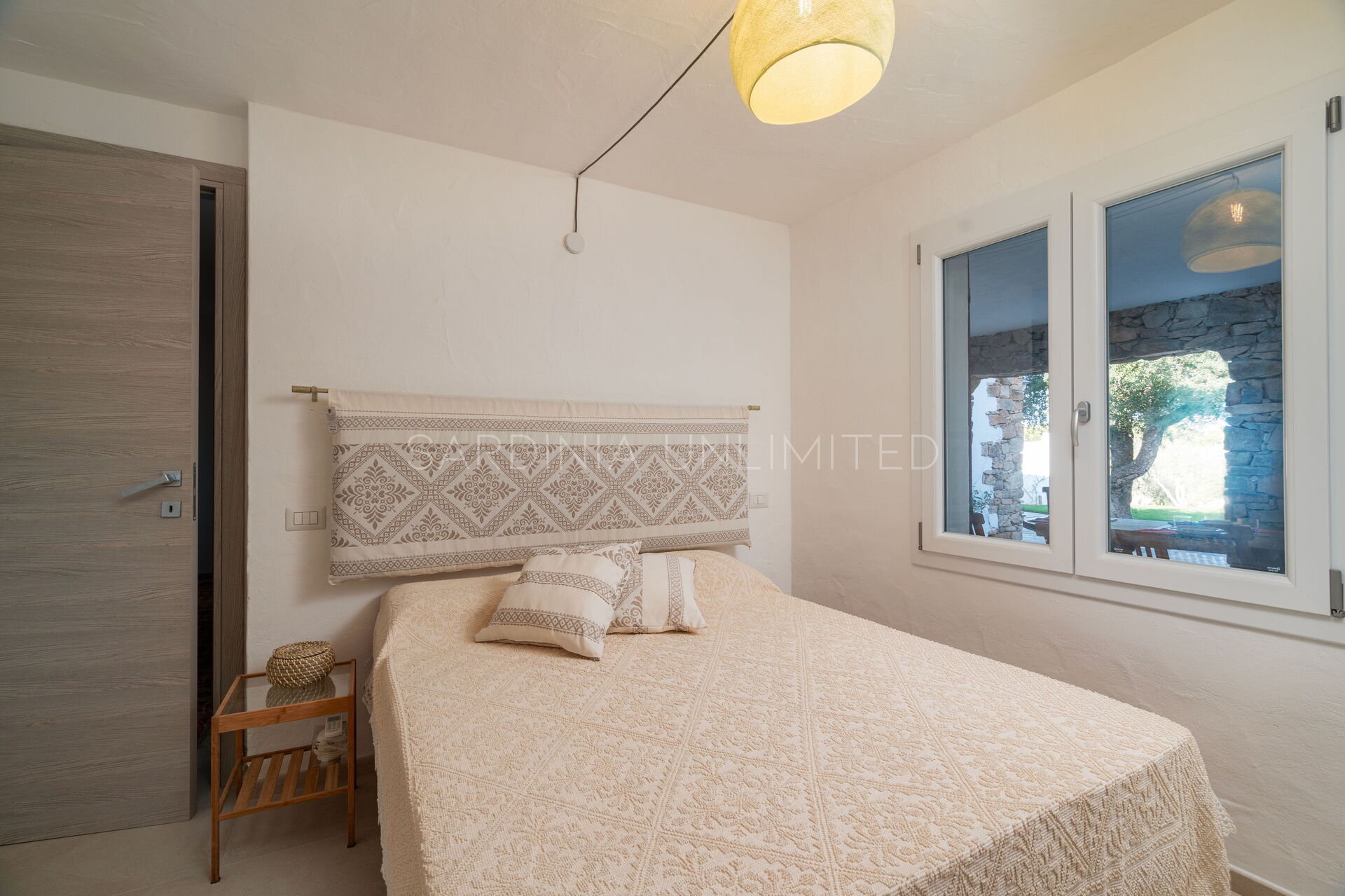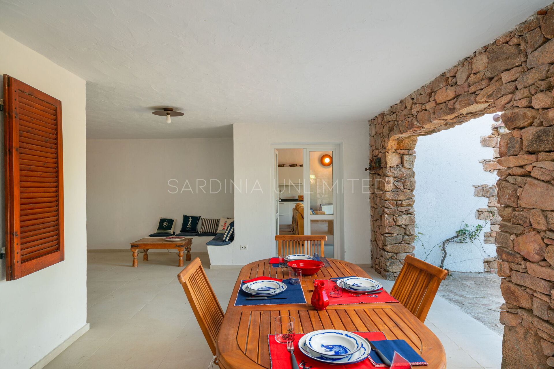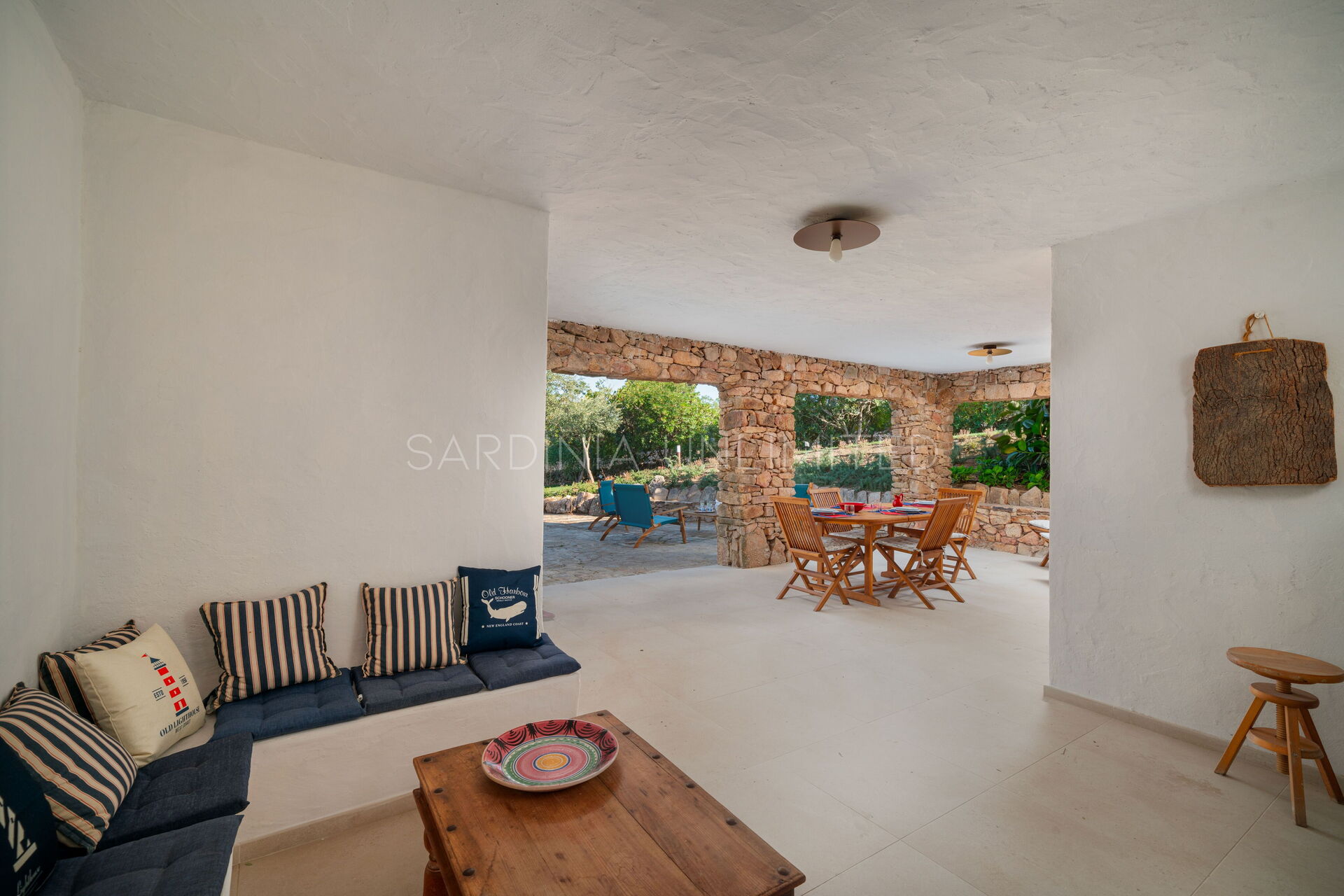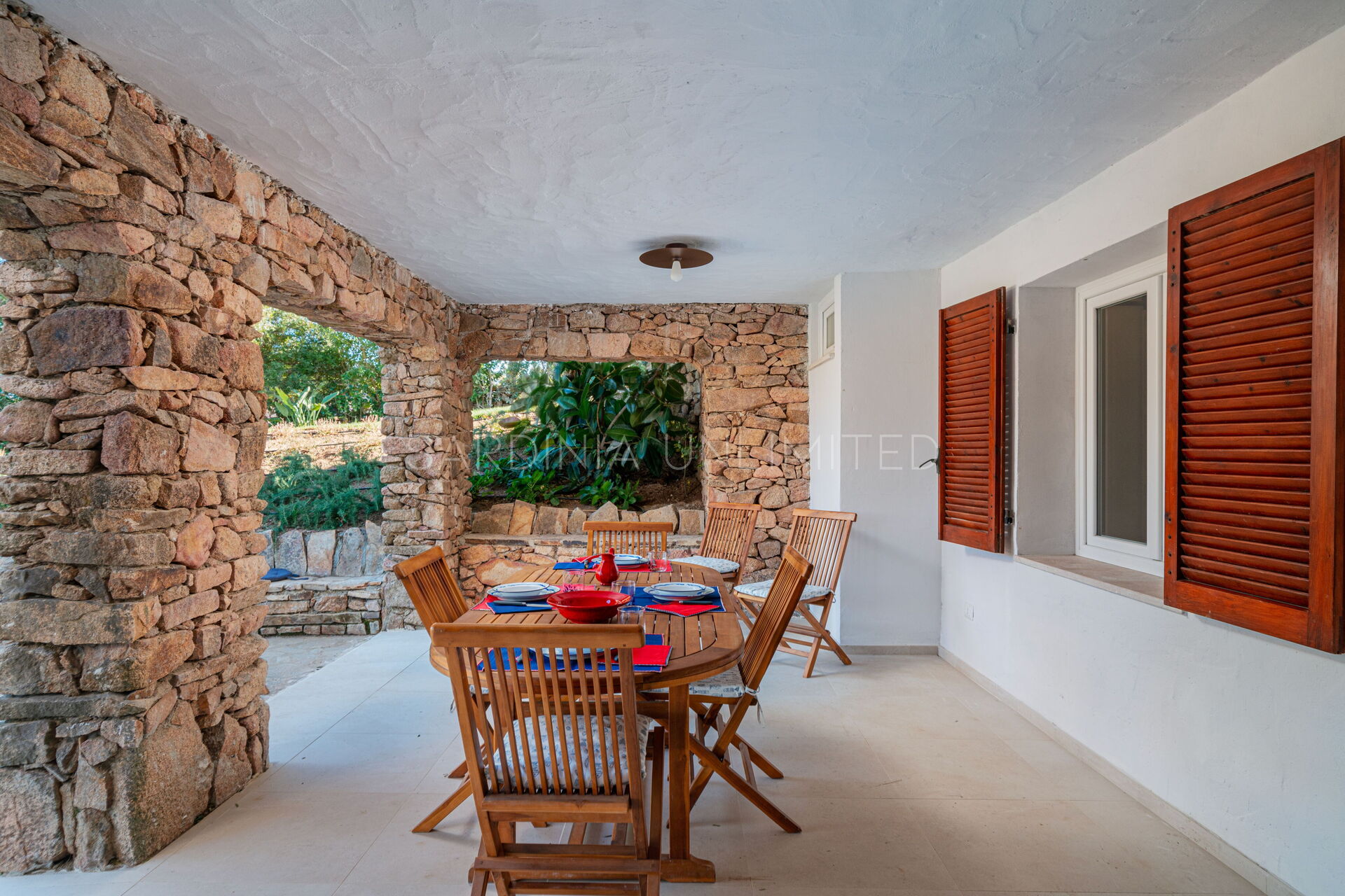 Al piano superiore, una splendida terrazza offre una vista incantevole sull'Isola di Tavolara e sulla costa circostante, mentre al piano inferiore, il soggiorno collega direttamente ad un patio incastonato tra muri in pietra che accoglie un'area lounge ed un ampio barbecue in muratura e ad cortile esterno con sedute in pietra circondate dal verde della natura.