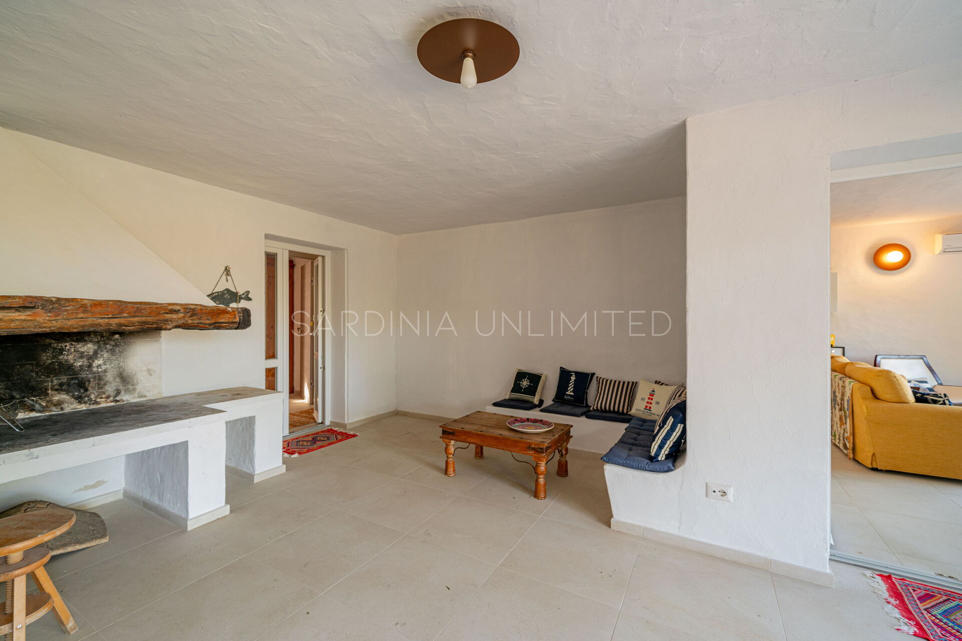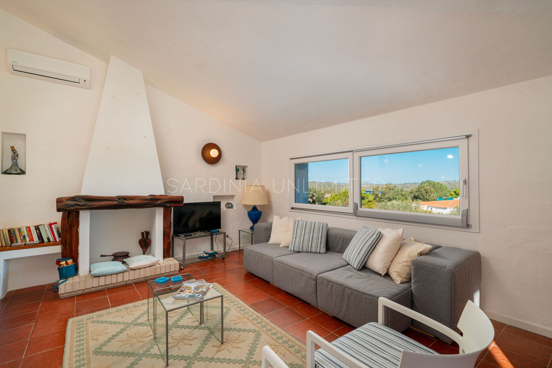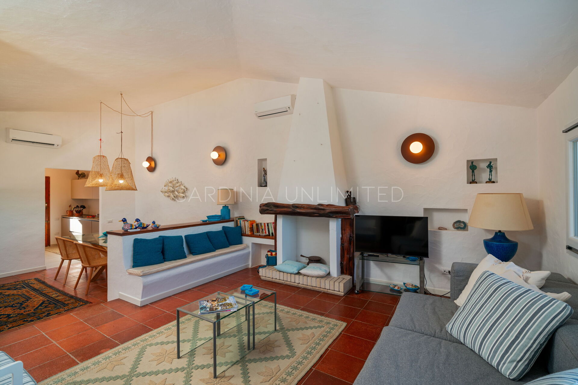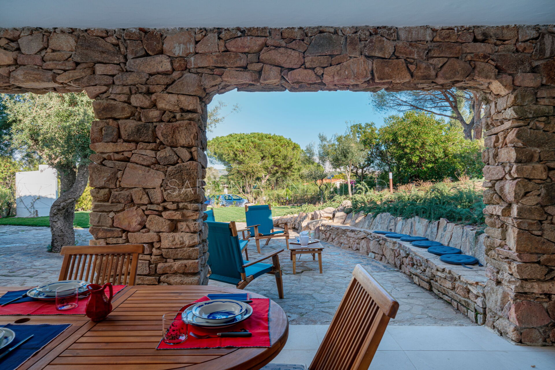 Al piano superiore, una splendida terrazza offre una vista incantevole sull'Isola di Tavolara e sulla costa circostante, mentre al piano inferiore, il soggiorno collega direttamente ad un patio incastonato tra muri in pietra che accoglie un'area lounge ed un ampio barbecue in muratura e ad cortile esterno con sedute in pietra circondate dal verde della natura.