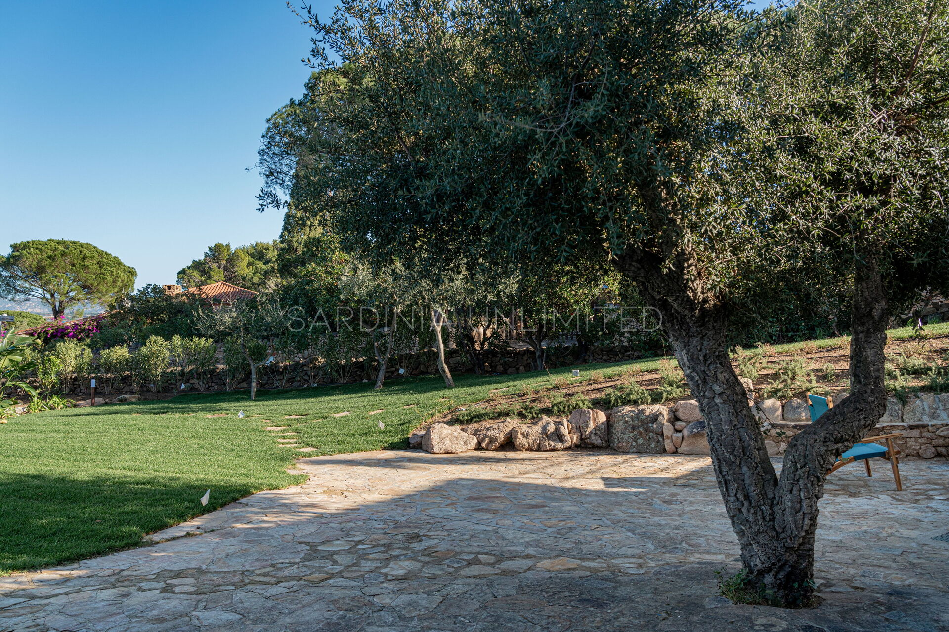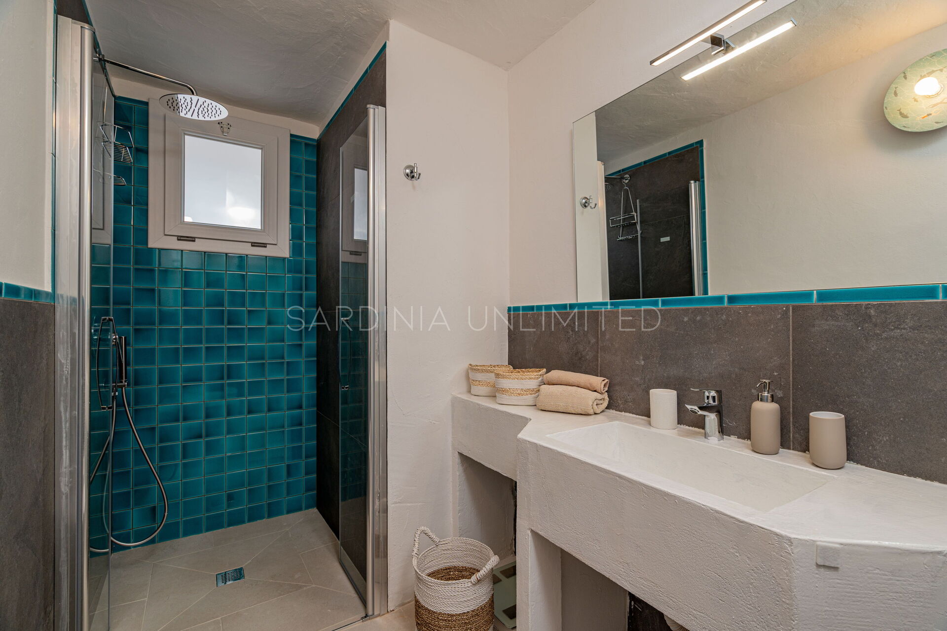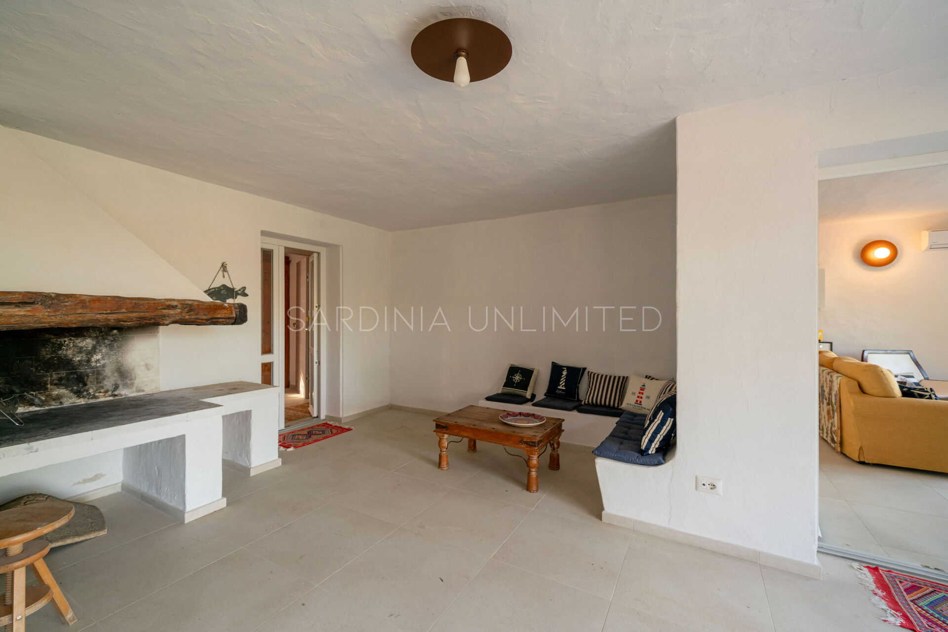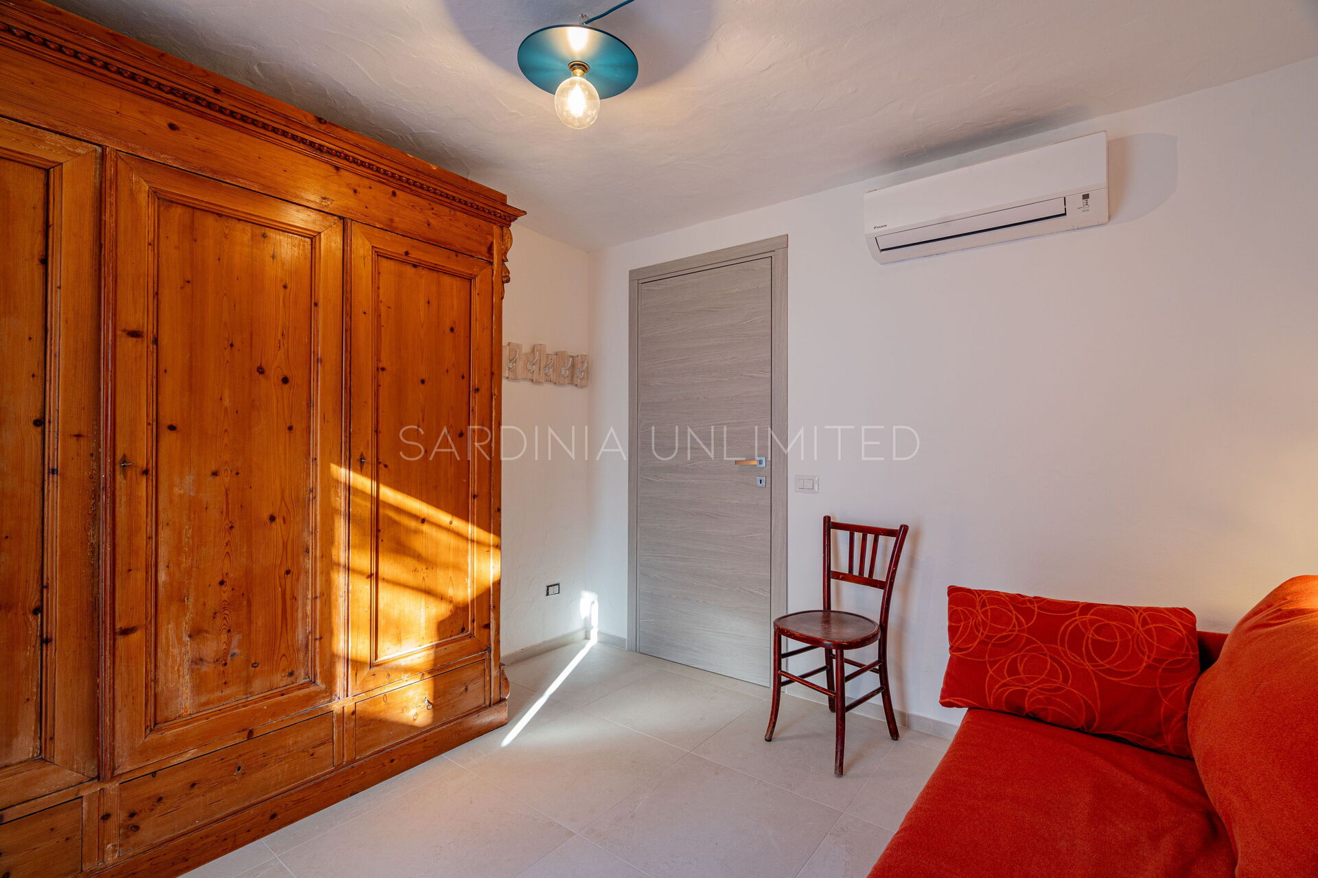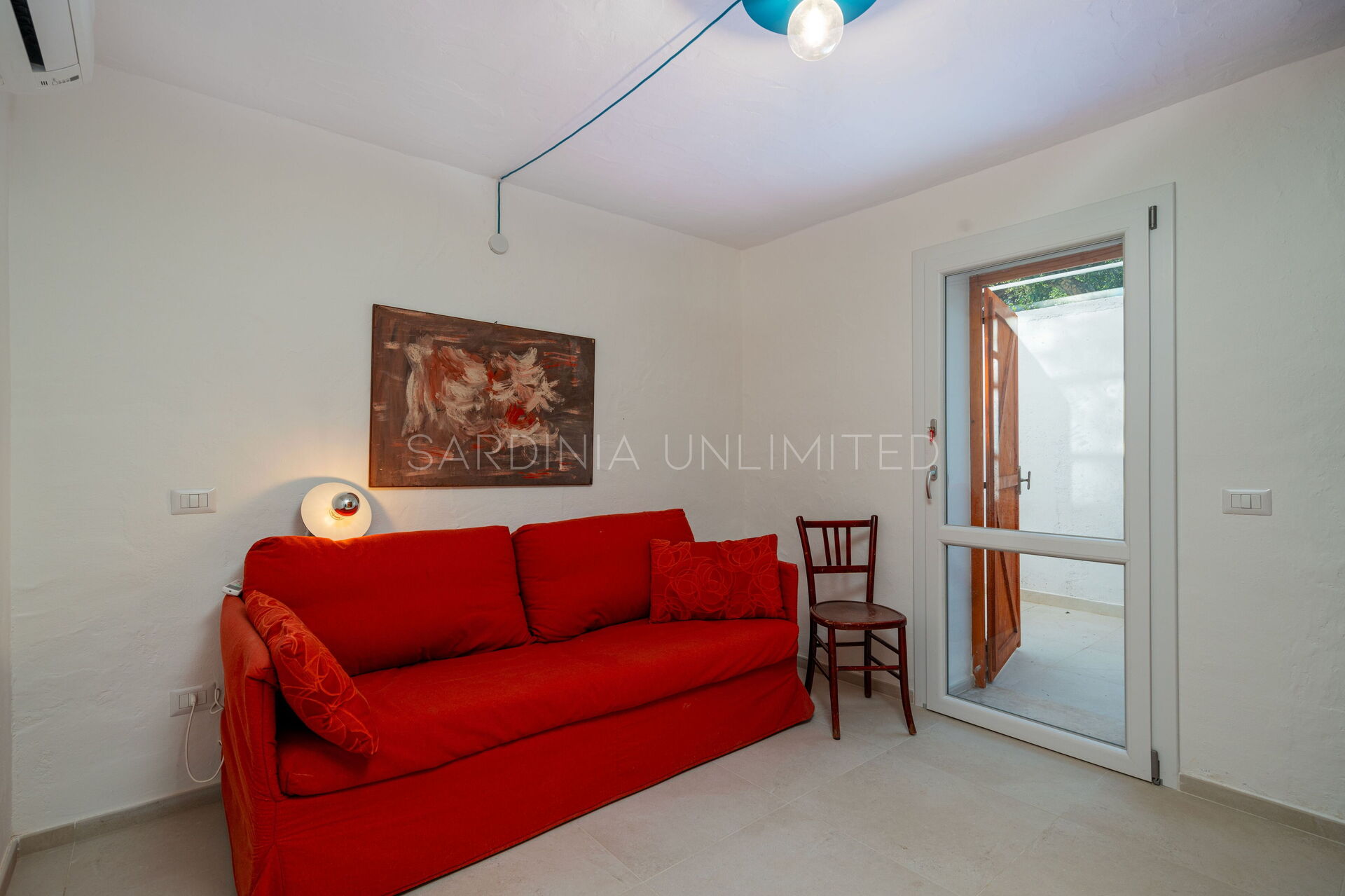 Al piano superiore, una splendida terrazza offre una vista incantevole sull'Isola di Tavolara e sulla costa circostante, mentre al piano inferiore, il soggiorno collega direttamente ad un patio incastonato tra muri in pietra che accoglie un'area lounge ed un ampio barbecue in muratura e ad cortile esterno con sedute in pietra circondate dal verde della natura.