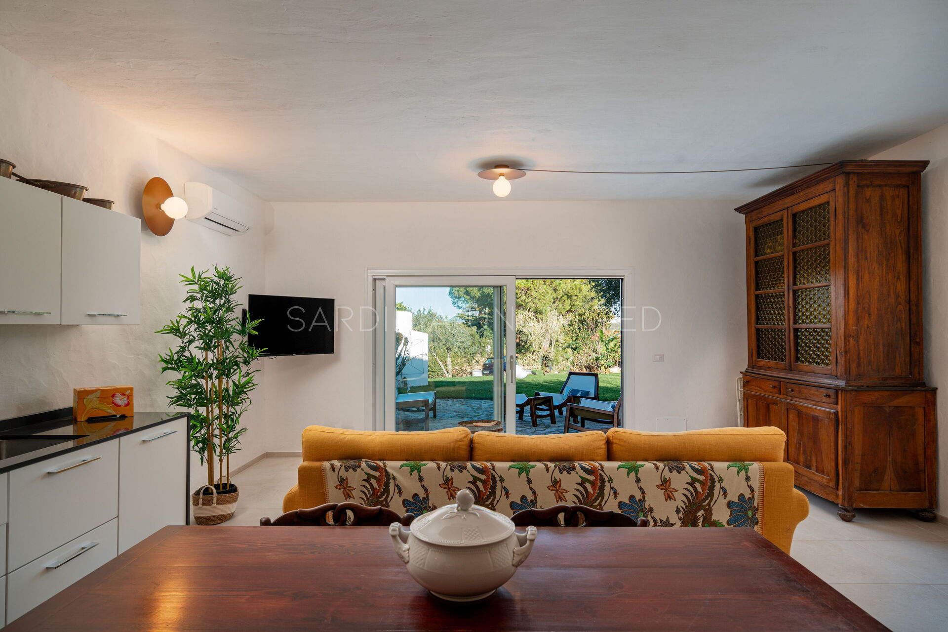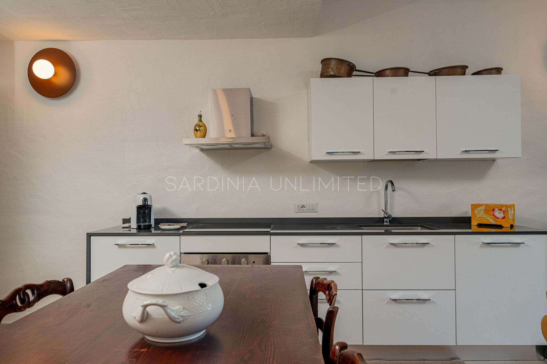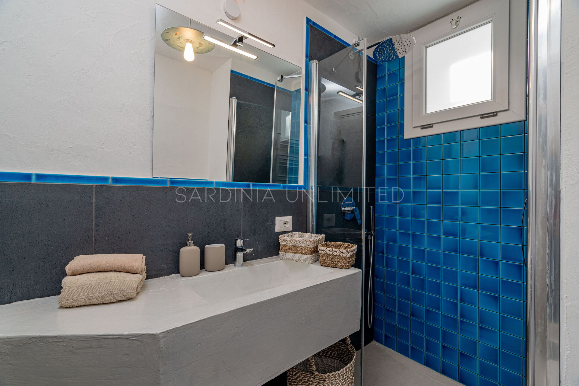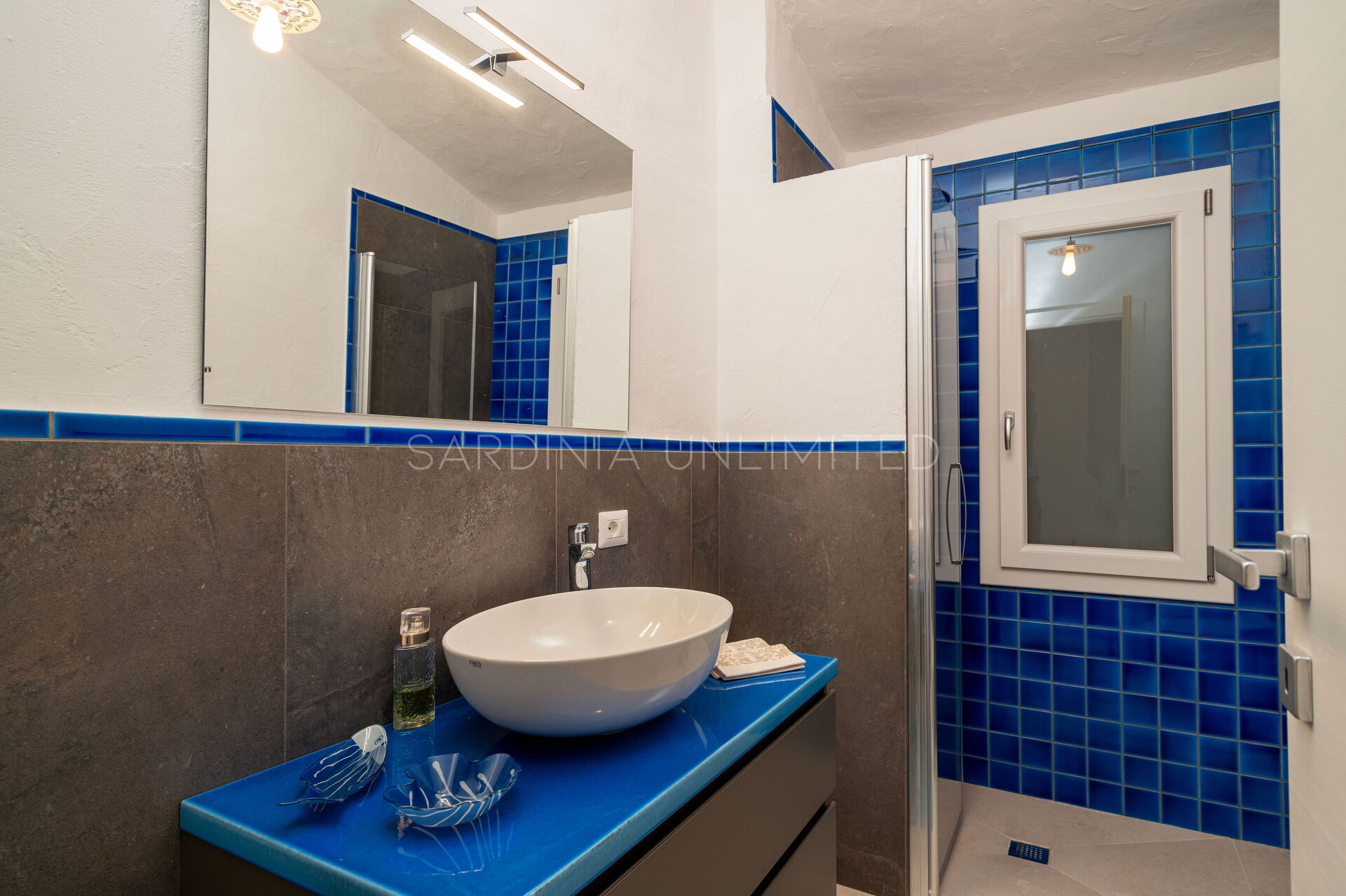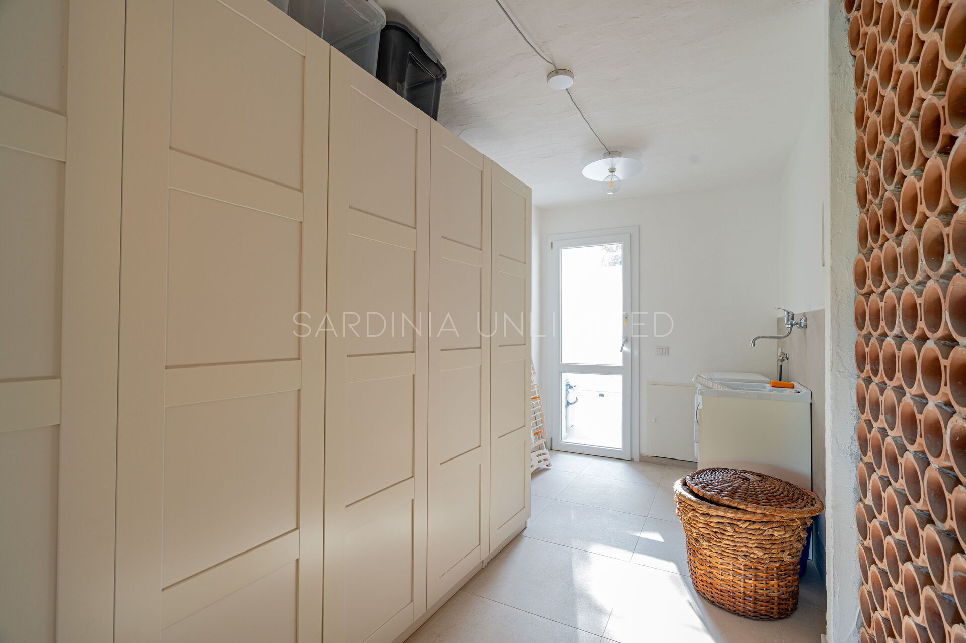 Al piano superiore, una splendida terrazza offre una vista incantevole sull'Isola di Tavolara e sulla costa circostante, mentre al piano inferiore, il soggiorno collega direttamente ad un patio incastonato tra muri in pietra che accoglie un'area lounge ed un ampio barbecue in muratura e ad cortile esterno con sedute in pietra circondate dal verde della natura.