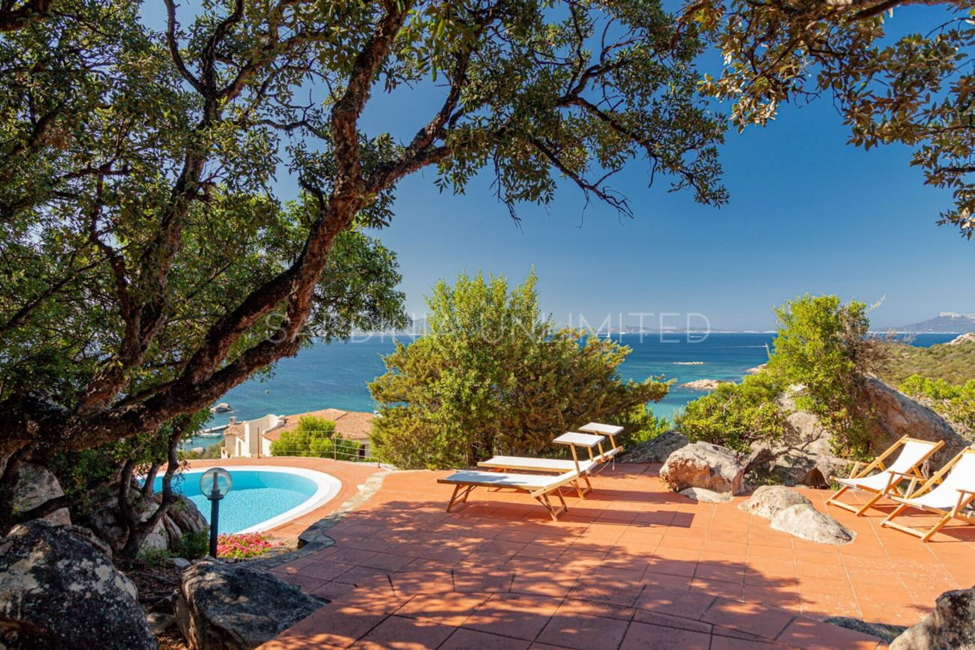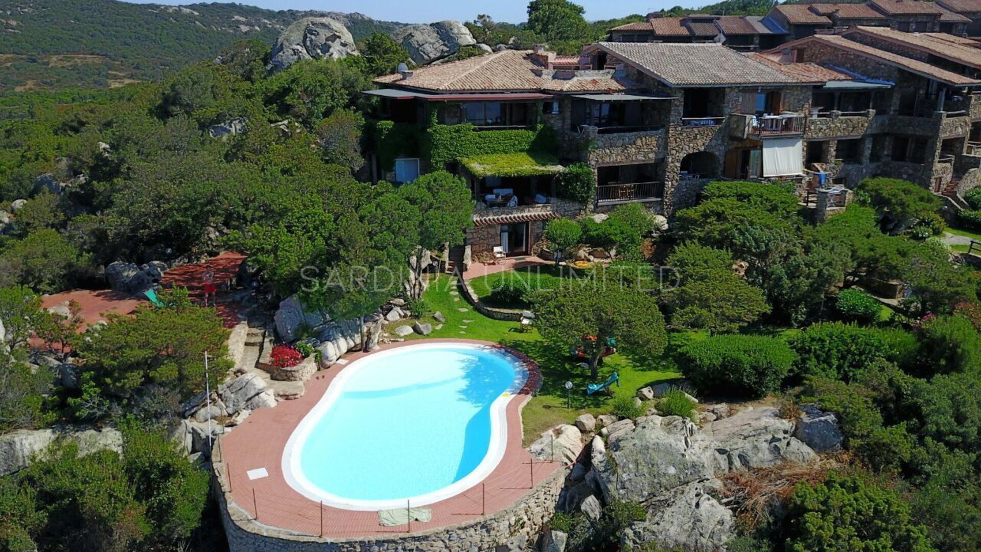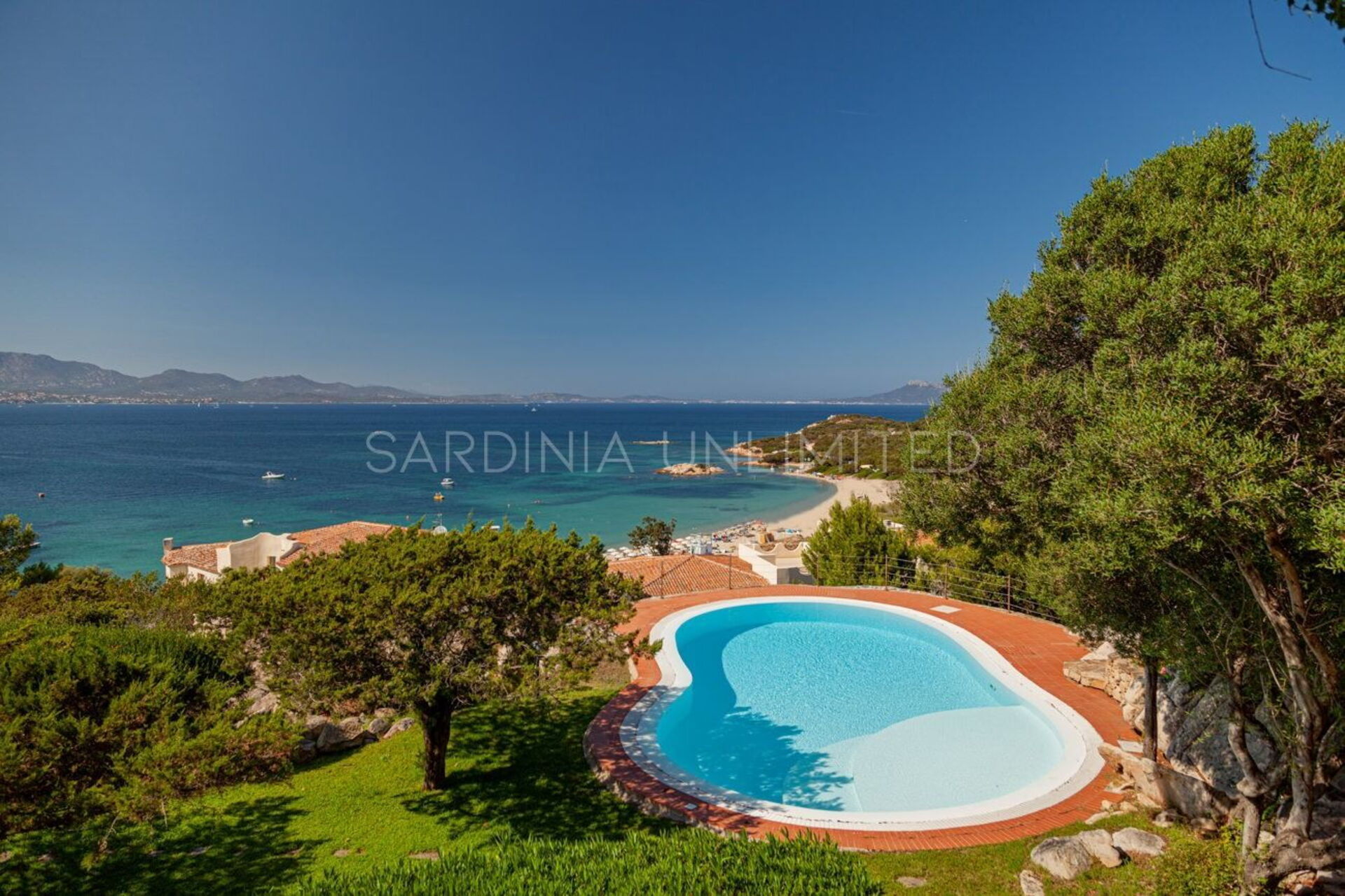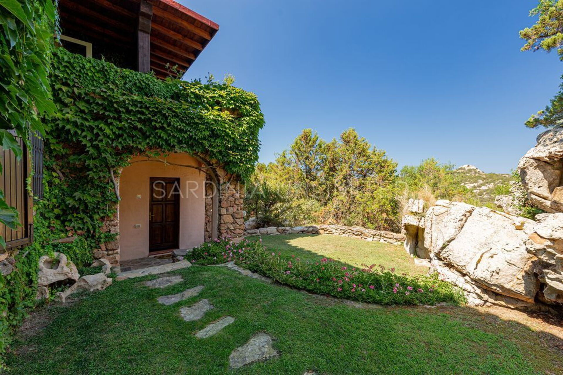La villa ha un proprio ingresso sul retro, dove è presente un prato verde ben curato. Sull'altro lato, quello del giardino, si gode di una vista spettacolare sulla spiaggia Li Cuncheddi, su cui la proprietà sembra quasi vigilare, in virtù della sua posizione, che consente di scorgerne ogni dettaglio. Nonostante ciò, la veranda rimane riservatissima. La villa si affaccia sulla piscina esclusiva a sfioro, che si raggiunge dopo qualche scalino. Intorno a quest'ultima vi è una zona solarium altrettanto riservata, circondata da verde e rocce e doccia esterna. È presente anche un barbecue ed è inoltre dotata di piscina privata.