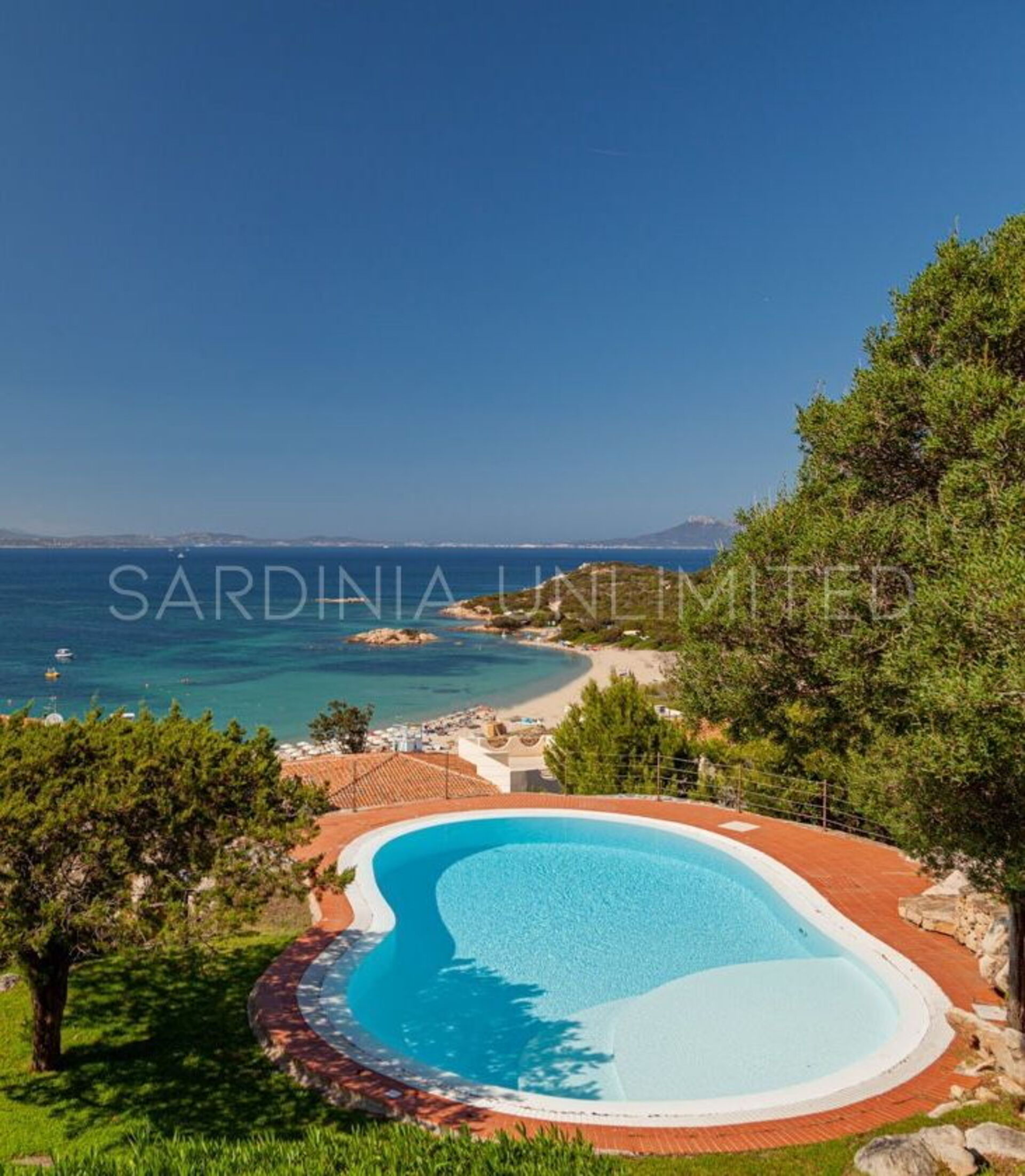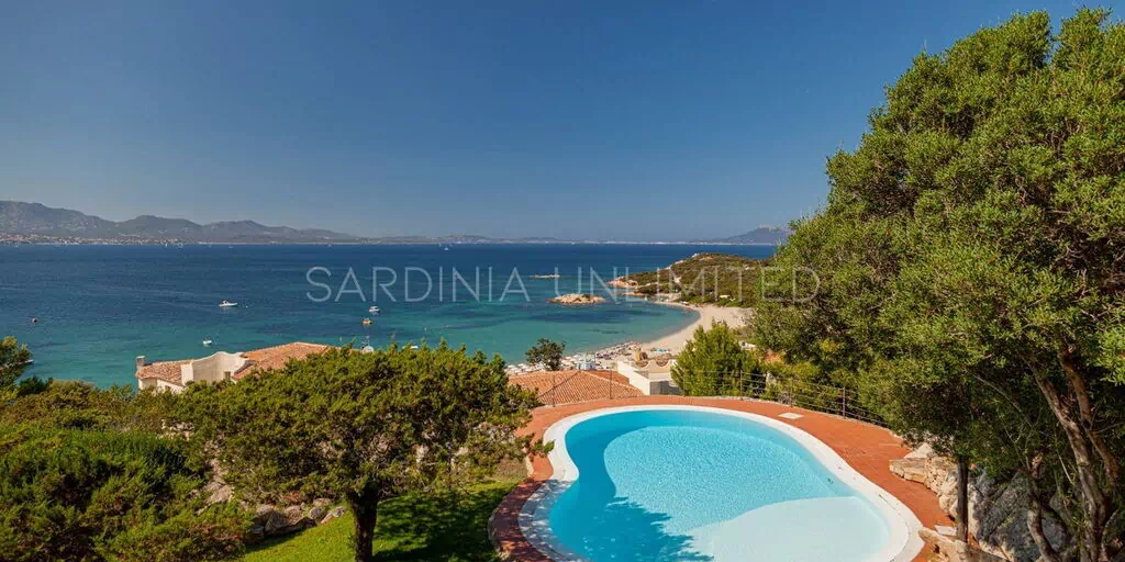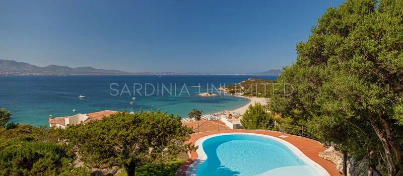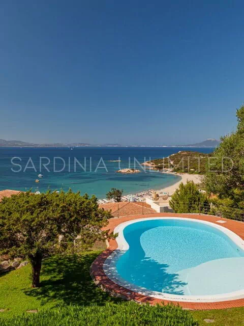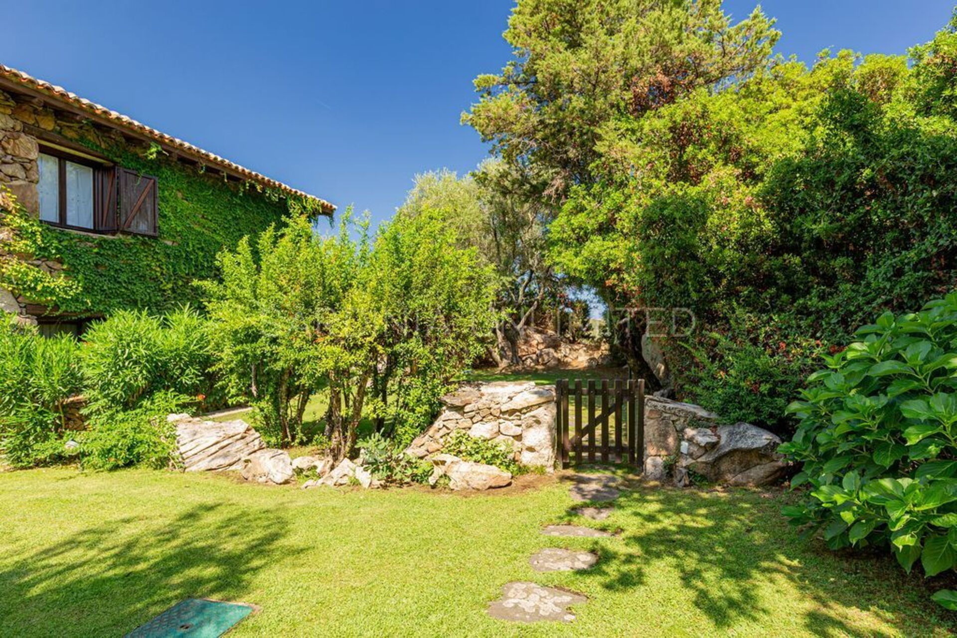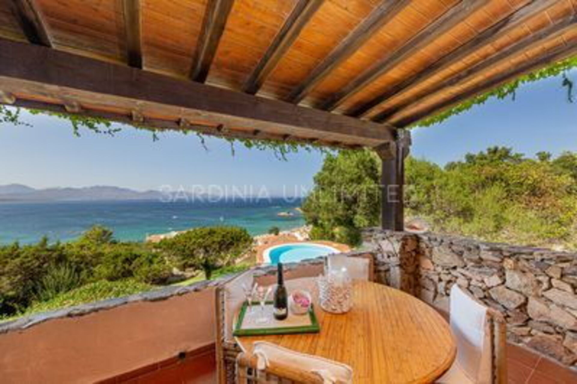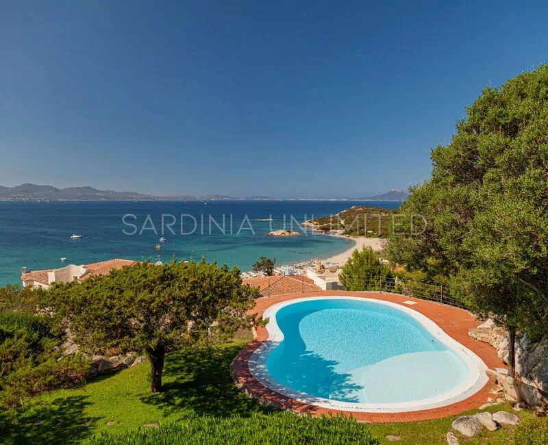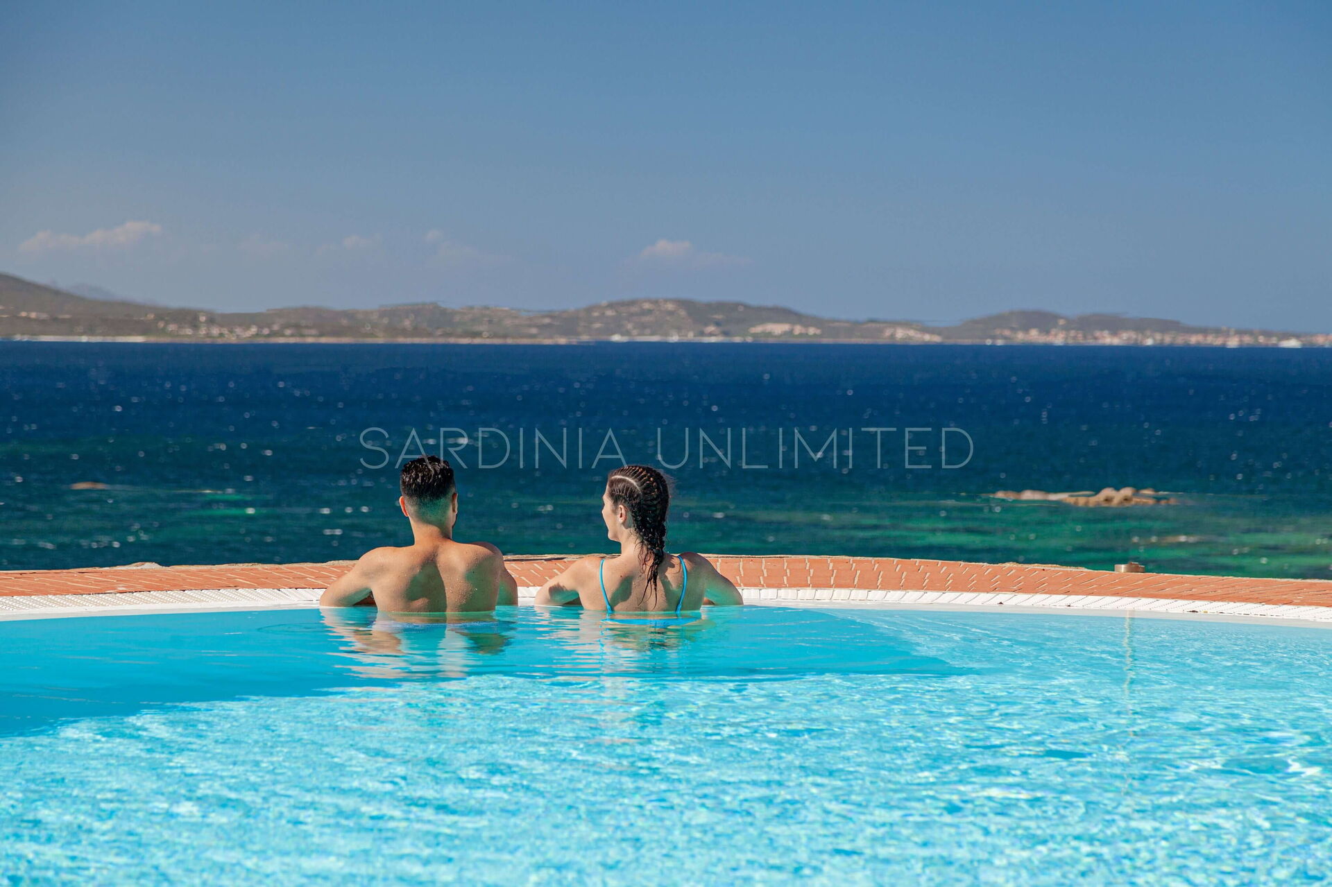 La villa ha un proprio ingresso sul retro, dove è presente un prato verde ben curato. Sull'altro lato, quello del giardino, si gode di una vista spettacolare sulla spiaggia Li Cuncheddi, su cui la proprietà sembra quasi vigilare, in virtù della sua posizione, che consente di scorgerne ogni dettaglio. Nonostante ciò, la veranda rimane riservatissima. La villa si affaccia sulla piscina esclusiva a sfioro, che si raggiunge dopo qualche scalino. Intorno a quest'ultima vi è una zona solarium altrettanto riservata, circondata da verde e rocce e doccia esterna. È presente anche un barbecue ed è inoltre dotata di piscina privata.