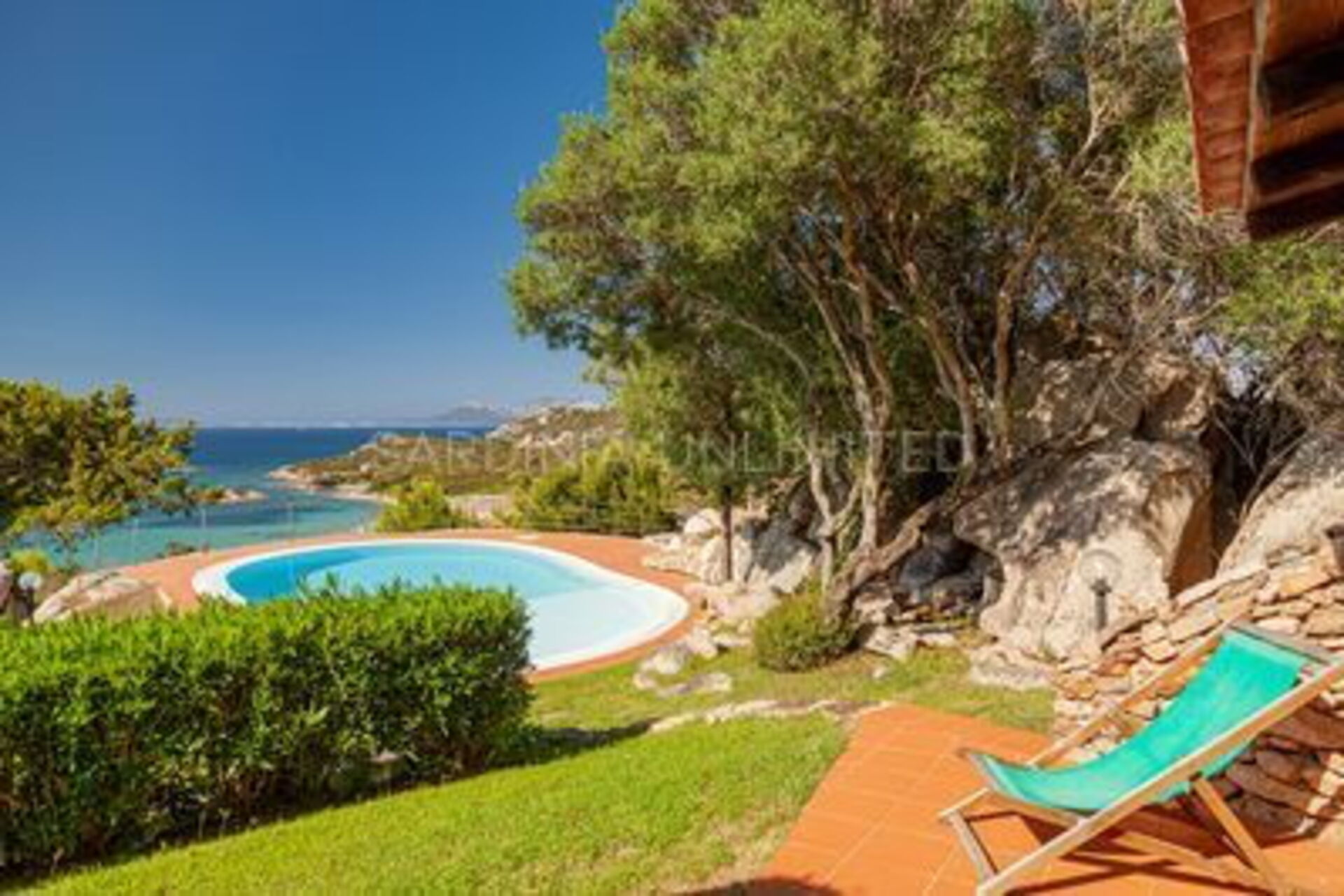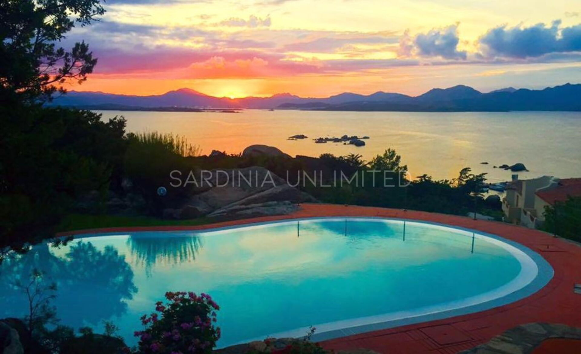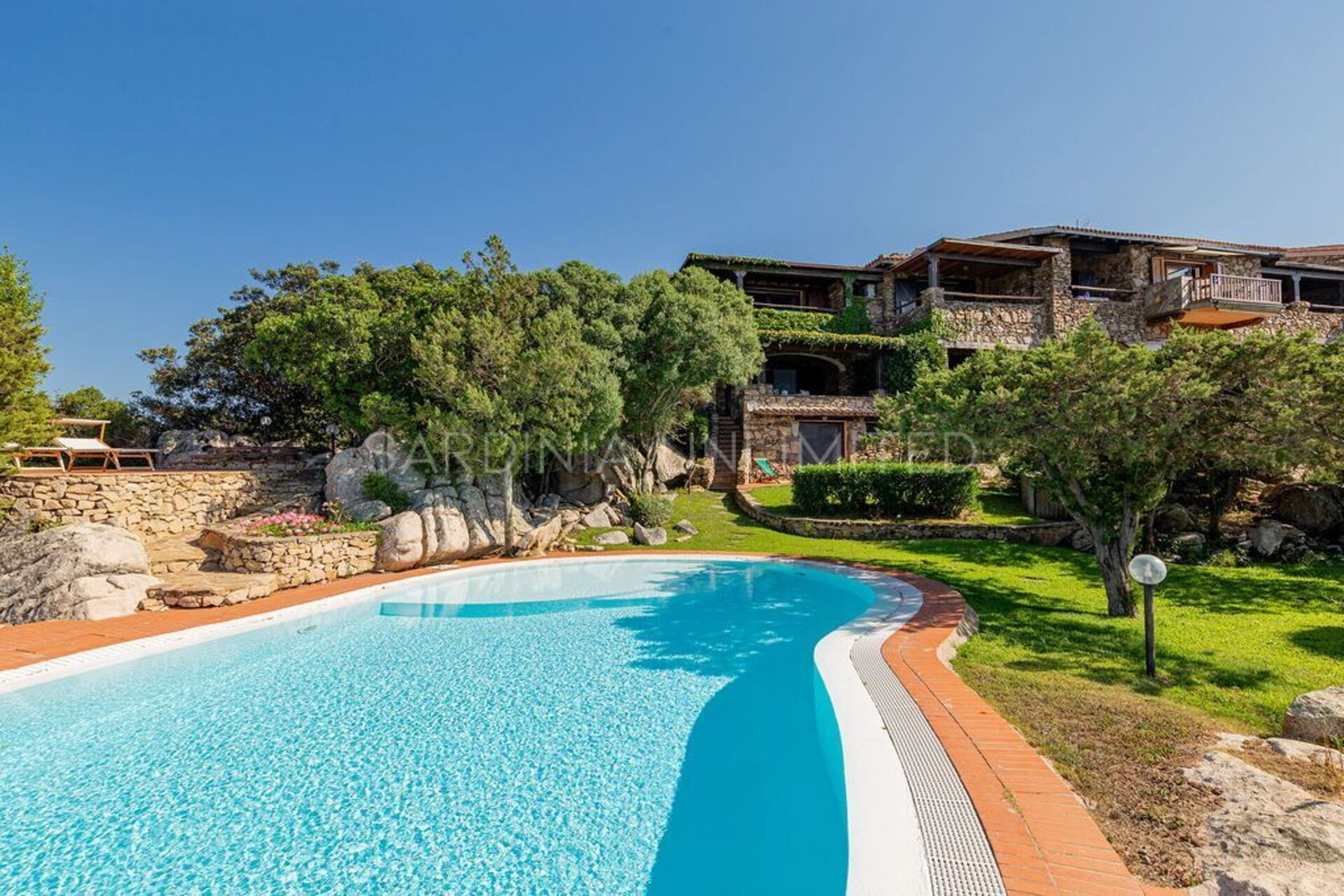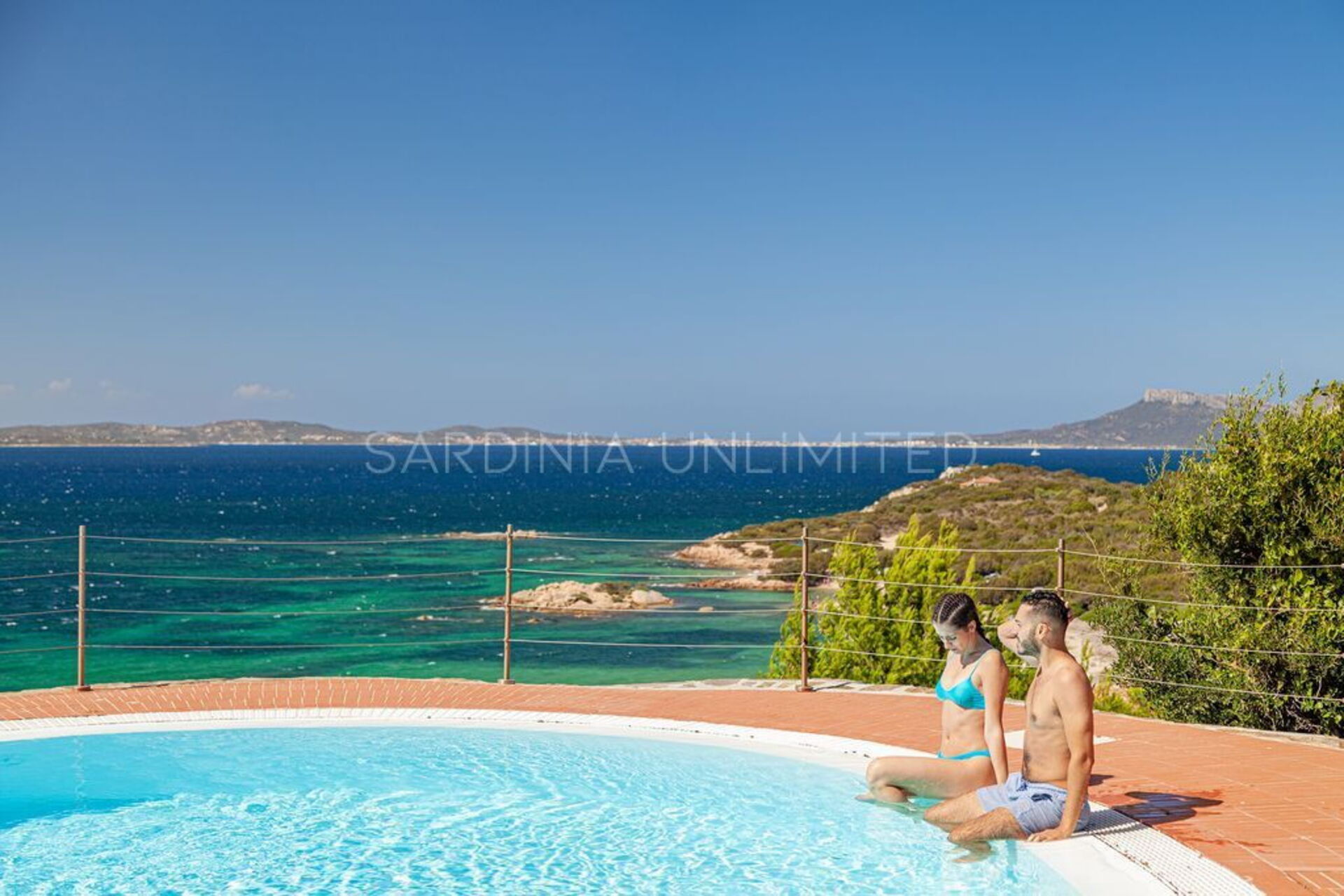 La villa ha un proprio ingresso sul retro, dove è presente un prato verde ben curato. Sull'altro lato, quello del giardino, si gode di una vista spettacolare sulla spiaggia Li Cuncheddi, su cui la proprietà sembra quasi vigilare, in virtù della sua posizione, che consente di scorgerne ogni dettaglio. Nonostante ciò, la veranda rimane riservatissima. La villa si affaccia sulla piscina esclusiva a sfioro, che si raggiunge dopo qualche scalino. Intorno a quest'ultima vi è una zona solarium altrettanto riservata, circondata da verde e rocce e doccia esterna. È presente anche un barbecue ed è inoltre dotata di piscina privata.