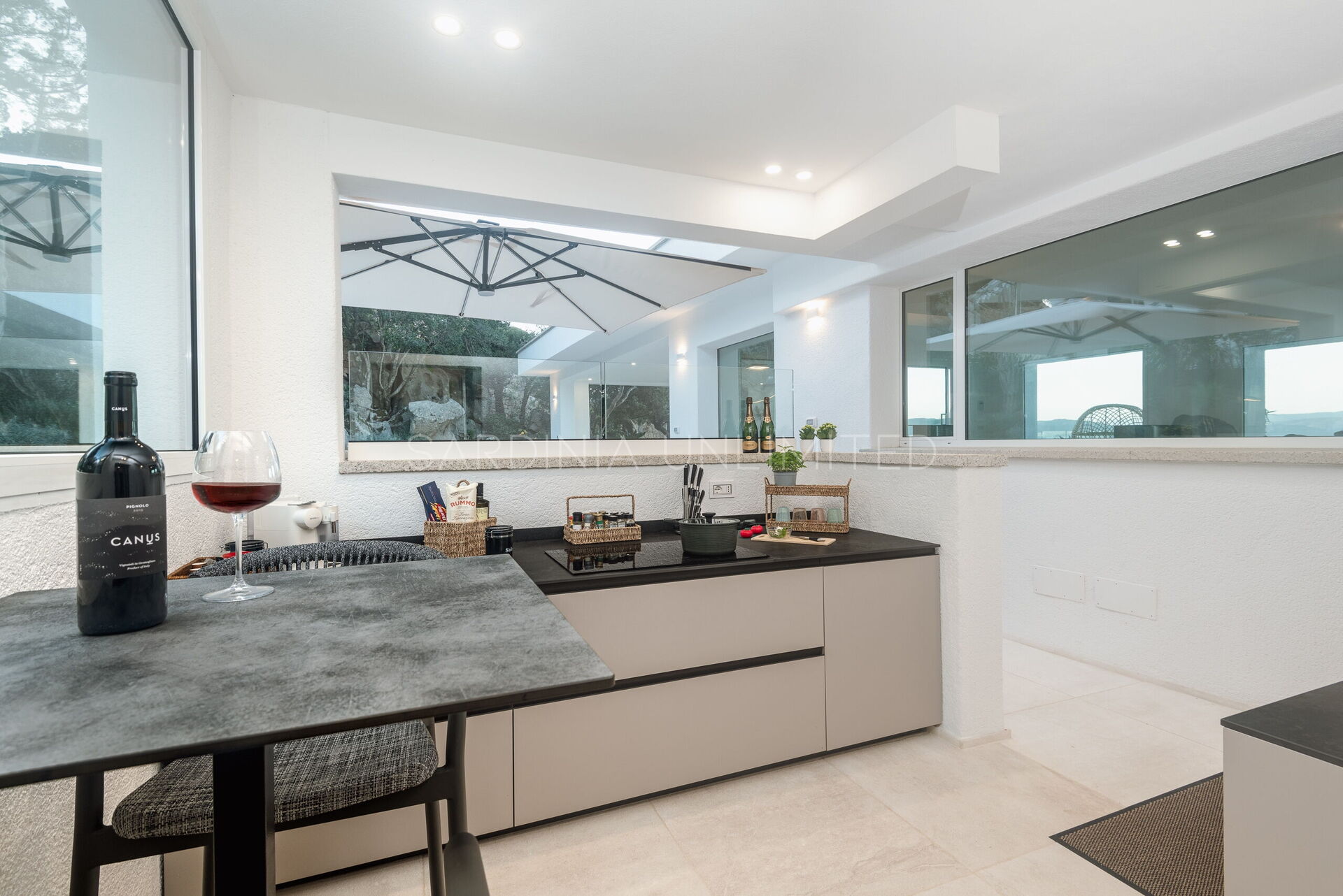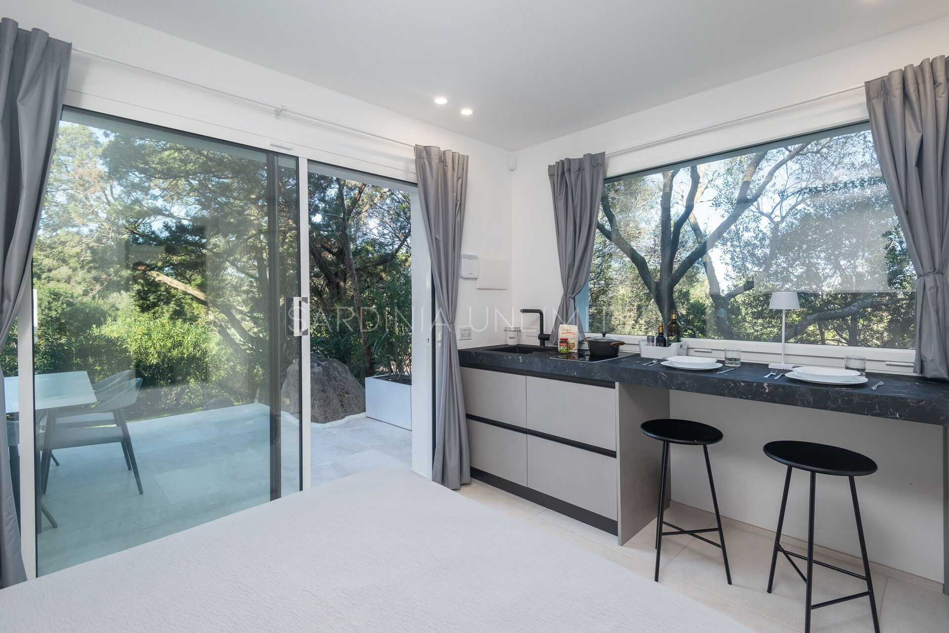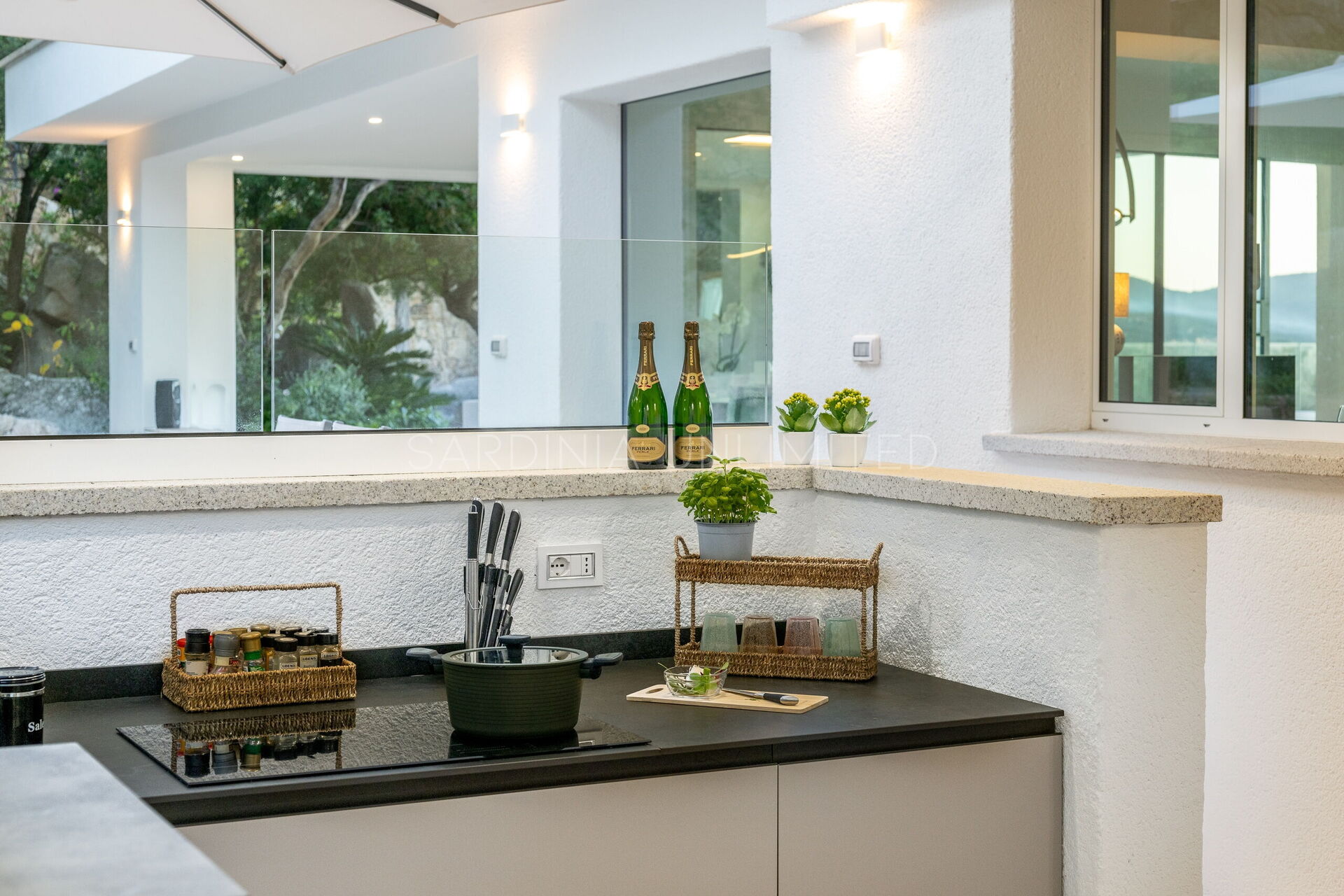 La villa dispone di due cucine completamente attrezzate, una interna e una esterna, collegate tra loro e pensate per garantire massima funzionalità anche in presenza di chef privati. Gli spazi sono studiati per facilitare l’organizzazione del soggiorno, grazie anche a un comodo accesso esterno dedicato al carico della spesa. È inoltre presente un bagno di servizio con doccia, facilmente accessibile senza attraversare la zona living.