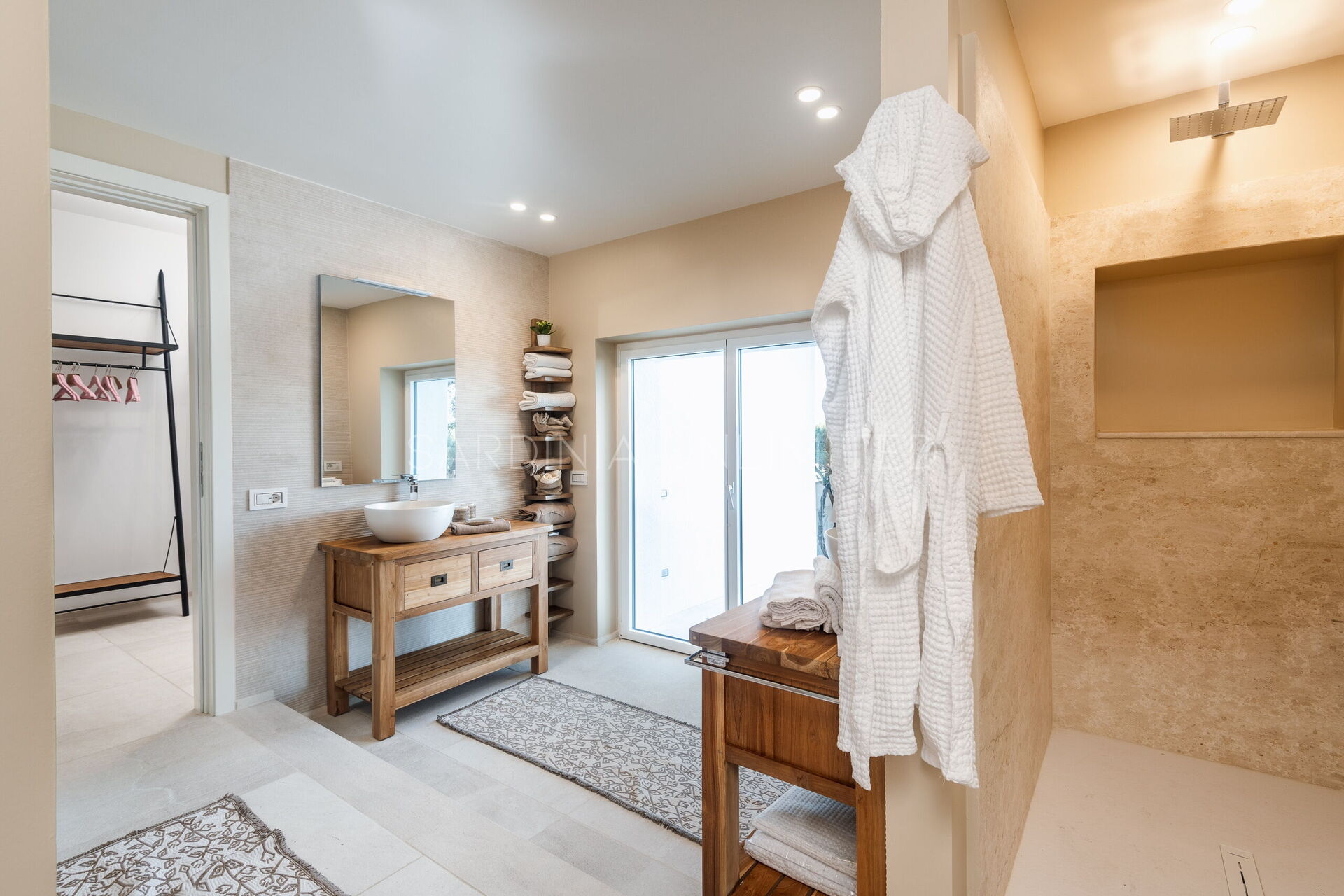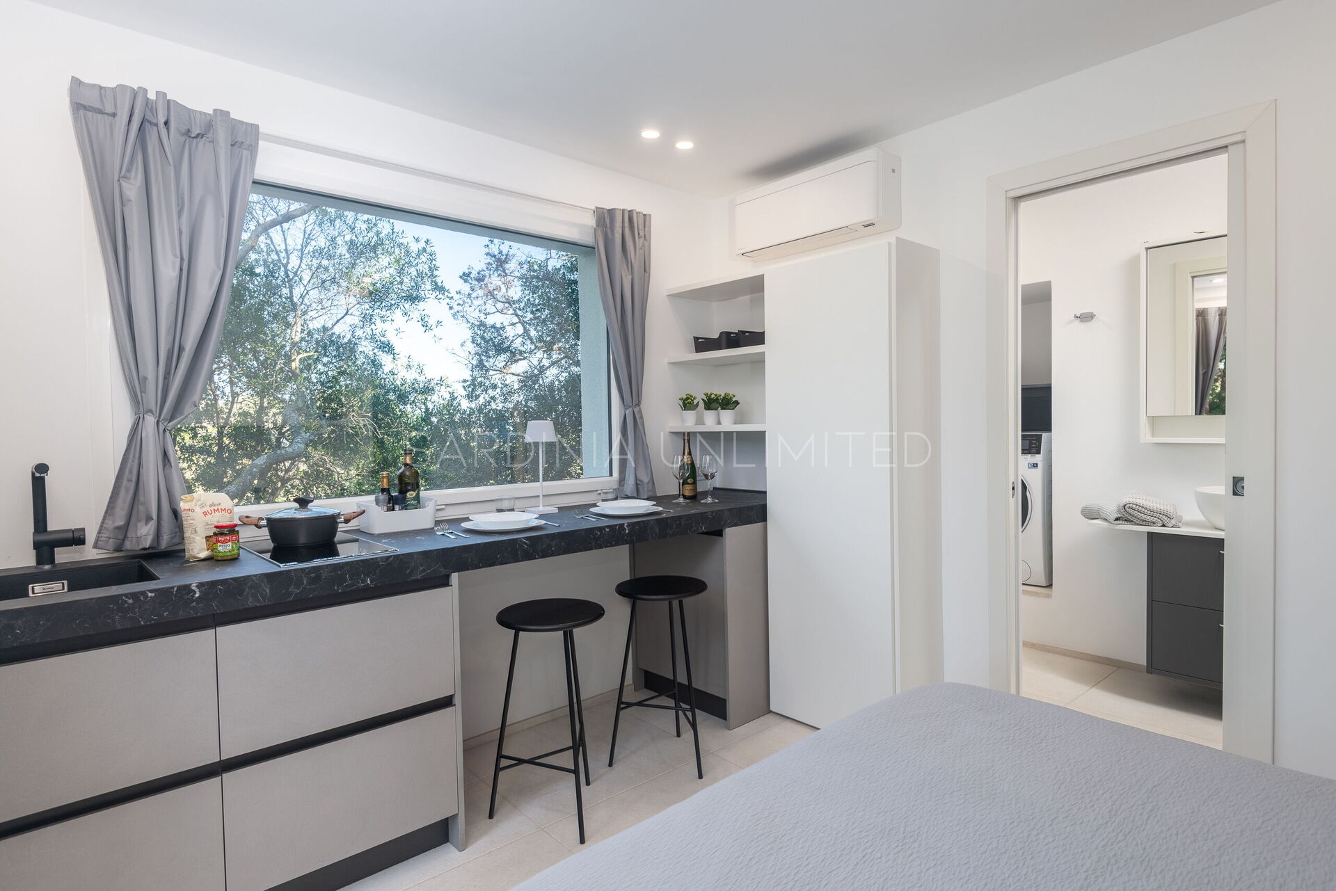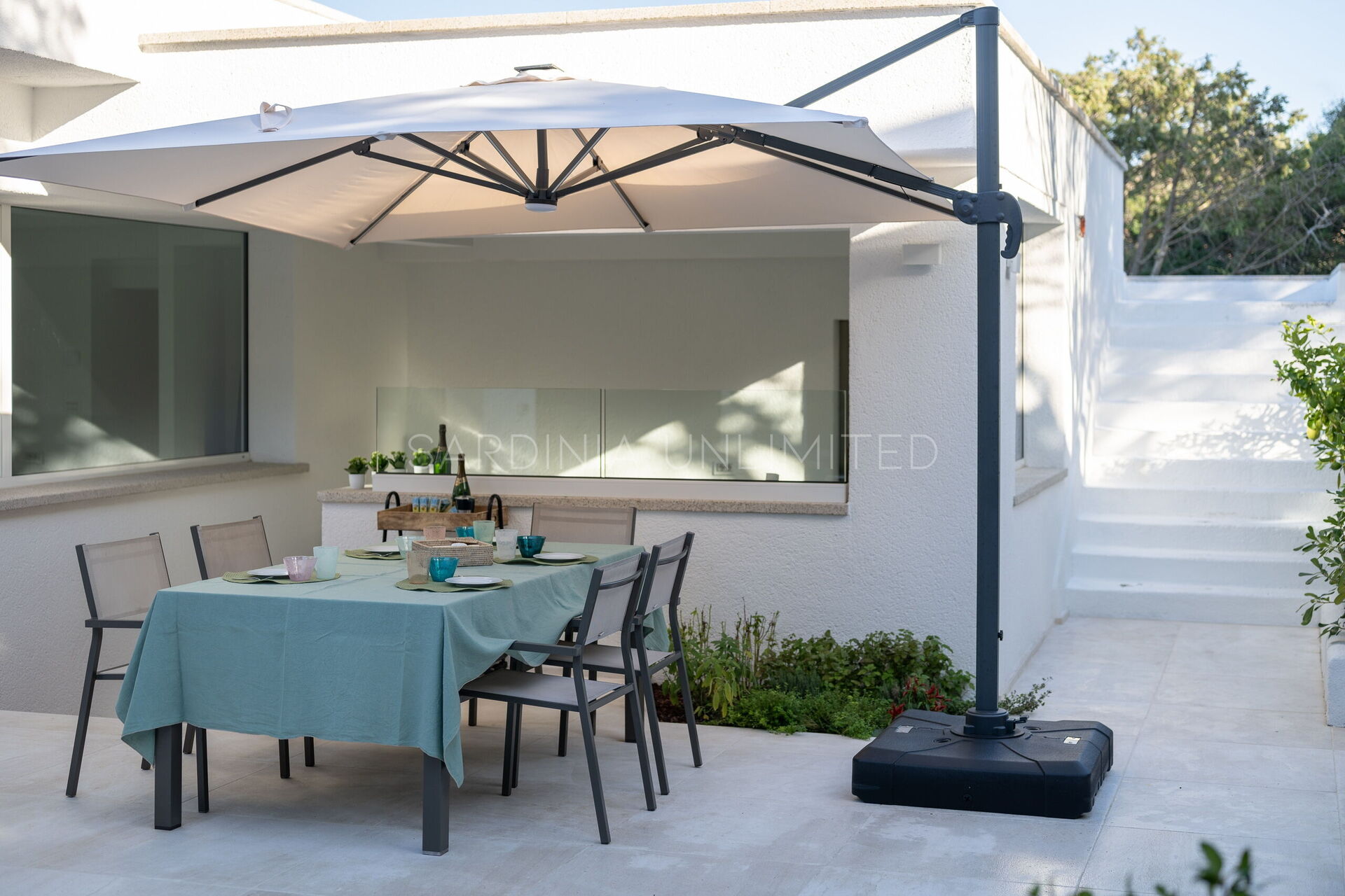 La villa dispone di due cucine completamente attrezzate, una interna e una esterna, collegate tra loro e pensate per garantire massima funzionalità anche in presenza di chef privati. Gli spazi sono studiati per facilitare l’organizzazione del soggiorno, grazie anche a un comodo accesso esterno dedicato al carico della spesa. È inoltre presente un bagno di servizio con doccia, facilmente accessibile senza attraversare la zona living.